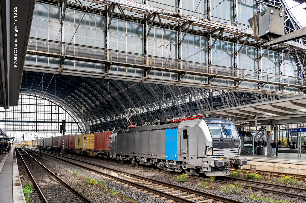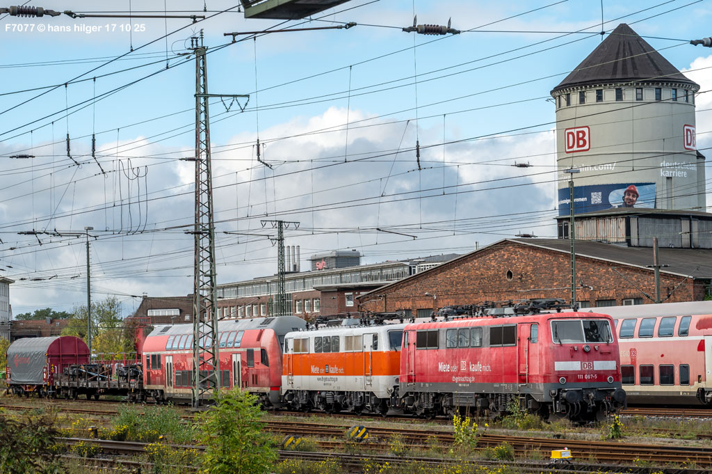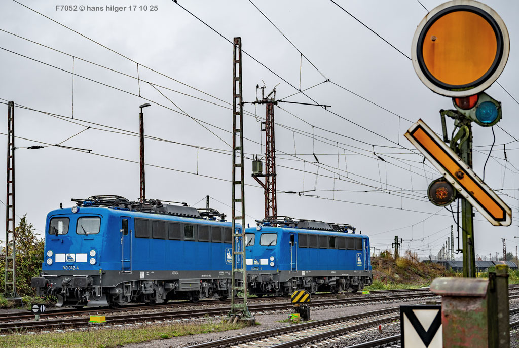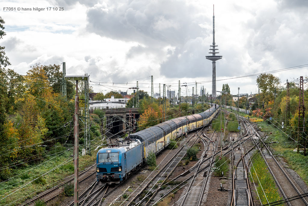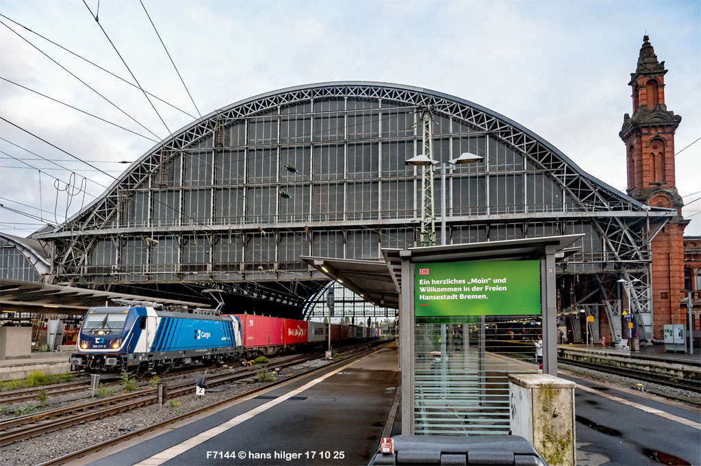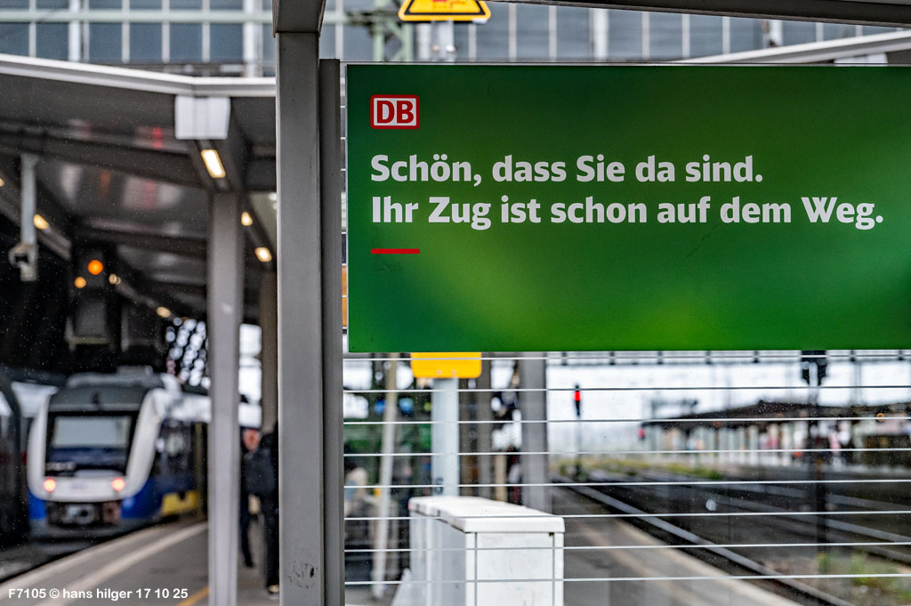 <> Nun kommen wir zurück nach Bremen, JA, auch dies hier ist Bremen! Im Hintergrund liegt die Innenstadt und der Hauptbahnhof, hier unter uns liegt die Einfahrt zum Rangierbahnhof Bremen- Walle und weiter das Bw Bremen Rbf im Ortsteil Gröpelingen. Dieser “Altmann-” Autozug mit der privaten 192 047 möchte also nach Bremen Rbf und hat in wenigen Metern sein Ziel erreicht<> Nun sind wir am Bremer Hbf, wo wir nett begrüßt werden. Nachfolgend ein paar der dort entstandenen Bilder, hier 388 017 der CD<> So toll die grünen Werbungen auf dem Bremer Bahnhof auch sind (die meisten sind sehr schön und teils auch humorvoll gemacht), so gibt es doch ein klein wenig konstruktive Kritik: Wenn ein gewollter Fahrgast seinen Zug “erfolgreich” verpaßt und (wie hier) nur noch die Schlußleuchten seines gedachten Zuges sieht, dann wird er diesen Text doch eher als Verhöhnung werten . . .<> Auch ein 001- Fahrzeug hat mich begrüßt, was ich sehr nett finde! 😎<> Und eine quasi flammneue Lok wurde geboten: 7193 203 von RP, Abnahme 25.07.25 MMAL mit einem unendlichen Zug<> Auch noch ziemlich neu ist diese DE18 von Vossloh, von denen die DB Cargo 20 Stück langfristig angemietet hat, davon ist dies hier die 4185 129, die eigentlich dem Fahrzeugverleiher Nexrail gehört. Das soll dann preiswerter sein als der Einsatz eigener vorhandener V90 oder 261/265, aha<> Eine weitere Lok dieses Typs DE18 war im Bw Bremen Rbf zur Pause abgestellt = 4185 031 alias Locon 324<> Klassische Fahrzeuge waren aber ebenso vertreten: Wahrscheinlich zu einem Werkstattaufenthalt weilen zur Zeit 111 067 und 111 111 in Bremen, gemeinsam angeliefert mit zwei Ersatzteilwagen und einem übel lackgeschädigten Dosto- Steuerwagen<> Dort gab es zudem unter anderem diese schöne Werbelok der RC = 185 350 mit den Landesfarben Österreichs und Bayerns<> Und sie hier: 146 105 mit Werbung in eigener DB- Sache für regionale Lokführer<> Noch ne schöne Werbelok gewünscht? Aber bitte: 145 100, die bei ihrem Besitzer Pressnitztalbahn aber “143 043” heißt, die also mit zwei Nummern unterwegs ist = Der offiziellen NVR und der internen Press- Nummer<> Genauso wie diese beiden Oldies desselben Eigners Pressnitztalbahn: Wir lesen 140 041 und 042, tatsächlich sind es aber die 140 810 und 834, die mit den wirklichen 041 und 042, die längst verschrottet sind, Nix zu tun haben. Auch diese gepflegten alten Schätzchen tragen zusätzlich eine interne Nummer der Press<> Zu den Überraschungen in Bremen gehören die Riesenloks der Reihe 159, von denen es zwar bereits eine ganze Menge gibt, aber sie sind immer noch interessant durch die bunte Vielfalt und durch ihre nur zufällige Sichtbarkeit an einer Strecke, Laufpläne und gesicherte Leistungen sind mir nicht bekannt. Hier zum Beispiel 159 224 als Lok “21-224” der HHPI (Heavy Haul Power International) mit dem Markenzeichen F=ma, was eine mathematische Formel ist = Ein Newtonsches Gesetz = Kraft ist Masse mal Beschleunigung<> Eine weitere 159 in der Grundfarbe Weiß kam hinzu: 159 214 von ecco- Rail<> Und mit dieser 159 254 von BBL waren es sogar drei Riesenloks der Reihe 159<> Und dies ist symbolhaft der Abschluß des Updates . . . erinnernd an die Pechsträhne während der beiden Familienreisen: Liegenbleiben mit defekter Kupplung im Baustellenbereich in Bremen, daraus resultierend eine Bahnfahrt ab Bremen, dann aber bitte mit dem 2215 aus Westerland – Natürlich nur echt mit satter Verspätung! Solche lokbespannten Züge sollen im nächsten Jahr nicht mehr eingesetzt werden bei der DBAG, ihre Tage sind gezählt.
