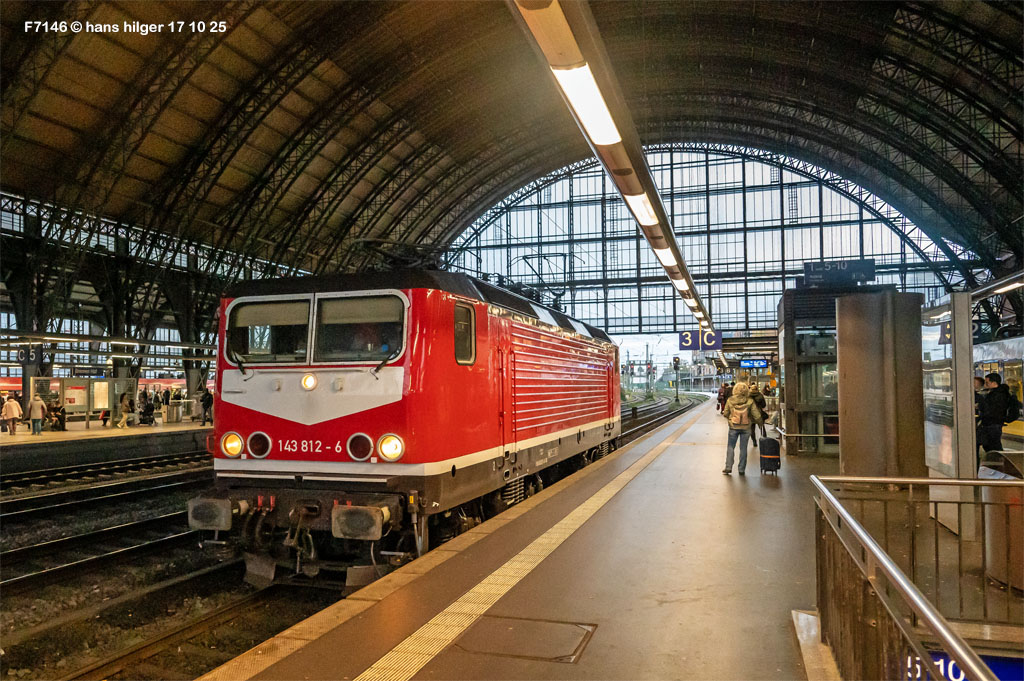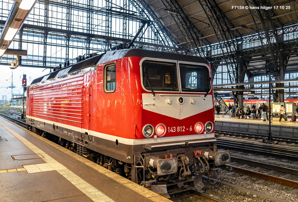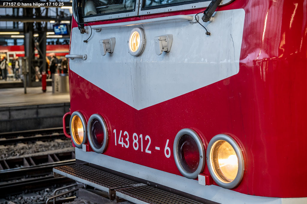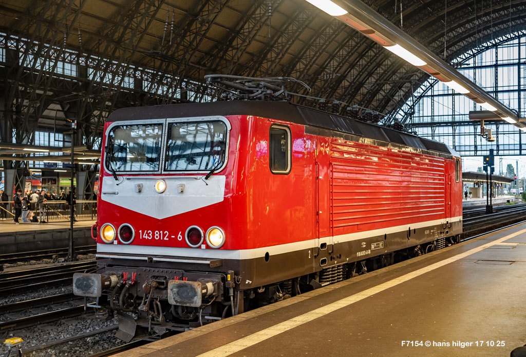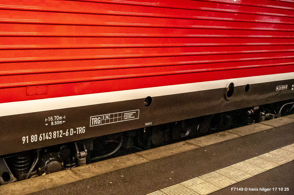 <> Die Überraschung im Bremer Hbf: Zu meiner Freude fand eine “neue” Triangula- 143 den Weg genau an meinen Bahnsteig<> Sie war schon von weitem zu erkennen als TRG- Lok durch das Orientrot mit dunklem Rahmen!<> Es war die 143 812 ex Karsdorf ex RBH mit der letzten HU- Anschrift vom 28.05.25 aus LH2 (Halle/Saale)<> Sie blieb fast genau bei mir stehen und gestattet einen genauen Blick auf das Lätzchen<> Dann entschwand sie wieder als Rangierfahrt im Mastenwald.