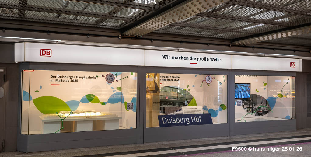 Bis Sommer 2024 waren die Bahnsteige 12/13 und 10/11 weitgehend fertig, im August ging es weiter mit der Sperrung von Bahnsteig 8/9 UND der gleichzeitigen Sperrung von Bahnsteig 5/6 = Heißt: Es waren die Gleise 5, 6, 7, 8 und 9 gesperrt und es wurde an zwei Bahnsteigen gleichzeitig gearbeitet, dafür ruhten die Klein- Arbeiten an den neuen Bahnsteigen 10/11 und 12/13. Allgemein ruhen die Großarbeiten über die Jahreswechsel, jeweils erst Mitte Januar kommt wieder Bewegung ins Spiel. Im Mai 25 ist der Rohbau 8/9 und 5/6 abgeschlossen, Mitte Juni kommt das Gleisdach zwischen 5/6 und 8/9 hinzu, im Oktober 25 werden die Bahnsteige 5/6 und 8/9 eröffnet, am 15.10. beginnt der Rohbau des Gleisdaches über den Gleisen 9 und 10, welches bis zum Jahresende 2025 fertig wird, damit sind zwei Drittel der Grob- Arbeiten am Duisburger Bahnhof geschafft. Im Januar 2026 gibt es als Fortschritt die restliche Verglasung der Ostwand, aber auch einen Rückschritt: Der längst fertige Bahnsteig 12/13 wird wieder zur Baustelle und die Innenverkleidung des Daches wird aus (noch) unklaren Gründen entfernt, zwei Tage später wieder montiert. Die längst geplante Baustelle 3/4 ist ab 07.02.26 eingerichtet und in Arbeit
