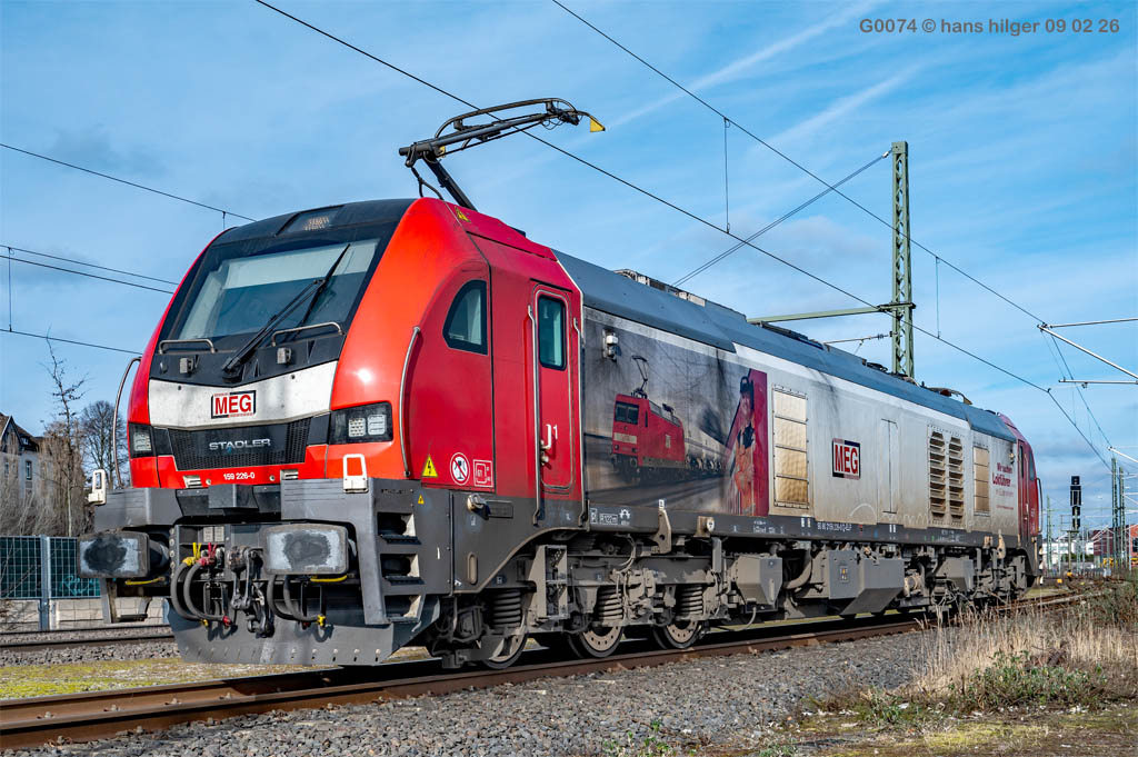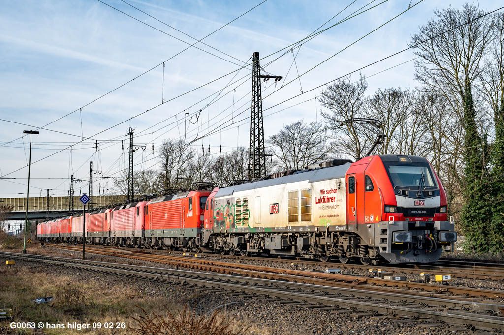 <15> Es klappte tatsächlich, vor dem Zug in Opladen zu sein, so daß das Umsetzen der Zuglok noch aufgenommen werden konnte<16> Bei diesem Umsetzen sind immer ganz feine Portraits möglich, so auch heute = 159 226 der MEG<17> Dann ging es ans eindrücken der Schrottloks in den Anschluß vom Bender, hier hat nun 112 151 die Nase vorn. Hier werde ich natürlich auf Einzelbilder der Loks verzichten (die haben wir ja schon gesehen), aber die HU- Daten kommen nun ins Spiel:<18> 112 151 = LDX 17.04.13 (Dessau) bis 17.04.21<19> 143 348 = LH2 24.07.17 (Halle/S) bis 21.06.25<20> 143 957 = BSN 07.11.18 (Senftenberg) bis 07.11.26, also theoretisch noch fahrfähig, aber mit Schäden<21> 143 658 = LMB R 26.05.15 (Magdeburg Buckau) bis 26.05.23<22> 143 138 = FF 14.07.16 (Frankfurt/Oder) bis 13.07.24 (Lackierung aus dem Jahre 2013 in Dessau)<23> 112 123 = LDX 13.10.15 bis 12.10.22 mit Möglichkeit für ein weiteres Jahr, das nicht genutzt wurde<24> 112 122 = LDX 20.05.16 (Dessau) bis 20.05.2425> 112 117 = WR 08.08.14 (Rostock) bis 04.08.22, auch eine Reichsbahnerin von 1993<26 Dann noch ein Bild der Zug- oder Schiebelok 159 226, die auf dieser Seite leider Grafittis hat. Zudem fällt aber auch auf, daß hier offenbar Grünschnittarbeiten ausgeführt wurden, das ist schön und nützlich