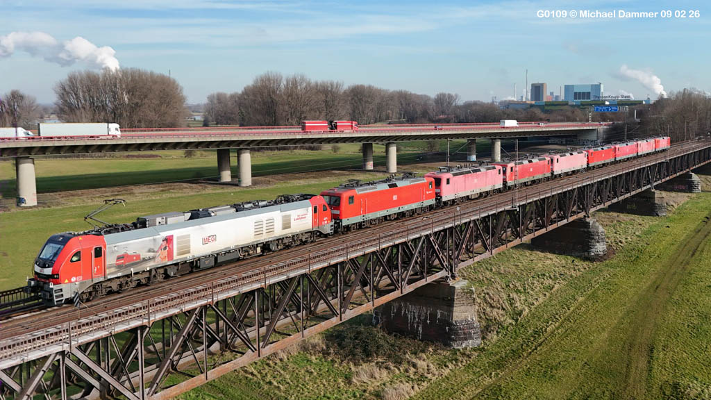 <1> Das erste Bild des Tages stammt nicht von mir, sondern von Michael Dammer. Früher hätten wir für solch ein Motiv einen Hubschrauber ordern müssen, in diesem Fall hat eine Brieftaube gereicht . . . Okay, is auch unglaubwürdig . . . ein Heißluftballon vielleicht . . .<2> Der Zug mußte dieses Mal wegen Bauarbeiten eine größere Umleitung fahren und kam dabei zweimal über den Rhein. Dies hier ist die erste Rhein- Überquerung im Duisburger Norden im Verlauf der Strecke von Oberhausen nach Moers, im Hintergrund die Autobahn A 42. Dank an Michael für diese feinen Bilder vom fliegenden Auge!<3> Ein paar Kilometer weiter kurz hinter der zweiten Rheinquerung in der Duisburger Mitte (Strecke Krefeld- Duisburg) stand ich bereit und wartete in der Kälte. Nun ist der Zug wieder auf der rechten Rheinseite, wo er auch verbleiben wird<4> Dort in Duisburg- Hochfeld waren sogar zwei Streckenaufnahmen von 159 226 möglich