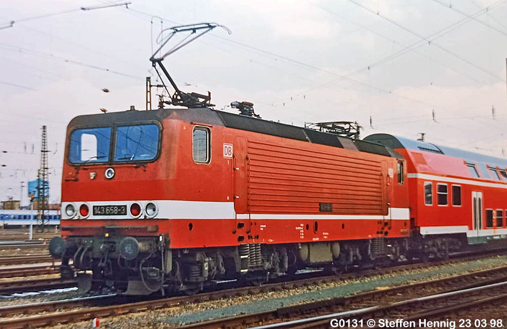 <37> 112 117 in Wittenberg am 19.03.21<38> 112 122 in Wittenberg am 21.03.21<39> Und 112 123 ebenfalls in Wittenberg am 18.03.21<40> Und auch noch die 143 658 hat Steffen zu liefern: Am 23.03.98 in Leipzig. Diese Lok war nach der Wende eine der letztgebauten 143 überhaupt, denn die letzte Serie endete mit der Nummer 659. Danach wurden noch einige wenige Unfallloks wieder neu aufgebaut mit Nummern oberhalb von 660, aber die Beschaffung neuer 143 war damit abgeschlossen; Hinweis: Die 800er und 900er Nummern waren VOR dieser 600er Serie gebaut worden, die 659 war tatsächlich die Letzte und 658 entsprechend eben die vorletzte Abgelieferte, deren Geschichte nun zu Ende geht . . .