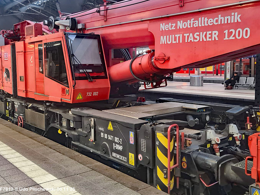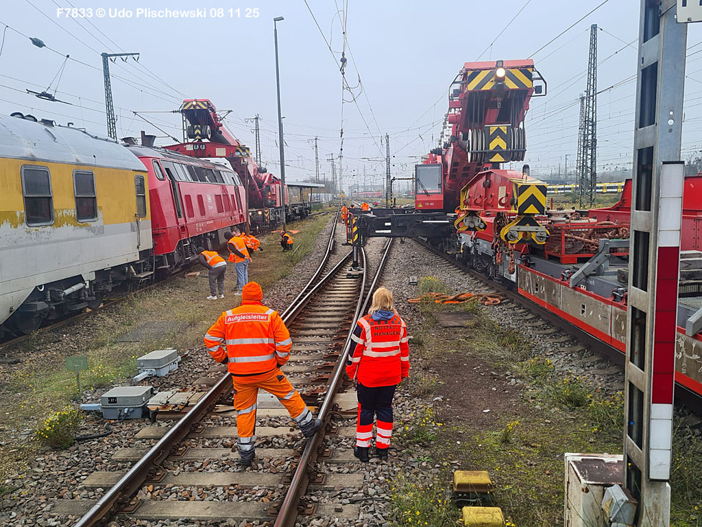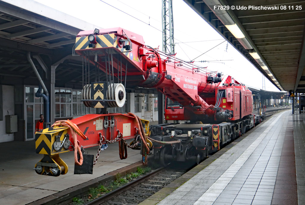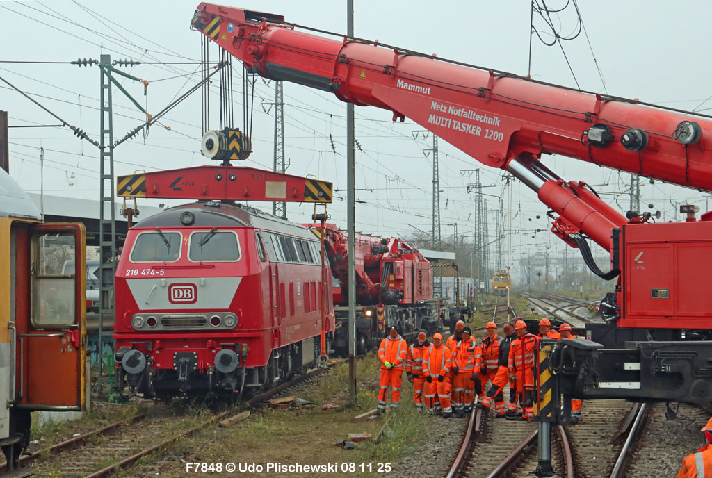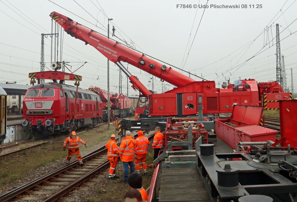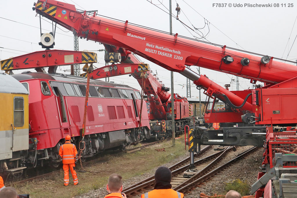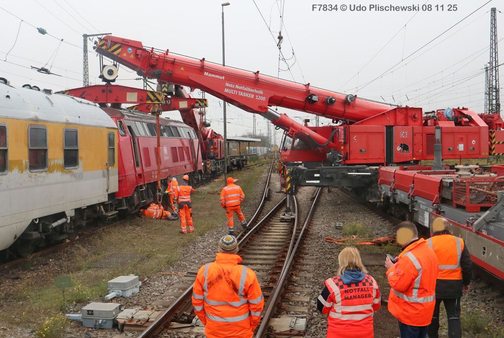 <1> Dieses war das erste Bild des Unfalls, das Hundertfach die Runde machte: Wir sehen die stark zur Seite geneigte 218 474, neben der zufällig 151 116 von KonRail geparkt war, eine der Firmen, die sofort Hilfe anboten, was von T4T dankend mitgeteilt wurde in einer Stellungnahme, zu der auch dieses Bild gehört (das danach zur Massenware wurde), aber hier mit Autorisation von T4T eingestellt ist<2> Bereits am nächsten Tag, dem 08.11.25, sollte die Lok geborgen werden, wozu zwei Großkräne der DBAG unterwegs waren. Ein solches Schauspiel läuft normalerweise im Verborgenen ab auf unzugänglichem Gelände, hier aber war es im Karlsruher Hbf und war damit einzusehen, was sich Udo nicht entgehen lassen wollte = Dies war sein erster Anblick des Geschehens<3> Deutlich ist die Neigung der Lok zu erkennen, die nun auf einer Seite zwischen den Schienen steht, wohingegen der Messwagen der Systemtechnik München die Stelle problemlos überrollt hatte, nun war aber für Beide erstmal Feierabend<4> 218 474 hat eine HU vom 23.10.25, die also gerade erst wenige Tage zurückliegt, es handelt sich quasi um eine neue Lok, auch wenn sie schon das Baujahr 1977 hat<5> Deutlich zu sehen, daß die Räder auf dieser Seite noch auf der Schiene stehen, auf der anderen Seite aber nicht: Beide Schienen sind nach außen weggedrückt, sodaß die Lok in die zu große Spurweite hineingefallen ist<6> Ungewöhnlich schnell war der dringende Hilfszug in Karlsruhe, der gleich zwei Großkräne mitbrachte, von denen es bei der DBAG drei Stück gibt, die in Ruhezeiten auf die Orte Leipzig, Fulda und Wanne-Eickel verteilt sind. Ungewöhnlich war auch die Zuglok der Kräne: Die ungewöhnliche Nummer 185 185<7> Und hier kommen die Kräne in Sicht, der Zug steht, Udo kann an ihnen vorbeilaufen, so nah, wie man unter normalen Umständen nie an sie herankommen würde, wir sehen einen “Multi Tasker 1200 von Kirow Ardelt“<8> Dann sehen wir: Es ist der zweite seines Typs, der 732 002 “Mammut”, der seinen Heimathafen in Leipzig hat. In der NVR-Nummer besitzt er allerdings eine ganz andere Nummer: Bei den Bahndienstfahrzeugen heißt er 9471 002, letzte HU 28.10.22<9> Hier sehen wir ihn von hinten mit seinem “Gegenlastwagen” = An diesem Teleskopausleger werden jeweils Gegengewichte angebracht, die das Gewicht des Kranauslegers ausgleichen sollen und davon abhängig sind, wie weit der Ausleger ausgefahren ist und in welchem Winkel er steht<10> Der zweite Kran im Zug ist der 732 001, der erste seiner Art, Baujahr 2014. Er trägt den Namen “Zeus”, die NVR-Nummer 9471 001 und seine übliche Heimat ist Fulda, er hatte seine letzte HU am 19.08.21<11> Als “001”- Fahrzeug ist er natürlich besonders interessant, daher sehen wir ihn hier auch von seiner anderen Seite<12> Für die Bergung der Unfalllok waren in Karlsruhe gleich drei Gleise gesperrt, auf denen sich nun die Kräne breitmachen durften: Diese Kräne haben einen eigenen Antrieb, der allerdings nicht streckentauglich ist, aber hier im Bahnhof ist die Bewegung kein Probelm, einer von ihnen ist mit seinem gesamten Equipment hier links unterwegs mit eigener Kraft zur Unfallstelle<13> Dort aber hat ein Winzling in Gelb (im Gegenteil zum riesigen Kran) vorübergehend das Sagen: Der Turmtriebwagen 711 006 von Railsystems aus Gotha war in der Nähe und kann helfen, die Fahrleitung über der 218 zu entfernen, um Platz für die Kräne zu schaffen<14> Auch solche Einsätze sind nur selten zu knipsen, hier hatte Udo die Gelegenheit<15> Die gesamte Szenerie mit zwei Erdungsstangen, man will ja kein Risiko eingehen<16> MIt ganzem Einsatz wird hier gearbeitet und der Beobachter staunt, wie schnell und geübt das geht<17> Schon kommt die Vorhut der Kräne am Tatort an, gezogen von 294 651, rechts beobachtet die leider schon länger abgestellte blaue 120 204 das Geschehen<18> Das war schon ein ziemliches Gewusel, aber Jeder wußte, was zu tun ist<19> Die Kräne sind vorbereitet und rollen an, hier “Zeus” 732 001 schon mit angehängter Traverse<20> Hier sind beide in Warteposition, zum Eingreifen bereit<21> Es geht los: Zeus 001 erreicht den Havaristen, beobachtet vom “Aufgleisleiter” und der Notfall- Managerin<22> Zeus 001 hat schon seine Traverse im Anschlag, Mammut 002 schwenkt gerade aus<23> Beide Kräne (oder Krane?*) in Arbeitsposition ( *= Beides ist richtig laut Duden)<24> Unter beiden Drehgestellen hindurch werden Aufhängevorrichtungen befestigt<25> Es dauerte seine Zeit, bis alles verzurrt war<26> Die Lok steht immer noch schräg, aber sie schwebt bereits<27> Immer noch schräg hängt sie in der Luft und wird gerade etwas verfahren, um vom Wagen freizukommen<28> Dann zeigen die Kräne ihr Können: Sie sind in der Lage, die Traversen schräg zu stellen und damit die Lok gerade zu richten<29> Nun wird sie hinten mit der ersten Achse wieder abgesetzt auf einem Gleisstück, das noch ausreichend fest ist, die Lok zu tragen. Dort wurden vorher zur Sicherheit mehrere Abstandshalter eingesetzt, um das Malheur nicht in die Wiederholung zu lassen<30> Nun steht die Lok mit der hinteren Achse wieder auf dem Gleis, vorne schwebt sie noch<31> Und sie bewegt sich: Langsam wird sie in den befestigen Gleisabschnitt verschoben<32> Alles muß genau kontrolliert werden, um zu sehen, ob das Gleis wirklich hält<33> Der Kran mit der hinteren Traverse ist bereits abgerückt, Mammut 002 verfährt die Lok nun alleine<34> Nun ist eine sichere Stelle erreicht<35> Der ganze Kran bei der Arbeit, der hier nur ein kleines Gegengewicht benötigt (rechts zu sehen)<36> Das Eingleisen erfolgt langsam und so ähnlich wie bei Märklin<37> Und -wie wunderbar- es ist Zeit für ein Gruppenfoto nach getaner Arbeit! Sehr schön! Leider muß ich alle Darsteller hier verpixeln, aber ein aussagekräftiges Bild ist es dennoch geworden<38> Und während die Kräne zusammenpacken, beginnt der TVT schon wieder, die Fahrleitung zusammenzuknoten und Gleisbauer befestigen die Unfallstelle mit den bereits erwähnte