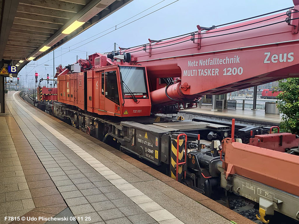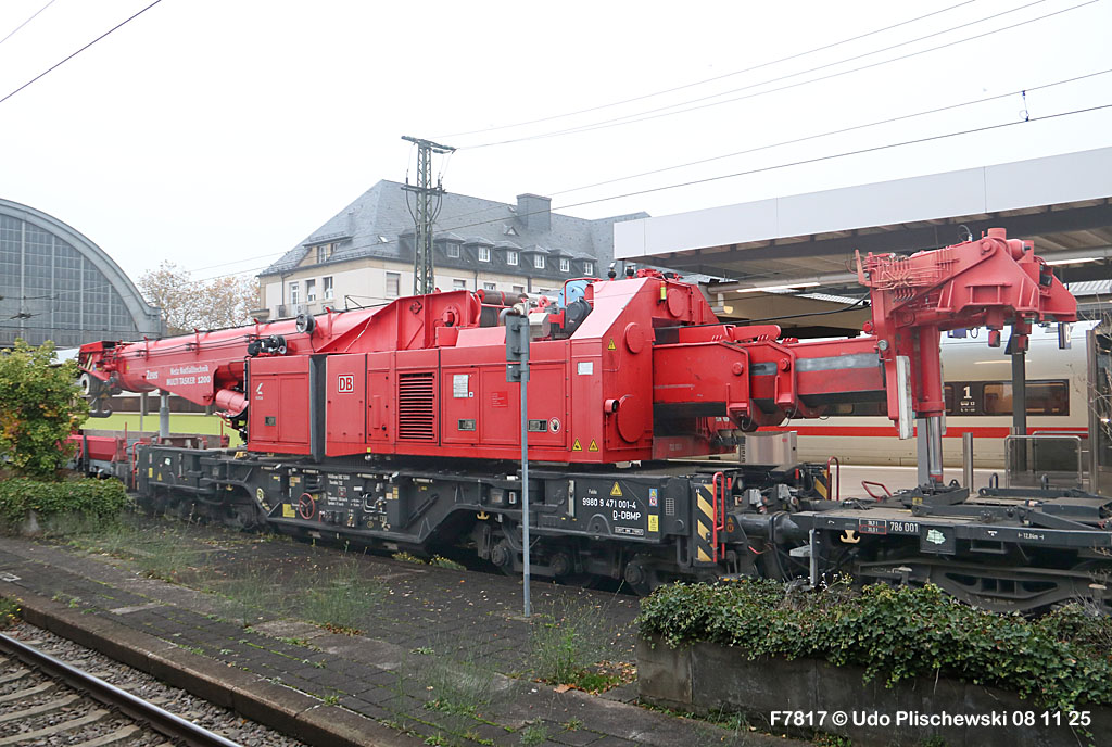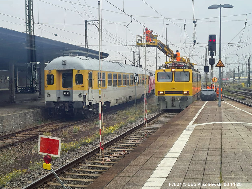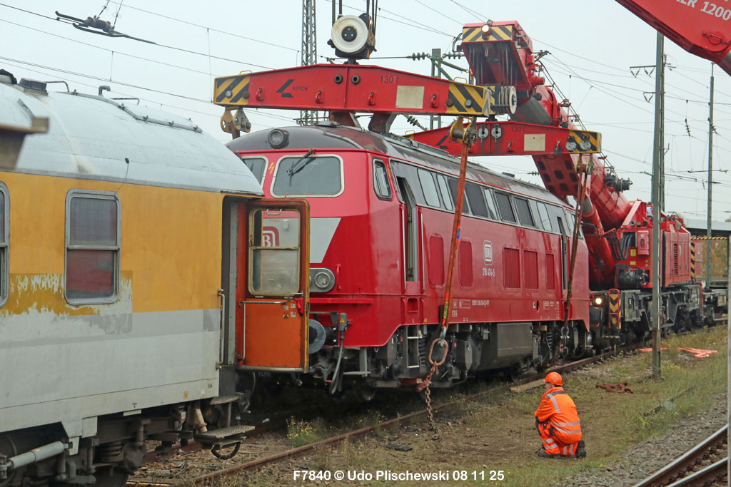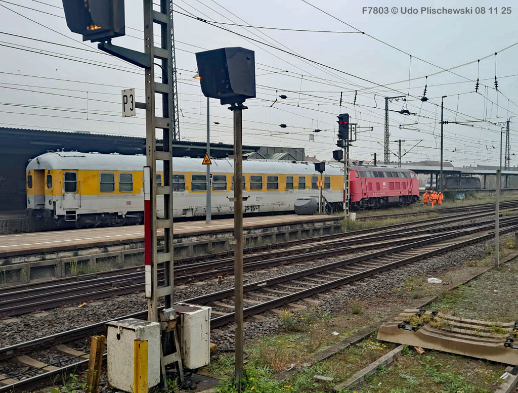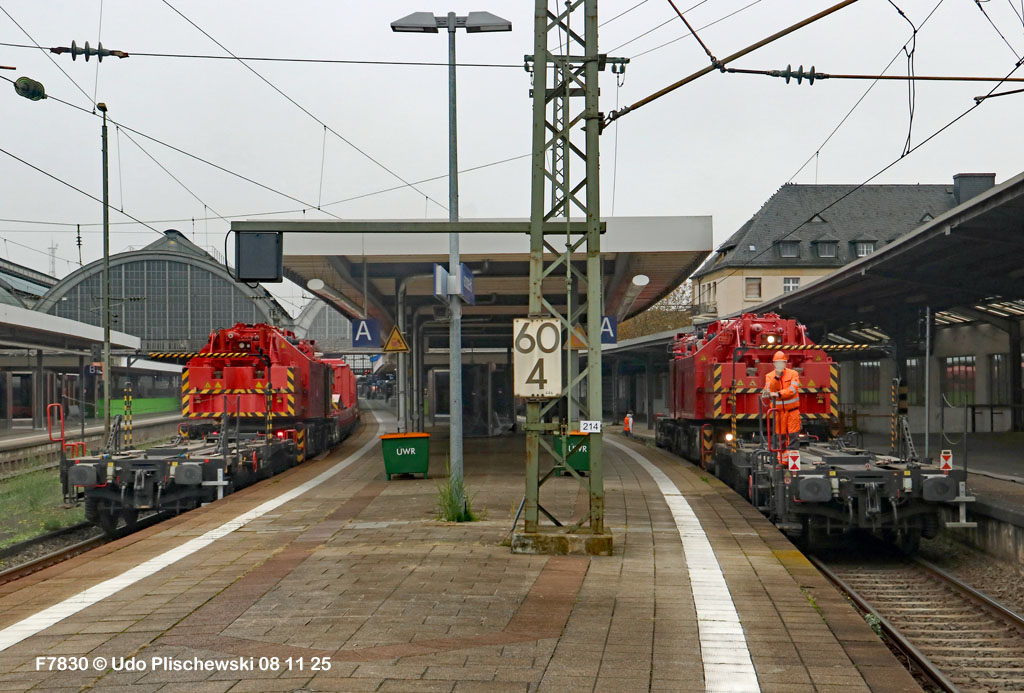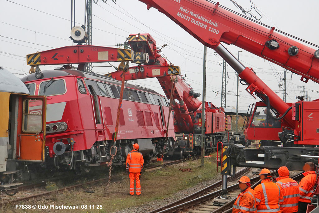 <1> Dieses war das erste Bild des Unfalls, das Hundertfach die Runde machte: Wir sehen die stark zur Seite geneigte 218 474, neben der zufällig 151 116 von KonRail geparkt war, eine der Firmen, die sofort Hilfe anboten, was von T4T dankend mitgeteilt wurde in einer Stellungnahme, zu der auch dieses Bild gehört (das danach zur Massenware wurde), aber hier mit Autorisation von T4T eingestellt ist<2> Bereits am nächsten Tag, dem 08.11.25, sollte die Lok geborgen werden, wozu zwei Großkräne der DBAG unterwegs waren. Ein solches Schauspiel läuft normalerweise im Verborgenen ab auf unzugänglichem Gelände, hier aber war es im Karlsruher Hbf und war damit einzusehen, was sich Udo nicht entgehen lassen wollte = Dies war sein erster Anblick des Geschehens<3> Deutlich ist die Neigung der Lok zu erkennen, die nun auf einer Seite zwischen den Schienen steht, wohingegen der Messwagen der Systemtechnik München die Stelle problemlos überrollt hatte, nun war aber für Beide erstmal Feierabend<4> 218 474 hat eine HU vom 23.10.25, die also gerade erst wenige Tage zurückliegt, es handelt sich quasi um eine neue Lok, auch wenn sie schon das Baujahr 1977 hat<5> Deutlich zu sehen, daß die Räder auf dieser Seite noch auf der Schiene stehen, auf der anderen Seite aber nicht: Beide Schienen sind nach außen weggedrückt, sodaß die Lok in die zu große Spurweite hineingefallen ist<6> Ungewöhnlich schnell war der dringende Hilfszug in Karlsruhe, der gleich zwei Großkräne mitbrachte, von denen es bei der DBAG drei Stück gibt, die in Ruhezeiten auf die Orte Leipzig, Fulda und Wanne-Eickel verteilt sind. Ungewöhnlich war auch die Zuglok der Kräne: Die ungewöhnliche Nummer 185 185<7> Und hier kommen die Kräne in Sicht, der Zug steht, Udo kann an ihnen vorbeilaufen, so nah, wie man unter normalen Umständen nie an sie herankommen würde, wir sehen einen “Multi Tasker 1200 von Kirow Ardelt“<8> Dann sehen wir: Es ist der zweite seines Typs, der 732 002 “Mammut”, der seinen Heimathafen in Leipzig hat. In der NVR-Nummer besitzt er allerdings eine ganz andere Nummer: Bei den Bahndienstfahrzeugen heißt er 9471 002, letzte HU 28.10.22<9> Hier sehen wir ihn von hinten mit seinem “Gegenlastwagen” = An diesem Teleskopausleger werden jeweils Gegengewichte angebracht, die das Gewicht des Kranauslegers ausgleichen sollen und davon abhängig sind, wie weit der Ausleger ausgefahren ist und in welchem Winkel er steht<10> Der zweite Kran im Zug ist der 732 001, der erste seiner Art, Baujahr 2014. Er trägt den Namen “Zeus”, die NVR-Nummer 9471 001 und seine übliche Heimat ist Fulda, er hatte seine letzte HU am 19.08.21<11> Als “001”- Fahrzeug ist er natürlich besonders interessant, daher sehen wir ihn hier auch von seiner anderen Seite<12> Für die Bergung der Unfalllok waren in Karlsruhe gleich drei Gleise gesperrt, auf denen sich nun die Kräne breitmachen durften: Diese Kräne haben einen eigenen Antrieb, der allerdings nicht streckentauglich ist, aber hier im Bahnhof ist die Bewegung kein Probelm, einer von ihnen ist mit seinem gesamten Equipment hier links unterwegs mit eigener Kraft zur Unfallstelle<13> Dort aber hat ein Winzling in Gelb (im Gegenteil zum riesigen Kran) vorübergehend das Sagen: Der Turmtriebwagen 711 006 von Railsystems aus Gotha war in der Nähe und kann helfen, die Fahrleitung über der 218 zu entfernen, um Platz für die Kräne zu schaffen<14> Auch solche Einsätze sind nur selten zu knipsen, hier hatte Udo die Gelegenheit<15> Die gesamte Szenerie mit zwei Erdungsstangen, man will ja kein Risiko eingehen<16> MIt ganzem Einsatz wird hier gearbeitet und der Beobachter staunt, wie schnell und geübt das geht<17> Schon kommt die Vorhut der Kräne am Tatort an, gezogen von 294 651, rechts beobachtet die leider schon länger abgestellte blaue 120 204 das Geschehen<18> Das war schon ein ziemliches Gewusel, aber Jeder wußte, was zu tun ist<19> Die Kräne sind vorbereitet und rollen an, hier “Zeus” 732 001 schon mit angehängter Traverse<20> Hier sind beide in Warteposition, zum Eingreifen bereit<21> Es geht los: Zeus 001 erreicht den Havaristen, beobachtet vom “Aufgleisleiter” und der Notfall- Managerin<22> Zeus 001 hat schon seine Traverse im Anschlag, Mammut 002 schwenkt gerade aus<23> Beide Kräne (oder Krane?*) in Arbeitsposition ( *= Beides ist richtig laut Duden)<24> Unter beiden Drehgestellen hindurch werden Aufhängevorrichtungen befestigt<25> Es dauerte seine Zeit, bis alles verzurrt war<26> Die Lok steht immer noch schräg, aber sie schwebt bereits<27> Immer noch schräg hängt sie in der Luft und wird gerade etwas verfahren, um vom Wagen freizukommen<28> Dann zeigen die Kräne ihr Können: Sie sind in der Lage, die Traversen schräg zu stellen und damit die Lok gerade zu richten<29> Nun wird sie hinten mit der ersten Achse wieder abgesetzt auf einem Gleisstück, das noch ausreichend fest ist, die Lok zu tragen. Dort wurden vorher zur Sicherheit mehrere Abstandshalter eingesetzt, um das Malheur nicht in die Wiederholung zu lassen<30> Nun steht die Lok mit der hinteren Achse wieder auf dem Gleis, vorne schwebt sie noch<31> Und sie bewegt sich: Langsam wird sie in den befestigen Gleisabschnitt verschoben<32> Alles muß genau kontrolliert werden, um zu sehen, ob das Gleis wirklich hält<33> Der Kran mit der hinteren Traverse ist bereits abgerückt, Mammut 002 verfährt die Lok nun alleine<34> Nun ist eine sichere Stelle erreicht<35> Der ganze Kran bei der Arbeit, der hier nur ein kleines Gegengewicht benötigt (rechts zu sehen)<36> Das Eingleisen erfolgt langsam und so ähnlich wie bei Märklin<37> Und -wie wunderbar- es ist Zeit für ein Gruppenfoto nach getaner Arbeit! Sehr schön! Leider muß ich alle Darsteller hier verpixeln, aber ein aussagekräftiges Bild ist es dennoch geworden<38> Und während die Kräne zusammenpacken, beginnt der TVT schon wieder, die Fahrleitung zusammenzuknoten und Gleisbauer befestigen die Unfallstelle mit den bereits erwähnte