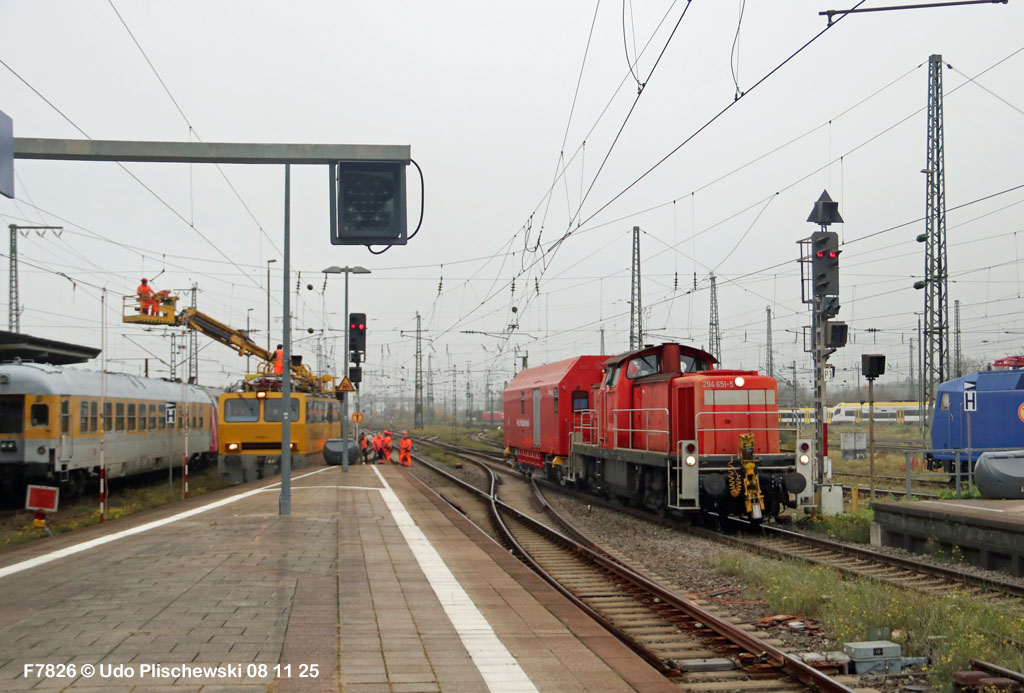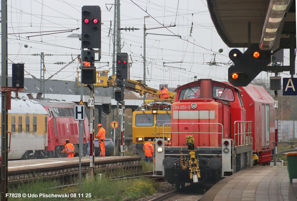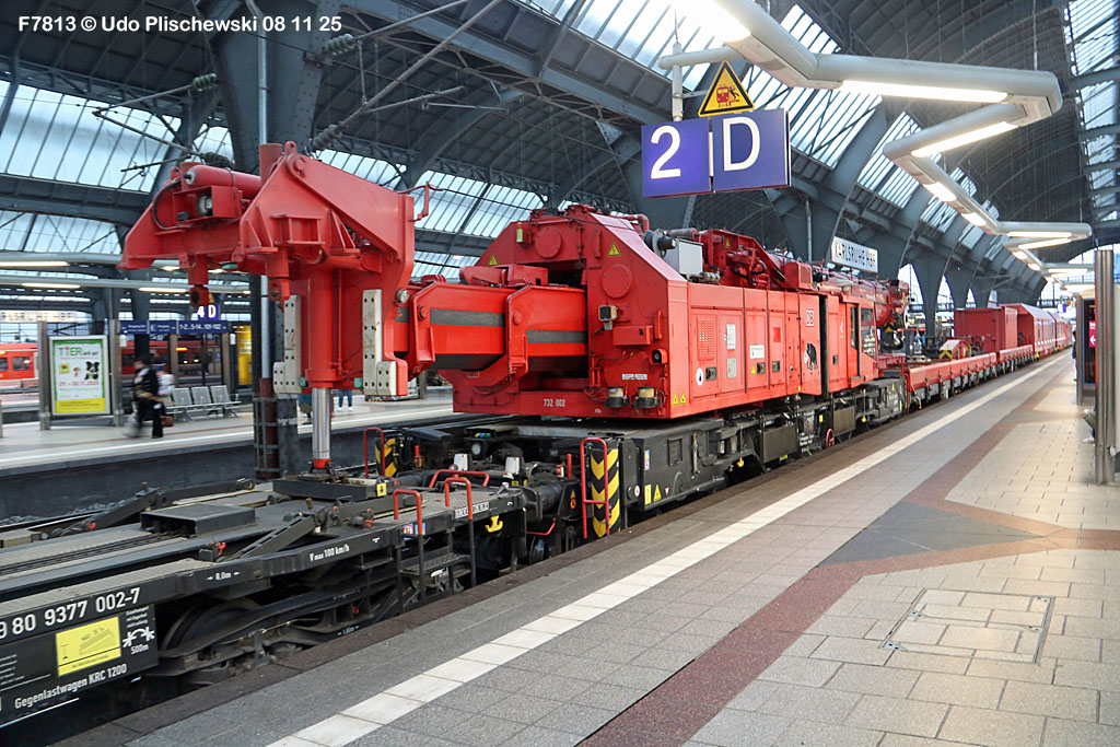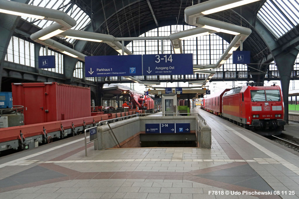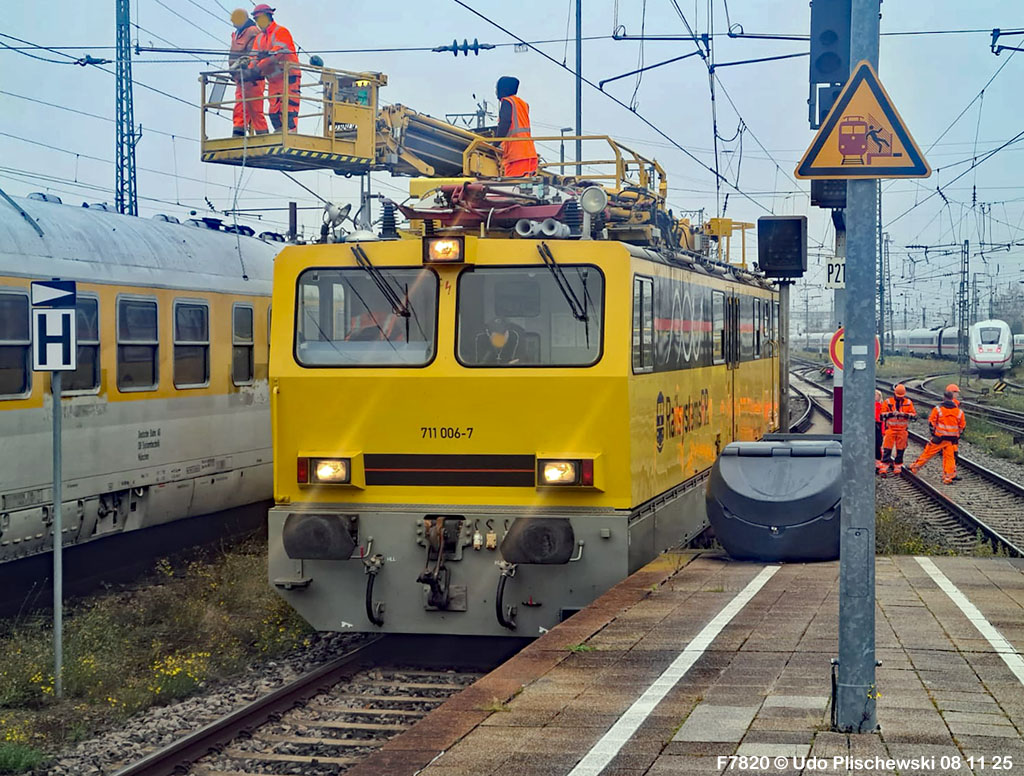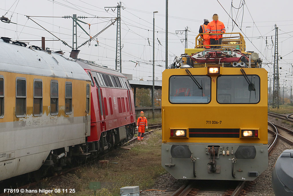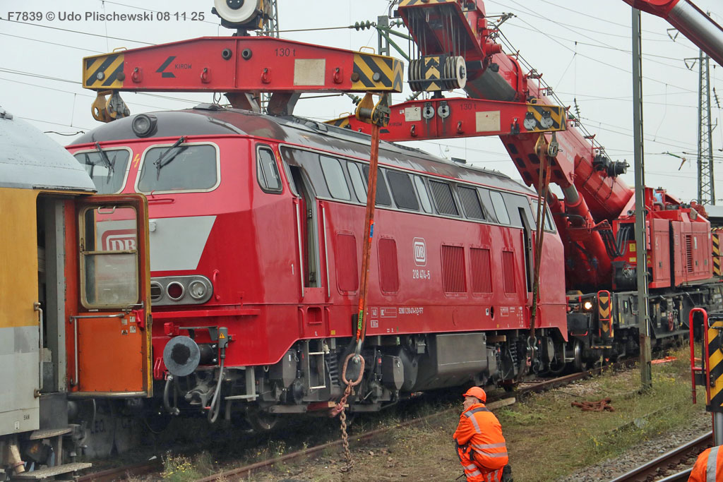 <1> Dieses war das erste Bild des Unfalls, das Hundertfach die Runde machte: Wir sehen die stark zur Seite geneigte 218 474, neben der zufällig 151 116 von KonRail geparkt war, eine der Firmen, die sofort Hilfe anboten, was von T4T dankend mitgeteilt wurde in einer Stellungnahme, zu der auch dieses Bild gehört (das danach zur Massenware wurde), aber hier mit Autorisation von T4T eingestellt ist<2> Bereits am nächsten Tag, dem 08.11.25, sollte die Lok geborgen werden, wozu zwei Großkräne der DBAG unterwegs waren. Ein solches Schauspiel läuft normalerweise im Verborgenen ab auf unzugänglichem Gelände, hier aber war es im Karlsruher Hbf und war damit einzusehen, was sich Udo nicht entgehen lassen wollte = Dies war sein erster Anblick des Geschehens<3> Deutlich ist die Neigung der Lok zu erkennen, die nun auf einer Seite zwischen den Schienen steht, wohingegen der Messwagen der Systemtechnik München die Stelle problemlos überrollt hatte, nun war aber für Beide erstmal Feierabend<4> 218 474 hat eine HU vom 23.10.25, die also gerade erst wenige Tage zurückliegt, es handelt sich quasi um eine neue Lok, auch wenn sie schon das Baujahr 1977 hat<5> Deutlich zu sehen, daß die Räder auf dieser Seite noch auf der Schiene stehen, auf der anderen Seite aber nicht: Beide Schienen sind nach außen weggedrückt, sodaß die Lok in die zu große Spurweite hineingefallen ist<6> Ungewöhnlich schnell war der dringende Hilfszug in Karlsruhe, der gleich zwei Großkräne mitbrachte, von denen es bei der DBAG drei Stück gibt, die in Ruhezeiten auf die Orte Leipzig, Fulda und Wanne-Eickel verteilt sind. Ungewöhnlich war auch die Zuglok der Kräne: Die ungewöhnliche Nummer 185 185<7> Und hier kommen die Kräne in Sicht, der Zug steht, Udo kann an ihnen vorbeilaufen, so nah, wie man unter normalen Umständen nie an sie herankommen würde, wir sehen einen “Multi Tasker 1200 von Kirow Ardelt“<8> Dann sehen wir: Es ist der zweite seines Typs, der 732 002 “Mammut”, der seinen Heimathafen in Leipzig hat. In der NVR-Nummer besitzt er allerdings eine ganz andere Nummer: Bei den Bahndienstfahrzeugen heißt er 9471 002, letzte HU 28.10.22<9> Hier sehen wir ihn von hinten mit seinem “Gegenlastwagen” = An diesem Teleskopausleger werden jeweils Gegengewichte angebracht, die das Gewicht des Kranauslegers ausgleichen sollen und davon abhängig sind, wie weit der Ausleger ausgefahren ist und in welchem Winkel er steht<10> Der zweite Kran im Zug ist der 732 001, der erste seiner Art, Baujahr 2014. Er trägt den Namen “Zeus”, die NVR-Nummer 9471 001 und seine übliche Heimat ist Fulda, er hatte seine letzte HU am 19.08.21<11> Als “001”- Fahrzeug ist er natürlich besonders interessant, daher sehen wir ihn hier auch von seiner anderen Seite<12> Für die Bergung der Unfalllok waren in Karlsruhe gleich drei Gleise gesperrt, auf denen sich nun die Kräne breitmachen durften: Diese Kräne haben einen eigenen Antrieb, der allerdings nicht streckentauglich ist, aber hier im Bahnhof ist die Bewegung kein Probelm, einer von ihnen ist mit seinem gesamten Equipment hier links unterwegs mit eigener Kraft zur Unfallstelle<13> Dort aber hat ein Winzling in Gelb (im Gegenteil zum riesigen Kran) vorübergehend das Sagen: Der Turmtriebwagen 711 006 von Railsystems aus Gotha war in der Nähe und kann helfen, die Fahrleitung über der 218 zu entfernen, um Platz für die Kräne zu schaffen<14> Auch solche Einsätze sind nur selten zu knipsen, hier hatte Udo die Gelegenheit<15> Die gesamte Szenerie mit zwei Erdungsstangen, man will ja kein Risiko eingehen<16> MIt ganzem Einsatz wird hier gearbeitet und der Beobachter staunt, wie schnell und geübt das geht<17> Schon kommt die Vorhut der Kräne am Tatort an, gezogen von 294 651, rechts beobachtet die leider schon länger abgestellte blaue 120 204 das Geschehen<18> Das war schon ein ziemliches Gewusel, aber Jeder wußte, was zu tun ist<19> Die Kräne sind vorbereitet und rollen an, hier “Zeus” 732 001 schon mit angehängter Traverse<20> Hier sind beide in Warteposition, zum Eingreifen bereit<21> Es geht los: Zeus 001 erreicht den Havaristen, beobachtet vom “Aufgleisleiter” und der Notfall- Managerin<22> Zeus 001 hat schon seine Traverse im Anschlag, Mammut 002 schwenkt gerade aus<23> Beide Kräne (oder Krane?*) in Arbeitsposition ( *= Beides ist richtig laut Duden)<24> Unter beiden Drehgestellen hindurch werden Aufhängevorrichtungen befestigt<25> Es dauerte seine Zeit, bis alles verzurrt war<26> Die Lok steht immer noch schräg, aber sie schwebt bereits<27> Immer noch schräg hängt sie in der Luft und wird gerade etwas verfahren, um vom Wagen freizukommen<28> Dann zeigen die Kräne ihr Können: Sie sind in der Lage, die Traversen schräg zu stellen und damit die Lok gerade zu richten<29> Nun wird sie hinten mit der ersten Achse wieder abgesetzt auf einem Gleisstück, das noch ausreichend fest ist, die Lok zu tragen. Dort wurden vorher zur Sicherheit mehrere Abstandshalter eingesetzt, um das Malheur nicht in die Wiederholung zu lassen<30> Nun steht die Lok mit der hinteren Achse wieder auf dem Gleis, vorne schwebt sie noch<31> Und sie bewegt sich: Langsam wird sie in den befestigen Gleisabschnitt verschoben<32> Alles muß genau kontrolliert werden, um zu sehen, ob das Gleis wirklich hält<33> Der Kran mit der hinteren Traverse ist bereits abgerückt, Mammut 002 verfährt die Lok nun alleine<34> Nun ist eine sichere Stelle erreicht<35> Der ganze Kran bei der Arbeit, der hier nur ein kleines Gegengewicht benötigt (rechts zu sehen)<36> Das Eingleisen erfolgt langsam und so ähnlich wie bei Märklin<37> Und -wie wunderbar- es ist Zeit für ein Gruppenfoto nach getaner Arbeit! Sehr schön! Leider muß ich alle Darsteller hier verpixeln, aber ein aussagekräftiges Bild ist es dennoch geworden<38> Und während die Kräne zusammenpacken, beginnt der TVT schon wieder, die Fahrleitung zusammenzuknoten und Gleisbauer befestigen die Unfallstelle mit den bereits erwähnte