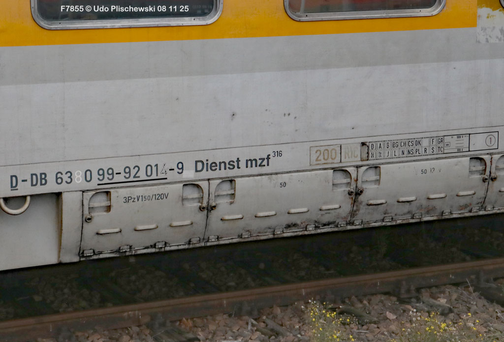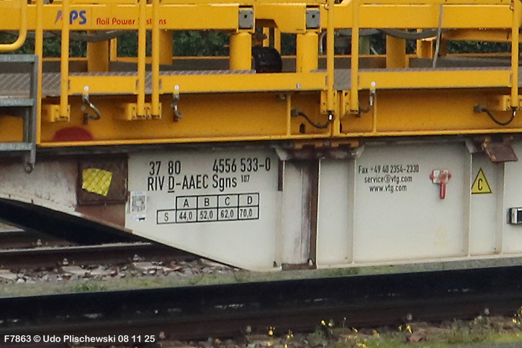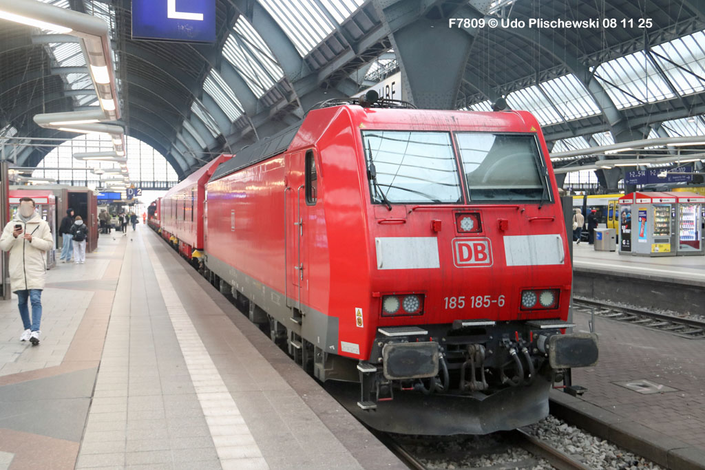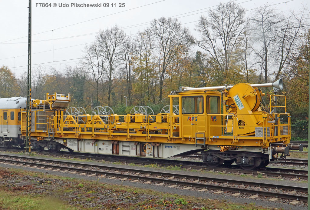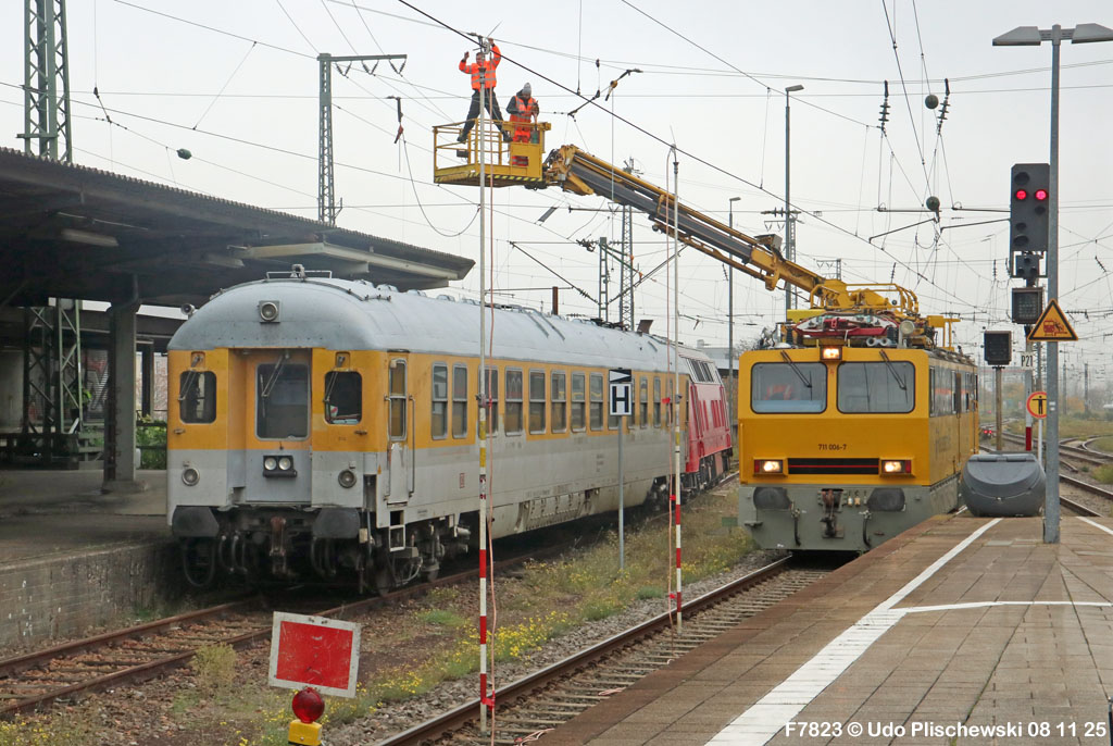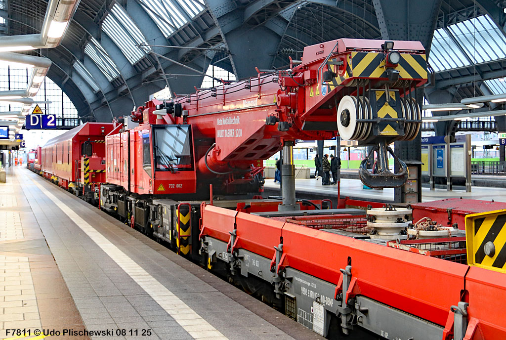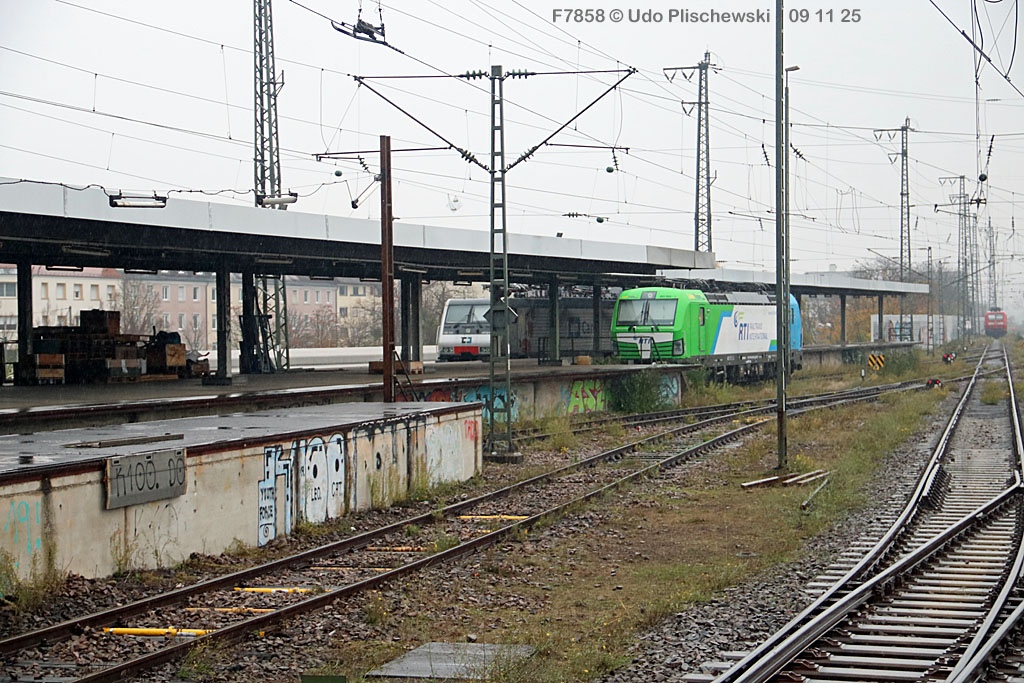 <1> Dieses war das erste Bild des Unfalls, das Hundertfach die Runde machte: Wir sehen die stark zur Seite geneigte 218 474, neben der zufällig 151 116 von KonRail geparkt war, eine der Firmen, die sofort Hilfe anboten, was von T4T dankend mitgeteilt wurde in einer Stellungnahme, zu der auch dieses Bild gehört (das danach zur Massenware wurde), aber hier mit Autorisation von T4T eingestellt ist<2> Bereits am nächsten Tag, dem 08.11.25, sollte die Lok geborgen werden, wozu zwei Großkräne der DBAG unterwegs waren. Ein solches Schauspiel läuft normalerweise im Verborgenen ab auf unzugänglichem Gelände, hier aber war es im Karlsruher Hbf und war damit einzusehen, was sich Udo nicht entgehen lassen wollte = Dies war sein erster Anblick des Geschehens<3> Deutlich ist die Neigung der Lok zu erkennen, die nun auf einer Seite zwischen den Schienen steht, wohingegen der Messwagen der Systemtechnik München die Stelle problemlos überrollt hatte, nun war aber für Beide erstmal Feierabend<4> 218 474 hat eine HU vom 23.10.25, die also gerade erst wenige Tage zurückliegt, es handelt sich quasi um eine neue Lok, auch wenn sie schon das Baujahr 1977 hat<5> Deutlich zu sehen, daß die Räder auf dieser Seite noch auf der Schiene stehen, auf der anderen Seite aber nicht: Beide Schienen sind nach außen weggedrückt, sodaß die Lok in die zu große Spurweite hineingefallen ist<6> Ungewöhnlich schnell war der dringende Hilfszug in Karlsruhe, der gleich zwei Großkräne mitbrachte, von denen es bei der DBAG drei Stück gibt, die in Ruhezeiten auf die Orte Leipzig, Fulda und Wanne-Eickel verteilt sind. Ungewöhnlich war auch die Zuglok der Kräne: Die ungewöhnliche Nummer 185 185<7> Und hier kommen die Kräne in Sicht, der Zug steht, Udo kann an ihnen vorbeilaufen, so nah, wie man unter normalen Umständen nie an sie herankommen würde, wir sehen einen “Multi Tasker 1200 von Kirow Ardelt“<8> Dann sehen wir: Es ist der zweite seines Typs, der 732 002 “Mammut”, der seinen Heimathafen in Leipzig hat. In der NVR-Nummer besitzt er allerdings eine ganz andere Nummer: Bei den Bahndienstfahrzeugen heißt er 9471 002, letzte HU 28.10.22<9> Hier sehen wir ihn von hinten mit seinem “Gegenlastwagen” = An diesem Teleskopausleger werden jeweils Gegengewichte angebracht, die das Gewicht des Kranauslegers ausgleichen sollen und davon abhängig sind, wie weit der Ausleger ausgefahren ist und in welchem Winkel er steht<10> Der zweite Kran im Zug ist der 732 001, der erste seiner Art, Baujahr 2014. Er trägt den Namen “Zeus”, die NVR-Nummer 9471 001 und seine übliche Heimat ist Fulda, er hatte seine letzte HU am 19.08.21<11> Als “001”- Fahrzeug ist er natürlich besonders interessant, daher sehen wir ihn hier auch von seiner anderen Seite<12> Für die Bergung der Unfalllok waren in Karlsruhe gleich drei Gleise gesperrt, auf denen sich nun die Kräne breitmachen durften: Diese Kräne haben einen eigenen Antrieb, der allerdings nicht streckentauglich ist, aber hier im Bahnhof ist die Bewegung kein Probelm, einer von ihnen ist mit seinem gesamten Equipment hier links unterwegs mit eigener Kraft zur Unfallstelle<13> Dort aber hat ein Winzling in Gelb (im Gegenteil zum riesigen Kran) vorübergehend das Sagen: Der Turmtriebwagen 711 006 von Railsystems aus Gotha war in der Nähe und kann helfen, die Fahrleitung über der 218 zu entfernen, um Platz für die Kräne zu schaffen<14> Auch solche Einsätze sind nur selten zu knipsen, hier hatte Udo die Gelegenheit<15> Die gesamte Szenerie mit zwei Erdungsstangen, man will ja kein Risiko eingehen<16> MIt ganzem Einsatz wird hier gearbeitet und der Beobachter staunt, wie schnell und geübt das geht<17> Schon kommt die Vorhut der Kräne am Tatort an, gezogen von 294 651, rechts beobachtet die leider schon länger abgestellte blaue 120 204 das Geschehen<18> Das war schon ein ziemliches Gewusel, aber Jeder wußte, was zu tun ist<19> Die Kräne sind vorbereitet und rollen an, hier “Zeus” 732 001 schon mit angehängter Traverse<20> Hier sind beide in Warteposition, zum Eingreifen bereit<21> Es geht los: Zeus 001 erreicht den Havaristen, beobachtet vom “Aufgleisleiter” und der Notfall- Managerin<22> Zeus 001 hat schon seine Traverse im Anschlag, Mammut 002 schwenkt gerade aus<23> Beide Kräne (oder Krane?*) in Arbeitsposition ( *= Beides ist richtig laut Duden)<24> Unter beiden Drehgestellen hindurch werden Aufhängevorrichtungen befestigt<25> Es dauerte seine Zeit, bis alles verzurrt war<26> Die Lok steht immer noch schräg, aber sie schwebt bereits<27> Immer noch schräg hängt sie in der Luft und wird gerade etwas verfahren, um vom Wagen freizukommen<28> Dann zeigen die Kräne ihr Können: Sie sind in der Lage, die Traversen schräg zu stellen und damit die Lok gerade zu richten<29> Nun wird sie hinten mit der ersten Achse wieder abgesetzt auf einem Gleisstück, das noch ausreichend fest ist, die Lok zu tragen. Dort wurden vorher zur Sicherheit mehrere Abstandshalter eingesetzt, um das Malheur nicht in die Wiederholung zu lassen<30> Nun steht die Lok mit der hinteren Achse wieder auf dem Gleis, vorne schwebt sie noch<31> Und sie bewegt sich: Langsam wird sie in den befestigen Gleisabschnitt verschoben<32> Alles muß genau kontrolliert werden, um zu sehen, ob das Gleis wirklich hält<33> Der Kran mit der hinteren Traverse ist bereits abgerückt, Mammut 002 verfährt die Lok nun alleine<34> Nun ist eine sichere Stelle erreicht<35> Der ganze Kran bei der Arbeit, der hier nur ein kleines Gegengewicht benötigt (rechts zu sehen)<36> Das Eingleisen erfolgt langsam und so ähnlich wie bei Märklin<37> Und -wie wunderbar- es ist Zeit für ein Gruppenfoto nach getaner Arbeit! Sehr schön! Leider muß ich alle Darsteller hier verpixeln, aber ein aussagekräftiges Bild ist es dennoch geworden<38> Und während die Kräne zusammenpacken, beginnt der TVT schon wieder, die Fahrleitung zusammenzuknoten und Gleisbauer befestigen die Unfallstelle mit den bereits erwähnte