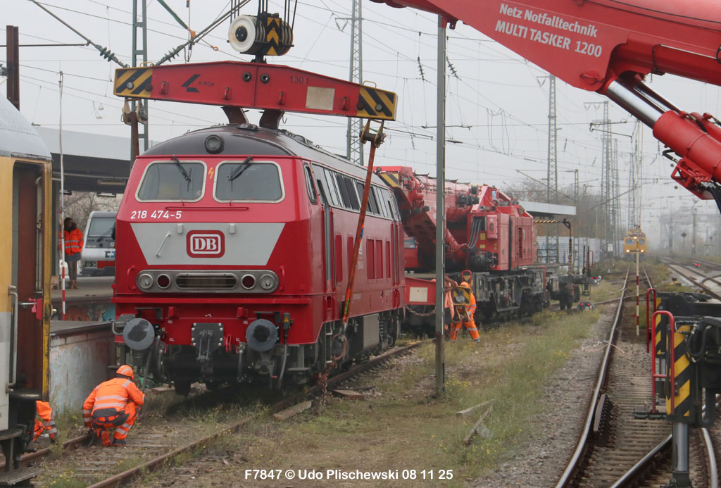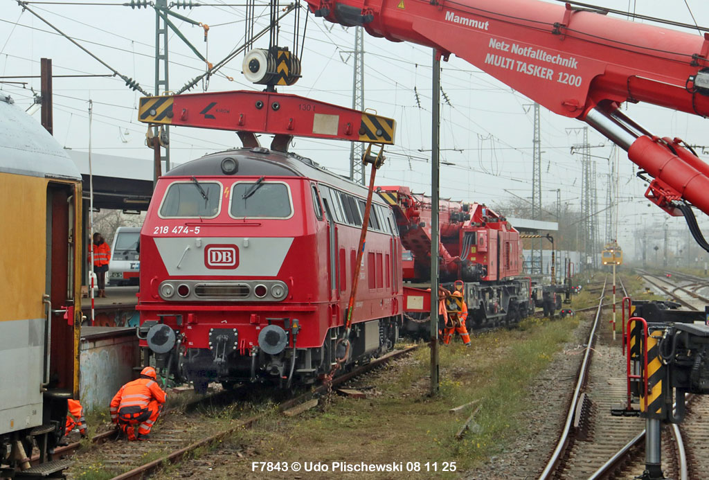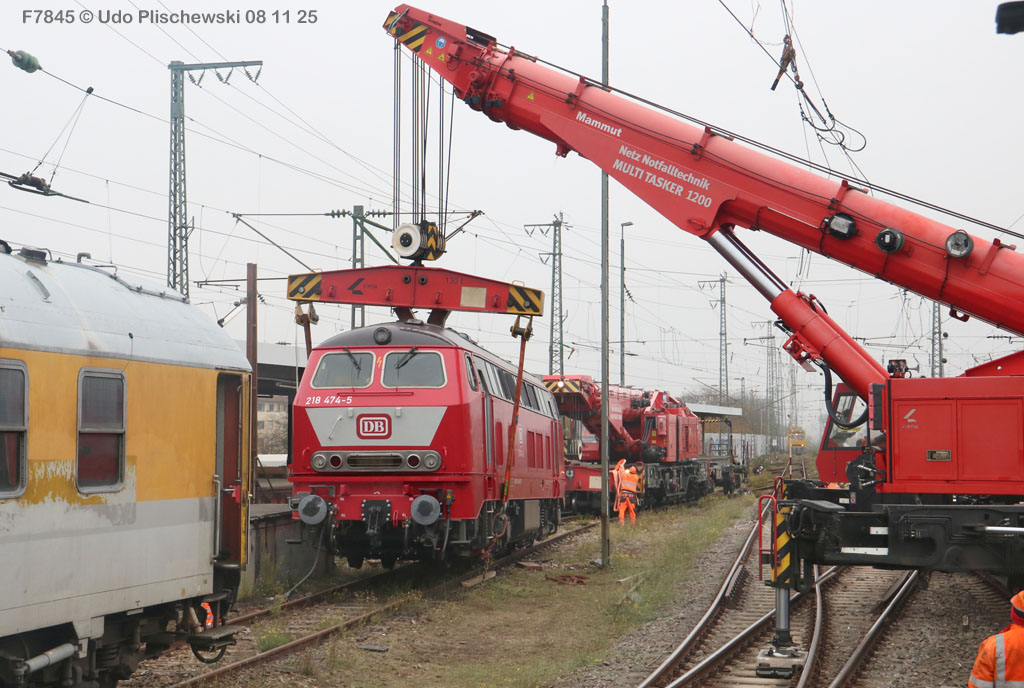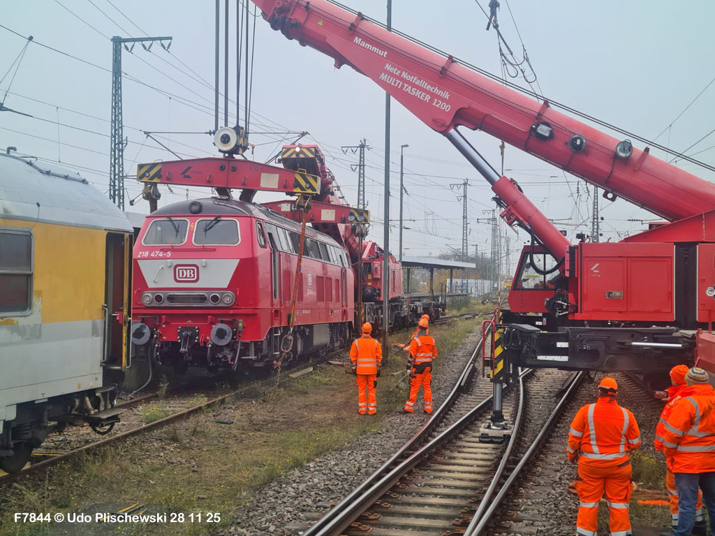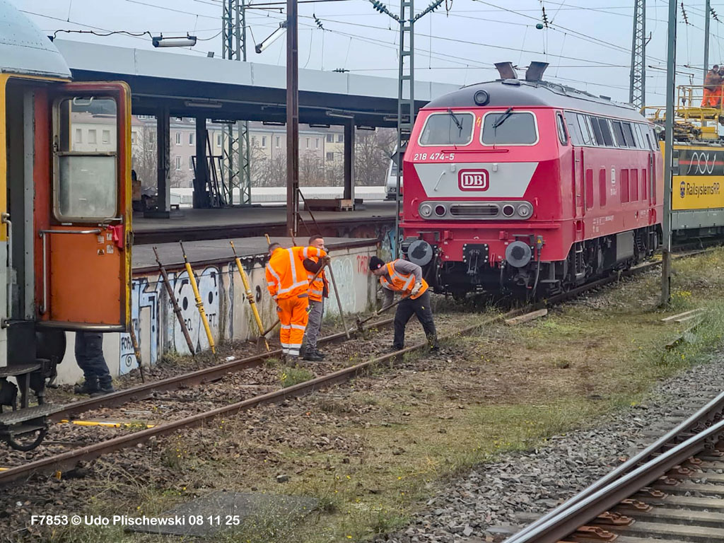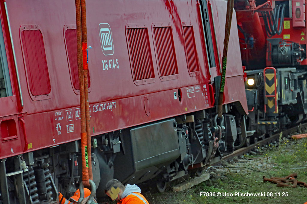 Da hatte die ganz neu gemachte und frisch lackierte 218 474 aber ganz großes Pech am 7. November in Karlsruhe: Bei der langsamen Einfahrt in ein Abstellgleis war SIE es, die einen Fehler im Gleis fand und nicht der mitgeführte Messwagen, der zu diesem Zweck unterweg ist . . . 🙈 = Die Gleislage in diesem Nebengleis des Karlsruher Hbf war so schlecht, daß die schwere Lok die zwei Schienen etwas auseinanderdrückte und dann auf einer Seite neben die Schiene fiel. Diese Entgleisung löste sofort einen Hype aus, weil alle Fans Mitleid hatten mit der frisch revisionierten Lok und deren Halter, der Firma Train4Train Gmbh. Nun ist ja gottseidank nicht wirklich viel passiert und es gab keinen Personenschaden, der viel schlimmer gewesen wäre. Aber die neue Lok fällt nun erstmal aus und muß genau untersucht werden. Wie ihre Bergung am folgenden Tag, dem 8. November 25 ablief, konnte Udo Plischewski ausführlich dokumentieren, was ich hier zeigen kann – Weil Udo uns seine Bilder zur Verfügung stellt, vielen Dank dafür!