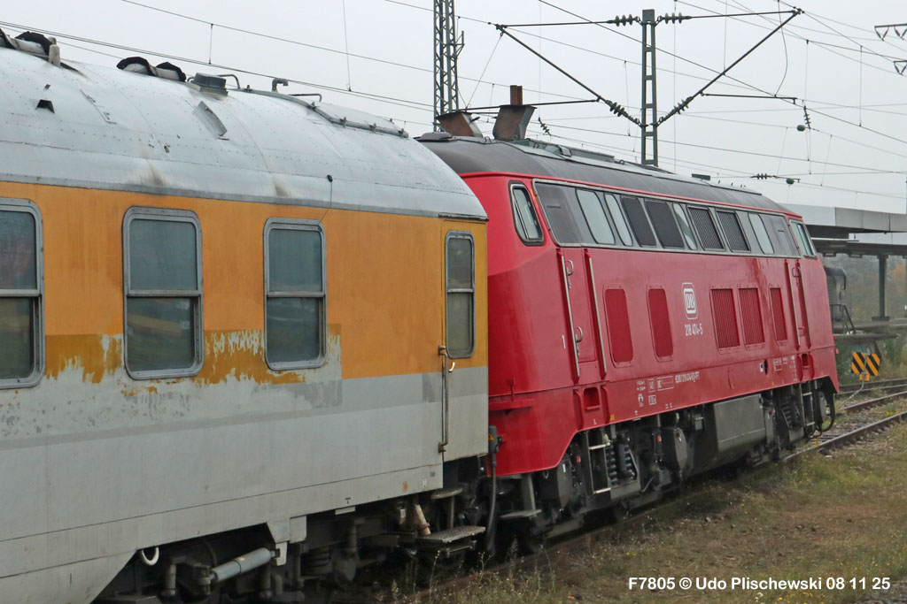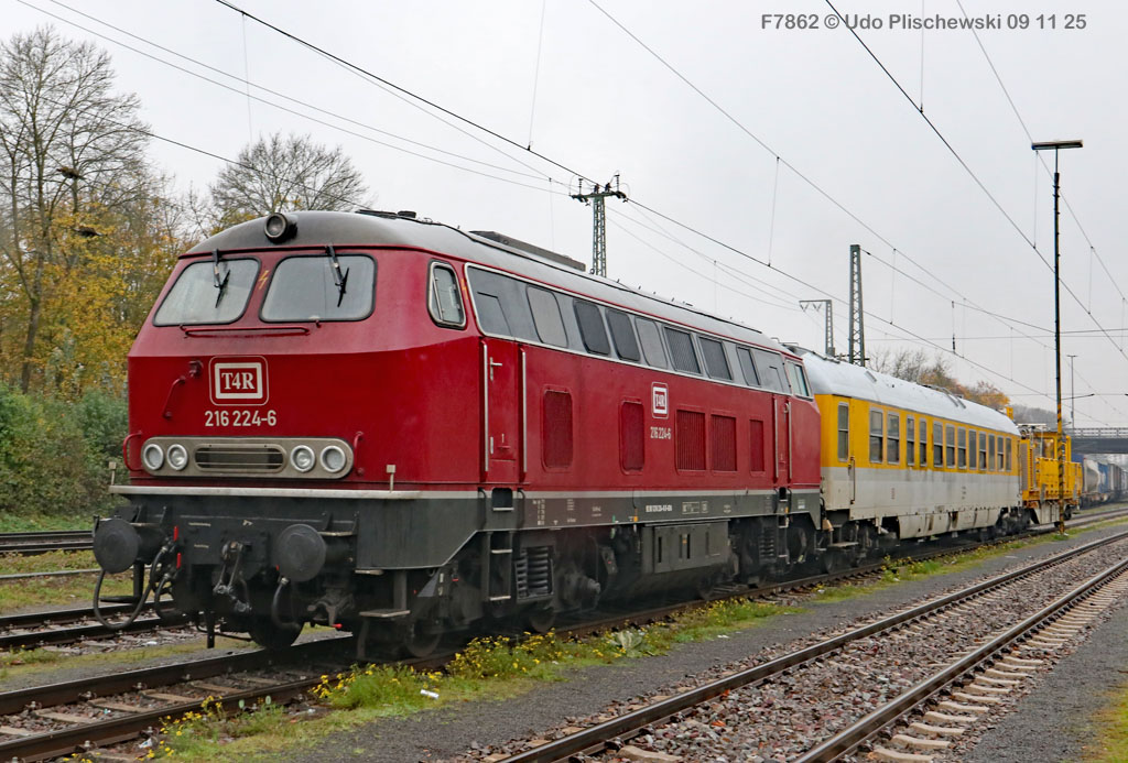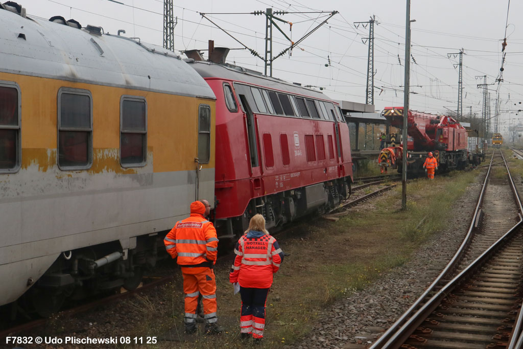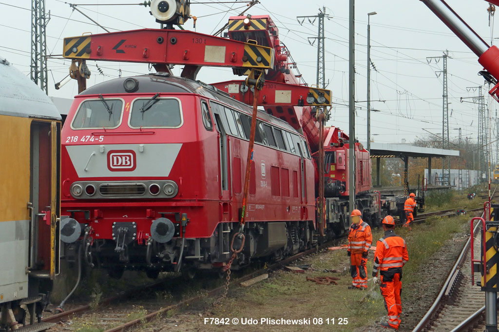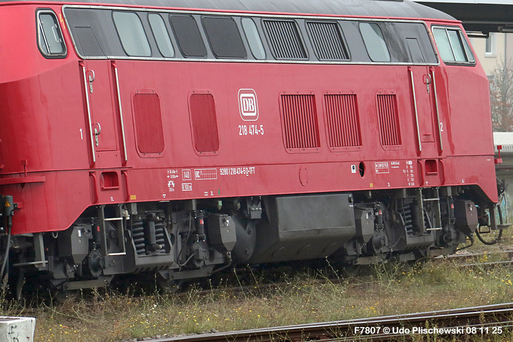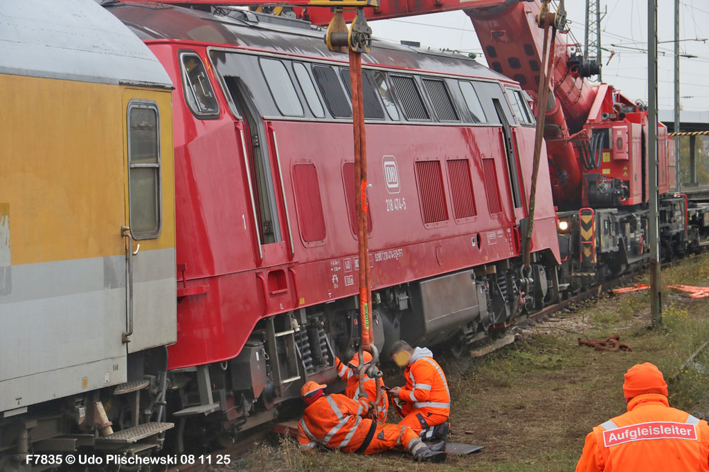 Da hatte die ganz neu gemachte und frisch lackierte 218 474 aber ganz großes Pech am 7. November in Karlsruhe: Bei der langsamen Einfahrt in ein Abstellgleis war SIE es, die einen Fehler im Gleis fand und nicht der mitgeführte Messwagen, der zu diesem Zweck unterweg ist . . . 🙈 = Die Gleislage in diesem Nebengleis des Karlsruher Hbf war so schlecht, daß die schwere Lok die zwei Schienen etwas auseinanderdrückte und dann auf einer Seite neben die Schiene fiel. Diese Entgleisung löste sofort einen Hype aus, weil alle Fans Mitleid hatten mit der frisch revisionierten Lok und deren Halter, der Firma Train4Train Gmbh. Nun ist ja gottseidank nicht wirklich viel passiert und es gab keinen Personenschaden, der viel schlimmer gewesen wäre. Aber die neue Lok fällt nun erstmal aus und muß genau untersucht werden. Wie ihre Bergung am folgenden Tag, dem 8. November 25 ablief, konnte Udo Plischewski ausführlich dokumentieren, was ich hier zeigen kann – Weil Udo uns seine Bilder zur Verfügung stellt, vielen Dank dafür!