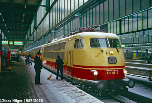 1987 wurde der erstklassige "Rheingold" eingestellt. Dies sind die letzten Monate des letzten Luxuszuges. Die geputzte 103 116 steht in Stuttgart im Januar 87 bereit, der Zugführer kriztelt die Papiere und der südosteuropäische Schneebeauftragte fegt, was er kann