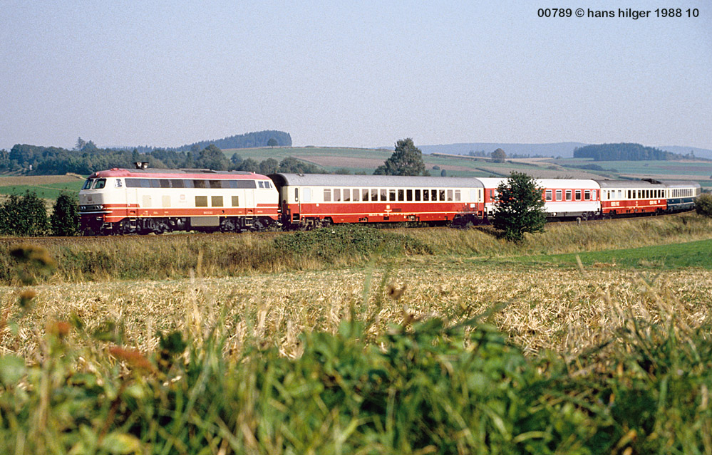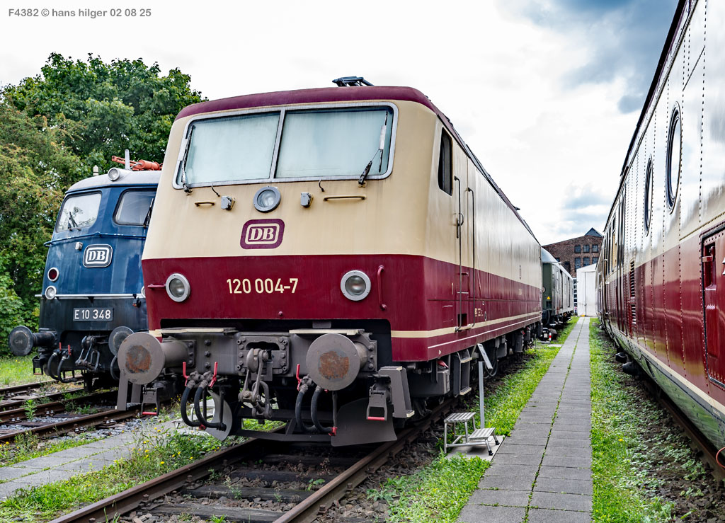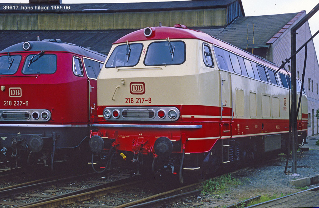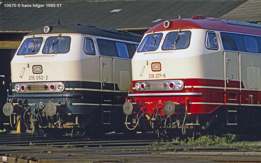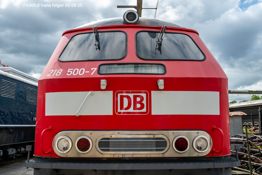 <133> Dazu kommen wir wieder am Eingang vorbei und was uns da sofort auffällt, ist das hier . . .<134> Da steht ein einzelner, aber kompletter Führerstand einer “218 500”, die es natürlich NIE gegeben hat. Wie kann das ??<135> Nun, wenn man zum Stichwort “218 441” etwas recherchiert, kommt man schnell weiter und entdeckt eine von mehreren kurzsichtigen Fehlentscheidungen der Bahn . . . die ich versuche, kurz zusammenzufassen: Die Lok 218 441 (1. Besetzung) hatte 1999 einen schweren Unfall und wurde als 218 441 (2. Besetzung) mit Teilen der ausgemusterten 215 022 wieder neu aufgebaut. Dabei modernisierte man die Lok nach allen Regeln der Kunst dieser Zeit und baute quasi eine zeitgemäße, modernisierte 218 mit Zugzielanzeige und neuem Führerstand und vielen interessanten Details. Die Lok sollte, vom Bund unterstützt, der Prototyp für eine Serie von modernisierten 218 werden, aber es kam alles ganz anders: Die Bahn hat sich dagegen entschieden, die Serie in Angriff zu nehmen, was aus meiner Sicht aber mehr als sinnvoll gewesen wäre, und hat das Projekt abgebrochen. Damit Niemand auf “dumme Ideen” kommen könnte, hat man kurzerhand die Lok 218 441 in einer schnellen, übereifrigen Aktion verschrottet und war das Problem los. Einer der Führerstände blieb aber erhalten und stand seitdem als Denkmal und Fahrsimulator im AW Bremen, bis dieses dicht machen mußte, seitdem steht er in Koblenz und zeugt von dieser Fehlentscheidung, denn modernisierte 218 wären nun, zwanzig Jahre nach dem Projekt, immer noch gern gesehen zum Beispiel in Niebüll. Die nie vergebene Nummer 218 500 hat man in Bremen deshalb gewählt, damit nicht Jeder sofort den Hintergrund erkennt anhand der korrekten Nummer 218 441, zweite Besetzung = Modernste 218, die je auf Gleisen stand und vielgelobt und teuer bezahlt ungenutzt in den Schrott ging . . .<136> Und neben dem Führerstand fiel dieser uralte Wagen auf. Aber nicht wegen seiner Bauweise, sondern . . .<137> . . . sondern wegen seiner Nummer = DRG “Augsburg 80 001” Sm<138> Das ist auch aufgefallen: Das Museum ist nicht nur für große Fans, sondern auch für kleine Nachwuchskünstler zu empfehlen, eine feine, gepflegte Kinderbahn dreht zuverlässig ihre Runden. Und was ist das da links ??<139> Da steht eine der fünf Vorserien- E10 aus den Fünfzigern des letzten Jahrhunderts<140> Und schaut hin: Mit einem Tröpfchen Sonne und etwas anderer Perspektive sieht dieselbe Lok ganz anders aus<141> Und was ist das? Eine dritte Aufnahme derselben Lok!? Muß das denn sein ??? JAAAAaaa, geennnnauuuuuu . . . Das muß sein, denn: Hier sehen wir die Vorserienversion und die fertige Sereinlok auf einem Bild! Das Design der Vorserie, von denen ja alle fünf etwas unterschiedlich waren, wurde nochmal überarbeitet und genau zu dem gemacht, was wir im Hintergrund sehen = Dies ist nummernmäßig die 21. Serienlok, da die Serien-Nummern ja erst bei 110 101 beginnen<142> Da ist sie, zum direkten Vergleich: Die Serien- E10 in “Kastenform”. Von ihr werden 187 Maschinen gebaut, bis die Karosserie nochmals geändert wird in die etwas windschnittigere “Bügelfalte”, siehe weiter oben die E10 348<143> Auch hier: Andere Perspektive, scheinbar andere Lok. Wie soll man sie nennen? “Zeitlos elegant” paßt wohl am besten, aber wir sehen auch, daß die Wetterseite deutlich stärker ausgeblichen ist als die andere Seite<144> Die Präsentation im Museum ändert sich ja ständig, aber zum Zeitpunkt meines Besuches stand die E10 121 zusammen mit der 218 217, der einzigen 218, die tatsächlich einmal diese TEE-Farben getragen hat. Da ist es Zeit, etwas zurückzublättern . . .<145> Hier steht sie in ihrer Originalfarbe neben der blau/weißen 215 052 in Nürnberg 1985. Noch besser wäre natürlich gewesen, wenn sie neben der 218 218 gestanden hätte, aber man kann nicht alles haben. Wir erinnern: Aus der laufenden Bauserie heraus wurden Ende 1973 die beiden Loks 218 217 und 218 218 schon beim Hersteller Krupp Essen in besonderen Versuchs-Farben lackiert = Die 217 in den bekannten TEE-Farben weinrot/beige und die 218 in einer ganz neuen Farbgebung beige/türkis, aus der später das Corporate Identity der Bundesbahn für einige Jahre wurde, während die 217 in ihrer viel schöneren Farbe ein Einzelstück blieb, das erst in der Neuzeit in den verkehrsroten Topf fiel und noch später wieder in ihre ursprüngliche TEE-Farben zurück lackiert wurde<146> Diese Aufnahme von 1985 soll daran erinnern, daß die weiteren gebauten Loks der Reihe 218 wieder in altrot ausgeliefert wurden bis mindestens zur 218 250, also auch die 237 steht hier noch in altrot neben der älteren 217 in ihren Sonderfarben<147> Hier ist sie 1988 im Pegnitztal unterwegs mit einem bunten IC ihrer Zeit<148> Hier rollt sie im Oktober 88 die Schiefe Ebene hinab nach Bamberg<149> Die 218 218 hingegen kann ich nur als Lima-Spur-0-Modell anbieten, das Original habe ich nie gesehen. Und dieses Modell ist noch in einer falschen Farbgebung dargestellt, da Lima das Modell noch VOR der Präsentation des Originals produziert hatte und zu diesem Zeitpunkt noch nicht klar war, daß die zusätzliche blaue Linie unterbrochen werden würde, diesbezüglich wurden diverse Versuche und Beratungen bei Krupp durchgeführt<150> Zurück zum Museum, wo die wieder in rot/beige auferstandene 218 217 leider nur kalt am Geschehen teilhaben darf, und wo der Blick nun auf die Wagen links gelenkt wird mit dem Stellwerk<151> Dort kommt man (legal) nah an das Stellwerk heran mit dem großen Ortsnamen und damit auch an die Wagen, hinten 110 114<152> Und, liebe Leser? Was fällt euch zu diesem Bild ein? Kommen da nicht sofort Namen hoch wie Rheinpfeil, Domspatz, Saphir, Diamant, Blauer Enzian, Roland, Edelweiss, Erasmus,Mediolanum, auch Le Capitole . . . nur um einige wenige zu nennen. Das waren Namen von Zügen = Hochwertige Züge, meistens reine 1.-Klasse-Züge, hatten NAMEN anstatt Nummern. Die Nummern gab es nur im Dienstgebrauch und es 