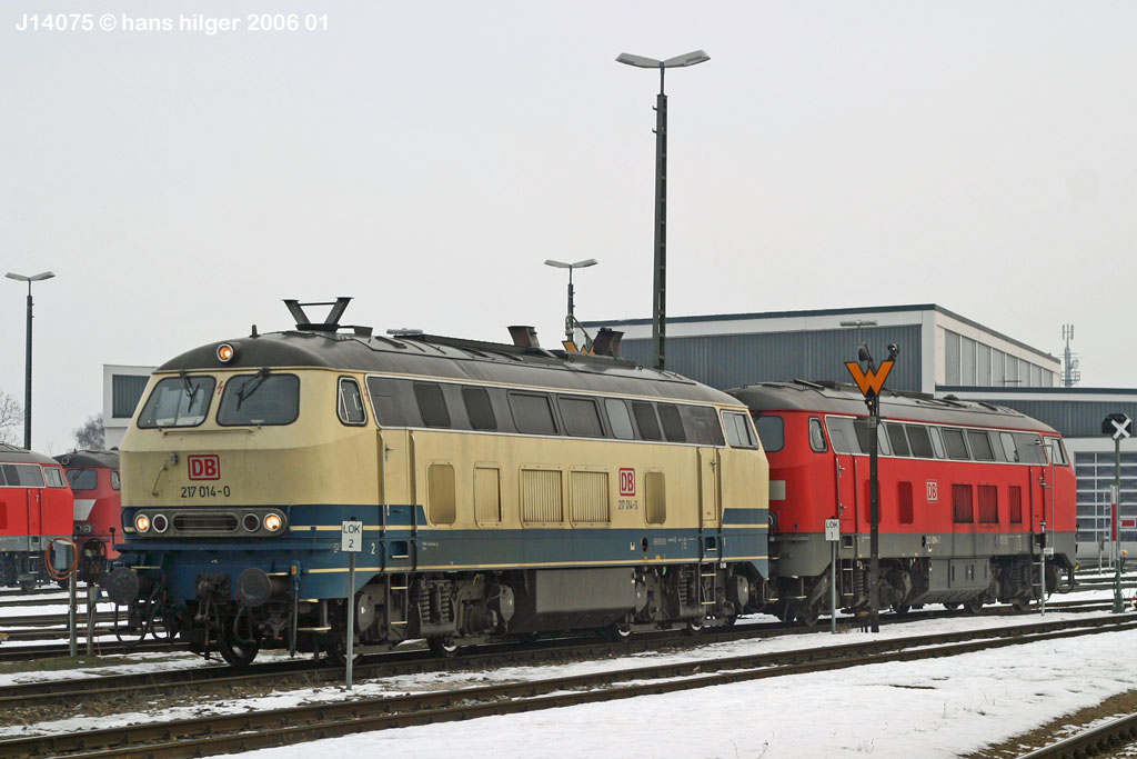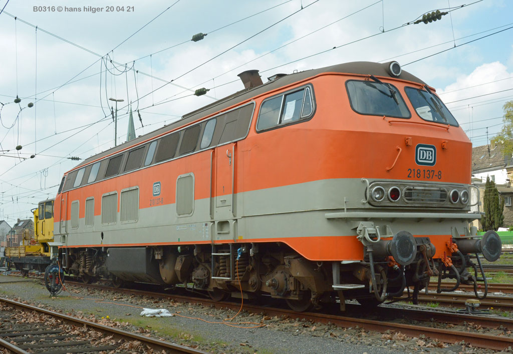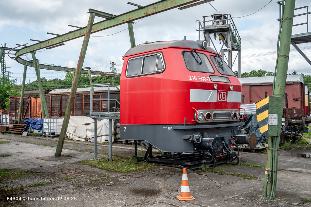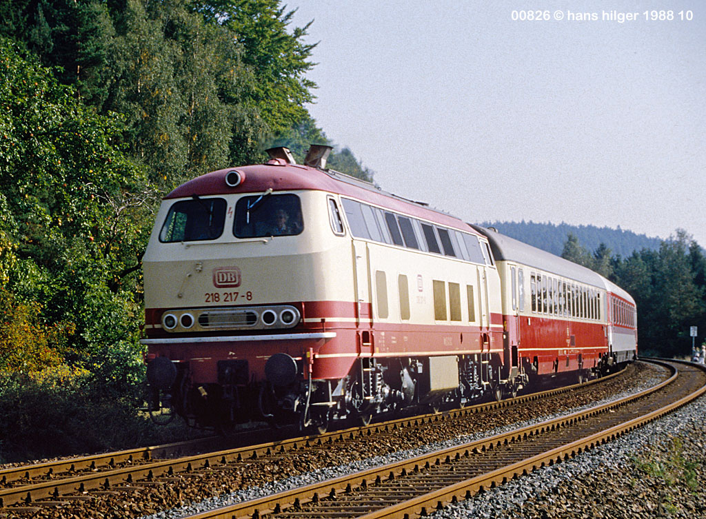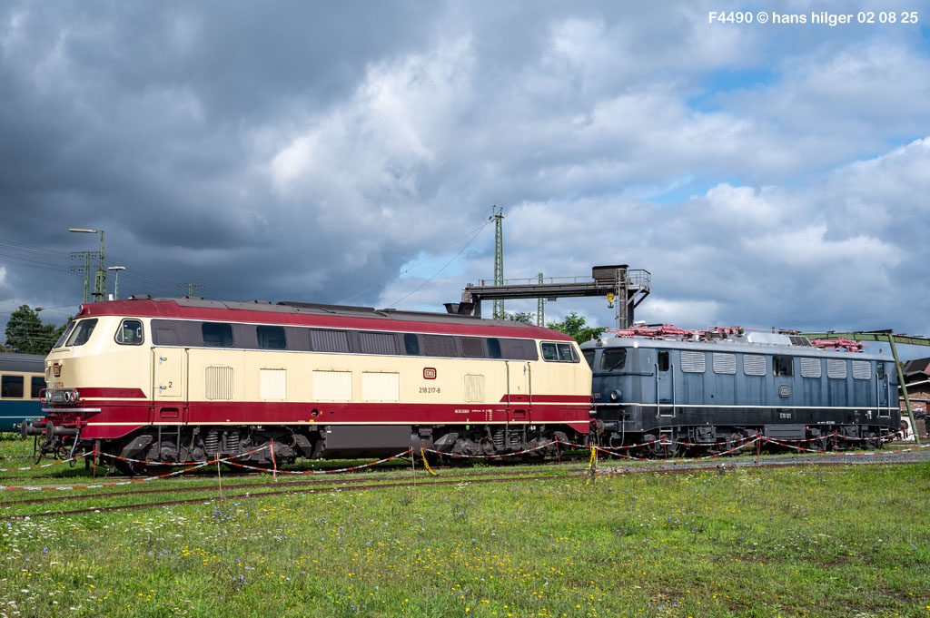 <133> Dazu kommen wir wieder am Eingang vorbei und was uns da sofort auffällt, ist das hier . . .<134> Da steht ein einzelner, aber kompletter Führerstand einer “218 500”, die es natürlich NIE gegeben hat. Wie kann das ??<135> Nun, wenn man zum Stichwort “218 441” etwas recherchiert, kommt man schnell weiter und entdeckt eine von mehreren kurzsichtigen Fehlentscheidungen der Bahn . . . die ich versuche, kurz zusammenzufassen: Die Lok 218 441 (1. Besetzung) hatte 1999 einen schweren Unfall und wurde als 218 441 (2. Besetzung) mit Teilen der ausgemusterten 215 022 wieder neu aufgebaut. Dabei modernisierte man die Lok nach allen Regeln der Kunst dieser Zeit und baute quasi eine zeitgemäße, modernisierte 218 mit Zugzielanzeige und neuem Führerstand und vielen interessanten Details. Die Lok sollte, vom Bund unterstützt, der Prototyp für eine Serie von modernisierten 218 werden, aber es kam alles ganz anders: Die Bahn hat sich dagegen entschieden, die Serie in Angriff zu nehmen, was aus meiner Sicht aber mehr als sinnvoll gewesen wäre, und hat das Projekt abgebrochen. Damit Niemand auf “dumme Ideen” kommen könnte, hat man kurzerhand die Lok 218 441 in einer schnellen, übereifrigen Aktion verschrottet und war das Problem los. Einer der Führerstände blieb aber erhalten und stand seitdem als Denkmal und Fahrsimulator im AW Bremen, bis dieses dicht machen mußte, seitdem steht er in Koblenz und zeugt von dieser Fehlentscheidung, denn modernisierte 218 wären nun, zwanzig Jahre nach dem Projekt, immer noch gern gesehen zum Beispiel in Niebüll. Die nie vergebene Nummer 218 500 hat man in Bremen deshalb gewählt, damit nicht Jeder sofort den Hintergrund erkennt anhand der korrekten Nummer 218 441, zweite Besetzung = Modernste 218, die je auf Gleisen stand und vielgelobt und teuer bezahlt ungenutzt in den Schrott ging . . .<136> Und neben dem Führerstand fiel dieser uralte Wagen auf. Aber nicht wegen seiner Bauweise, sondern . . .<137> . . . sondern wegen seiner Nummer = DRG “Augsburg 80 001” Sm<138> Das ist auch aufgefallen: Das Museum ist nicht nur für große Fans, sondern auch für kleine Nachwuchskünstler zu empfehlen, eine feine, gepflegte Kinderbahn dreht zuverlässig ihre Runden. Und was ist das da links ??<139> Da steht eine der fünf Vorserien- E10 aus den Fünfzigern des letzten Jahrhunderts<140> Und schaut hin: Mit einem Tröpfchen Sonne und etwas anderer Perspektive sieht dieselbe Lok ganz anders aus<141> Und was ist das? Eine dritte Aufnahme derselben Lok!? Muß das denn sein ??? JAAAAaaa, geennnnauuuuuu . . . Das muß sein, denn: Hier sehen wir die Vorserienversion und die fertige Sereinlok auf einem Bild! Das Design der Vorserie, von denen ja alle fünf etwas unterschiedlich waren, wurde nochmal überarbeitet und genau zu dem gemacht, was wir im Hintergrund sehen = Dies ist nummernmäßig die 21. Serienlok, da die Serien-Nummern ja erst bei 110 101 beginnen<142> Da ist sie, zum direkten Vergleich: Die Serien- E10 in “Kastenform”. Von ihr werden 187 Maschinen gebaut, bis die Karosserie nochmals geändert wird in die etwas windschnittigere “Bügelfalte”, siehe weiter oben die E10 348<143> Auch hier: Andere Perspektive, scheinbar andere Lok. Wie soll man sie nennen? “Zeitlos elegant” paßt wohl am besten, aber wir sehen auch, daß die Wetterseite deutlich stärker ausgeblichen ist als die andere Seite<144> Die Präsentation im Museum ändert sich ja ständig, aber zum Zeitpunkt meines Besuches stand die E10 121 zusammen mit der 218 217, der einzigen 218, die tatsächlich einmal diese TEE-Farben getragen hat. Da ist es Zeit, etwas zurückzublättern . . .<145> Hier steht sie in ihrer Originalfarbe neben der blau/weißen 215 052 in Nürnberg 1985. Noch besser wäre natürlich gewesen, wenn sie neben der 218 218 gestanden hätte, aber man kann nicht alles haben. Wir erinnern: Aus der laufenden Bauserie heraus wurden Ende 1973 die beiden Loks 218 217 und 218 218 schon beim Hersteller Krupp Essen in besonderen Versuchs-Farben lackiert = Die 217 in den bekannten TEE-Farben weinrot/beige und die 218 in einer ganz neuen Farbgebung beige/türkis, aus der später das Corporate Identity der Bundesbahn für einige Jahre wurde, während die 217 in ihrer viel schöneren Farbe ein Einzelstück blieb, das erst in der Neuzeit in den verkehrsroten Topf fiel und noch später wieder in ihre ursprüngliche TEE-Farben zurück lackiert wurde<146> Diese Aufnahme von 1985 soll daran erinnern, daß die weiteren gebauten Loks der Reihe 218 wieder in altrot ausgeliefert wurden bis mindestens zur 218 250, also auch die 237 steht hier noch in altrot neben der älteren 217 in ihren Sonderfarben<147> Hier ist sie 1988 im Pegnitztal unterwegs mit einem bunten IC ihrer Zeit<148> Hier rollt sie im Oktober 88 die Schiefe Ebene hinab nach Bamberg<149> Die 218 218 hingegen kann ich nur als Lima-Spur-0-Modell anbieten, das Original habe ich nie gesehen. Und dieses Modell ist noch in einer falschen Farbgebung dargestellt, da Lima das Modell noch VOR der Präsentation des Originals produziert hatte und zu diesem Zeitpunkt noch nicht klar war, daß die zusätzliche blaue Linie unterbrochen werden würde, diesbezüglich wurden diverse Versuche und Beratungen bei Krupp durchgeführt<150> Zurück zum Museum, wo die wieder in rot/beige auferstandene 218 217 leider nur kalt am Geschehen teilhaben darf, und wo der Blick nun auf die Wagen links gelenkt wird mit dem Stellwerk<151> Dort kommt man (legal) nah an das Stellwerk heran mit dem großen Ortsnamen und damit auch an die Wagen, hinten 110 114<152> Und, liebe Leser? Was fällt euch zu diesem Bild ein? Kommen da nicht sofort Namen hoch wie Rheinpfeil, Domspatz, Saphir, Diamant, Blauer Enzian, Roland, Edelweiss, Erasmus,Mediolanum, auch Le Capitole . . . nur um einige wenige zu nennen. Das waren Namen von Zügen = Hochwertige Züge, meistens reine 1.-Klasse-Züge, hatten NAMEN anstatt Nummern. Die Nummern gab es nur im Dienstgebrauch und es 