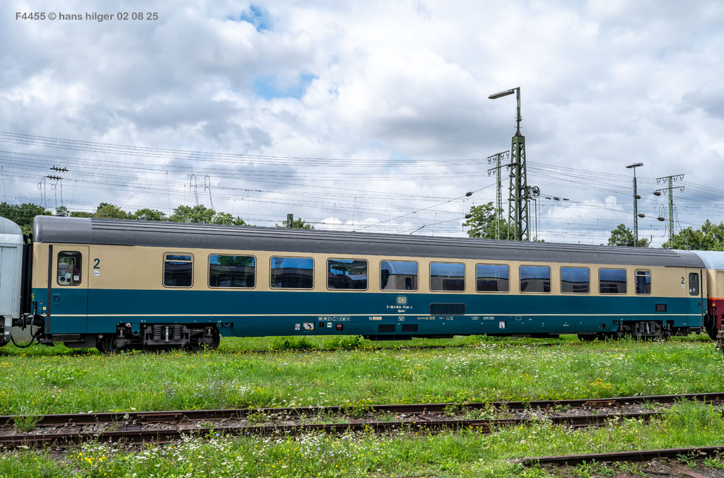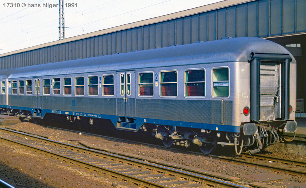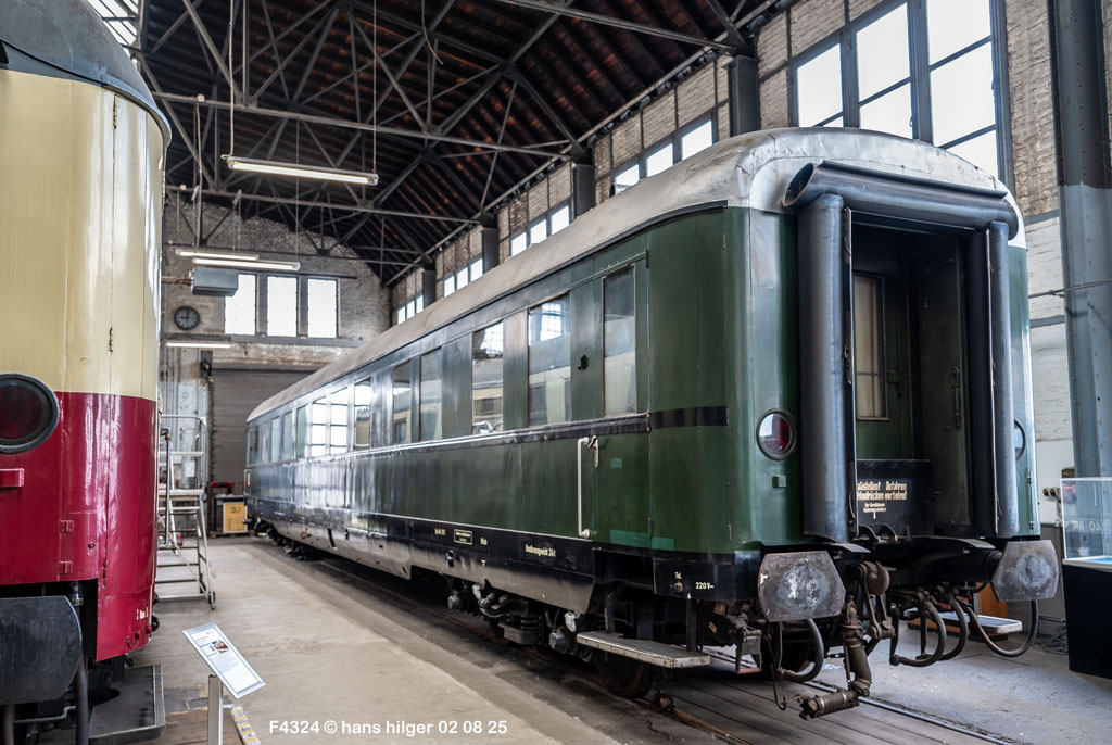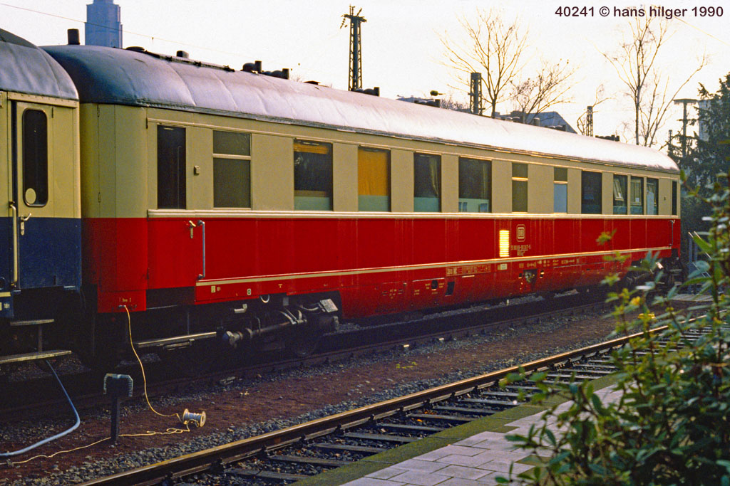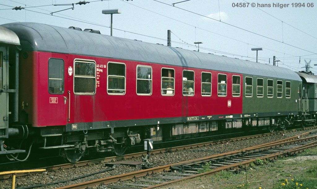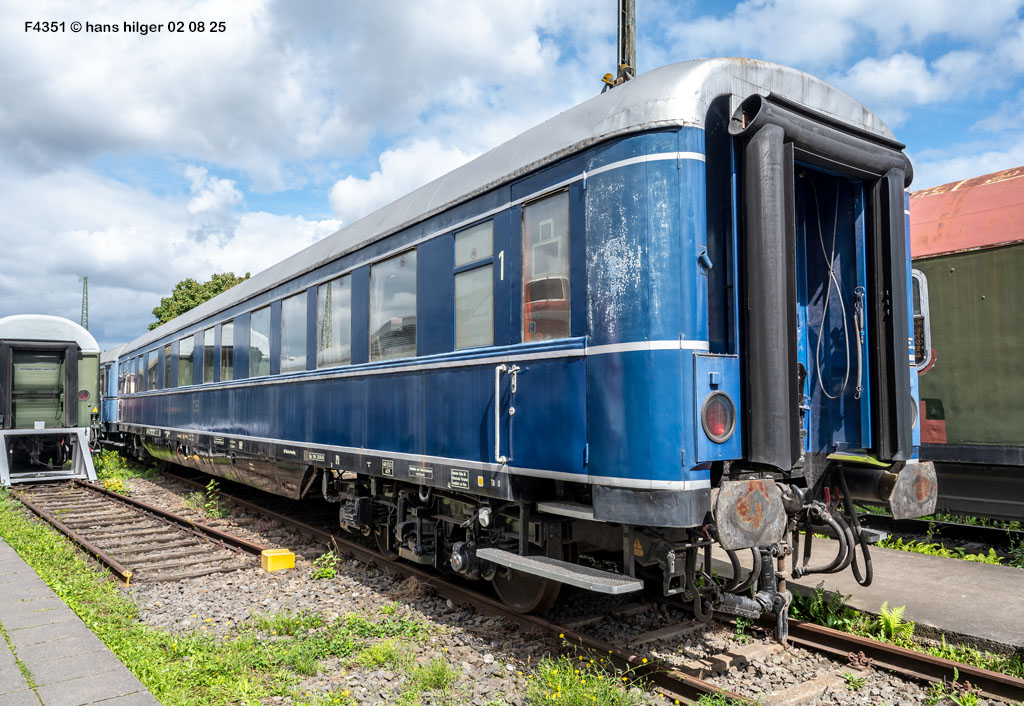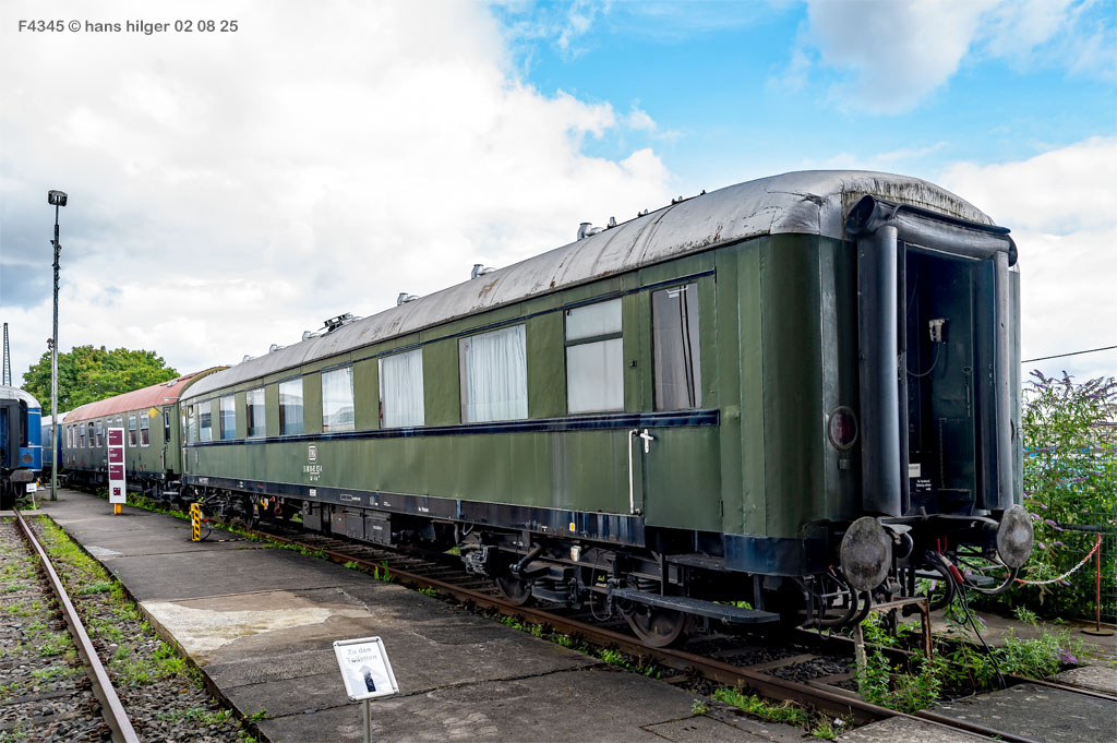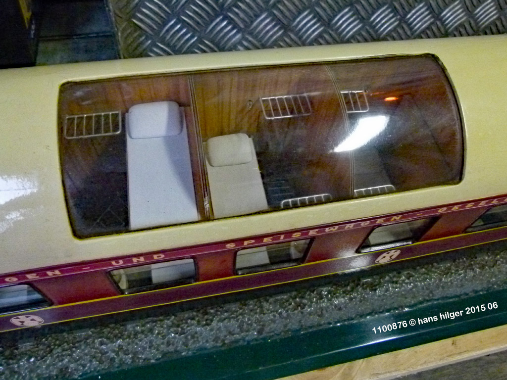 <119> Die Standorte der einzelen Exponate ändern sich ja häufig und immer wieder werden auch Fahrzeuge ausgetauscht und andere dafür eine zeitlang nicht präsentiert. So gab es an diesem Tag hinter der E10 152 nur noch einen unüberwindbaren Zaun und dahinter ein Vorrats-Depot des Museums: Was wir erkennen können, sind zwei schöne Schlafwagen von TEN und DSG, dann der 605 016 im erbärmlichen Zustand, dahinter eine 103 (wahrscheinlich die 235), dann wohl 215 049, dahinter 151 121 in rot und 184 003 in blau/weiß, dahinter ist noch der grafittigeschädigte Et 420 416 “Plus” zu erahnen und wahrscheinlich die 111 040 in rot. Ebenfalls dort hinten abgestellt, aber hier nicht sichtbar, sind u.A. V90 001, V80 005 und die V20 039 <120> So sah er aus, der 605 016, als er nach Koblenz kam, das war am 4. November 21, gesehen in Duisburg-Wedau, das Bild gehört zum oben schon gezeigten Bild 77 zum Thema 111 001, das war nämlich die Zuglok dieser Überführung<121> Und das ist ein Sieck-Modell (“Reisebüromodell”) eines solchen Schlafwagens mit Hochdach, wie wir ihn in Bild 119 sehen, der blaue Wagen dürfte fast identisch sein, nur in einer modeneren, blauen TEN-Lackierung <122> Das Modell hat sogar eine Inneneinrichtung dargestellt und durch ein Plexiglasdach sichtbar gemacht <123> Und dies ist ein Original! Gesehen um 1980 herum irgendwo in München (Nr unbekannt und nicht lesbar)<124> Auch er hier war durch den Zaun außerhalb des Museumsgeländes zu erspähen: Ein ARkimmbdz aus dem Abschiedszug der “Drehfalttüren”, er hat vielleicht die Kontrollnummer “5”, aber mehr der Nummer ist nicht lesbar und selbst die 5 ist unsicher, sorry<125> Und der Hofhund des Museums war sichtbar über den Zaun = 333 678<126> Aus etlichen abgestellten Wagen waren zwei Nummern stellvertretend herauszufiltern: Diese hier und die 18-94 023-8 Apmz 121.0<127> Dann ging es an den Rückweg nach vorne, und der führte wieder an der 110 152 vorbei, neben der auf Flachwagen der “Adler” unter einer Plane aufbewahrt wird, bevor er irgendwo zum nächsten Einsatz kommt<128> Und der Rückweg führt an ihr hier vorbei, die wir noch nicht gesehen hatten . . .<129> Aber von der wir eine SEHR alte Aufnahme zur Verfügung haben, die Wolf Dietmar Loos WDL Anno 1970 (!) für uns anfertigen konnte in Emmerich, wo umgespannt worden war von der im Hintergund sichtbaren ebenfalls blauen NL- 1200er. Vielen Dank dafür an WDL!<130> Und von ihr haben wir auch ein Bild als 115 114, wobei die “115” aussagt, daß es sich vorübergehend um eine Lok der DB-Tochter Autozug Dortmund handelt, die hier an einen PbZ ausgeliehen war am 18. August 2017, gesehen in Düsseldorf-Rath<131> Und an noch weiteren Wagen führte nun der Weg vorbei, wobei ich diesen “Kakadu”-Halbspeisewagen herausgreifen möchte. Es ist der “40 413 Köln” alias 50 80 85-53 913-0 BRyl 446<132> Und genau DIESEN “40 413 Köln” habe ich in einem alten Bild gefunden aus dem Juni 1994, wo 01 1100 mit ihm unterwegs war nach Norddeich. Es ist genau der nun in Koblenz weilende Wagen im klassischen und noch etwas besseren Zustand als heute