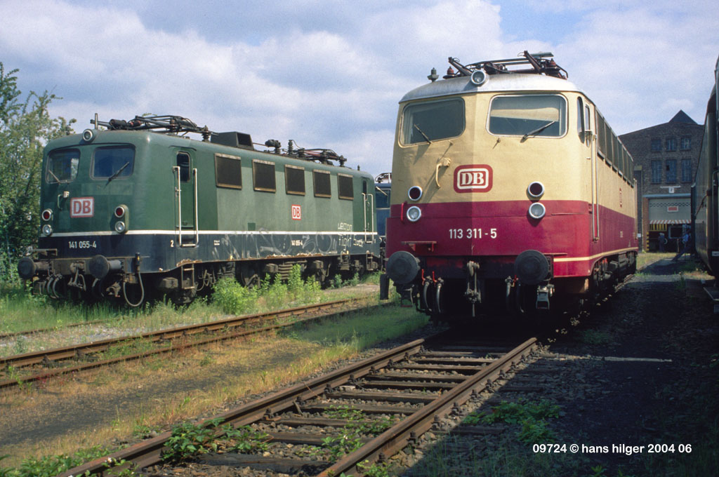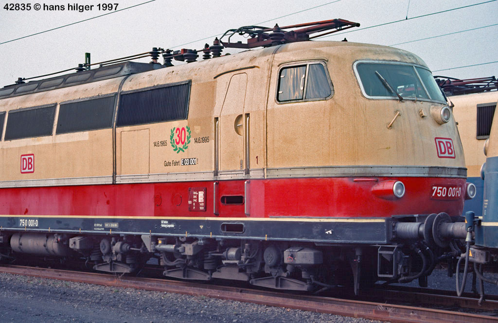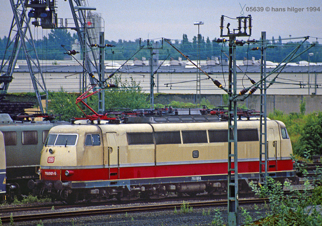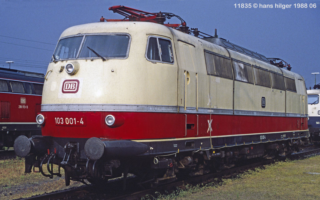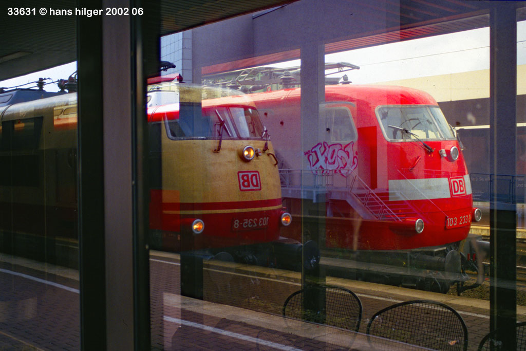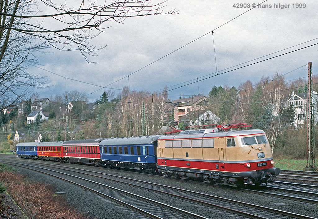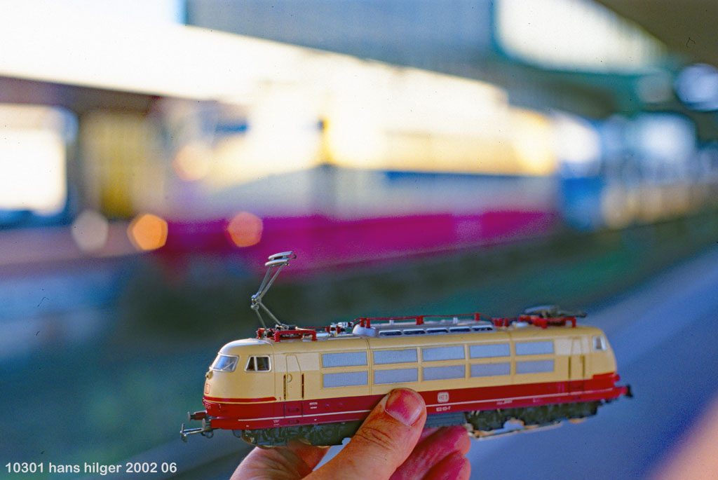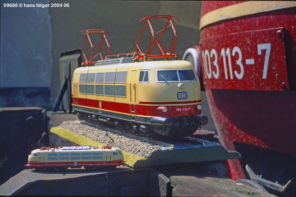 <74> Dort steht vornean die allseits bekannte und betriebsfähige 111 001. Nicht allseits bekannt ist aber, daß ich diese Lok schon “kannte”, als sie noch ganz jung war und zum ersten Mal in ihrem Leben die beige/türkkise Lackierung besaß . . .<75> Da ist sie: 111 001 im Stuttgart des Jahres 1976, da war sie gerade ein Jahr alt<76> Und in Mittenwald hab ich sie mal getroffen in Farbe um 10 Uhr 10, allerdings im Schatten<77> Und am 4. November 2021 hab ich sie im typischen Novemberwetter erwischt, als sie gerade den 605 016 vom AW Krefeld Oppum nach Koblenz zum Museum gebracht hat; Gesehen in Duisburg Wedau. Leider ist der 605 016 ein Trauerspiel, aber okay, er ist wenigstens erhalten<78> Nächste in Koblenz ist die Schnellfahr- 110 300, die gemeinsam mit der 299 einen Sonderstatus hatte<79> Von ihr habe ich nur ein einziges Bild aus dem November 2001 bei Oberhausen, da war sie aber nur noch eine normale 110<80> Neben der schnellen 110 steht ein weiterer Edelrenner: 118 003 ex E18 03 im eleganten Blau ihrer Zeit<81> Im Sommer 1978 in München sah man ihr noch an, daß sie gerade kurz zuvor ihre neuen Lampen bekommen hatte, wo die Fans doch viel lieber die alten großen “Schlafaugen” gehabt hätten, aber wer fragt schon die Fans – Vergleiche mit Bild 162 weiter unten!<82> Dann ist im Museum die E69 03 = 169 003 an der Reihe, eine Hundertjährige: Sie ist von 1912 !!<83> Und von ihr habe ich tatsächlich ein sehr altes Bild aus dem Jahre 1974, entstanden aus dem Führerstand der 169 002, auf der ich mitfahren durfte. Danach ist mir die Lok nie wieder begegnet, weil ich (leider) nicht wieder in der Gegend war<84> Das nächste vorzustellende Exponat des Museums ist E03 001 = 103 001 und ex 750 001 aus dem Jahre 1965. Sie hat leider in 2026 Fristablauf und ist hoffentlich gut genug für eine weitere Fristperiode<85> Im Jahr 1988 stand sie als Meßlok am BZA Minden im Bw Hamburg-Eidelstedt<86> Und Anno 1994 war dieselbe Lok als Bahndienstfahrzeug 750 001 in Minden im BZA anzutreffen in üblem äußeren Zustand<87> Dann stand sie Ende 1997 im AW Opladen mit ihrem 30-Jahres-Aufkleber, aber Keiner wußte, wie es weitergeht, eine neue Untersuchung war kleineswegs selbstverständlich . . .<88> Aber es klappte irgendwie, sie wurde nochmal “gemacht”, wie man damals sagte. Und sie wurde schnell zum Liebling im AW Opladen, wo letztlich mehr gemacht wurde im HInblicxk auf ein langes Leben, als es im Augenblick notwendig gewesen wäre = Sogar die beiden Fronten wurden aufwändig neu beblecht. Links im Hintergrund übrigens die E94 279/579, die zeitgleich aufgearbeitet wurde im AW Opladen<89> Und seitdem gab es zahlreiche Sonderfahrten in alle Ecken der Republik, hier z.B. mit einem ganz exclusiven Sonderzug im Jahre 1999 am Heissener Berg in Mülheim/Ruhr, an dem noch alle sechs Gleise in Betrieb waren<90> Auch 103 113 war anwesend im Museum, sie istebenfalls betriebsfähig<91> Aber von ihr zeige ich nun keine Sonderfahrt-Bilder, sondern zwei eher ungewöhnliche Motive: Einmal sehen wir hier gleich DREI MAL die 101 113 = Einmal im Original, einmal als Sieck-Reisebüro-Modell im Maßstab 1:20 und einmal als H0-Modell von Märklin (gesehen in Köln Bbf)<92> Und das Märklin-.Modell kam nochmals zu Ehren: Hier konnte es mit leider nur wenig Tiefenschärfe in Duisburg mit dem Original 103 113 am Bahnsteig geknipst werden . . . was mit neueren digitalen Medien sehr viel besser “gefunzt” hätte (neudeutsch für funktioniert), aber die gab es damals noch nicht<93> Weiter gehts mit dem Bimmdzf 287.2 51 80 80-95 259-2 D-DB, der noch “geächtete” Drehfalttüren besitzt<94> Nun habe ich vom 80-95 259 kein Bild gefunden, wohl aber vom direkten Schwesterwagen 95 260, der hier im Juni 2023 an der Spitze vom 2157 in Duisburg einläuft in seiner letzten Betriebsphase; Es schiebt 101 042<95> Und davor steht der noch ganz im Original erhaltene n-Wagen, genannt “Silberling” mit der Nummer 50 80 31-53 199-1 ABn 703 D-DB, der sogar noch Fristen hat und eingesetzt werden kann. Seine Besonderheit waren damals die geschliffenen Pfauenaugenmuster im Außenblech<96> Ein Portrait eines solchen Wagens ist mir mal in Essen gelungen Anno 1991, allerdings nicht mehr ganz im Ursprungszustand, denn dieser Wagen hier besitzt schon den neuzeitlicheren blauen (türkisen) Rahmen, der im Original schwarz war; Die Nummer ist leider nicht lesbar <97> Dafür konnte ich mal das typische, geschliffene bzw. “gebürstete Pfauenaugenmuster” dokumentieren (in Augsburg)<98> Ein Gleis weiter stehen drei überhaupt nicht knipsfähige Loks, deren Aufnahmen hier nur als Sichtungsbilder dienen sollen<99> Aber es gibt ja Bilder der Lok von der Ausstellung in Bochum-Dahlhausen 1985<100> Dahinter diese nun wirklich nicht knipsfähige E60 10, sorry<101> Wie schön, daß wir hier wieder auf den Bestand des Archives zurückgreifen können = Bochum-Dahlhausen 1985<102> Sie ist die dritte, die nur ein Sichtungsbild zuließ, aber dat macht nix, denn . . .<103> Denn das hier ist sie 1985 bei den Paraden in Nürnberg, die 194 579 ex 279. Sie ist die Schiebelok (Nachschuß) von . . .<104> . . . diesem Zug, der von E93 07 gezogen wurde, so kommt diese hier auch noch mal zur Geltung und der Kreis schließt sich
