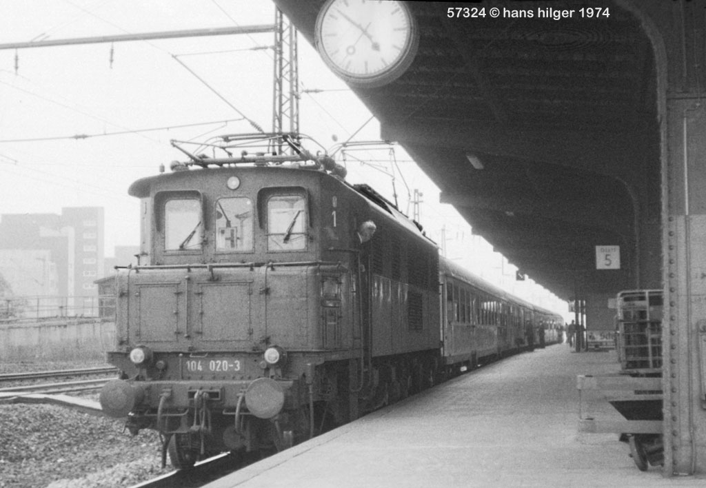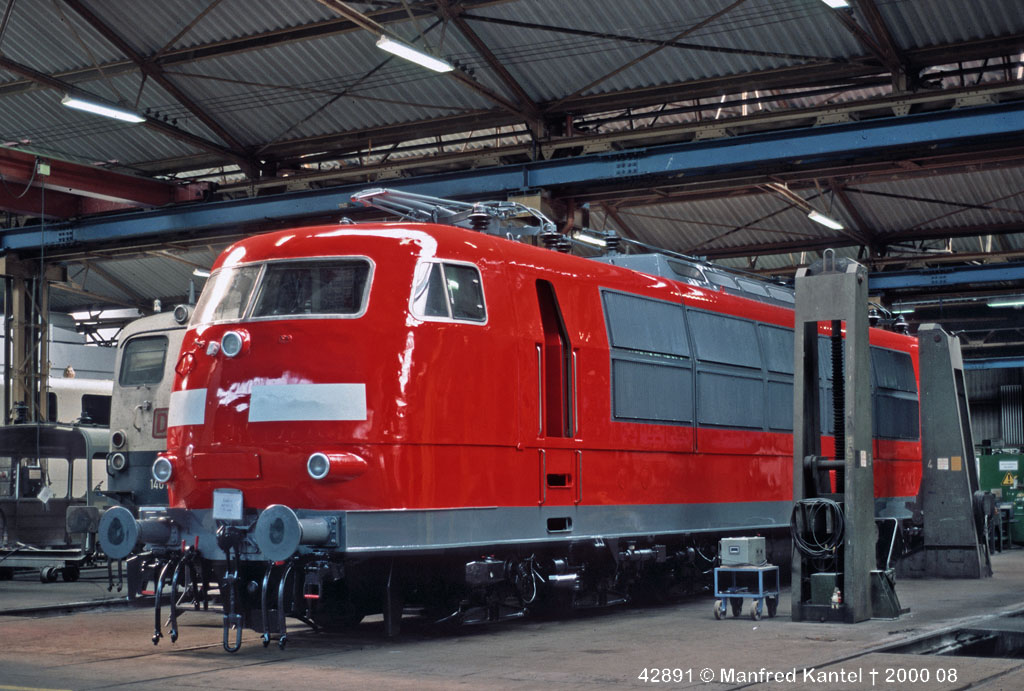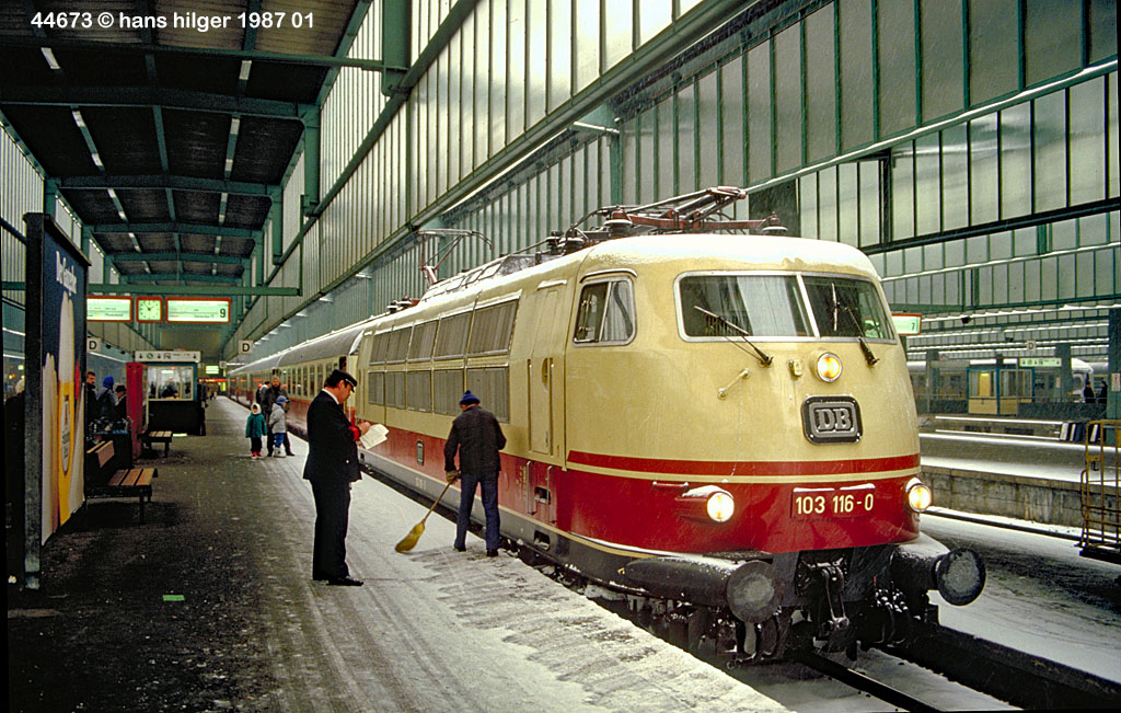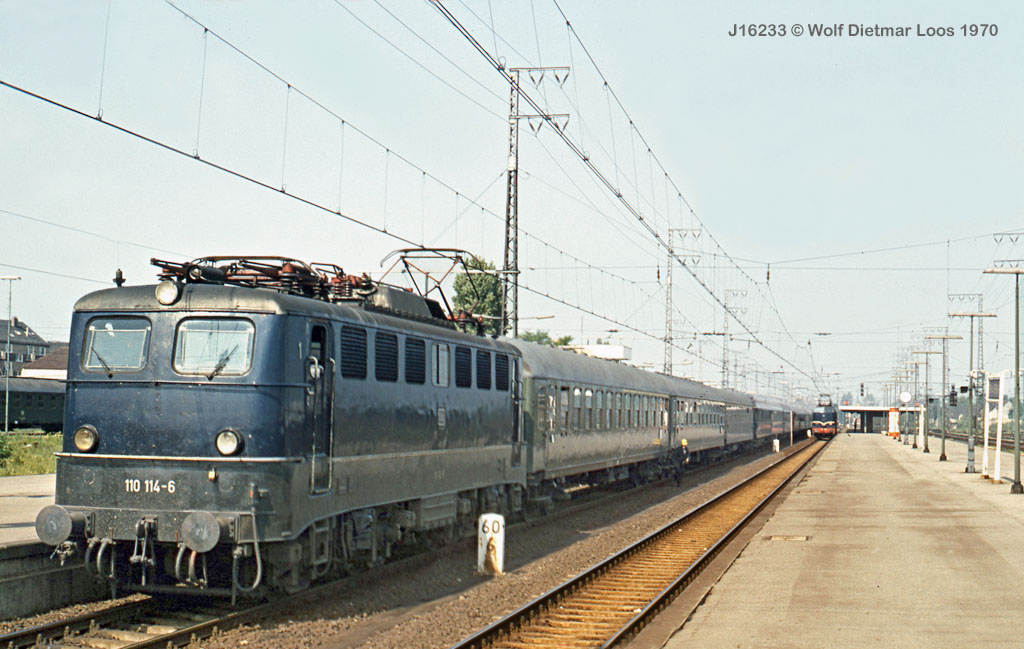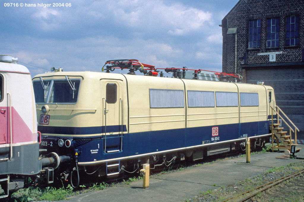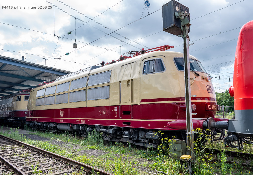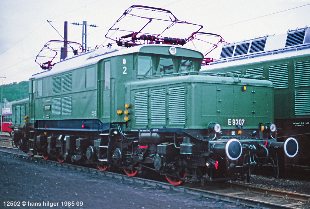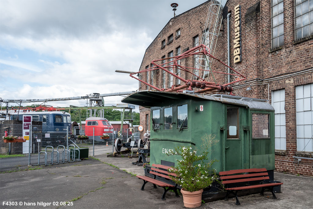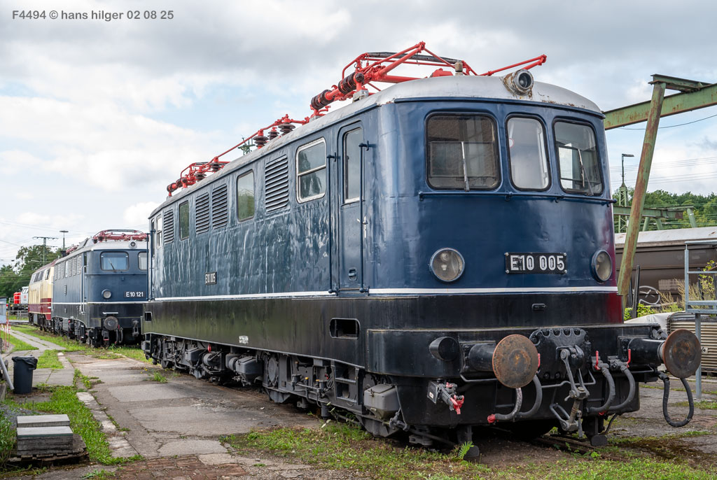 <74> Dort steht vornean die allseits bekannte und betriebsfähige 111 001. Nicht allseits bekannt ist aber, daß ich diese Lok schon “kannte”, als sie noch ganz jung war und zum ersten Mal in ihrem Leben die beige/türkkise Lackierung besaß . . .<75> Da ist sie: 111 001 im Stuttgart des Jahres 1976, da war sie gerade ein Jahr alt<76> Und in Mittenwald hab ich sie mal getroffen in Farbe um 10 Uhr 10, allerdings im Schatten<77> Und am 4. November 2021 hab ich sie im typischen Novemberwetter erwischt, als sie gerade den 605 016 vom AW Krefeld Oppum nach Koblenz zum Museum gebracht hat; Gesehen in Duisburg Wedau. Leider ist der 605 016 ein Trauerspiel, aber okay, er ist wenigstens erhalten<78> Nächste in Koblenz ist die Schnellfahr- 110 300, die gemeinsam mit der 299 einen Sonderstatus hatte<79> Von ihr habe ich nur ein einziges Bild aus dem November 2001 bei Oberhausen, da war sie aber nur noch eine normale 110<80> Neben der schnellen 110 steht ein weiterer Edelrenner: 118 003 ex E18 03 im eleganten Blau ihrer Zeit<81> Im Sommer 1978 in München sah man ihr noch an, daß sie gerade kurz zuvor ihre neuen Lampen bekommen hatte, wo die Fans doch viel lieber die alten großen “Schlafaugen” gehabt hätten, aber wer fragt schon die Fans – Vergleiche mit Bild 162 weiter unten!<82> Dann ist im Museum die E69 03 = 169 003 an der Reihe, eine Hundertjährige: Sie ist von 1912 !!<83> Und von ihr habe ich tatsächlich ein sehr altes Bild aus dem Jahre 1974, entstanden aus dem Führerstand der 169 002, auf der ich mitfahren durfte. Danach ist mir die Lok nie wieder begegnet, weil ich (leider) nicht wieder in der Gegend war<84> Das nächste vorzustellende Exponat des Museums ist E03 001 = 103 001 und ex 750 001 aus dem Jahre 1965. Sie hat leider in 2026 Fristablauf und ist hoffentlich gut genug für eine weitere Fristperiode<85> Im Jahr 1988 stand sie als Meßlok am BZA Minden im Bw Hamburg-Eidelstedt<86> Und Anno 1994 war dieselbe Lok als Bahndienstfahrzeug 750 001 in Minden im BZA anzutreffen in üblem äußeren Zustand<87> Dann stand sie Ende 1997 im AW Opladen mit ihrem 30-Jahres-Aufkleber, aber Keiner wußte, wie es weitergeht, eine neue Untersuchung war kleineswegs selbstverständlich . . .<88> Aber es klappte irgendwie, sie wurde nochmal “gemacht”, wie man damals sagte. Und sie wurde schnell zum Liebling im AW Opladen, wo letztlich mehr gemacht wurde im HInblicxk auf ein langes Leben, als es im Augenblick notwendig gewesen wäre = Sogar die beiden Fronten wurden aufwändig neu beblecht. Links im Hintergrund übrigens die E94 279/579, die zeitgleich aufgearbeitet wurde im AW Opladen<89> Und seitdem gab es zahlreiche Sonderfahrten in alle Ecken der Republik, hier z.B. mit einem ganz exclusiven Sonderzug im Jahre 1999 am Heissener Berg in Mülheim/Ruhr, an dem noch alle sechs Gleise in Betrieb waren<90> Auch 103 113 war anwesend im Museum, sie istebenfalls betriebsfähig<91> Aber von ihr zeige ich nun keine Sonderfahrt-Bilder, sondern zwei eher ungewöhnliche Motive: Einmal sehen wir hier gleich DREI MAL die 101 113 = Einmal im Original, einmal als Sieck-Reisebüro-Modell im Maßstab 1:20 und einmal als H0-Modell von Märklin (gesehen in Köln Bbf)<92> Und das Märklin-.Modell kam nochmals zu Ehren: Hier konnte es mit leider nur wenig Tiefenschärfe in Duisburg mit dem Original 103 113 am Bahnsteig geknipst werden . . . was mit neueren digitalen Medien sehr viel besser “gefunzt” hätte (neudeutsch für funktioniert), aber die gab es damals noch nicht<93> Weiter gehts mit dem Bimmdzf 287.2 51 80 80-95 259-2 D-DB, der noch “geächtete” Drehfalttüren besitzt<94> Nun habe ich vom 80-95 259 kein Bild gefunden, wohl aber vom direkten Schwesterwagen 95 260, der hier im Juni 2023 an der Spitze vom 2157 in Duisburg einläuft in seiner letzten Betriebsphase; Es schiebt 101 042<95> Und davor steht der noch ganz im Original erhaltene n-Wagen, genannt “Silberling” mit der Nummer 50 80 31-53 199-1 ABn 703 D-DB, der sogar noch Fristen hat und eingesetzt werden kann. Seine Besonderheit waren damals die geschliffenen Pfauenaugenmuster im Außenblech<96> Ein Portrait eines solchen Wagens ist mir mal in Essen gelungen Anno 1991, allerdings nicht mehr ganz im Ursprungszustand, denn dieser Wagen hier besitzt schon den neuzeitlicheren blauen (türkisen) Rahmen, der im Original schwarz war; Die Nummer ist leider nicht lesbar <97> Dafür konnte ich mal das typische, geschliffene bzw. “gebürstete Pfauenaugenmuster” dokumentieren (in Augsburg)<98> Ein Gleis weiter stehen drei überhaupt nicht knipsfähige Loks, deren Aufnahmen hier nur als Sichtungsbilder dienen sollen<99> Aber es gibt ja Bilder der Lok von der Ausstellung in Bochum-Dahlhausen 1985<100> Dahinter diese nun wirklich nicht knipsfähige E60 10, sorry<101> Wie schön, daß wir hier wieder auf den Bestand des Archives zurückgreifen können = Bochum-Dahlhausen 1985<102> Sie ist die dritte, die nur ein Sichtungsbild zuließ, aber dat macht nix, denn . . .<103> Denn das hier ist sie 1985 bei den Paraden in Nürnberg, die 194 579 ex 279. Sie ist die Schiebelok (Nachschuß) von . . .<104> . . . diesem Zug, der von E93 07 gezogen wurde, so kommt diese hier auch noch mal zur Geltung und der Kreis schließt sich