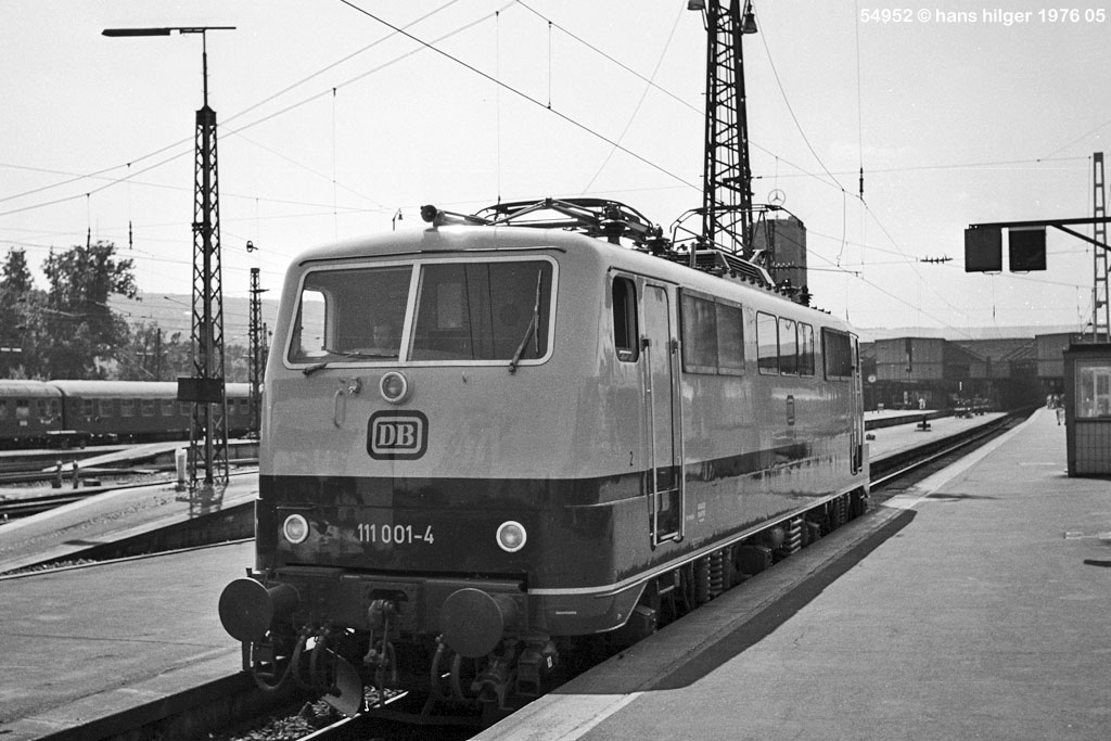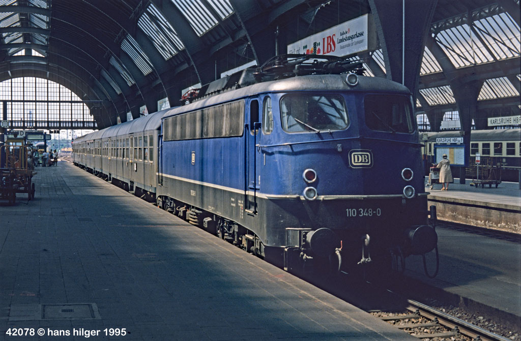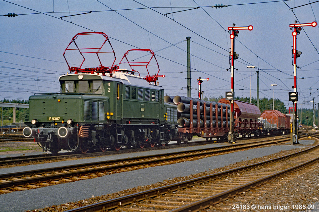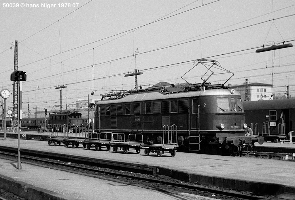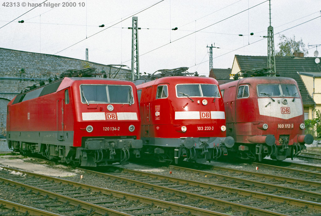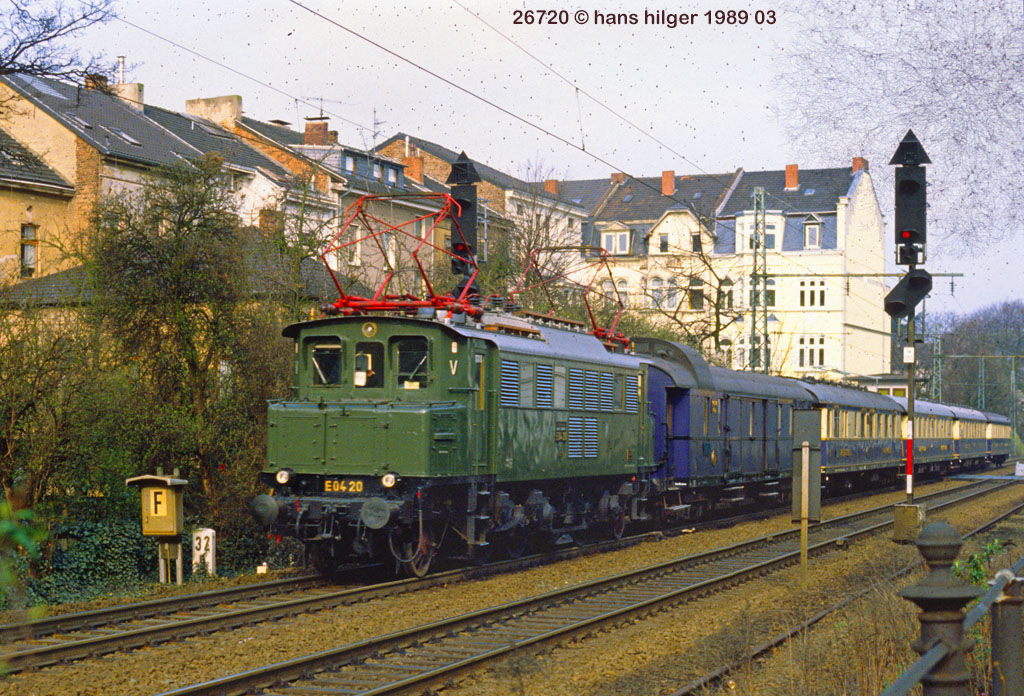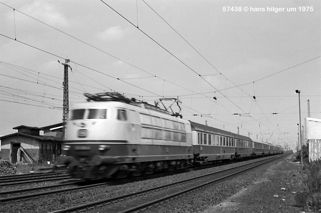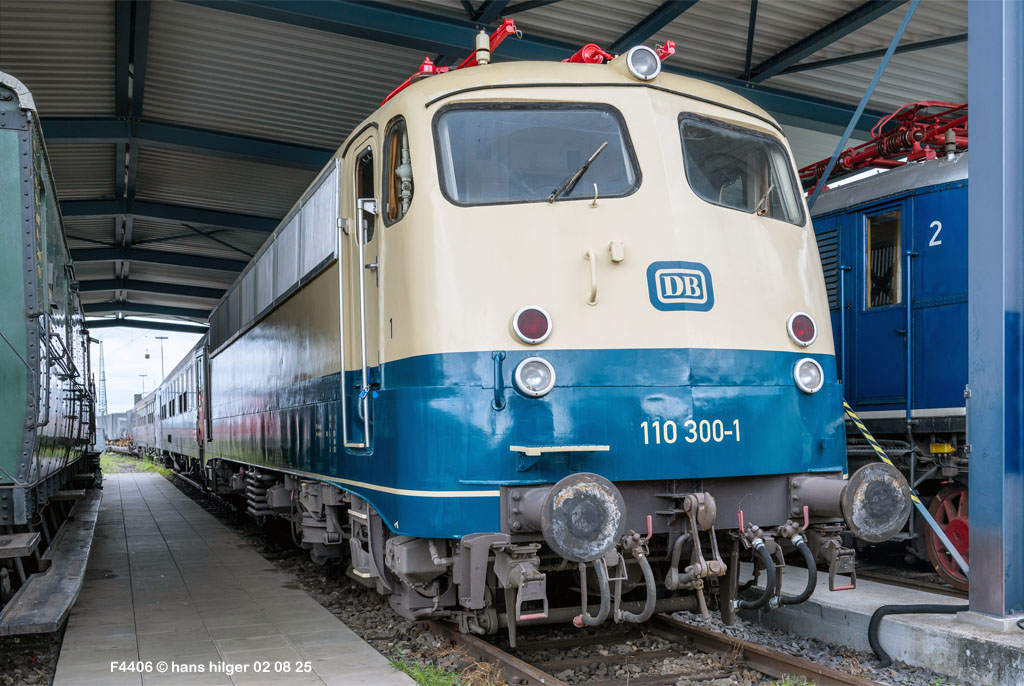 <74> Dort steht vornean die allseits bekannte und betriebsfähige 111 001. Nicht allseits bekannt ist aber, daß ich diese Lok schon “kannte”, als sie noch ganz jung war und zum ersten Mal in ihrem Leben die beige/türkkise Lackierung besaß . . .<75> Da ist sie: 111 001 im Stuttgart des Jahres 1976, da war sie gerade ein Jahr alt<76> Und in Mittenwald hab ich sie mal getroffen in Farbe um 10 Uhr 10, allerdings im Schatten<77> Und am 4. November 2021 hab ich sie im typischen Novemberwetter erwischt, als sie gerade den 605 016 vom AW Krefeld Oppum nach Koblenz zum Museum gebracht hat; Gesehen in Duisburg Wedau. Leider ist der 605 016 ein Trauerspiel, aber okay, er ist wenigstens erhalten<78> Nächste in Koblenz ist die Schnellfahr- 110 300, die gemeinsam mit der 299 einen Sonderstatus hatte<79> Von ihr habe ich nur ein einziges Bild aus dem November 2001 bei Oberhausen, da war sie aber nur noch eine normale 110<80> Neben der schnellen 110 steht ein weiterer Edelrenner: 118 003 ex E18 03 im eleganten Blau ihrer Zeit<81> Im Sommer 1978 in München sah man ihr noch an, daß sie gerade kurz zuvor ihre neuen Lampen bekommen hatte, wo die Fans doch viel lieber die alten großen “Schlafaugen” gehabt hätten, aber wer fragt schon die Fans – Vergleiche mit Bild 162 weiter unten!<82> Dann ist im Museum die E69 03 = 169 003 an der Reihe, eine Hundertjährige: Sie ist von 1912 !!<83> Und von ihr habe ich tatsächlich ein sehr altes Bild aus dem Jahre 1974, entstanden aus dem Führerstand der 169 002, auf der ich mitfahren durfte. Danach ist mir die Lok nie wieder begegnet, weil ich (leider) nicht wieder in der Gegend war<84> Das nächste vorzustellende Exponat des Museums ist E03 001 = 103 001 und ex 750 001 aus dem Jahre 1965. Sie hat leider in 2026 Fristablauf und ist hoffentlich gut genug für eine weitere Fristperiode<85> Im Jahr 1988 stand sie als Meßlok am BZA Minden im Bw Hamburg-Eidelstedt<86> Und Anno 1994 war dieselbe Lok als Bahndienstfahrzeug 750 001 in Minden im BZA anzutreffen in üblem äußeren Zustand<87> Dann stand sie Ende 1997 im AW Opladen mit ihrem 30-Jahres-Aufkleber, aber Keiner wußte, wie es weitergeht, eine neue Untersuchung war kleineswegs selbstverständlich . . .<88> Aber es klappte irgendwie, sie wurde nochmal “gemacht”, wie man damals sagte. Und sie wurde schnell zum Liebling im AW Opladen, wo letztlich mehr gemacht wurde im HInblicxk auf ein langes Leben, als es im Augenblick notwendig gewesen wäre = Sogar die beiden Fronten wurden aufwändig neu beblecht. Links im Hintergrund übrigens die E94 279/579, die zeitgleich aufgearbeitet wurde im AW Opladen<89> Und seitdem gab es zahlreiche Sonderfahrten in alle Ecken der Republik, hier z.B. mit einem ganz exclusiven Sonderzug im Jahre 1999 am Heissener Berg in Mülheim/Ruhr, an dem noch alle sechs Gleise in Betrieb waren<90> Auch 103 113 war anwesend im Museum, sie istebenfalls betriebsfähig<91> Aber von ihr zeige ich nun keine Sonderfahrt-Bilder, sondern zwei eher ungewöhnliche Motive: Einmal sehen wir hier gleich DREI MAL die 101 113 = Einmal im Original, einmal als Sieck-Reisebüro-Modell im Maßstab 1:20 und einmal als H0-Modell von Märklin (gesehen in Köln Bbf)<92> Und das Märklin-.Modell kam nochmals zu Ehren: Hier konnte es mit leider nur wenig Tiefenschärfe in Duisburg mit dem Original 103 113 am Bahnsteig geknipst werden . . . was mit neueren digitalen Medien sehr viel besser “gefunzt” hätte (neudeutsch für funktioniert), aber die gab es damals noch nicht<93> Weiter gehts mit dem Bimmdzf 287.2 51 80 80-95 259-2 D-DB, der noch “geächtete” Drehfalttüren besitzt<94> Nun habe ich vom 80-95 259 kein Bild gefunden, wohl aber vom direkten Schwesterwagen 95 260, der hier im Juni 2023 an der Spitze vom 2157 in Duisburg einläuft in seiner letzten Betriebsphase; Es schiebt 101 042<95> Und davor steht der noch ganz im Original erhaltene n-Wagen, genannt “Silberling” mit der Nummer 50 80 31-53 199-1 ABn 703 D-DB, der sogar noch Fristen hat und eingesetzt werden kann. Seine Besonderheit waren damals die geschliffenen Pfauenaugenmuster im Außenblech<96> Ein Portrait eines solchen Wagens ist mir mal in Essen gelungen Anno 1991, allerdings nicht mehr ganz im Ursprungszustand, denn dieser Wagen hier besitzt schon den neuzeitlicheren blauen (türkisen) Rahmen, der im Original schwarz war; Die Nummer ist leider nicht lesbar <97> Dafür konnte ich mal das typische, geschliffene bzw. “gebürstete Pfauenaugenmuster” dokumentieren (in Augsburg)<98> Ein Gleis weiter stehen drei überhaupt nicht knipsfähige Loks, deren Aufnahmen hier nur als Sichtungsbilder dienen sollen<99> Aber es gibt ja Bilder der Lok von der Ausstellung in Bochum-Dahlhausen 1985<100> Dahinter diese nun wirklich nicht knipsfähige E60 10, sorry<101> Wie schön, daß wir hier wieder auf den Bestand des Archives zurückgreifen können = Bochum-Dahlhausen 1985<102> Sie ist die dritte, die nur ein Sichtungsbild zuließ, aber dat macht nix, denn . . .<103> Denn das hier ist sie 1985 bei den Paraden in Nürnberg, die 194 579 ex 279. Sie ist die Schiebelok (Nachschuß) von . . .<104> . . . diesem Zug, der von E93 07 gezogen wurde, so kommt diese hier auch noch mal zur Geltung und der Kreis schließt sich