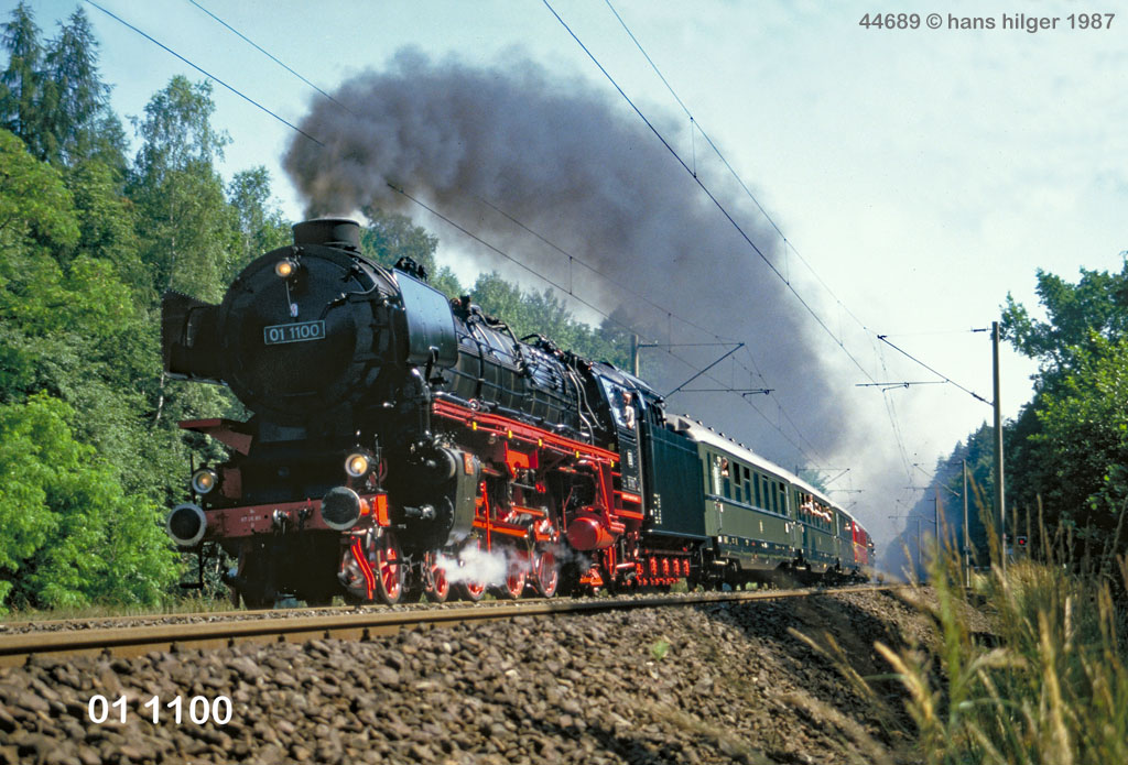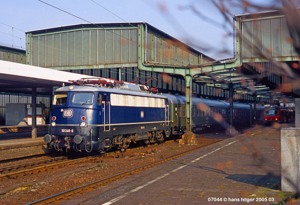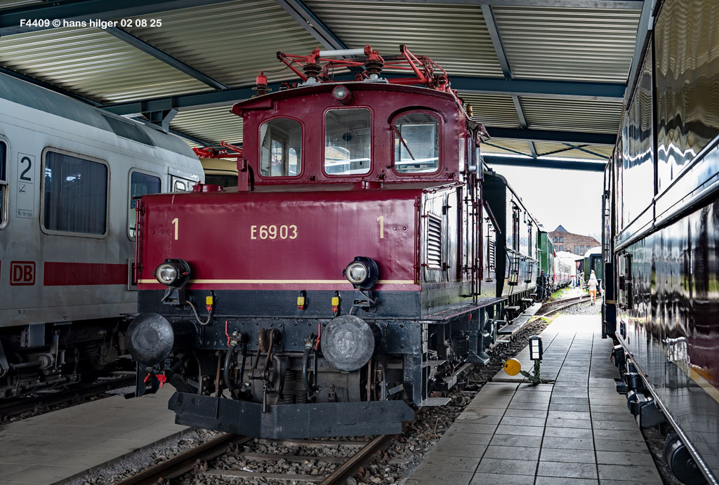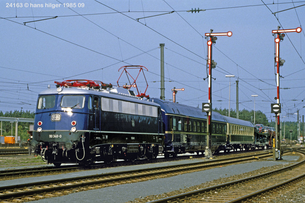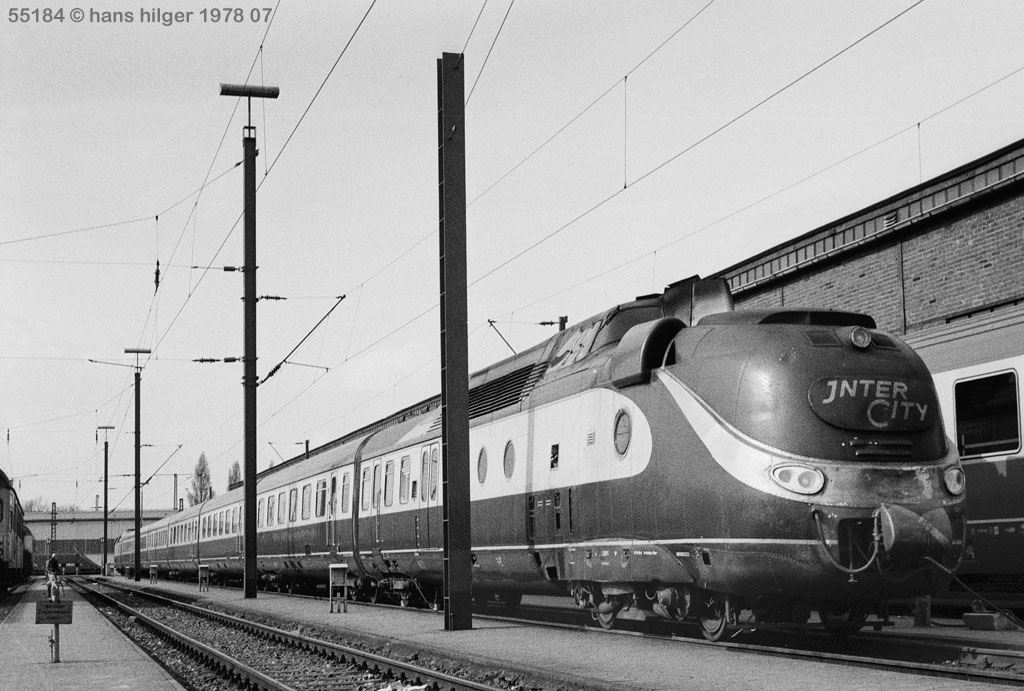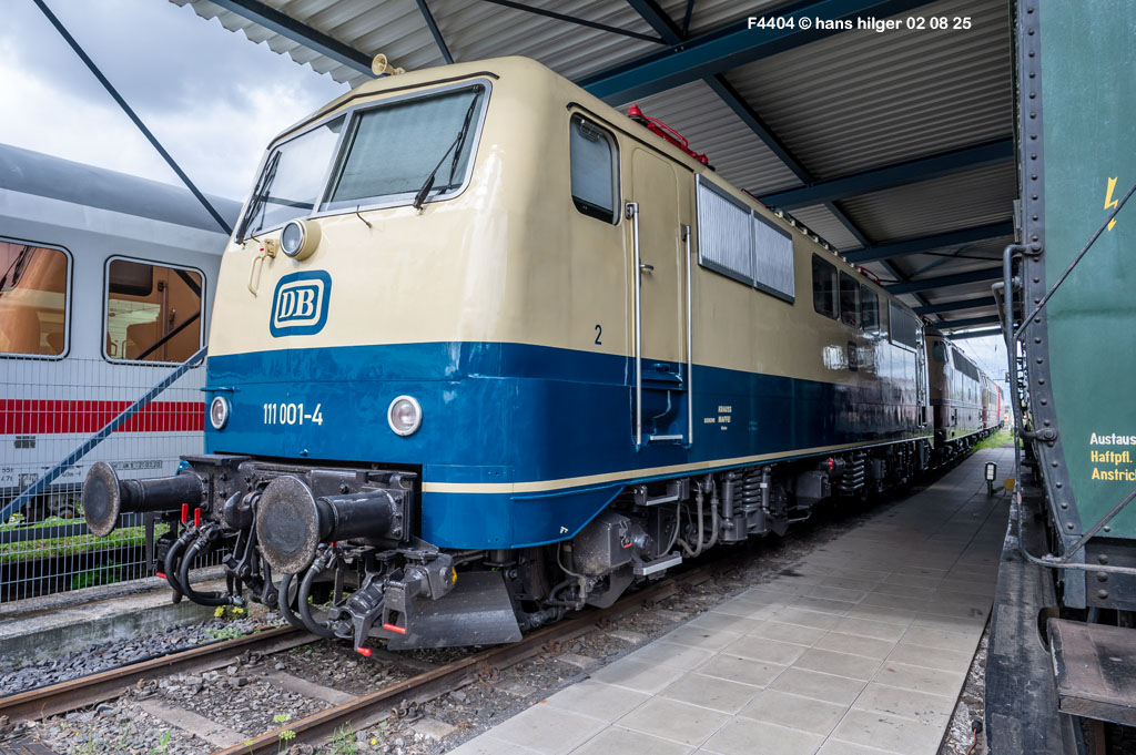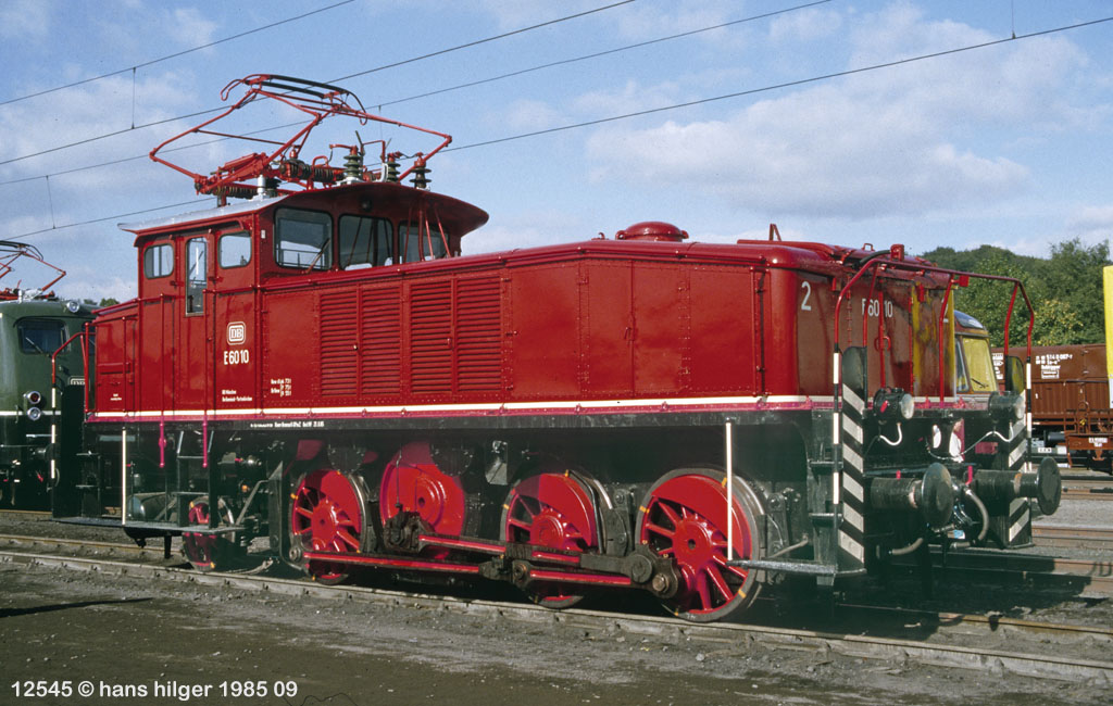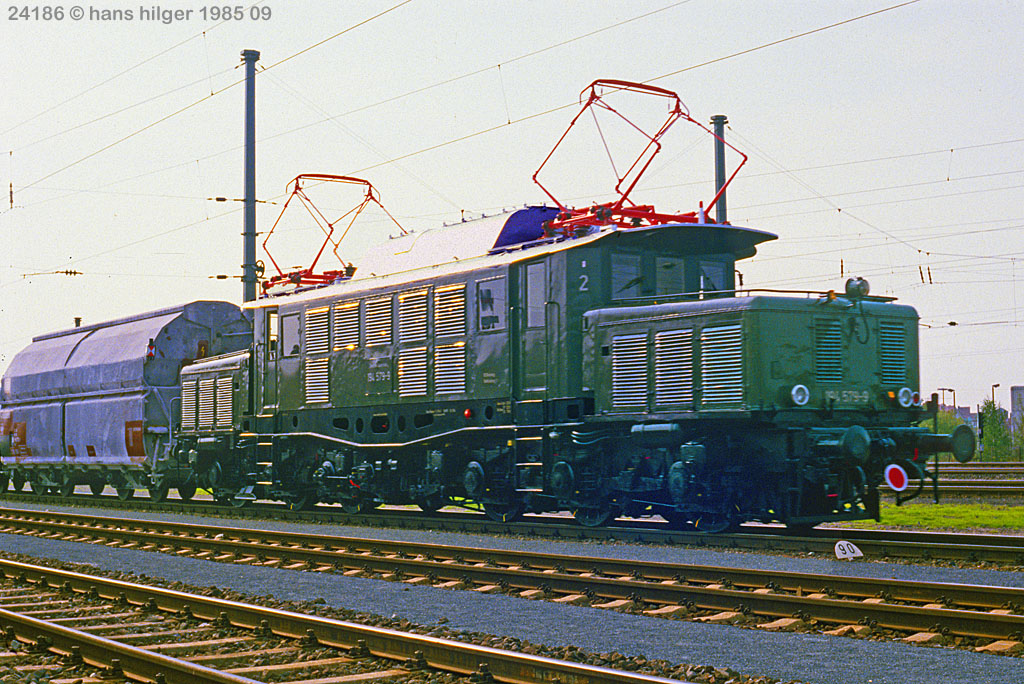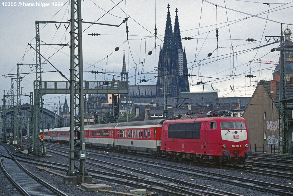 <74> Dort steht vornean die allseits bekannte und betriebsfähige 111 001. Nicht allseits bekannt ist aber, daß ich diese Lok schon “kannte”, als sie noch ganz jung war und zum ersten Mal in ihrem Leben die beige/türkkise Lackierung besaß . . .<75> Da ist sie: 111 001 im Stuttgart des Jahres 1976, da war sie gerade ein Jahr alt<76> Und in Mittenwald hab ich sie mal getroffen in Farbe um 10 Uhr 10, allerdings im Schatten<77> Und am 4. November 2021 hab ich sie im typischen Novemberwetter erwischt, als sie gerade den 605 016 vom AW Krefeld Oppum nach Koblenz zum Museum gebracht hat; Gesehen in Duisburg Wedau. Leider ist der 605 016 ein Trauerspiel, aber okay, er ist wenigstens erhalten<78> Nächste in Koblenz ist die Schnellfahr- 110 300, die gemeinsam mit der 299 einen Sonderstatus hatte<79> Von ihr habe ich nur ein einziges Bild aus dem November 2001 bei Oberhausen, da war sie aber nur noch eine normale 110<80> Neben der schnellen 110 steht ein weiterer Edelrenner: 118 003 ex E18 03 im eleganten Blau ihrer Zeit<81> Im Sommer 1978 in München sah man ihr noch an, daß sie gerade kurz zuvor ihre neuen Lampen bekommen hatte, wo die Fans doch viel lieber die alten großen “Schlafaugen” gehabt hätten, aber wer fragt schon die Fans – Vergleiche mit Bild 162 weiter unten!<82> Dann ist im Museum die E69 03 = 169 003 an der Reihe, eine Hundertjährige: Sie ist von 1912 !!<83> Und von ihr habe ich tatsächlich ein sehr altes Bild aus dem Jahre 1974, entstanden aus dem Führerstand der 169 002, auf der ich mitfahren durfte. Danach ist mir die Lok nie wieder begegnet, weil ich (leider) nicht wieder in der Gegend war<84> Das nächste vorzustellende Exponat des Museums ist E03 001 = 103 001 und ex 750 001 aus dem Jahre 1965. Sie hat leider in 2026 Fristablauf und ist hoffentlich gut genug für eine weitere Fristperiode<85> Im Jahr 1988 stand sie als Meßlok am BZA Minden im Bw Hamburg-Eidelstedt<86> Und Anno 1994 war dieselbe Lok als Bahndienstfahrzeug 750 001 in Minden im BZA anzutreffen in üblem äußeren Zustand<87> Dann stand sie Ende 1997 im AW Opladen mit ihrem 30-Jahres-Aufkleber, aber Keiner wußte, wie es weitergeht, eine neue Untersuchung war kleineswegs selbstverständlich . . .<88> Aber es klappte irgendwie, sie wurde nochmal “gemacht”, wie man damals sagte. Und sie wurde schnell zum Liebling im AW Opladen, wo letztlich mehr gemacht wurde im HInblicxk auf ein langes Leben, als es im Augenblick notwendig gewesen wäre = Sogar die beiden Fronten wurden aufwändig neu beblecht. Links im Hintergrund übrigens die E94 279/579, die zeitgleich aufgearbeitet wurde im AW Opladen<89> Und seitdem gab es zahlreiche Sonderfahrten in alle Ecken der Republik, hier z.B. mit einem ganz exclusiven Sonderzug im Jahre 1999 am Heissener Berg in Mülheim/Ruhr, an dem noch alle sechs Gleise in Betrieb waren<90> Auch 103 113 war anwesend im Museum, sie istebenfalls betriebsfähig<91> Aber von ihr zeige ich nun keine Sonderfahrt-Bilder, sondern zwei eher ungewöhnliche Motive: Einmal sehen wir hier gleich DREI MAL die 101 113 = Einmal im Original, einmal als Sieck-Reisebüro-Modell im Maßstab 1:20 und einmal als H0-Modell von Märklin (gesehen in Köln Bbf)<92> Und das Märklin-.Modell kam nochmals zu Ehren: Hier konnte es mit leider nur wenig Tiefenschärfe in Duisburg mit dem Original 103 113 am Bahnsteig geknipst werden . . . was mit neueren digitalen Medien sehr viel besser “gefunzt” hätte (neudeutsch für funktioniert), aber die gab es damals noch nicht<93> Weiter gehts mit dem Bimmdzf 287.2 51 80 80-95 259-2 D-DB, der noch “geächtete” Drehfalttüren besitzt<94> Nun habe ich vom 80-95 259 kein Bild gefunden, wohl aber vom direkten Schwesterwagen 95 260, der hier im Juni 2023 an der Spitze vom 2157 in Duisburg einläuft in seiner letzten Betriebsphase; Es schiebt 101 042<95> Und davor steht der noch ganz im Original erhaltene n-Wagen, genannt “Silberling” mit der Nummer 50 80 31-53 199-1 ABn 703 D-DB, der sogar noch Fristen hat und eingesetzt werden kann. Seine Besonderheit waren damals die geschliffenen Pfauenaugenmuster im Außenblech<96> Ein Portrait eines solchen Wagens ist mir mal in Essen gelungen Anno 1991, allerdings nicht mehr ganz im Ursprungszustand, denn dieser Wagen hier besitzt schon den neuzeitlicheren blauen (türkisen) Rahmen, der im Original schwarz war; Die Nummer ist leider nicht lesbar <97> Dafür konnte ich mal das typische, geschliffene bzw. “gebürstete Pfauenaugenmuster” dokumentieren (in Augsburg)<98> Ein Gleis weiter stehen drei überhaupt nicht knipsfähige Loks, deren Aufnahmen hier nur als Sichtungsbilder dienen sollen<99> Aber es gibt ja Bilder der Lok von der Ausstellung in Bochum-Dahlhausen 1985<100> Dahinter diese nun wirklich nicht knipsfähige E60 10, sorry<101> Wie schön, daß wir hier wieder auf den Bestand des Archives zurückgreifen können = Bochum-Dahlhausen 1985<102> Sie ist die dritte, die nur ein Sichtungsbild zuließ, aber dat macht nix, denn . . .<103> Denn das hier ist sie 1985 bei den Paraden in Nürnberg, die 194 579 ex 279. Sie ist die Schiebelok (Nachschuß) von . . .<104> . . . diesem Zug, der von E93 07 gezogen wurde, so kommt diese hier auch noch mal zur Geltung und der Kreis schließt sich