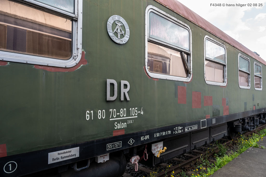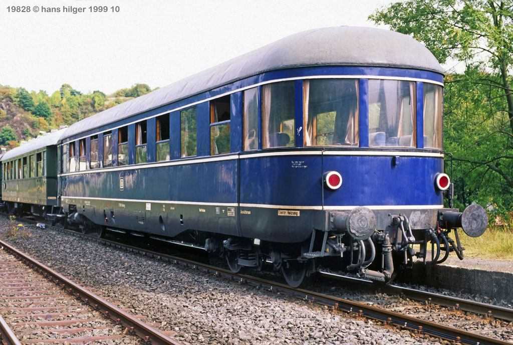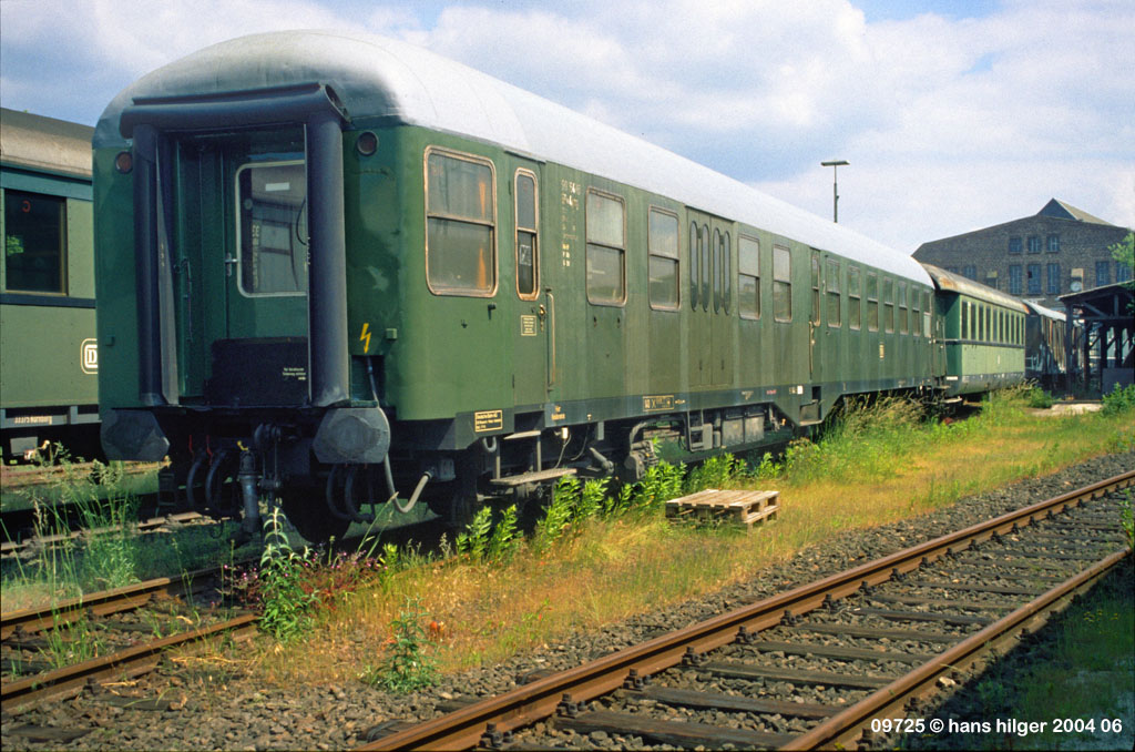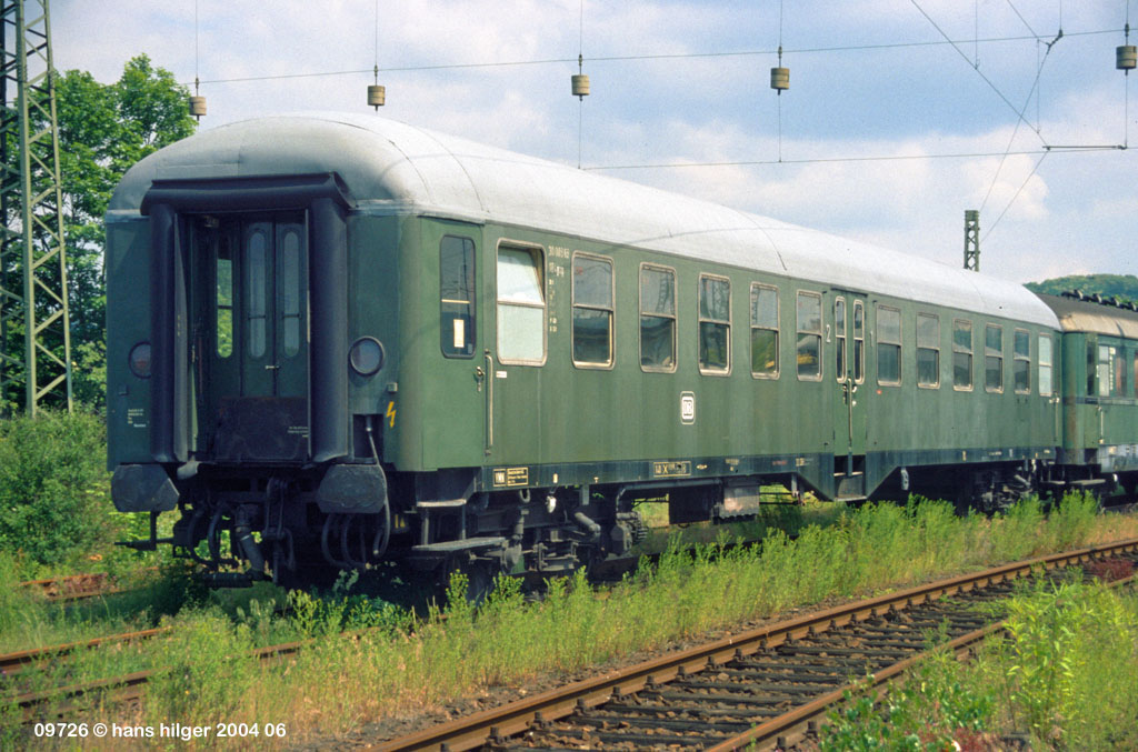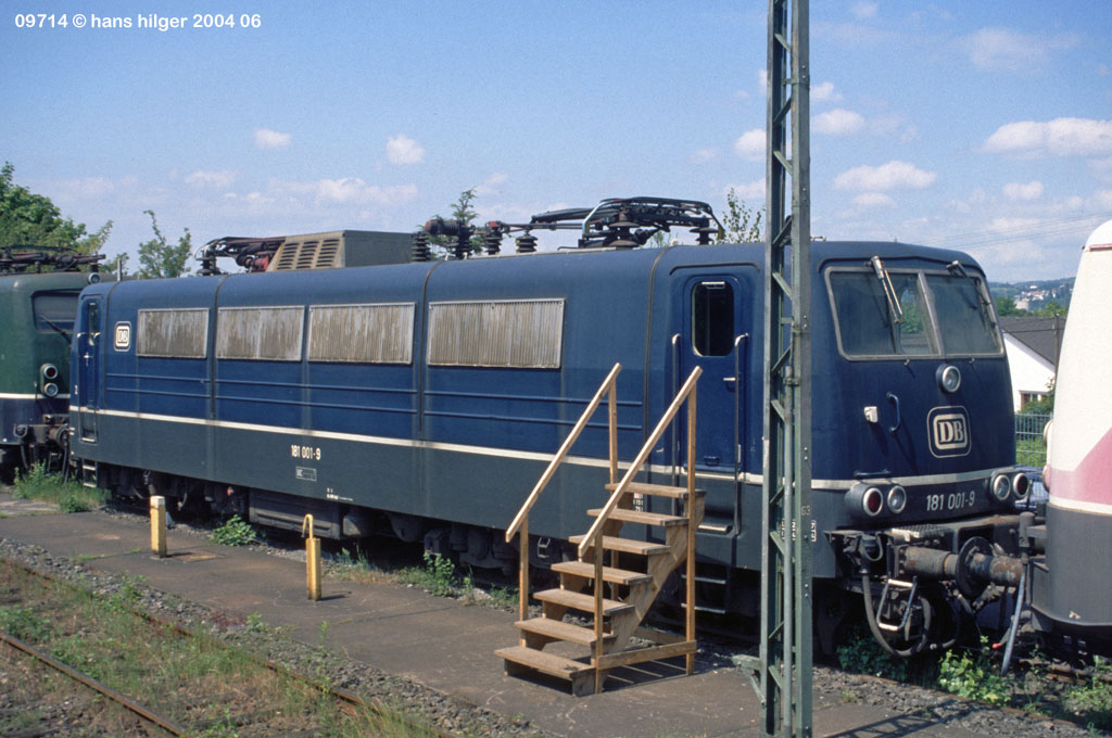 <48> Da ist zum Beispiel dieser Salonwagen bemerkenswert<49> Von dem wir hier die genaue Nummer haben, damit jeder Interessent zu ihm recherchieren kann<50> Dahinter steht dieser Wagen aus dem DDR-Regierungszug mit einem original erscheinenden Staatswappen, das wieder (wie der Barkas am Eingang) auch an das zweite Deutschland mit dem Namen “DDR” denken läßt, in dem dieser Zug hier Sicherheitsstandard 1 hatte <51> Ein solches Staatswappen im Original (vom Wagen 80 103), sehr schwer und aus Messing und Stahl (Privatsammlung)<52> Dann ist dieser wunderbare 1.-Klasse-Wagen dort = D-DB 51 80 14-92 030-8 Aüe 032<53> Und dieser WG 4 Üe. Auch er hat eine sehr braune Vergangenheit und stammt aus dem “Göringzug”, wurde nach dem Krieg aber modifiziert und war im feinsten Zug der Bundesbahn im Einsatz, im “Blauen Enzian”<54> Vor allem aber dieser Wagen hier stellt etwas ganz Außergewöhnliches dar:<55> Es ist der einzige deutsche “Kanzelwagen”, ein Wagen mit Aussichts-Kanzel. Er wurde einstens umgebaut aus einem normalen Reisezugwagen und sollte dem damals vorhandenen Kanzelwagen des “Henschel-Wegmann-Zuges” ähneln als dessen Gegenzug<56> Erstmals sah ich diesen Wagen völlig überraschend beim Dampflok-Spähen in Lauda, wo er plötzlich auftauchte mit einem Sonderzug, der mit der 051 795 weiterbefördert wurde zu unbekanntem Ziel und Zweck. Damals sah er noch etwas anders aus, beachte z.B. die Lampen, und er hatte noch eine völlig andere Nummer . . .<57> Dies war damals seine Nummer, die später geändert wurde, aber es ist derselbe Wagen<58> Um 1980 herum traf ich ihn mal in einem am Bahnhof Bonn abgestellten + bewachten Feinst-Sonderzug für Staatsgäste. Noch trägt er die alte Nummer und hat keinen Hinweis für eine “Elektrische Heizung” wie im Bild aus Kreuzberg, aber er war zu dieser Zeit beige/türkis lackiert<59> Anno 1999 im Oktober traf man ihn mit Dampflok im Ahrtal in Kreuzberg, und nun, obwohl mit Dampf gefahren, trägt er den Hinweis auf die “Elektrische Heizung” auffällig vorne rechts; Nun trägt er auch die neue Wagennummer, die wohl u.A. mit diesem Umbau zusammenhängt<60> DAS nenne ich “standesgemäßes Reisen” !!<61> Auf diesen Sitzen saßen bereits die Queen und alle früheren Kanzler der Republik, Gorbatschow und viele Andere<62> Aber auch dieser Wagen im Museum Koblenz hat Bemerkenswertes in sich . . .<63> Es ist ein “Simulatorwagen”! Es ist u.A. ein kompletter und original funktionsfähiger Führerstand einer E10 darin. Das war schon faszinierend. Und dieser junge Mann hier fuhr so lässig und perfekt (!), der würde auf einer echten E10 sicher von Köln nach Frankfurt kommen<64> Dieser Wagen ist es – Für die Statistiker unter unseren Lesern<65> Dahinter steht sie hier: E10 348, leider schon lange nicht mehr “unter Dampf”<66> Auch sie gehört zu denen, die Anno 1985 in Nürnberg ihren ganz großen Auftritt hatten und dabei aussahen wie frisch aus der Packung. Sie hatte in Nürnberg einen Autoreisezug am Haken, der ebenfalls perfekt sauber war wie nie im betrieblichen Alltag<67> Apropos “betrieblicher Alltag”: In einem solchen traf ich sie zehn Jahre später in Karlsruhe<68> Und nochmals zehn Jahre später war sie wieder in perfektem Zustand im Sonderdienst unterwegs, sie war zwar noch im Einsatz und mußte alles fahren, was man von ihr verlangte, aber sie war bereits in besonderer Pflege, weil sie als Betriebslok schon auserkoren war zum dauerhaften Verweilen im Museum Koblenz nach ihrem aktiven Dienst. Hier sieht es aus wie ein D-Zug der Siebziger, aber es ist der Partyzug “Hetzerather” zum Moselstrand im März 2005<69> Dann ist aus Koblenz zu berichten von der Drehstrom- Vorauslok 120 004, die von den Testfahrten der 182 001 profitiert hatte. Von ihr habe ich leider keine für hier aussagekräftigen alten Bilder, mir war sie nur ein einziges Mal bei einer Ausstellung begegnet<70> Dahinter stehen diese zwei Boliden, die nicht mehr zeigen dürfen, was in ihnen steckt<71> Hier von der anderen Seite, ohne das schwierige Gegenlicht aus dem letzten Bild, dafür mit brauner Front von der Grundierung für einen neuen Anstrich der Vorderfront an 150 091 ex E50 091<72> Dabei liegt mir von 150 091 nur diese eine Fremd-Aufnahme vor, mir selber ist sie nie begegnet (Kaiserslautern 1999), und auch von 150 186 habe ich leider keine alten Bilder, egal in welcher Farbe<73> Und auch solche Kleinigkeiten sind in einem Museum zu finden, wenn auch nur zufällig und ungewollt . . . Wir sehen ein Museumsgleis, das aus dem damals schon seltenen Walzprofil “S 49” hergestellt worden war Anno 1958 beim Bochumer Verein BVG in Bochum