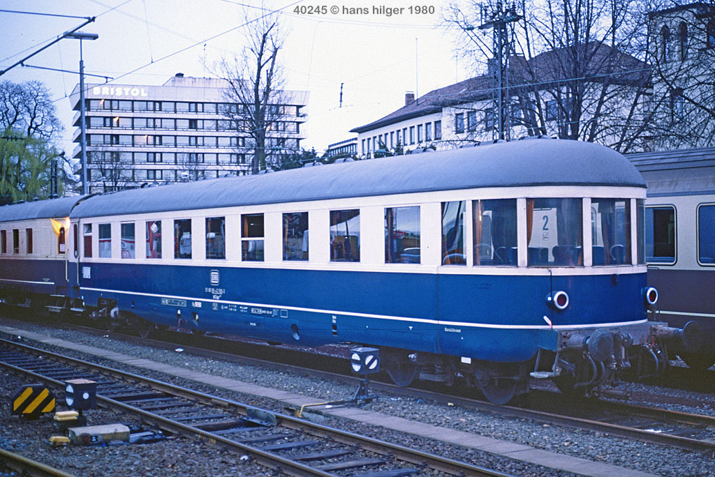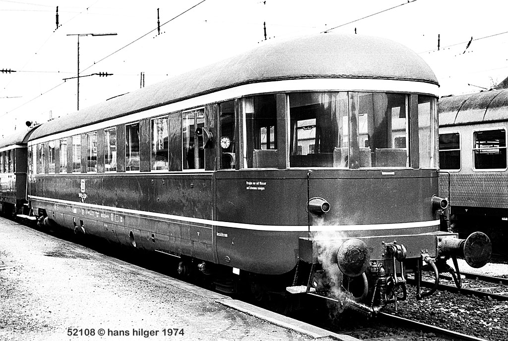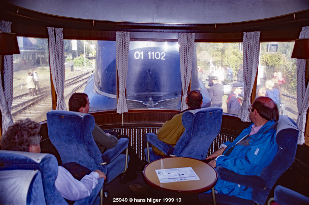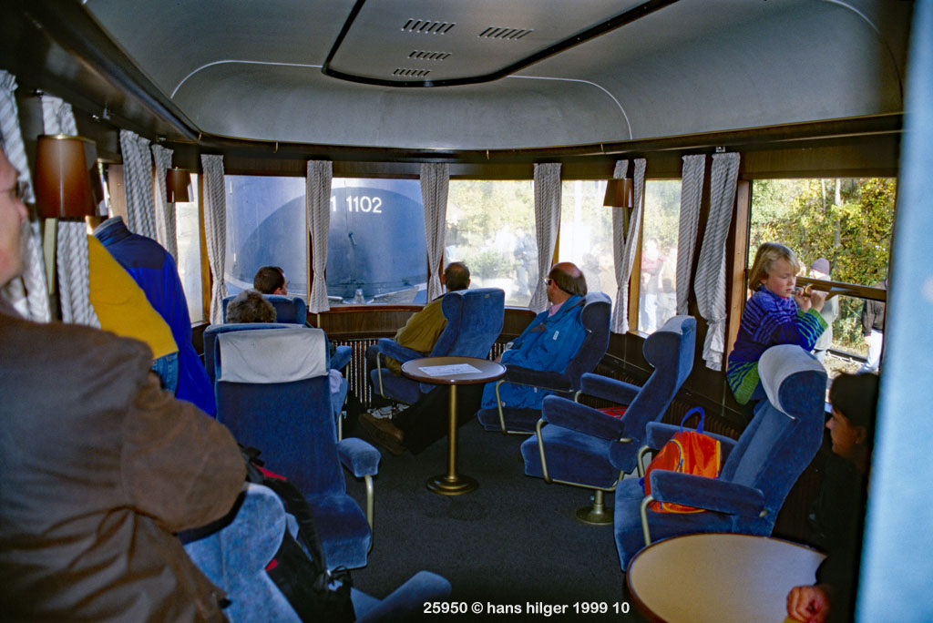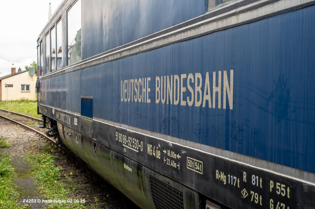 <48> Da ist zum Beispiel dieser Salonwagen bemerkenswert<49> Von dem wir hier die genaue Nummer haben, damit jeder Interessent zu ihm recherchieren kann<50> Dahinter steht dieser Wagen aus dem DDR-Regierungszug mit einem original erscheinenden Staatswappen, das wieder (wie der Barkas am Eingang) auch an das zweite Deutschland mit dem Namen “DDR” denken läßt, in dem dieser Zug hier Sicherheitsstandard 1 hatte <51> Ein solches Staatswappen im Original (vom Wagen 80 103), sehr schwer und aus Messing und Stahl (Privatsammlung)<52> Dann ist dieser wunderbare 1.-Klasse-Wagen dort = D-DB 51 80 14-92 030-8 Aüe 032<53> Und dieser WG 4 Üe. Auch er hat eine sehr braune Vergangenheit und stammt aus dem “Göringzug”, wurde nach dem Krieg aber modifiziert und war im feinsten Zug der Bundesbahn im Einsatz, im “Blauen Enzian”<54> Vor allem aber dieser Wagen hier stellt etwas ganz Außergewöhnliches dar:<55> Es ist der einzige deutsche “Kanzelwagen”, ein Wagen mit Aussichts-Kanzel. Er wurde einstens umgebaut aus einem normalen Reisezugwagen und sollte dem damals vorhandenen Kanzelwagen des “Henschel-Wegmann-Zuges” ähneln als dessen Gegenzug<56> Erstmals sah ich diesen Wagen völlig überraschend beim Dampflok-Spähen in Lauda, wo er plötzlich auftauchte mit einem Sonderzug, der mit der 051 795 weiterbefördert wurde zu unbekanntem Ziel und Zweck. Damals sah er noch etwas anders aus, beachte z.B. die Lampen, und er hatte noch eine völlig andere Nummer . . .<57> Dies war damals seine Nummer, die später geändert wurde, aber es ist derselbe Wagen<58> Um 1980 herum traf ich ihn mal in einem am Bahnhof Bonn abgestellten + bewachten Feinst-Sonderzug für Staatsgäste. Noch trägt er die alte Nummer und hat keinen Hinweis für eine “Elektrische Heizung” wie im Bild aus Kreuzberg, aber er war zu dieser Zeit beige/türkis lackiert<59> Anno 1999 im Oktober traf man ihn mit Dampflok im Ahrtal in Kreuzberg, und nun, obwohl mit Dampf gefahren, trägt er den Hinweis auf die “Elektrische Heizung” auffällig vorne rechts; Nun trägt er auch die neue Wagennummer, die wohl u.A. mit diesem Umbau zusammenhängt<60> DAS nenne ich “standesgemäßes Reisen” !!<61> Auf diesen Sitzen saßen bereits die Queen und alle früheren Kanzler der Republik, Gorbatschow und viele Andere<62> Aber auch dieser Wagen im Museum Koblenz hat Bemerkenswertes in sich . . .<63> Es ist ein “Simulatorwagen”! Es ist u.A. ein kompletter und original funktionsfähiger Führerstand einer E10 darin. Das war schon faszinierend. Und dieser junge Mann hier fuhr so lässig und perfekt (!), der würde auf einer echten E10 sicher von Köln nach Frankfurt kommen<64> Dieser Wagen ist es – Für die Statistiker unter unseren Lesern<65> Dahinter steht sie hier: E10 348, leider schon lange nicht mehr “unter Dampf”<66> Auch sie gehört zu denen, die Anno 1985 in Nürnberg ihren ganz großen Auftritt hatten und dabei aussahen wie frisch aus der Packung. Sie hatte in Nürnberg einen Autoreisezug am Haken, der ebenfalls perfekt sauber war wie nie im betrieblichen Alltag<67> Apropos “betrieblicher Alltag”: In einem solchen traf ich sie zehn Jahre später in Karlsruhe<68> Und nochmals zehn Jahre später war sie wieder in perfektem Zustand im Sonderdienst unterwegs, sie war zwar noch im Einsatz und mußte alles fahren, was man von ihr verlangte, aber sie war bereits in besonderer Pflege, weil sie als Betriebslok schon auserkoren war zum dauerhaften Verweilen im Museum Koblenz nach ihrem aktiven Dienst. Hier sieht es aus wie ein D-Zug der Siebziger, aber es ist der Partyzug “Hetzerather” zum Moselstrand im März 2005<69> Dann ist aus Koblenz zu berichten von der Drehstrom- Vorauslok 120 004, die von den Testfahrten der 182 001 profitiert hatte. Von ihr habe ich leider keine für hier aussagekräftigen alten Bilder, mir war sie nur ein einziges Mal bei einer Ausstellung begegnet<70> Dahinter stehen diese zwei Boliden, die nicht mehr zeigen dürfen, was in ihnen steckt<71> Hier von der anderen Seite, ohne das schwierige Gegenlicht aus dem letzten Bild, dafür mit brauner Front von der Grundierung für einen neuen Anstrich der Vorderfront an 150 091 ex E50 091<72> Dabei liegt mir von 150 091 nur diese eine Fremd-Aufnahme vor, mir selber ist sie nie begegnet (Kaiserslautern 1999), und auch von 150 186 habe ich leider keine alten Bilder, egal in welcher Farbe<73> Und auch solche Kleinigkeiten sind in einem Museum zu finden, wenn auch nur zufällig und ungewollt . . . Wir sehen ein Museumsgleis, das aus dem damals schon seltenen Walzprofil “S 49” hergestellt worden war Anno 1958 beim Bochumer Verein BVG in Bochum