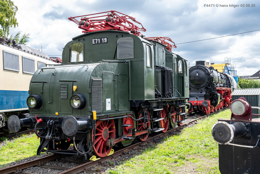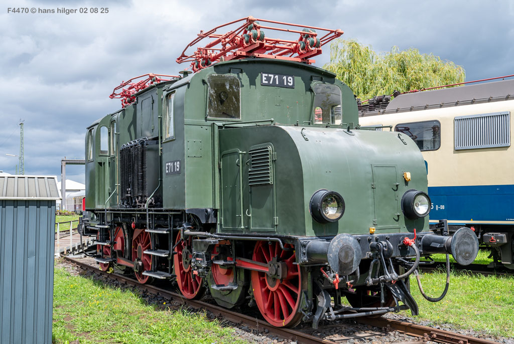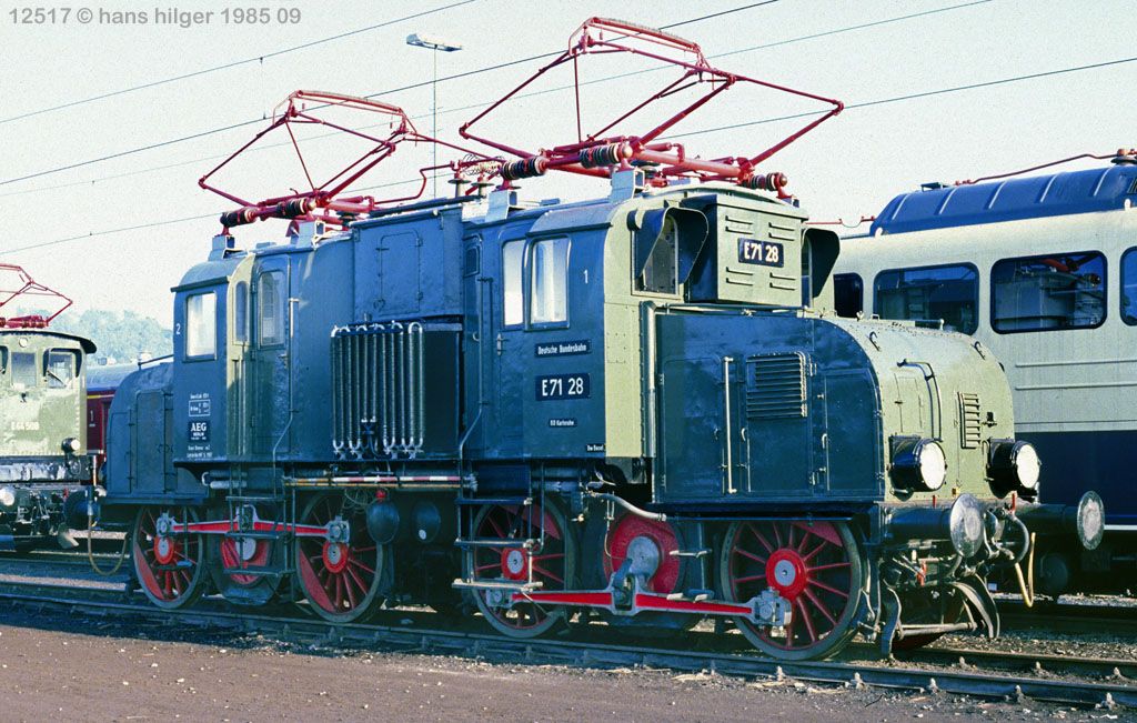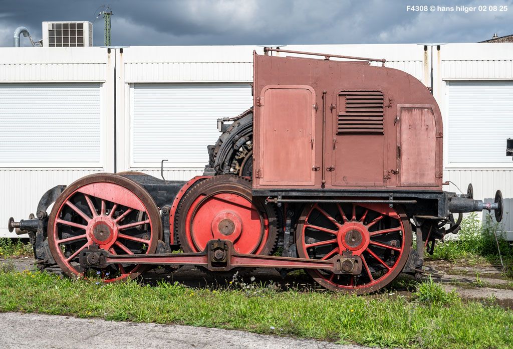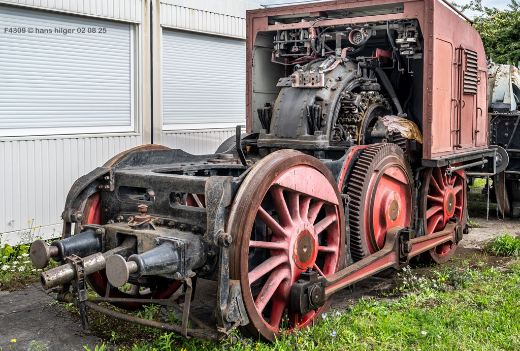 <1> Die Zufahrt an der Schönbornsluster Straße, verkehrsgünstig für Auto und Bahn gelegen in Nähe der B9 und am Bahnhof Koblenz-Lützel, mit einem ausreichend großen Parkplatz für normale Besichtigungen; An Tagen der offenen Tür ist aber die Anreise mit Öffis zu empfehlen<2> Diese zusätzlichen Hinweise sind dem ehemaligen Werbeaufsteller zu entnehmen, der am Eingang steht. Mit einem Bild, das (leider) irreführend ist . . . Da ist doch tatsächlich ein ICE abgebildet, der zum Museum gehören soll . . . Das ist ja prinzipiell auch RICHTIG, ABER der 605 016, von dem wir hier schreiben, ist ein rotes Tuch für die DBAG, ein Zankapfel . . . Ein NoGo. Die Bahn WILL keinen 605 mehr und verneint, jemals einen besessen zu haben = Einen hochmodernen Dieseltriebwagen, der 200 fahren konnte und mit automatischer Neigung schnelle Kurvendurchfahrten ermöglicht hätte, 20 Stück von ihnen hat es gegeben, fast alle sind verschrottet. Und da fängts an zu kriseln: Die Bahn hat DEN 605 fürs Museum genommen, der am schlechtesten erhalten war und hat deutlich BESSERE Züge verschrotten lassen. Sagt das nicht alles? Der 605 016 (siehe weiter unten) ist im heutigen Zustand nur mit horrendem Aufwand zu retten . . . ach lassen wir das . . . diese Zeilen sollen den positiven Eindruck vom Museum nicht trüben, die Mitarbeiter tun ihr Möglichstes und wenn alles aus allen Nähten platzt, sind Kompromisse unumgänglich<3> Am Eingang wird man erwartet von einem großen Metall-Werbeaufsteller der Bundesbahn, den es früher in großer Zahl auf Bahnhöfen gab, und von zwei Treibrädern von Dampflokomotiven. Sehr beachtlich: Die Koblenzer Macher haben sich Mühe gegeben und die Herkunft der beiden Räder recherchiert: Das größere Rad gehört(e) demnach zu der zerlegten 01 227 (zuletzt Ottbergen Heizlok, davor Ehrang als Betriebslok und als Wendelok oft in Koblenz zu Gast), das kleinere Rad soll von der 50 2885 (052 885) stammen (zuletzt Bw Schweinfurt, zerlegt in Grafenwöhr)<4> Daß auch an die Reichsbahn der DDR gedacht wird, die natürlich mit der Bundesbahn einen gemeinsamen Ursprung hat, wird unter Anderem mit diesem Fahrzeug mitgeteilt. Wer mit einem solchen Fahrzeug vorgefahren kommt, wird wahrscheinlich einen Ehren-Parkplatz IM Museum bekommen. Es ist quasi der VW-Bus des Ostens, der Barkas, ein in dutzenden von Varianten gebautes alltagstaugliches Modell der DDR-Industrie für Handwerker, Firmen, Post, Armee und für alle, die was zu transportieren hatten. Dieser hier ist ein Fahrzeug der Reichsbahn vom Kraftwagen-Bw “Kbw” Berlin mit dem Flügelrad auf der Tür<5> Ebenfalls am Eingang und schon in Bild 1 sichtbar, erwartet uns ein Antriebsgestell einer modernen Ellok aus dem Baujahr 1914! Und mit großer Wahrscheinlichkeit ist auch die Nummer der Lok bekannt als E71 13, die schon 1958 in Haltingen ausgemustert worden war, deren einer Fahrmotor mit dem Antriebsgestell aber erhalten blieb<6> Deutlich zu sehen der riesige Fahrmotor mit Antrieb auf den Zahnkranz als “Blindwelle” und Weiterverteilung an die Räder mittels Treibstange. Da im Museum auch eine komplette E71 zu bestaunen ist, kann man sich den Aufbau der Lok anhand dieses Gestelles gut vorstellen: Zwei solcher Gestelle aneinandergehängt, Führerhaus mit Trafo und Nebenaggregaten drauf, fertig ist die sehr erfolgreiche E71 = Eine für ihre Zeit durchaus hochmoderne Lokomotive<7> Damit ihr nicht sofort herunterblättern müßt zur E 71 aus Koblenz, hier ein Bild einer weiteren erhaltenen E71 aus der großen Fahrzeugausstellung im Herbst 1985 in Bochum-Dahlhausen. Dies ist die E71 28, die später ins Johanneum nach Dresden kam und dort heute noch verweilt<8> Diese Zahlen an der im Bild 6 ersten sichtbaren Achse geben indes Rätsel auf: Krupp 1914 ist klar, Direktion Halle ebenfalls. Aber “Halle E 1134” ist nicht zuzuordnen, ebenso die oberen Zeilen “Krupp 1914 1595 17”. Möglicherweise stammt diese Achse noch von einer anderen Lokomotive, aber das Baujahr 1914 paßt zu den ersten E71. Dieses Foto wurde so stark verdreht, daß die Hinweise lesbar werden, daher der blaue Rand<9> Auch dieses Antriebsgestell mit zwei Fahrmotoren der “E16 02” ist dort zu bewundern, und dazu gibt es altes Material:<10> Dies ist genau die erwähnte E16 02 als Bundesbahn-Lok 116 002 im Jahre 1977 mit einem Personenzug nach Freilassing in München Hbf. Wir sehen die Antriebsseite, was wichtig ist, denn die andere Seite sieht völlig anders aus. Wir erkennen, daß die Lok ZWEI dieser Antriebseinheiten besaß, von denen eine in Koblenz erhalten ist, der Rest war in Feldkirchen verschrottet worden 1978<11> Nun gehen wir hinein ins Museum und betreten als erstes die große Halle, in der zu Bundesbahnzeiten eine Wagenwerkstatt zuhause war. Ein Führerstand der 194 159 begrüßt uns, zu der ich leider keine alten Bilder habe<12> Aber ich habe dieses Portrait der Schwesterlok 194 158 zur Verfügung (Neuss Hafenbahn 2006). Nun sehen wir, daß das Führerhaus der E94 zur Hälfte “versteckt” ist hinter dem Vorbau und erkennen gleichzeitig, daß der Führerstand eine geschlossene Front und nur Kabelverbindungen in den Vorbau besitzt, die unten durch den Rahmen geführt sind. Dies hätte beim Anblick einer E94 doch Niemand erwartet, man hätte doch vermutet, die Wand, an der “E94 159” steht, sei unten offen hinter dem Vorbau<13> Und in der Halle erwartet uns als erstes wieder eine E16, die wir als Baureihe schon kennengelernt haben, hier ist es die E16 03 = 116 003, die uns auch ihre Antriebsseite zeigt, aber diese ist nur schlecht fotografierbar, weil zuviel davorsteht. Tatsächlich kann man sich hier im Detail ansehen, wo und wie das Antriebsgestell von draußen in der Lok eingebaut und genutzt war und man kann mit dem draußen Gesehenen vergleichen . . . was manchen Besuchern aber schwerfällt, die Antriebseinheit von draußen hier am Original zu suchen und zu verstehen = Das sind dann gute Gründe für eine geführte Besichtigung mit Erklärungen