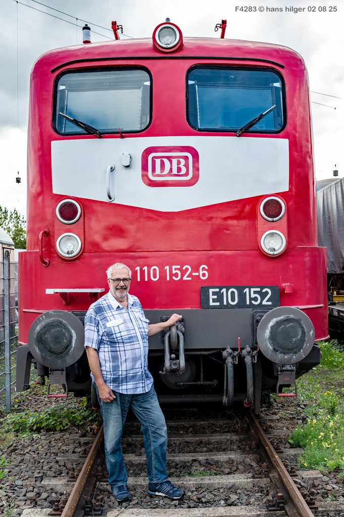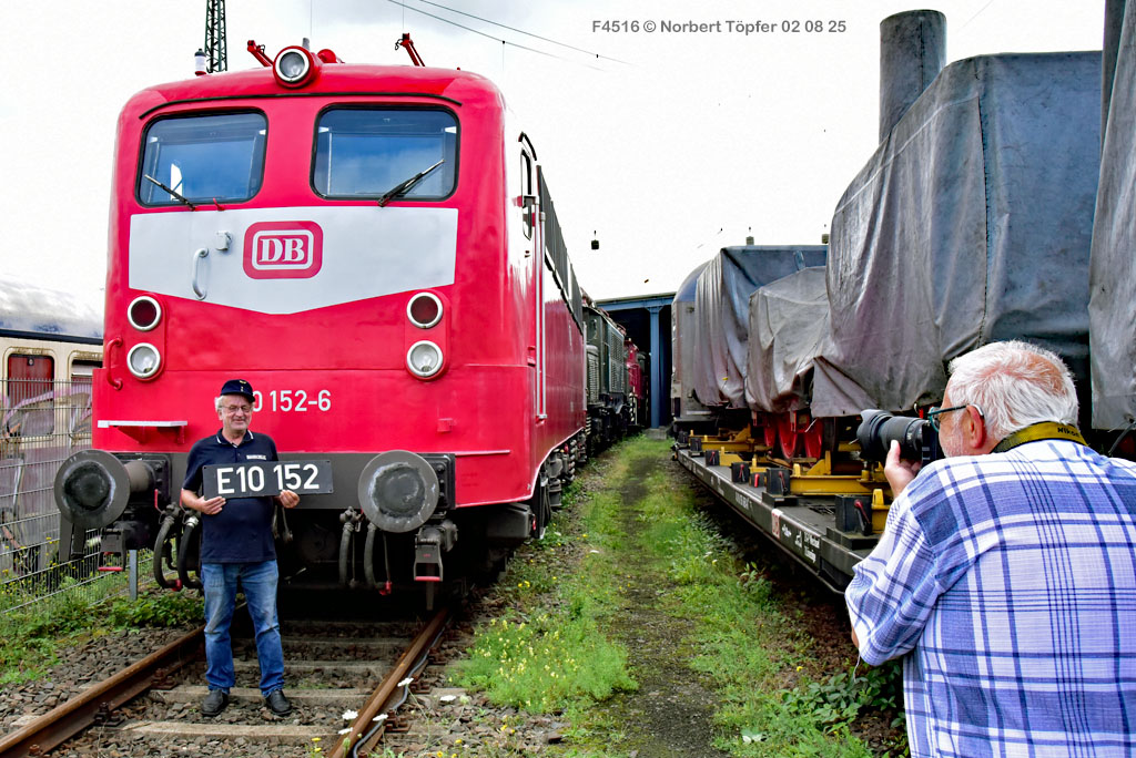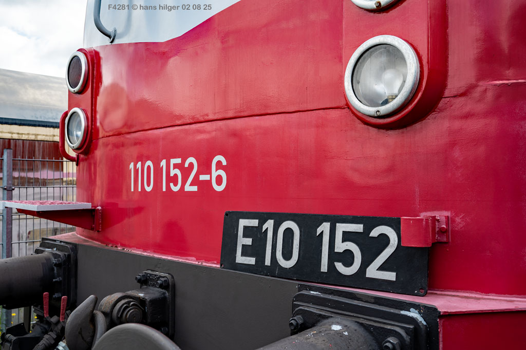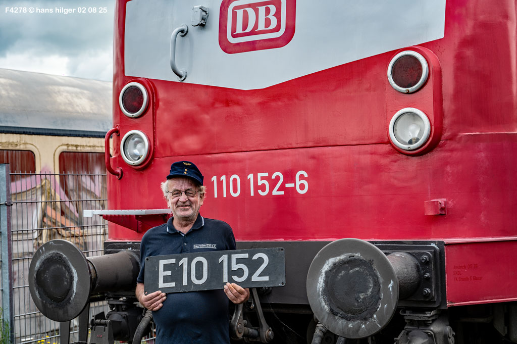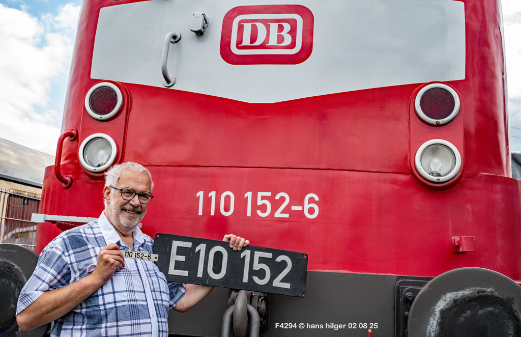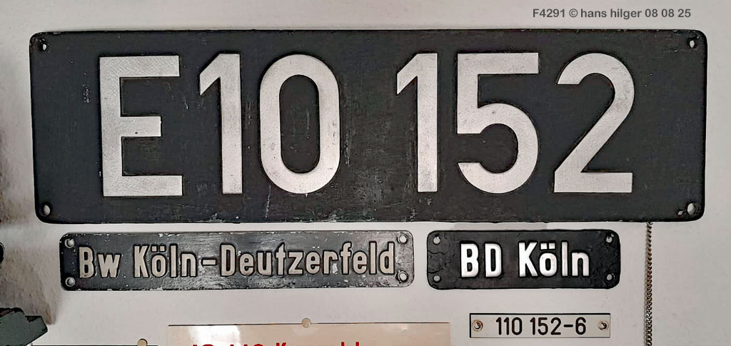 <105> Dies ist die Lok, die mir so sehr am Herzen lag, die schon seit dem November 2008 Fristablauf hat. Es ist 110 152, die ohnehin schon eine besondere Lok ist, weil es 1957 DIE ERSTE dem Betrieb zur Verfügung stehende 110.1 Serienlok war, sie ist älter als die 110 101<106> Und was hat sie noch Besonders? NICHTS. Aber ICH habe was Besonderes von ihr . . .<107> Und zwar DAS HIER = Ein altes Lokschild! Dieses aus Alu gegossene Nummernschild gehörte einstens, 1956, zur Lieferausstattung der Lok bei Krauss-Maffei in München. Es war dann für gut zehn Jahre an der Lok, bis es im Laufe des Jahres 1968 ersetzt wurde durch nur noch aufgeklebte Ziffern im neuen Bezeichnungssystem der Eisenbahn, das EDV-fähig sein sollte und nur noch aus Ziffern bestehen durfte<108> Dieses Zusammentreffen von meinem Schild und der originalen dazu passenden Lokomotive war der Hauptgrund für mich, an diesem Tage nach Koblenz zu fahren, diese Fotosession hatte ich lange geplant und nun umgesetzt, auch mit der Hilfe von diesem netten Herrn vom Verein “Baureihe E10 e.V.”<109> Vielen Dank für die Hilfe an das Nummerngirl Harald N! <110> Das hat großen Spaß gemacht. Es kommt ja nicht sooo oft vor, daß ein Sammler ein Nummernschild einer Lok besitzt, die im Ganzen noch existiert, und das noch in einem Museum und im guten optischen Zustand<111> Zum Thema “Optischer Zustand”: Was ist das denn? Lie Lok mit dem alten Bundesbahn-Emblem im Einsatz! Aber JA DOCH, das war noch zu Planzeiten der Lok, das Bild ist aus 1993, da war die Lok tatsächlich genauso angemalt, wie sie heute im Museum Koblenz steht: Orientrot<112> Und was ist DAS jetzt wieder ??? Na, ganz einfach: Die Lok “110 152-6” gab es ZWEIMAL in Deutschland, einmal als Ost-V100 bei der Reichsbahn der DDR und einmal als E10 der Deutschen Bundesbahn im Westen! Die Ostlok hatte aber nicht soviel Glück wie die West-E10 = Sie wurde bereits 1999 verschrottet, auf dem Bild aus dem Sommer 1984 ist sie als Betriebslok im Schuppen des Bw Nossen zu sehen<113> Und wenn wir von den Achtzigern reden, dann fehlt natürlich auch noch ein Bild der 110 152 in ihrer Ursprungsfarbe BLAU. Und tatsächlich hab ich ein solches Bild im Archiv, nach den DSO-Richtlinen zwar “illegal”, weil vom Balkon des Fahrdienstleiter-Stellwerkes Köln Hbf aus geschossen, aber ich bin etwas stolz darauf, daß ich sowas damals geschafft hatte – Und zwar ganz einfach durch höfliches Fragen! (Dabei ging es aber in der Hauptsache um einen Dampfzug, dieser Zug hier war damals nur Beifang)<114> Und jetzt fehlt natürlich noch der Beweis, daß die Lok zwischenzeitlich anders lackiert war, aber auch da kann mein Archiv helfen: Im Hernst 1999 sehen wir die Lok in Remagen in der Designvariante “verkehrsrot”<115> Und es gibt noch ein Bild aus Duisburg von ihr aus dem Jahre 2000<116> Und dies ist der ganze Schildersatz, den ich in meiner Sammlung habe seit vielen Jahren. Wir erinnern: Es war die erste Serienlok, die im Einsatz stand damals im Februar 1957, sie ist damit älter als died eigentlich “erste” 110 101 und auch älter als die ebenfalls im Museum Koblenz stehende E10 121<117> Aber natürlich bin ich auch selber VOR die Kamera getreten, obwohl ich mich HINTER ihr wohler fühle . . .<118> So, jetzt muß aber auch gut sein mit Schilderportraits