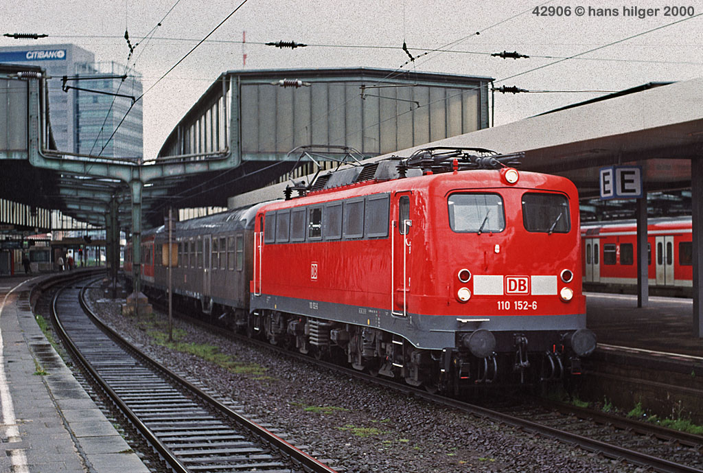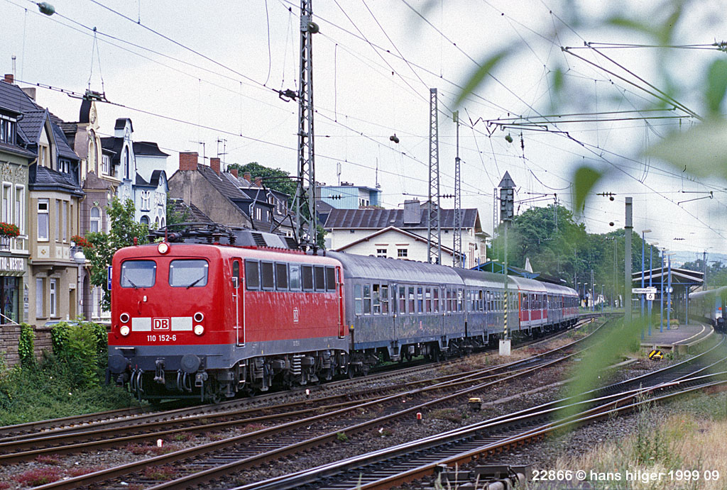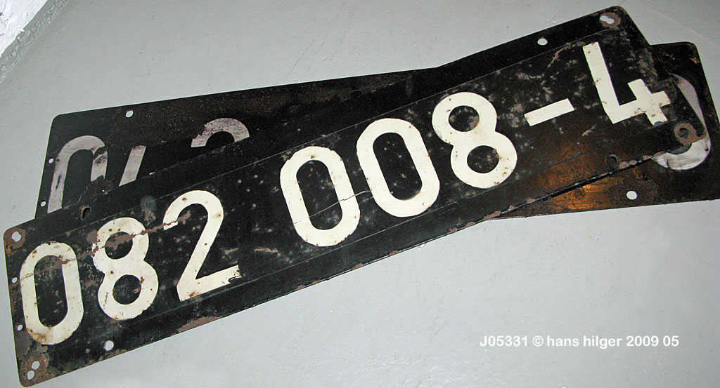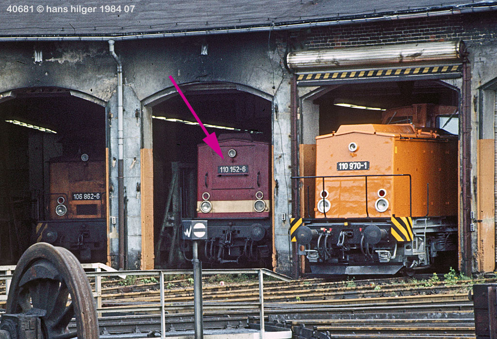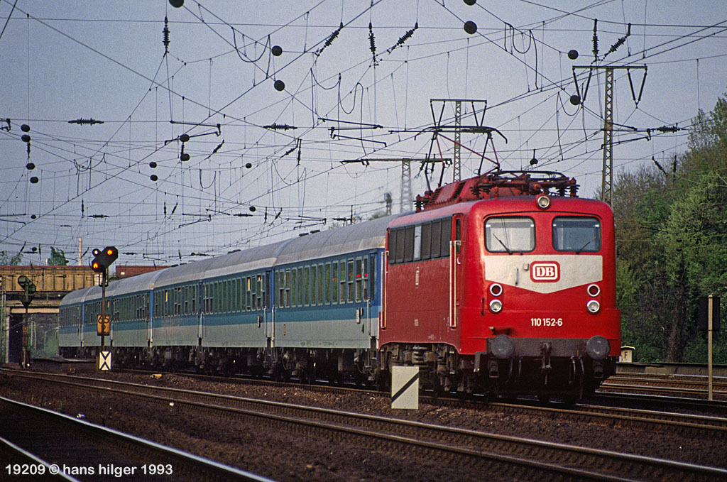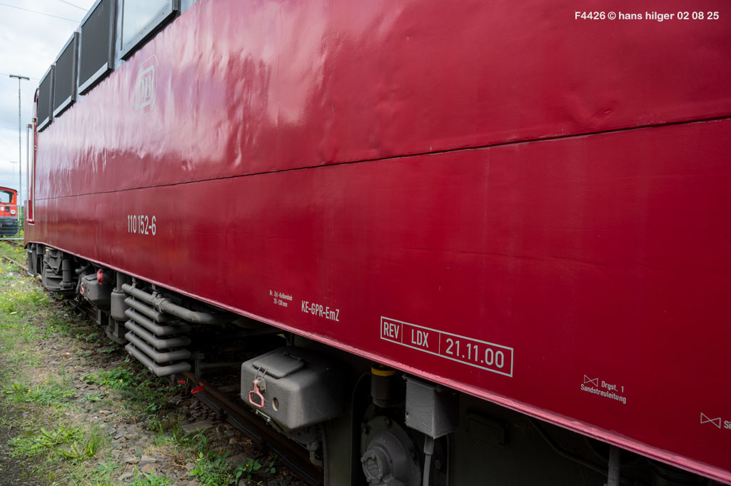 <105> Dies ist die Lok, die mir so sehr am Herzen lag, die schon seit dem November 2008 Fristablauf hat. Es ist 110 152, die ohnehin schon eine besondere Lok ist, weil es 1957 DIE ERSTE dem Betrieb zur Verfügung stehende 110.1 Serienlok war, sie ist älter als die 110 101<106> Und was hat sie noch Besonders? NICHTS. Aber ICH habe was Besonderes von ihr . . .<107> Und zwar DAS HIER = Ein altes Lokschild! Dieses aus Alu gegossene Nummernschild gehörte einstens, 1956, zur Lieferausstattung der Lok bei Krauss-Maffei in München. Es war dann für gut zehn Jahre an der Lok, bis es im Laufe des Jahres 1968 ersetzt wurde durch nur noch aufgeklebte Ziffern im neuen Bezeichnungssystem der Eisenbahn, das EDV-fähig sein sollte und nur noch aus Ziffern bestehen durfte<108> Dieses Zusammentreffen von meinem Schild und der originalen dazu passenden Lokomotive war der Hauptgrund für mich, an diesem Tage nach Koblenz zu fahren, diese Fotosession hatte ich lange geplant und nun umgesetzt, auch mit der Hilfe von diesem netten Herrn vom Verein “Baureihe E10 e.V.”<109> Vielen Dank für die Hilfe an das Nummerngirl Harald N! <110> Das hat großen Spaß gemacht. Es kommt ja nicht sooo oft vor, daß ein Sammler ein Nummernschild einer Lok besitzt, die im Ganzen noch existiert, und das noch in einem Museum und im guten optischen Zustand<111> Zum Thema “Optischer Zustand”: Was ist das denn? Lie Lok mit dem alten Bundesbahn-Emblem im Einsatz! Aber JA DOCH, das war noch zu Planzeiten der Lok, das Bild ist aus 1993, da war die Lok tatsächlich genauso angemalt, wie sie heute im Museum Koblenz steht: Orientrot<112> Und was ist DAS jetzt wieder ??? Na, ganz einfach: Die Lok “110 152-6” gab es ZWEIMAL in Deutschland, einmal als Ost-V100 bei der Reichsbahn der DDR und einmal als E10 der Deutschen Bundesbahn im Westen! Die Ostlok hatte aber nicht soviel Glück wie die West-E10 = Sie wurde bereits 1999 verschrottet, auf dem Bild aus dem Sommer 1984 ist sie als Betriebslok im Schuppen des Bw Nossen zu sehen<113> Und wenn wir von den Achtzigern reden, dann fehlt natürlich auch noch ein Bild der 110 152 in ihrer Ursprungsfarbe BLAU. Und tatsächlich hab ich ein solches Bild im Archiv, nach den DSO-Richtlinen zwar “illegal”, weil vom Balkon des Fahrdienstleiter-Stellwerkes Köln Hbf aus geschossen, aber ich bin etwas stolz darauf, daß ich sowas damals geschafft hatte – Und zwar ganz einfach durch höfliches Fragen! (Dabei ging es aber in der Hauptsache um einen Dampfzug, dieser Zug hier war damals nur Beifang)<114> Und jetzt fehlt natürlich noch der Beweis, daß die Lok zwischenzeitlich anders lackiert war, aber auch da kann mein Archiv helfen: Im Hernst 1999 sehen wir die Lok in Remagen in der Designvariante “verkehrsrot”<115> Und es gibt noch ein Bild aus Duisburg von ihr aus dem Jahre 2000<116> Und dies ist der ganze Schildersatz, den ich in meiner Sammlung habe seit vielen Jahren. Wir erinnern: Es war die erste Serienlok, die im Einsatz stand damals im Februar 1957, sie ist damit älter als died eigentlich “erste” 110 101 und auch älter als die ebenfalls im Museum Koblenz stehende E10 121<117> Aber natürlich bin ich auch selber VOR die Kamera getreten, obwohl ich mich HINTER ihr wohler fühle . . .<118> So, jetzt muß aber auch gut sein mit Schilderportraits