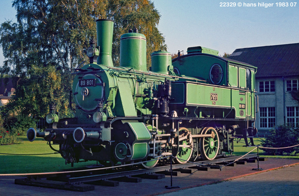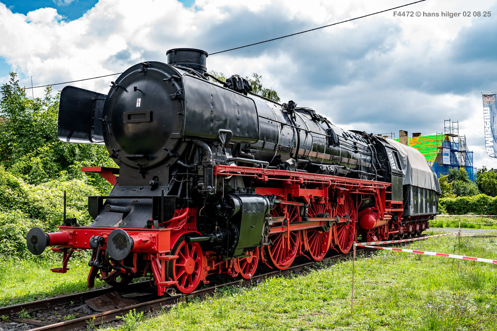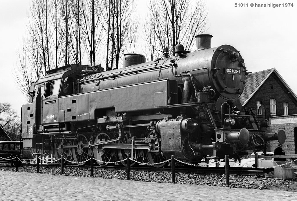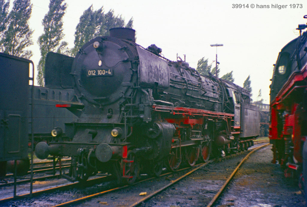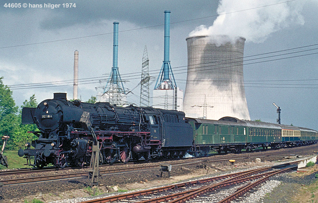 <163> Auch auf den Freiständen an der Drehscheibe stehen noch einige interessante Exponate<164> So zum Beispiel die Neubaudampflok 82 008, die erst 1951 gebaut wurde und schon 1971 wieder abgestellt<165> Und auch sie ist schon viel länger Denkmal als Betriebslok, dieses Bild aus Lingen/Ems ist schon von 1974!<166> Ja, auch von ihr hat etwas den Weg in Sammlerhand gefunden<167> Daneben stand am Tag meines Besuches E19 12, die ebenfalls die gründliche Aufarbeitung von 1985 einigermaßen behalten konnte. Sie ist historisch SEHR korrekt geschmückt mit zeitgemäßem Zierrat, der aber einen Haken hat . . . normalerweise. Von ihr habe ich leider keine alten Bilder. Sie trägt übrigens noch ihre alten “Schlafaugen”-Scheinwerfer, die wir weiter oben bei der E18 03 vermißt hatten > SO sahen sie eben aus, die “großen” Lampen der E18 und 19 (und der SVt und 01.10 etc)<168> Und daneben steht 140 423, eine der derzeitigen Betriebsloks des Museums, und nun sehen wir, daß da hinten rechts noch ein KLV 53 steht . . . den wollen wir natürlich nicht vergessen, aber erst noch ein Portrait der 140:<169> Ein klassisches Prtrait aus 2017 (Bochum-Dahlhausen), aber leider kein altes Bild von ihr im Archiv<170> Nun der “Klv”: Auch dieser Klv 53 Nummer 0663 gehört zum Museumsbestand. “Klv” ist die Bahn-Abkürzung für Kleinwagen mit Verbrennungsmotor. Dieser hier wurde bei Robel gebaut in 1977 und gehörte bis zu deren Auflösung zum Verein in Oberhausen um die 41 360<171> Dann kommen wir zur museumseigenen E71, die derzeit leider draußen stehen muß. Weiter oben haben wir ja bereits die zweite erhaltene Lok dieser Baureihe aus Dresden gesehen (was wieder eine Verbindung nach “drüben” ist) und ein Triebgestell einer weiteren E71<172> Und zu DIESER E71 19 hier habe ich wieder ein sehr altes Bild auf Lager: Wie wir den Daten entnehmen (siehe Link bei Bild 171), war diese Lok bereits 1956 abgestellt und 1958 ausgemustert worden, wurde aber durch das Wirken einer unsichtbaren Hand nicht zerlegt, sondern viele Jahre lang an verschiedenen Standorten hinterstellt, bis die Zeit tatsächlich reif war für eine museale Erhaltung. Einer dieser Standorte war in den Siebziger Jahren des letzten Jahrhunderts das Bw Neuenmarkt- Wirsberg in Bayern, in dem sich heute das DDM (Deutsches Dampflok-Museum) befindet. Und genau dort hatte ich im Jahre 1973 einmal Zutritt und konnte einige der dort hinterstellten Fahrzeuge ablichten; Eines dieser Bilder haben wir ja weiter oben bereits gesehen, siehe Bild 27 (98 307). Ich konnte ja damals nicht im entferntesten ahnen, daß ich 50 Jahre später immer noch eine Gelegenheit haben würde, die Lok zu knipsen, damals stand ich erstmals sprachlos vor einem solchen Dino . . .<173> Ja, was ist denn das da hinter der E71 ???<174> Dort steht die schönste, die größte, und die wertvollste Museumslok, die die Bahn neben dem 601 überhaupt zu bieten hat, es ist die ehrwürdige 01 1100 alias 012 100-4, die planmäßig zuletzt 1975 unterwegs war im Emsland, die danach aber viele Jahre lang Fans glücklich gemacht hat bei Sonderfahrten – Bis ein Drama um Zuständigkeiten und ein gestohlenes Betriebsbuch einen vorläufigen Schlußstrich unter alle Bemühungen gesetzt hat, sie wieder ans Laufen zu bringen. Seitdem steht sie hier in Koblenz und Niemand weiß so recht was mit ihr anzufangen dort . . . besser wird sie dort im Freien natürlich ebenfalls nicht, obwohl sie zur Zeit gut gepflegt und etwas aufgearbeitet wirkt<175> Dies ist eine meiner ältesten Aufnahmen von ihr: 012 100 am Reparaturschuppen im Bw Rheine<176> Und das ist eine meiner schönsten Aufnahmen von ihr: In Hanekenfähr mit dem E 3260, dem ersten und einzigen Zug, der schon einen beige/türkisen y-Wagen im Zugverband dieser Zeit (um Ostern 74 herum) hatte. Dazu hab ich jahrelang behauptet, wir sähen eine Dampflok vor einem Atomkraftwerk, das war ja spektakulär, aber ganz richtig ist es nicht, denn: Das Atomwerk befindet noch dahinter, hinter dem konventionellen Kraftwerk, und ist von hier aus nicht sichtbar<177> Und sie ist auch die schwerste Lok, die die Bahn zu bieten hat. Da paßt die Bildnummer “177” ganz gut = Sie wiegt nämlich genau 177 Tonnen, wenn sie betriebsbereit ist. Und das kommt nicht daher, daß ich als Dickmops mit auf die Waage getreten wäre! Ich stehe aus einem anderen Grunde dort: Ich bin 1,86 groß und muß mich schon anstrengen, die Hand auf die zwei Meter hohen Räder der Lok legen zu können . . . ZWEI Meter sind schon eine gewaltige Hausnummer, die man sich ohne diesen Größenvergleich kaum vorstellen könnte. Und damit wir uns so ein Ungetüm nochmal unter “richtigem” Dampf vorstellen können, zeige ich noch ein paar Betriebsaufnahmen von ihr, denn auch hier bin ich Zeitzeuge und habe viele schöne Erinnerungen an sie . . .<178> Wie war das mit dem Rennpferd, das vor dem Start mit den Hufen scharrt ??<179> Da geht mir das Herz auf bei solchen Bildern, sorry. Ein solches Erlebnis ist nicht zu toppen durch die “tote” Lok im Museum in Koblenz, da liegen Welten dazwischen. Kann man das irgendwie verstehen ?<180> Nein, da kommt das beste Bild im Museum nicht mit, SOWAS hier muß man erlebt haben, um es zu beurteilen