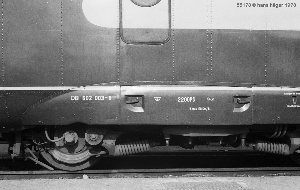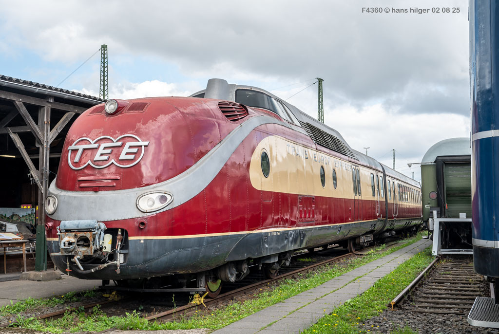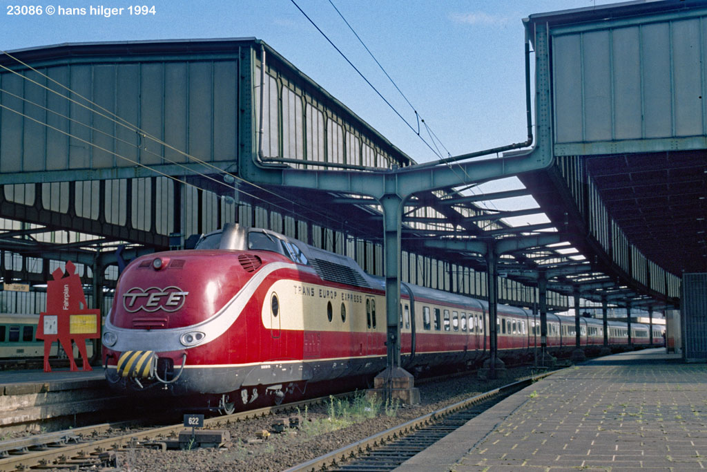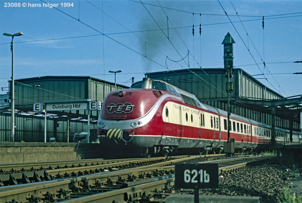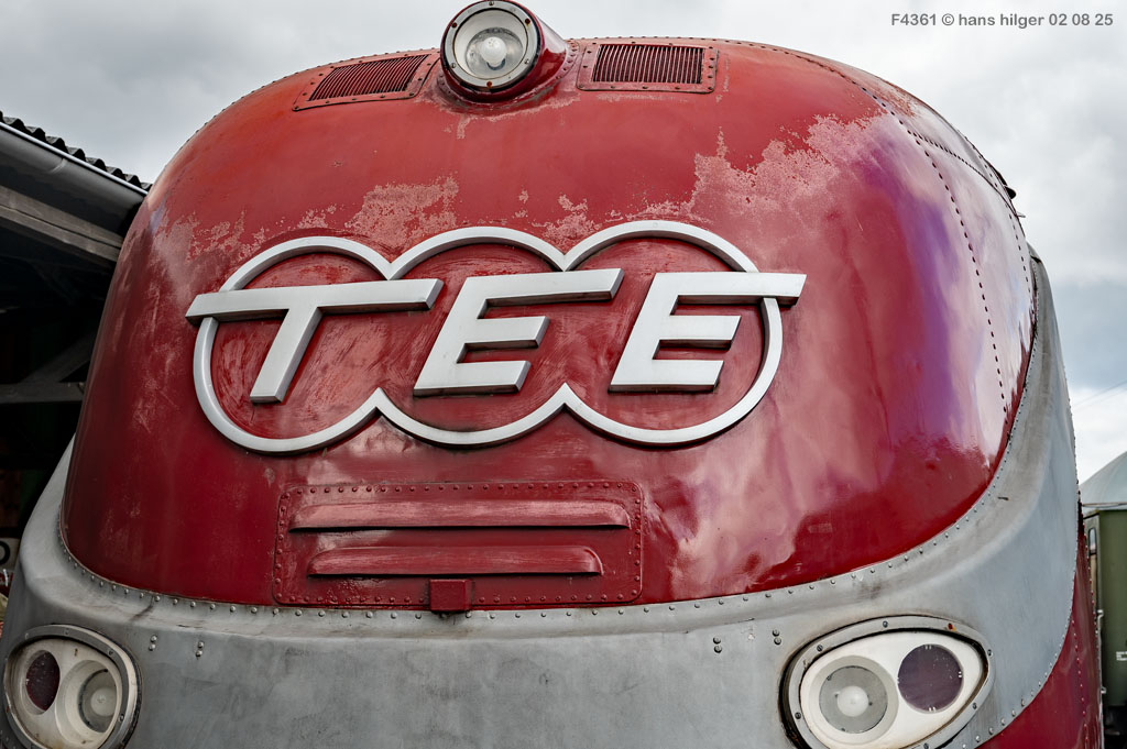 <37> Nun sind wir durch mit der Halle und kommen zu der Modellbahnanlage unter einem Regenschutz, damit aber auch zum wohl interessantesten Fahrzeug des Museums überhaupt, das hier rechts bereits hervorlugt . . .<38> Hinter der Halle, also leider im Freien, vegetiert der 601 vor sich hin. Deutlich ist erkennbar, daß ihm aggressiver Regen bereits wieder zusetzt und er bestimmt nicht besser wird an seinem Platz. Es ist der Kopf 601 008 mit den Mittelwagen 901 122 und 901 203, dahinter hängt ein zweiter Kopf, zu dem wir noch kommen. Leider, leider, leider haben die Bemühungen der Bahn nur zu unerklärlichen Geldflüssen geführt, die nie aufgeklärt wurden, nicht aber zu einer betriebsfähigen Aufarbeitung des Fahrzeugs, die dem Vernehmen nach kurz bevorstand. So steht das wahrscheinlich historisch wertvollste Fahrzeug des Museums unstandesgemäß im Freien und wartet auf eine neue Halle, die in absehbarer Zeit gebaut werden soll, auf die aber auch andere Exponate dringend warten . . .<39> Das klassische Logo des hochwertigen Reiseverkehrs in Europa: Trans-Europ-Express TEE. Es ist eines der bekanntesten Logos der Industriegeschichte und in ganz Europa verbreitet, da es seit 1957 für internationale Züge angewendet wurde und zum Markenbegriff für erstklassiges Reisen als Erlebnis geworden ist. Es wird wohl ein Traum bleiben, diesen Zug noch einmal fahren zu sehen. Es sei denn, ich gewänne im Lotto . . .<40> Wir sehen die alte Nummer des 601 008 = Vt 11 5008, wobei unter Fans auch gerne die Abkürzung SVt genutzt wird in Anlehung an die schnellen Dieselzüge der Dreißiger Jahre. Zudem sehen wir den zum TEE-Emblem gehörenden Schriftzug und die genietete Aluminiumkarosserie<41> Das führt dann direkt zu einem Betriebsbild vom 601 008, gesehen in Duisburg 1994, als es noch Sondereinsätze gab mit eigener Kraft<42> Mit eigener Kraft? Und wie! Das wird mir beim Anblick dieses Bildes wohl Jeder glauben<43> Und dies ist der Nachschuß des Zuges in einen schwarzen Gewitterhimmel. Und mit dem Mangel, daß ich bis heute nicht weiß, WELCHER Triebkopf das war, der mit dem 008 zusammen den Zug bildete, der im Mai 1994 (so ich erinnere) nach Süden fuhr<44> Dies ist im Museum Koblenz-Lützel der hintere Kopf des ausgestellten 601, es ist der ehemalige Gasturbinen-Kopf 602 003 und damit der vormalige 601 012, aber er besitzt schon lange keine Gasturbine mehr, nur noch die äußeren Zeichen derselben<45> Dann fehlt natürlich ein Einsatzbild des 602 003, und das haben wir hier, obwohl dieser Kopf hier “nur” der 602 004 (ex 601 007) ist, denn: Der 602 003 ist der andere Kopf am hinteren Ende dieses Zuges, der auf der legendären “Rheingold”-Ausstellung 1978 in Köln Gereon (Bw Bbf) präsentiert wurde<46> Dies ist der damalige 602 003, und nach dem Spruch: Keine Buchung ohne Beleg . . .<47> . . . und keine Nummer ohne Beweis . . . haben wir hier die Beweisnummer aus Köln