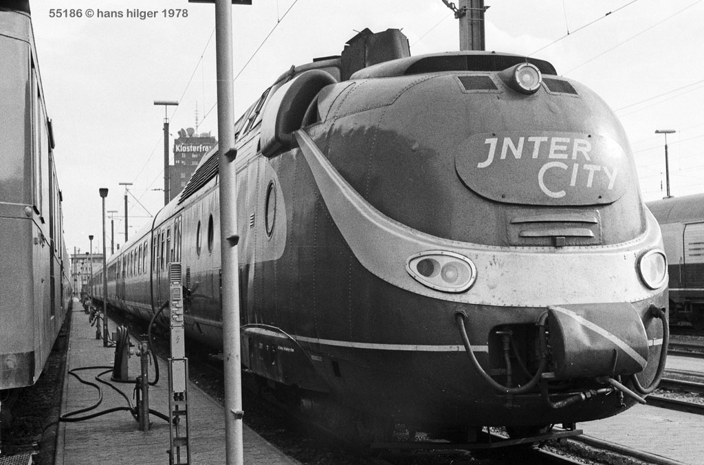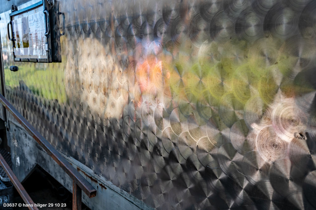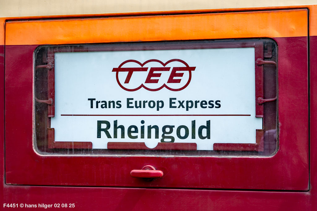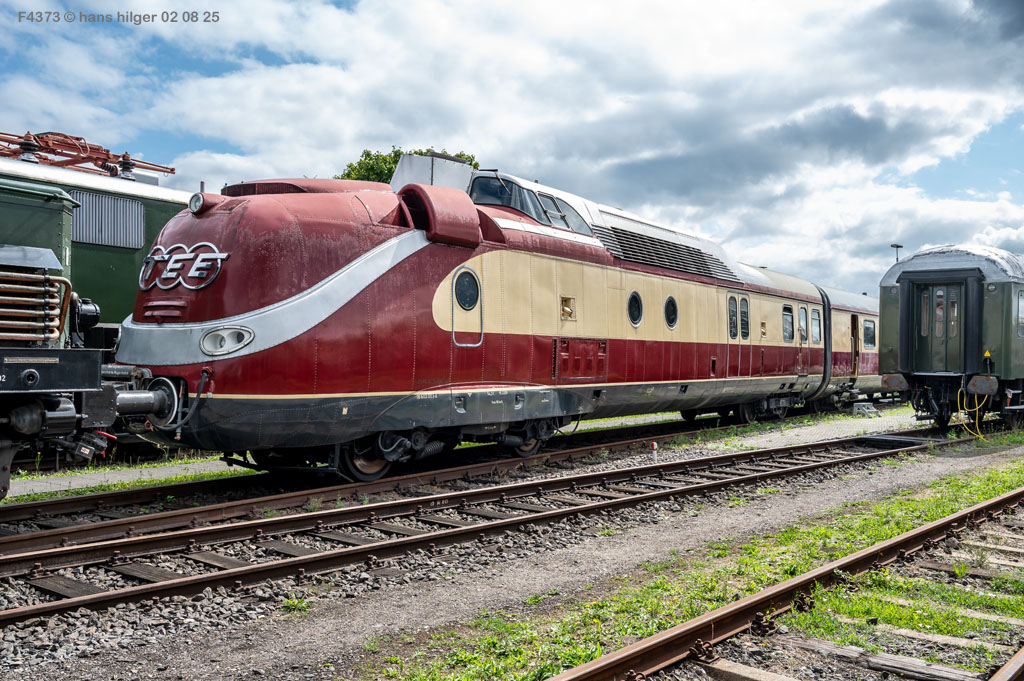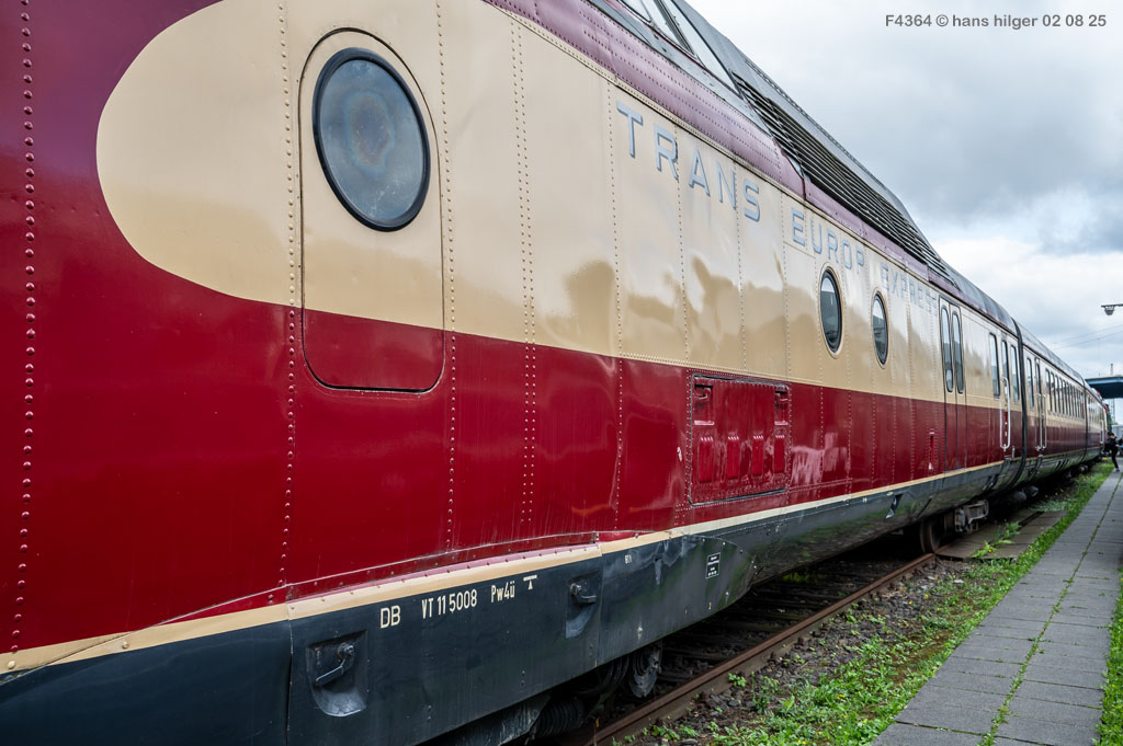 <37> Nun sind wir durch mit der Halle und kommen zu der Modellbahnanlage unter einem Regenschutz, damit aber auch zum wohl interessantesten Fahrzeug des Museums überhaupt, das hier rechts bereits hervorlugt . . .<38> Hinter der Halle, also leider im Freien, vegetiert der 601 vor sich hin. Deutlich ist erkennbar, daß ihm aggressiver Regen bereits wieder zusetzt und er bestimmt nicht besser wird an seinem Platz. Es ist der Kopf 601 008 mit den Mittelwagen 901 122 und 901 203, dahinter hängt ein zweiter Kopf, zu dem wir noch kommen. Leider, leider, leider haben die Bemühungen der Bahn nur zu unerklärlichen Geldflüssen geführt, die nie aufgeklärt wurden, nicht aber zu einer betriebsfähigen Aufarbeitung des Fahrzeugs, die dem Vernehmen nach kurz bevorstand. So steht das wahrscheinlich historisch wertvollste Fahrzeug des Museums unstandesgemäß im Freien und wartet auf eine neue Halle, die in absehbarer Zeit gebaut werden soll, auf die aber auch andere Exponate dringend warten . . .<39> Das klassische Logo des hochwertigen Reiseverkehrs in Europa: Trans-Europ-Express TEE. Es ist eines der bekanntesten Logos der Industriegeschichte und in ganz Europa verbreitet, da es seit 1957 für internationale Züge angewendet wurde und zum Markenbegriff für erstklassiges Reisen als Erlebnis geworden ist. Es wird wohl ein Traum bleiben, diesen Zug noch einmal fahren zu sehen. Es sei denn, ich gewänne im Lotto . . .<40> Wir sehen die alte Nummer des 601 008 = Vt 11 5008, wobei unter Fans auch gerne die Abkürzung SVt genutzt wird in Anlehung an die schnellen Dieselzüge der Dreißiger Jahre. Zudem sehen wir den zum TEE-Emblem gehörenden Schriftzug und die genietete Aluminiumkarosserie<41> Das führt dann direkt zu einem Betriebsbild vom 601 008, gesehen in Duisburg 1994, als es noch Sondereinsätze gab mit eigener Kraft<42> Mit eigener Kraft? Und wie! Das wird mir beim Anblick dieses Bildes wohl Jeder glauben<43> Und dies ist der Nachschuß des Zuges in einen schwarzen Gewitterhimmel. Und mit dem Mangel, daß ich bis heute nicht weiß, WELCHER Triebkopf das war, der mit dem 008 zusammen den Zug bildete, der im Mai 1994 (so ich erinnere) nach Süden fuhr<44> Dies ist im Museum Koblenz-Lützel der hintere Kopf des ausgestellten 601, es ist der ehemalige Gasturbinen-Kopf 602 003 und damit der vormalige 601 012, aber er besitzt schon lange keine Gasturbine mehr, nur noch die äußeren Zeichen derselben<45> Dann fehlt natürlich ein Einsatzbild des 602 003, und das haben wir hier, obwohl dieser Kopf hier “nur” der 602 004 (ex 601 007) ist, denn: Der 602 003 ist der andere Kopf am hinteren Ende dieses Zuges, der auf der legendären “Rheingold”-Ausstellung 1978 in Köln Gereon (Bw Bbf) präsentiert wurde<46> Dies ist der damalige 602 003, und nach dem Spruch: Keine Buchung ohne Beleg . . .<47> . . . und keine Nummer ohne Beweis . . . haben wir hier die Beweisnummer aus Köln