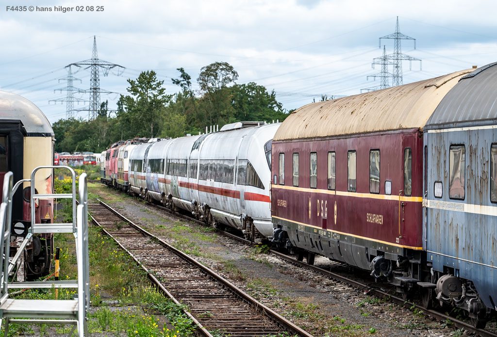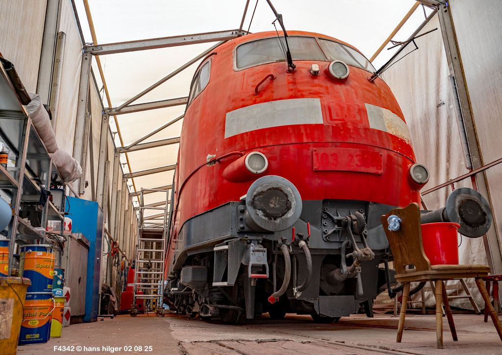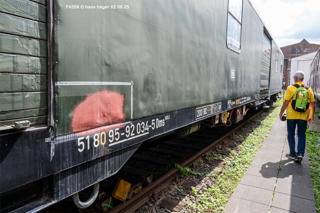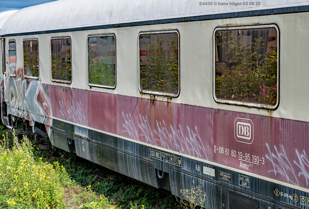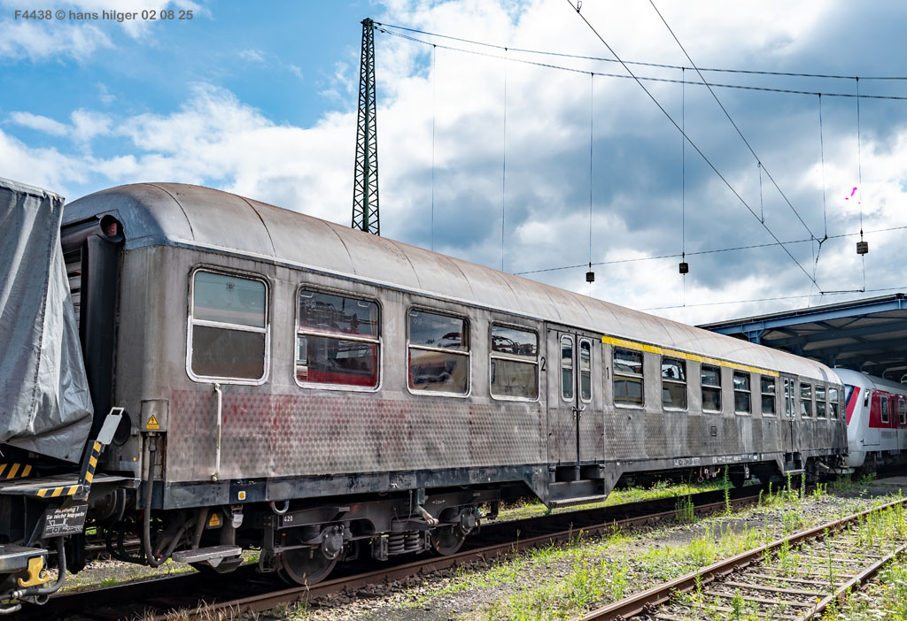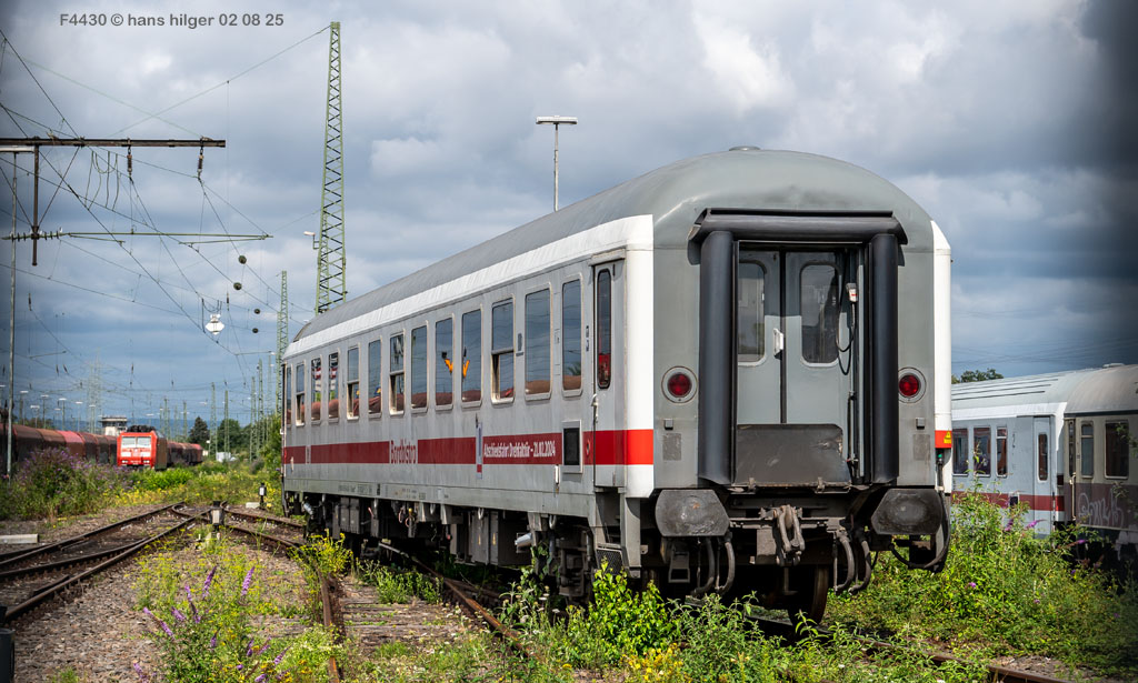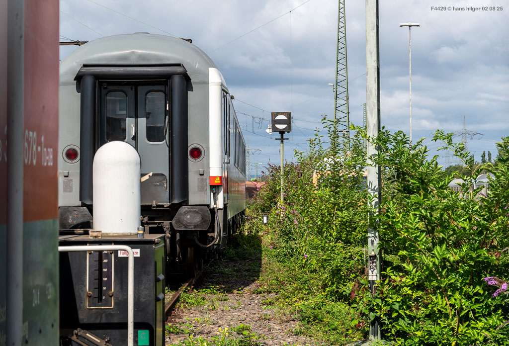 <181> Hier zum Beispiel: Da steht was hinter dem Busch. Und das sieht verdammt nach dem 614 005 aus, der sich dort versteckt, oder der dort versteckt gehalten wird. Wir vermuten also ein Fahrzeug, das nicht sichtbar ist . . . Kein anderes mir bekanntes Fahrzeug sieht SO aus, ich bleibe bei 614 005<182> Da muß auf jeden Fall 140 128 = E40 128 erwähnt werden, die in alter Farbe betriebsfähig ist für das Museum und oft Überführungen macht. Wie hier mit 212 372, V160 067 und E44 002. Für 212 372 gilt ähnlich: Auch sie war im August 25 nicht anzutreffen<183> V160 067 alias 216 067, mustergültig optisch hergerichtet mit alter Nummer, im Sommer 25 nicht anzutreffen<184> Sie war im August 25 nur aus weiter Entfernung im Abstellbereich in Lützel auszumachen = 103 235, siehe Bild 119<185> Sie hier war am Tag des Rundgangs nicht anwesend, weil sie mit einem aktuellen Sonderzug unterwegs war auf großer Fahrt. Hier sehen wir sie noch als DB-Betriebslok des Bw München 1, die gelegentliche Bewegungsfahrten machte und ansonsten als Reserve zur Verfügung stand. Sie wird gleich aufbrechen in Tagesrandlage mit einem Kurz-IC nach Salzburg. Es ist die 103 mit der höchsten Ordnungsnummer = 245 > Im Museum Koblenz befinden sich also die ERSTE 103 (103 001) und die LETZTE 103 (103 245)<186> 111 040, hier noch als Heizlok in Düsseldorf, im August weit hinten im Abstellbereich von Lützel (siehe Bild 119). Ob sie tatsächlich Museumsbestand ist, ist unklar, vorrangig war sie Ersatzteilspender für die 001<187> Auch sie gehört zum Bestand, war aber nicht zu finden = 120 101<188> Auch sie gehört eigentlich zum Bestand = 181 001, hier im Museum des Sommers 2004<189> Auch sie hier: 181 201 in altblau, die seinerzeit getauscht worden war gegen die 206, müßte irgendwo sein<190> Hier sehen wir den Et 430 414 im Museum Lützel. ABER: Der Triebzug war derart marode, daß er im Ganzen nicht zu retten war und wurde im Museum teilweise verschrottet, nur dieser Kopf 414 ist in schlechtem Zustand übergeblieben und heute in Horb untergebracht. Sowas gehört zu einem überfüllten Museum leider dazu, daß man sich ggfs auch mal von etwas wieder trennen muß, wenn die Umstände es erfordern und die Unterhaltung zum Faß ohne Boden wird<191> Die Mehrsystemlok 184 003, für eine kurze Zeit noch als E410 003 ausgeliefert, auch sie ist wohl auf Bild 119 erkennbar<192> Auch diese beiden waren einige Zeit im Museum, der Verbleib ist mir unbekannt<193> Auch sie sollte in Lützel sein = 217 014, hier mit 225 094 im Januar 2006 in Mühldorf<194> Sie gehört sicher zum Museum und ist sogar betriebsfähig: 218 137. Wo ist sie?<195> Auch sie gehört zu Lützel, sie steht noch weit hinter Bild 119 versteckt<196> Auch von dieser Baureihe sollte einer erhalten sein in Lützel: BR 610. Selbst 610 001 wurde sang- und klanglos zerlegt beim Steil in Ehrang, das ist gar nicht so weit von Koblenz entfernt und führt wahrscheinlich sogar an Lützel vorbei. Auch diese Fahrzeuge hier, gesehen mit 155 196 in Duisburg-Rumeln, sind in Lützel vorbeigekommen auf dem Weg nach Ehrang zum Schrott. Und dabei fiel auf:<197> Dies ist der 610 002/502. Ohne erkennbare Schäden, sogar ohne Grafitti. Er ist (scheinbar) in einem besseren Zustand als der in Koblenz schonmal zu sehende 610 010, der wohl zum Museumsbestand gehört, aber versteckt wird. Hätte man da nicht tauschen können?<198> Und beispielhaft für viele Wagen, die zeitweilig im Museum waren und wieder abgegeben oder anderweitig genutzt wurden, sollen diese beiden hier stehen, geknipst im Sommer 2004 = Hier der “99 164 Köln”<199> Und hier der “30 088 Köln” AB4ymg (soweit lesbar)