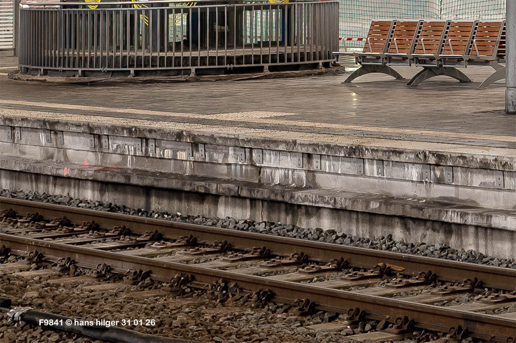 <167> Zustand am 3. Januar 24 mit 4185 142 von Eiffage<168> Weitere Dachverstrebungen werden eingebaut und verschraubt<168> Panorama aus südlicher Richtung: Im Gegensatz zum ersten neugebauten Bahnsteig (rechts) wird hier eine provisorische Zwischendecke eingebaut, von der aus das Dach aufgebaut werden soll<169> Mal ein schönes Bagger-Portrait und gleichzeitig die Dokumentation des Aufbaus einer Bahnsteigkante: Neben dem Gleis sind Kanten-Grundsteine versenkt (die hier nicht sichtbar sind), darauf stehen die eigentlichen Bahnsteigkanten aus Beton-Fertigteilen, die wir von vorn und hinten sehen. Danach werden die Fugen verfüllt mit Dichtmasse, dann kann der Innenraum verfüllt werden und zum Schluß kommen Pflastersteine als Deckschicht über der Fläche und spezielle (genippte) Kantensteine an den Rand<170> Das tägliche Nebeneinander von regulärem Betrieb und Baustelle mit allem Lärm und Dreck – nicht immer schön, aber unvermeidbar<171> Zustand am 8. Januar 24 = Die Zwischendecke wird komplett durchgezogen und scheint am Dach aufgehängt<172> Von der anderen seite gesehen (von Gleis 12)<173> Und wenn ich dieses Bild richtig interpretiere, dann ist die Zwischendecke tatsächlich am Dach aufgehängt – was mich etwas erstaunt<174> Und noch ein Erstaunen: Da ist wirklich eine Schweißnaht zu finden, wo doch verkündet worden war, alles sei verschraubt<175> Es dürfte sich um die Stellen aus Bild 158 handeln, also um den großen Dachbogen<176> Änderungen bis zum 28. Januar 24: Die Zwischendecke ist fertig unter der gesamten Dachlänge und auf den ersten Boden aus südlicher Richtung liegen die ersten Dachlamellen<177> Zustand am 28. Januar 24. In Bildmitte gut zu sehen: Einer der alten Hauptträger des Daches von 1934. Er ist mit seine Kollegen nur deshalb noch stehengeblieben, damit er das Gitter halten kann, mit dem die Reisenden auf Gleis 12 von grobem Dreck geschützt werden sollen (Kein Scherz!)<178> Und was sehen wir hier? Nun, natürlich die genaue Lage des alten Posttunnels! ABER nur deshalb, weil wir genau wissen, wonach wir suchen müssen, sonst wäre er nicht mehr zu sehen und schichtweg vergessen. Wir suchen nach der Beton-Bahnsteigkante, die NICHT aus den üblichen Formsteinen besteht und hier durch die etwas dunklere Farbe auffällt. Demnächst wird er komplett verschwunden sein, der “Posttunnel II”<179> Der neue Bahnsteig 10/11 entsteht<180> 6. Februar 23: Jetzt liegen auch auf dem ersten Bogen nördlich die losen Dachlamellen, auf dem Mittelbogen noch nicht<181> Eine weitere Detailaufnahme zum Thema “Wir basteln eine Bahnsteigkante”. Das Prozedere ist ja weiter oben bereits erläuert, hier ein fotografischer Beweis der Arbeitsschritte und der Formsteine, die wir (mal wieder) von vorn UND hinten sehen<182> Das Gesamt-Panorama Süd. Weiteres Dachmaterial ist auf den Dachlamellen gelagert, aber so wirklich geht es derzeit nicht vorwärts . . .<183> Wie beim Bild 178 ist auch hier ein Posttunnel versteckt, der Tunnel I. Wenn jetzt in Kürze der ansonsten fertige Bahnsteig aufgeschüttet ist, wird er nicht mehr zu sehen sein, deshalb letztmals ein Bild mit Wiedererkennungswert durch die Masten und das Bahnhofsschild<184> Dies fällt auf: Auch am neuen Bahnsteig 10/11 werden wohl im Bereich des Haupttunnels die ganz alten Bahnsteigkanten von 1934 aus irgendwelchen Gründen erhalten (wie schon bein Bahnsteig 12/13)<185> Auf den ersten Blick erinnert diese Teleaufnahme die Situation an ein halbes, im Trockendock liegendes Schiff . . . es ist aber das neue Dach vom Bahnsteig 10/11 von der Nordseite gesehen, das teilweise geschlossen ist und wie im Süden nun als Lagerfläche für Baumaterialien genutzt wird<186> Am 19. Februar 24: Nun tragen Arbeiter offenbar Isoliermaterial auf und eine Deckfolie<187> Während unten eine Menge neuer Dach-Lamellen angeliefert werden. Und dabei kommt eine ganz “neue” Lok zum Einsatz . . .<188> Es ist die 293 006, und damit eine der von ADtranz modernisierten Ost-V100, bei denen der Spenderrahmen leider nicht bekannt ist. Hingegen sehr bekannt ist, was der Name “Aliyah” der Lokomotive bedeutet (siehe den blauen Link)!<189> Und dies fiel heute auf: Es war zwar schon vermutet worden, ließ sich heute an Gleis 10 aber festhalten = Im Bereich des Haupttunnels wird tatsächlich die uralte Bahnsteigkante von 1934 erhalten und NICHT neu gemacht! Dazu wird es bestimmt gewichtige Gründe geben; Möglicherweise wäre die Statik der Tunneldecke gefährdet, wenn diese alte Kante entfernt würde, wir wissen es (noch) nicht<190> Aber das wissen wir: Auch am schon neu gemachten Bahnsteig 12/13 wurde im Bereich des Haupttunnels die alte Bahnsteigkante weiterverwendet, sie wurde nur etwas verändert bzw aufgehübscht. Wir sehen links die Kante im Ursprungszustand an Gleis 11 und rechts die leicht modifizierte, aber uralte Kante von Gleis 12, ganz vorne ein Stück der neuen Kanten-Formsteine aus Beton<191> Auf diesem Bild vom 07. März 24 sehen wir, daß die alte Bahnsteigkante abgedeckt ist, weil sie darunter (wie oben an Gleis 12 gesehen) verändert, also modifiziert wurde – Aber es ist noch die urlate originale Bahnsteigkante vom Baujahr 1934. Zudem sehen wir, daß der neue (aber alte) Aufzug wieder freigelegt ist und daß der Bahnsteig 10/11 weitgehend fertig ist<192> Wieder sehen wir die alte Kante, die nur im Bereich des Haupttunnels so verblieben ist, davor und dahinter wurde eine gänzlich neue Kante gesetzt. Zudem sehen wir, daß die Zwischendecke, von der aus das Dach montiert wurde, zur Zeit wieder abgebaut wird; Übrig bleiben die grauen Stahlelemente = Das sind die späteren Beleuchtungseinheiten des Bahnsteigs. Zusätzlich erkennen wir, daß das Dach nun auch innen verkleidet ist<193> In diesem Bereich ist die Zwischendecke bereits wieder weg, wir sehen den fertigen Abgang zum Haupttunnel<194> Im südlichen Bereich um den Großkran herum ist die Zwischendecke allerdings noch vorhanden und wird noch genutzt<195> Und hier sehen wi