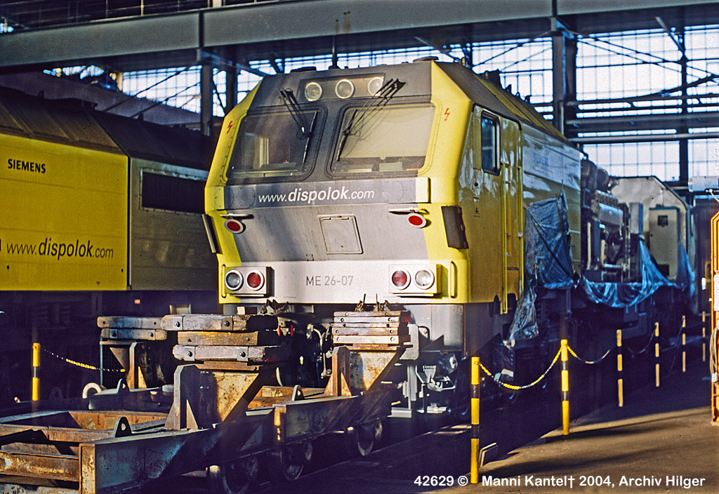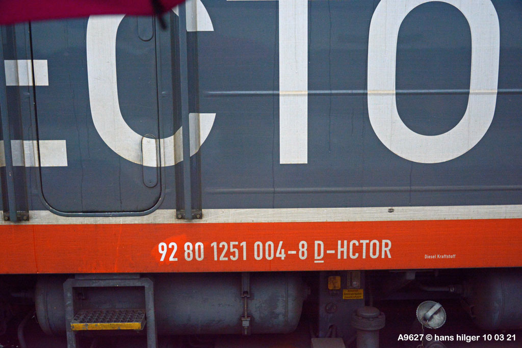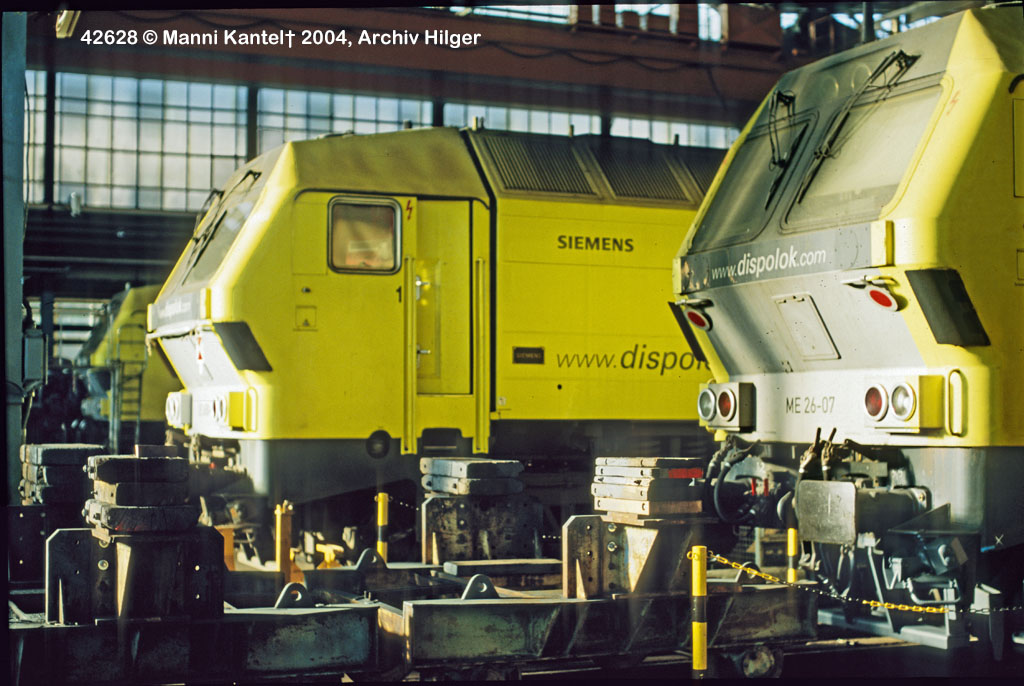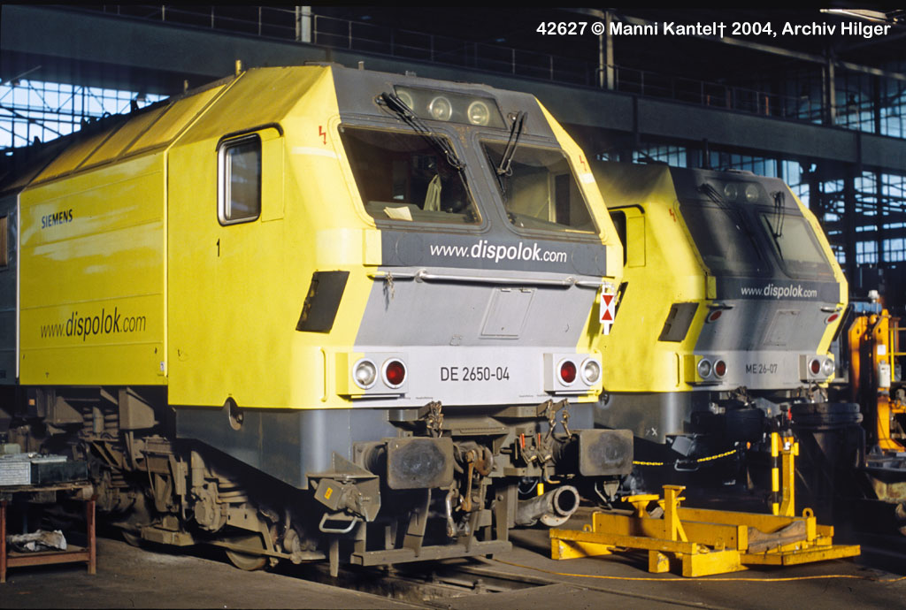 <34> Kommen wir zur 04. Von ihr liegt eine besonders frühe Aufnahme vor, die aus dem Jahre 2004 stammt. Bildautor war damals der leider schon verstorbene Manni Kantel†, der mir die Dias überlassen hat zu Lebzeiten. Seit 2004 tragen die Loks das bekannte blau/weiße Kleid, DIESE gelb/silberne Farbgebung war diejenige des Siemens- Dispolok- Pools. Wir sehen zudem, daß die beiden Loks hier völlig unterschiedlich bezeichnet sind: Die 04 ist als “DE 2650-04” beschrieben, die 07 neben ihr als “ME 26-07”. Später hat sich für alle die Bezeichnung DE 2700 durchgesetzt<35> Und hier sehen wir, daß zu dieser Zeit sogar mindestens vier 251 in Neustrelitz waren (drei auf diesem Bild und eine stand noch vor der Halle, siehe weiter unten). Also dürfte auf diesen Bildern der Umbau für die Marschbahn dokumentiert sein, verlassen haben alle das Werk in Blau/weiß<36> In dieser Version war die 04 lange Zeit im Inselverkehr, hier kreuzt sie mit der 06 in Keitum, beide noch als NOB- Loks beschriftet<37> Aber die 04 war auch mehrfach an andere Bahnen vermietet, so 2016 zum Beispiel an die NIAG aus Moers, wo sie vorübergehend die Nummer “10” bekam, aber ihre NVR- Nummer 251 004 natürlich behielt. Und so kam es, daß ich eine “Syltlok” faszinierenderweise auch vor meiner Haustür knipsen konnte, wir sehen sie an der Lotharstraße neben der Duisburger Uni!<38> Und noch später ging die 04 an eine ganz andere Gesellschaft, nämlich an HectroRail Deutschland, und dort bekam sie die interne Nummer “861.003 Popeye”. Und genau diese HC- Lok kehrte 2021 für ein paar Wochen wieder zurück in ihre alte Heimat als Leihlok<39> Hier der Beweis, daß es sich weiterhin um die 04 der Reihe 251/ DE 2700 handelt<40> Hier sehen wir sie mit einem Sonderzug im Regen bei der Ausfahrt aus Westerland, allerdings war dies die Rangierfahrt einer angekommenen Leistung, keine richtige Ausfahrt<41> Denn die “richtige” Ausfahrt des Sonderzuges sehen wir hier, zwei Tage später. Die Lok dürfte aktuell (2025/11) noch immer so aussehen, aber vorübergehend nicht mehr im Einsatz stehen, da HectrorRail gerade dabei ist, die ihr noch verbliebenen 4 Loks dieser Reihe weiterzuverkaufen, davon werden wir sicherlich noch hören bzw. lesen