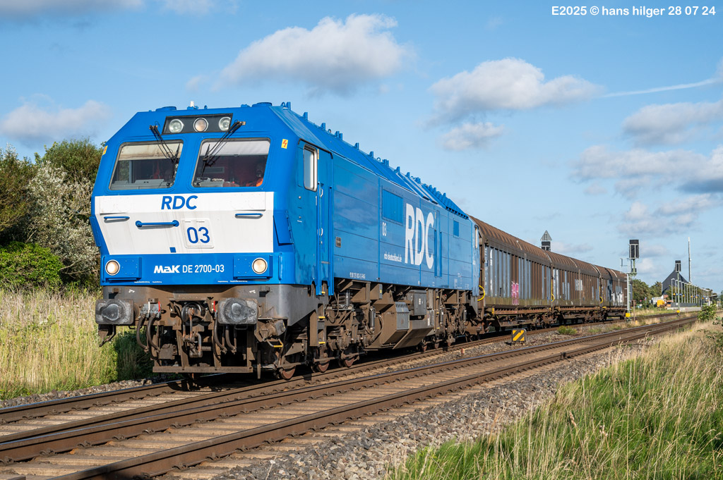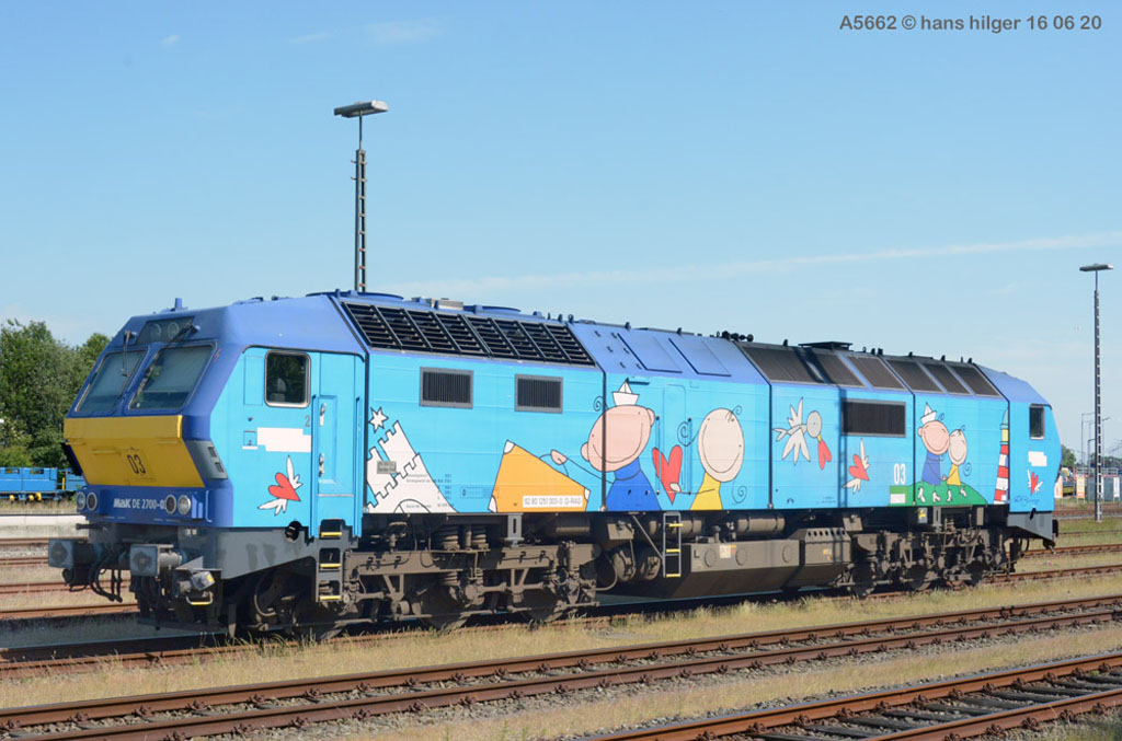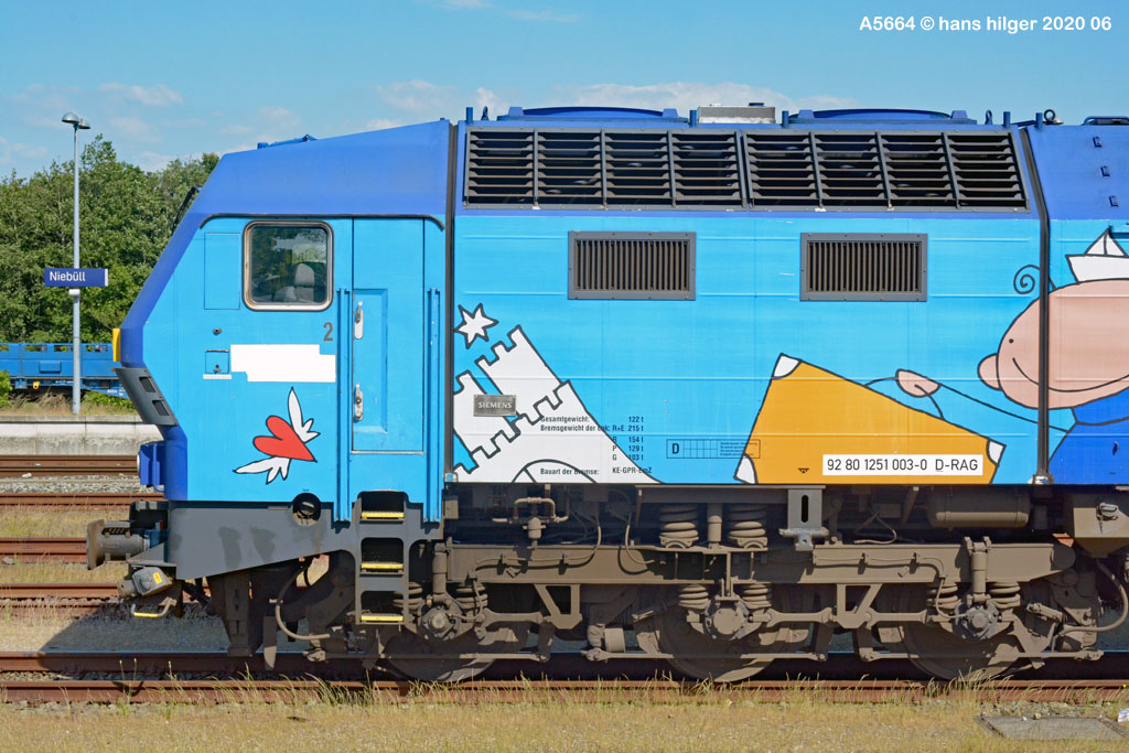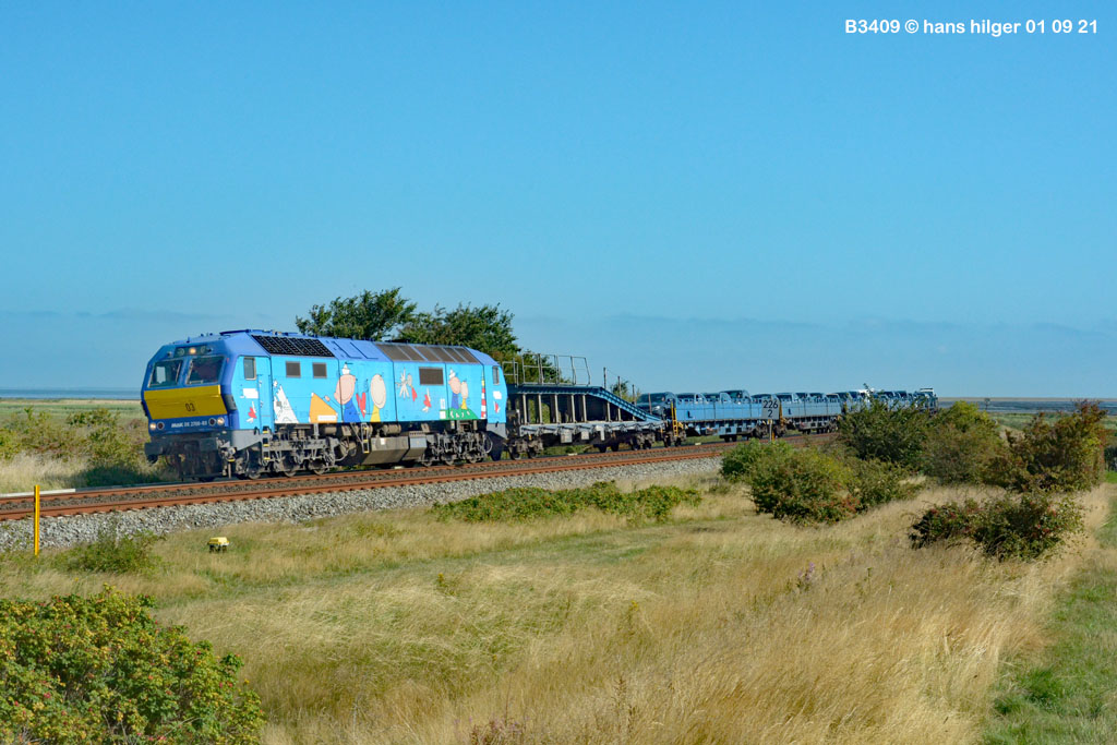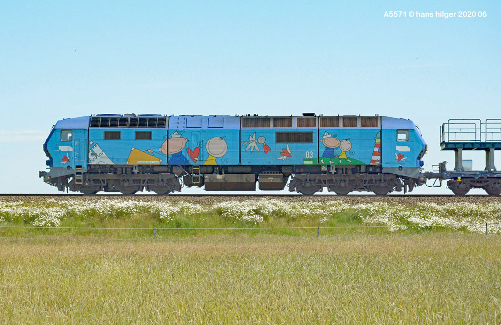 <21> Die Vorstellung der 03 fange ich mal nicht an mit der ältesten Aufnahme, sondern mit einem korrekten Portrait, das deshalb Sinn macht, weil die Lok zwei unterschiedliche Seiten hat. Hier sehen wir die Lok mkit dem Führerstand I nach vorne, also die rechte Lokseite, und die hat die Grundfarbe Blau, darauf einige sehr schöne KIndergrafiken, daher war dies die “Kinderlok”<22> Wir sehen vorne rechts an der Lok sogar den Künstler, der die Lok 2005 so schön aufgehübscht hat: Frank Bürmann. Auf dem hier sichtbaren weißen Feld hingen vorher die NOB- Aufkleber der Nord- Ostsee- Bahn<23> Die Lok von hinten, aber immer noch die rechte Lokseite<24> Und natürlich die korrekte Nummer, wobei “RAG” für RDV Asset GmbH Hamburg steht, zudem sehen wir, daß die Lok nur in D zugelassen ist = Das Länderraster ist komplett leer<25> Und der Vollständigkeit halber zeige ich natürlich auch die linke Lokseite, die hat die Grundfarbe Gelb<26> So weiß man also genau, daß auf dieser Aufnahme die Lok vorwärts fährt = FS I vorne, gelbe Seite links<27> Wohingegen die Lok auf dieser Aufnahme mit dem FS II vorne läuft, also quasi rückwärts<28> Und hier hat sie die gelbge Seite wieder links = südlich, wir sehen also, daß die Lok gelegentlich auch anderswo eingesetzt wird als auf der Marschbahn, denn auf jener sind keine Drehfahrten möglich, hier bleiben die Loks immer in derselben Richtung<29> Daher hier mal zwei Bilder der blauen Seite, hier vor Keitum, wo wir nicht nur die schiere Größe der Lok erkennen, sondern die unterschiedlichen Radstände in den Drehgestellen, was sonst nie so deutlich auffällt<30> Hier vor Morsum am Ausgang des Dammes am Fotopunkt- Klassiker<31> Das war meine letzte Aufnahme von ihr im klassischen Kinderlok- Farbkleid, gesehen in Lehnshallig<32> Und dies ist die aktuelle Farbgebung, denn die schöne Lok hat leider die Kindergrafiken verloren bei ihrer HU und ist ebenfalls in den blauen Farbtopf getaucht worden. Sie ist aktuell (2025/11) weiterhin als Reservelok für RDC unterwegs und ist auch dann am Autozug zu finden, wenn eine Vectron mal wieder nach irgendwo verliehen ist, gelegentlich ist sie aber auch selber verliehen und überall anzutreffen, sogar im Ruhrgebiet . . .<33> Ruhrgebiet? AberJA! Wir sehen sie in Duisburg- Wedau, fast 600 Km von Niebüll entfernt. In illustrer Gesellschaft, die unterschiedlicher nicht sein kann: 143 176 von DB- Gebrauchtzug wartet auf Einsätze, 362 526 der privaten Firma Andreas Voll rangiert wild herum und 251 003 sagt mal schnell “Guten Tag” im Auftrag von Spitzke- Gleisbau. Sowas kann zu jeder Zeit überall passieren, daß man eine Marschbahnwumme plötzlich vor die Linse bekommt, man braucht aber etwas Glück dabei