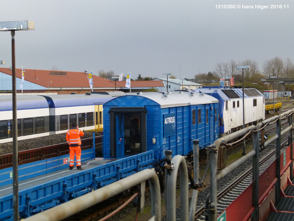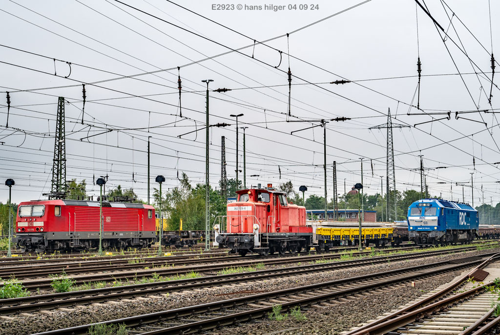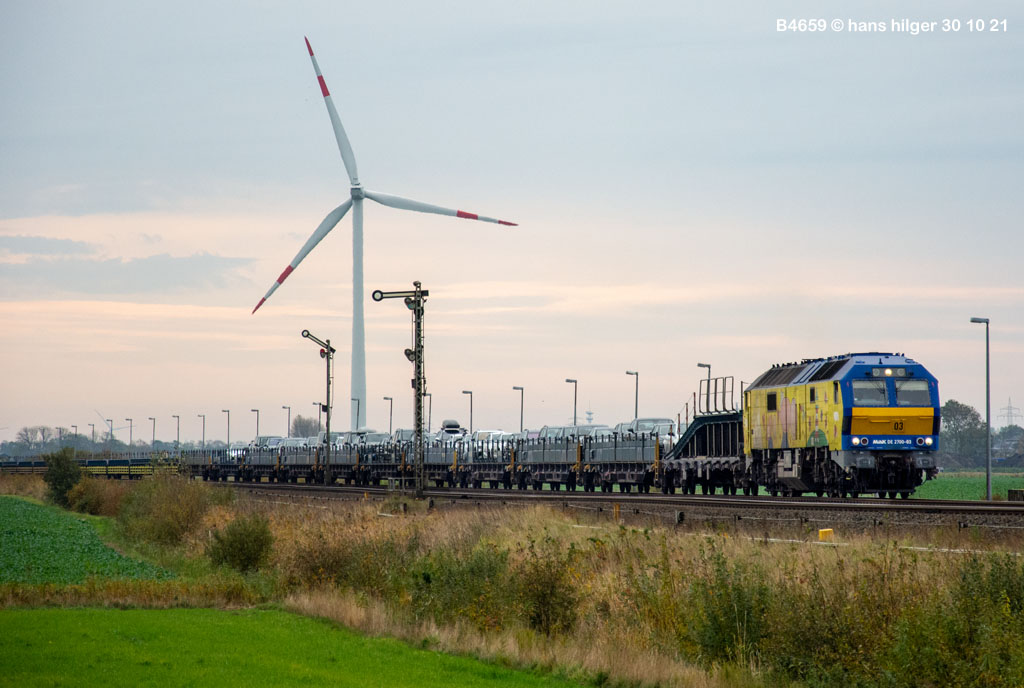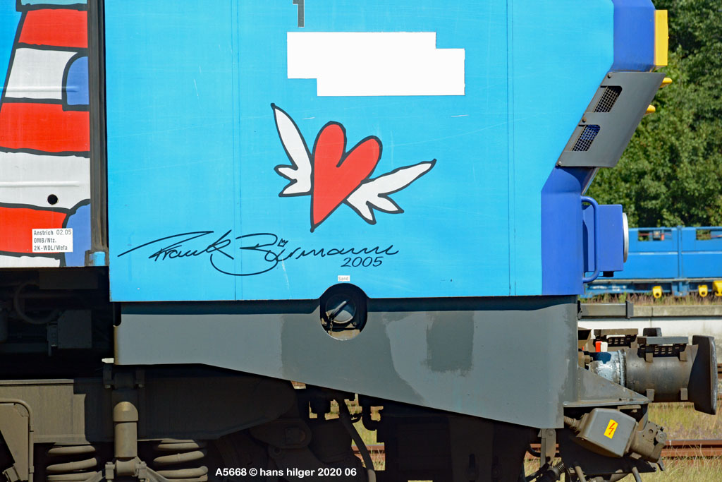 <21> Die Vorstellung der 03 fange ich mal nicht an mit der ältesten Aufnahme, sondern mit einem korrekten Portrait, das deshalb Sinn macht, weil die Lok zwei unterschiedliche Seiten hat. Hier sehen wir die Lok mkit dem Führerstand I nach vorne, also die rechte Lokseite, und die hat die Grundfarbe Blau, darauf einige sehr schöne KIndergrafiken, daher war dies die “Kinderlok”<22> Wir sehen vorne rechts an der Lok sogar den Künstler, der die Lok 2005 so schön aufgehübscht hat: Frank Bürmann. Auf dem hier sichtbaren weißen Feld hingen vorher die NOB- Aufkleber der Nord- Ostsee- Bahn<23> Die Lok von hinten, aber immer noch die rechte Lokseite<24> Und natürlich die korrekte Nummer, wobei “RAG” für RDV Asset GmbH Hamburg steht, zudem sehen wir, daß die Lok nur in D zugelassen ist = Das Länderraster ist komplett leer<25> Und der Vollständigkeit halber zeige ich natürlich auch die linke Lokseite, die hat die Grundfarbe Gelb<26> So weiß man also genau, daß auf dieser Aufnahme die Lok vorwärts fährt = FS I vorne, gelbe Seite links<27> Wohingegen die Lok auf dieser Aufnahme mit dem FS II vorne läuft, also quasi rückwärts<28> Und hier hat sie die gelbge Seite wieder links = südlich, wir sehen also, daß die Lok gelegentlich auch anderswo eingesetzt wird als auf der Marschbahn, denn auf jener sind keine Drehfahrten möglich, hier bleiben die Loks immer in derselben Richtung<29> Daher hier mal zwei Bilder der blauen Seite, hier vor Keitum, wo wir nicht nur die schiere Größe der Lok erkennen, sondern die unterschiedlichen Radstände in den Drehgestellen, was sonst nie so deutlich auffällt<30> Hier vor Morsum am Ausgang des Dammes am Fotopunkt- Klassiker<31> Das war meine letzte Aufnahme von ihr im klassischen Kinderlok- Farbkleid, gesehen in Lehnshallig<32> Und dies ist die aktuelle Farbgebung, denn die schöne Lok hat leider die Kindergrafiken verloren bei ihrer HU und ist ebenfalls in den blauen Farbtopf getaucht worden. Sie ist aktuell (2025/11) weiterhin als Reservelok für RDC unterwegs und ist auch dann am Autozug zu finden, wenn eine Vectron mal wieder nach irgendwo verliehen ist, gelegentlich ist sie aber auch selber verliehen und überall anzutreffen, sogar im Ruhrgebiet . . .<33> Ruhrgebiet? AberJA! Wir sehen sie in Duisburg- Wedau, fast 600 Km von Niebüll entfernt. In illustrer Gesellschaft, die unterschiedlicher nicht sein kann: 143 176 von DB- Gebrauchtzug wartet auf Einsätze, 362 526 der privaten Firma Andreas Voll rangiert wild herum und 251 003 sagt mal schnell “Guten Tag” im Auftrag von Spitzke- Gleisbau. Sowas kann zu jeder Zeit überall passieren, daß man eine Marschbahnwumme plötzlich vor die Linse bekommt, man braucht aber etwas Glück dabei