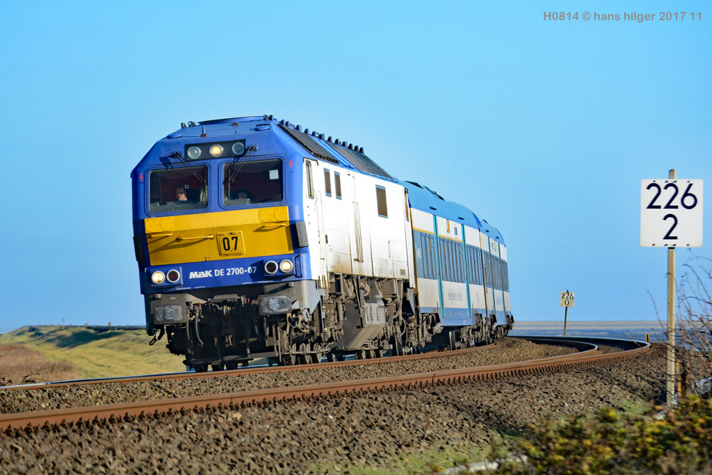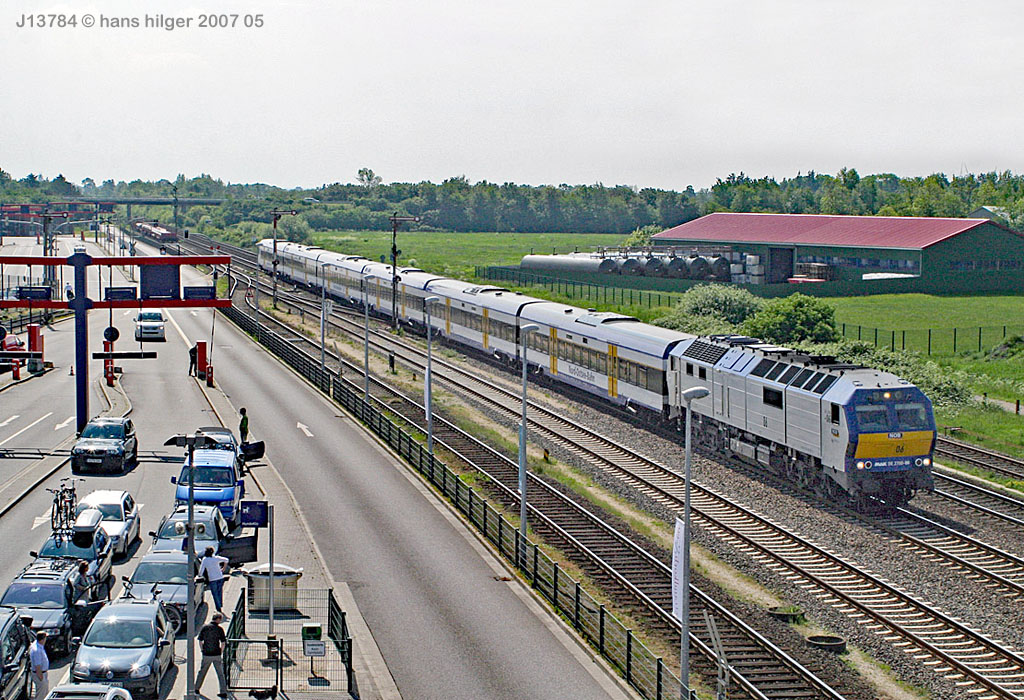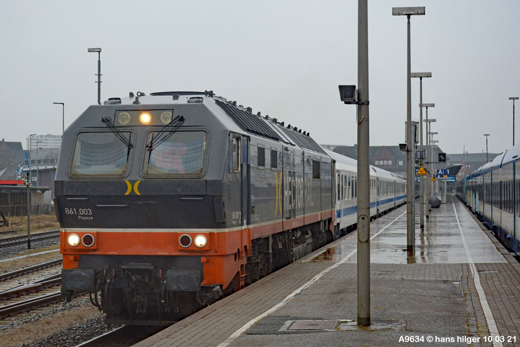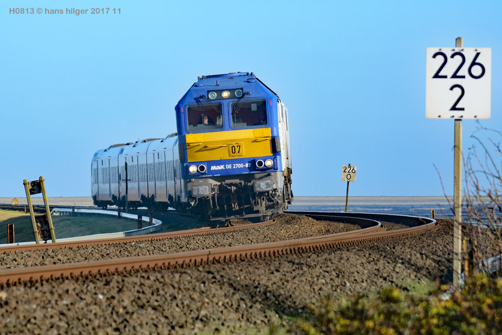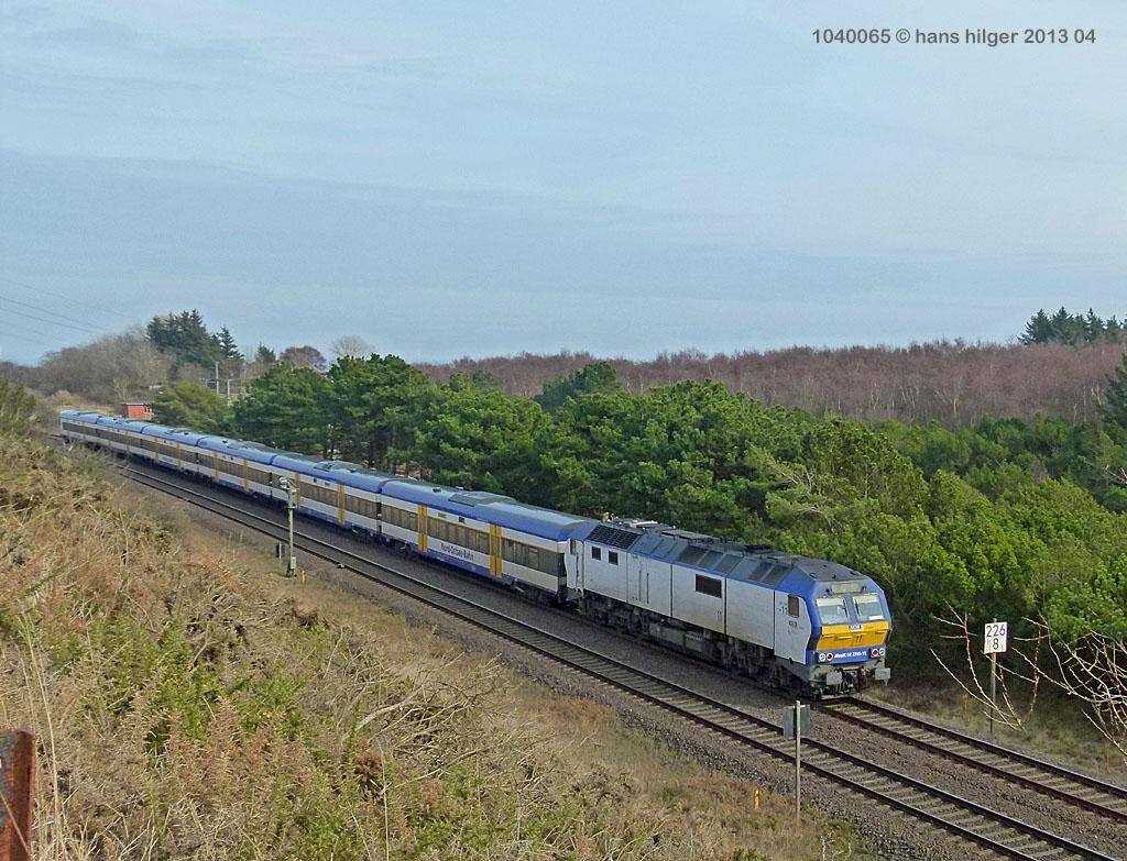 <70> Damit sind wie bei der 011, also der 251 011 oder DE 2700-11, ehemalige ME 26-11 oder NSB 6.671 . . . Die Lok hat also schon viele Nummern getragen. Hier mein öltestes Bild von ihr an einer Stelle in Tinnum, zu der man normalerweise nicht gelangen kann > Es geht nur, wenn im angrenzenden Industriegebiet gerade gebaut wird und dazu der Zaun abgebaut wird, was nicht sehr oft passiert . . .<71> Auch diese Stelle, an der die “Bundesbahn” noch 2007 das Betreten verbietet, ist schwer (aber legal) erreichbar, denn ich bin ja noch VOR dem Sperrschild. Der Zug kommt vom Festland und hat gerade die Insel bei Morsum erreicht<72> Ein paar Jahre später traf ich sie an fast selber Stelle bei einer Kreuzung mit zwei 218<73> Und auch dies ist die Insel Sylt, auch wenn man es als Unkundiger kaum glauben mag (Morsumer Wald)<74> Und nochmals haben wir ein sehr schwer erreichbares Motiv am Einfahrsignal von Keitum aus Richtung Morsum, wo dieser Zug mit der 011 gerade hinfährt. Diese Stelle ist nur erreichbar im Winter bei niedrigem Bewuchs, der ein Aufklettern auf den Bahndamm ermöglicht, was dichtes Dornen- Strauchwerk sonst das ganze Jahr über erfolgreich verhindert<75> Dieses war so ungefähr mein letztes Bild von ihr in diesem Outfit, denn auch sie ging weiter an HectorRail und wurde dort zu einer “001”- Lok = Sie hieß fortan “861.001 Thor” und wurde dunkelgrau wie alle Loks von Hector<76> Aber das Glück meinte es gut mit mir: Als ein weiteres Mal RDC anfragte bei Hector, ob man nochmals eine Leihlok bekommen könnte, kam ausgerechnet die 861.001 auf die Insel, wo ich gerade für einen kleinen Urlaub weilte = Paßt! Und wieder ist es ein schwer erreichbares Motiv unterhalb der Brücke in Morsum . . . das nur erreichbar ist, wenn Brückentechniker gerade Messungen veranstalten und das Tor im Zaun zu dieser Stelle aufgeschlossen haben . . .<77> Diese Stelle aber zwiwchen Keitum und Morsum ist Jedermann zugänglich und zeigt wieder 861.001 = 251 011<78> Auch konnte sie bei herrlichem Fotowetter in Tinnum an bekannter Stelle abgegriffen werden, bevor sie wieder an Hector zurück ging und nun (2025/11) mit zu denen gehört, die wieder einmal den Besitzer wechseln, es gibt das ein Gerücht zum neuen Halter, aber das gehört (noch) nicht hierhin . . .