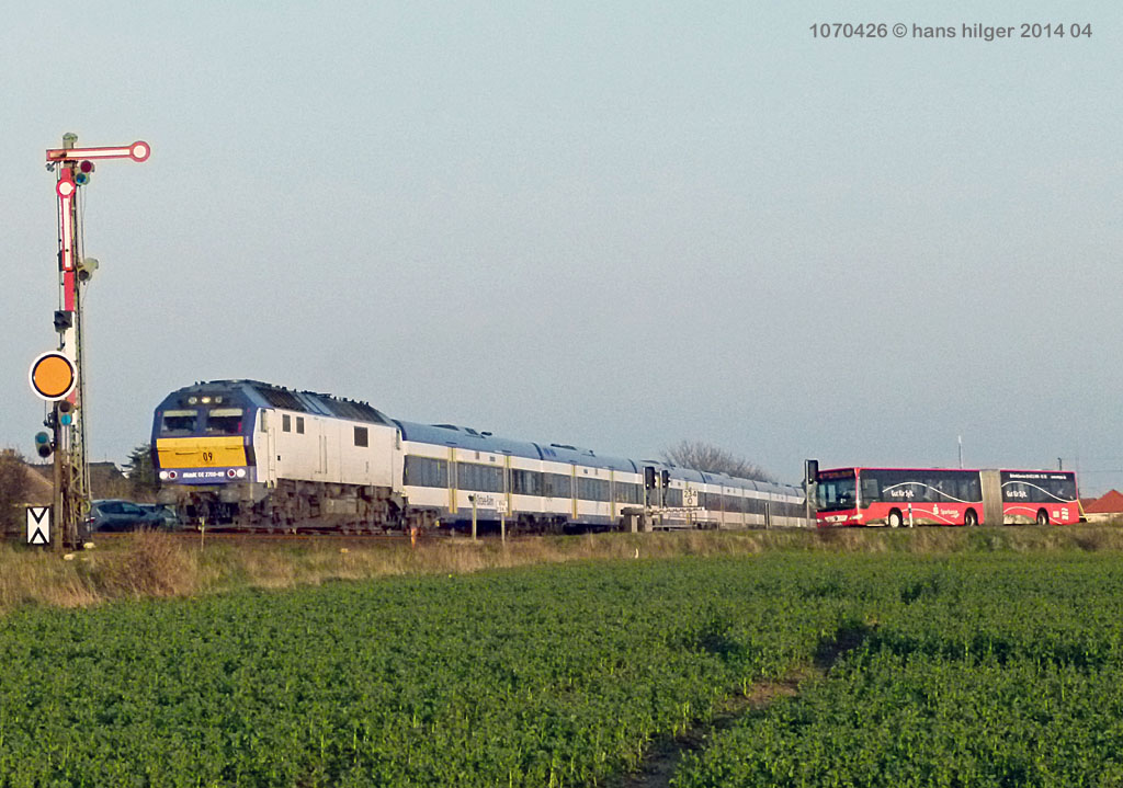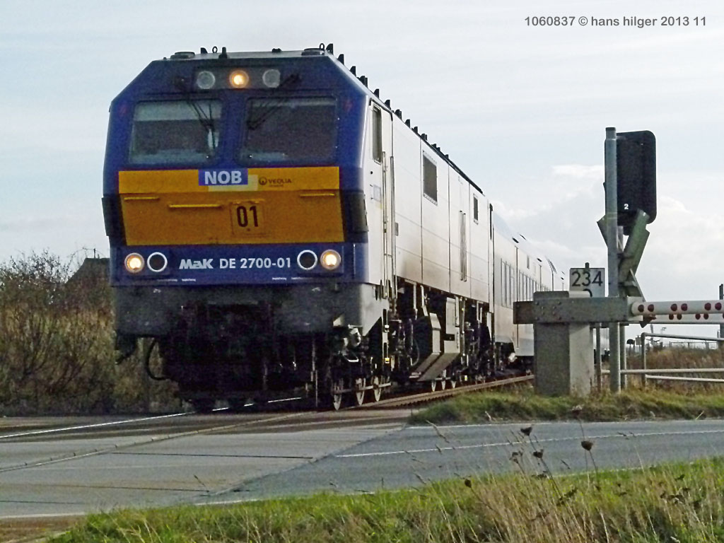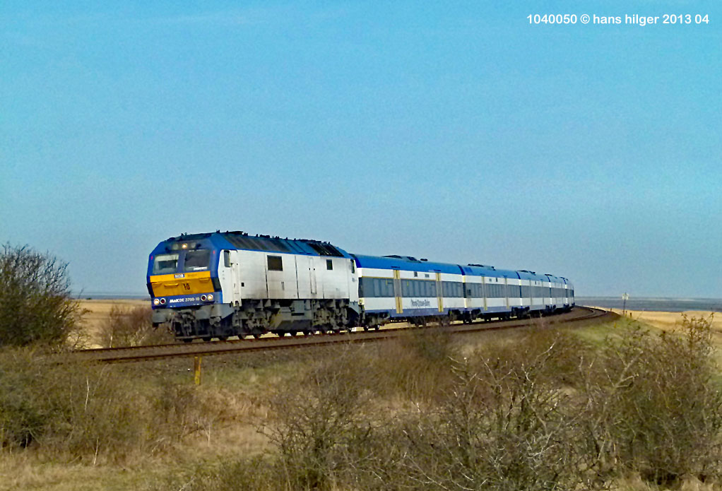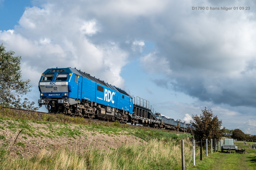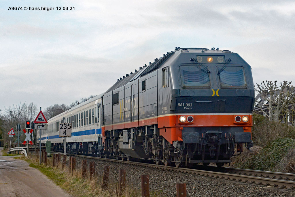 <70> Damit sind wie bei der 011, also der 251 011 oder DE 2700-11, ehemalige ME 26-11 oder NSB 6.671 . . . Die Lok hat also schon viele Nummern getragen. Hier mein öltestes Bild von ihr an einer Stelle in Tinnum, zu der man normalerweise nicht gelangen kann > Es geht nur, wenn im angrenzenden Industriegebiet gerade gebaut wird und dazu der Zaun abgebaut wird, was nicht sehr oft passiert . . .<71> Auch diese Stelle, an der die “Bundesbahn” noch 2007 das Betreten verbietet, ist schwer (aber legal) erreichbar, denn ich bin ja noch VOR dem Sperrschild. Der Zug kommt vom Festland und hat gerade die Insel bei Morsum erreicht<72> Ein paar Jahre später traf ich sie an fast selber Stelle bei einer Kreuzung mit zwei 218<73> Und auch dies ist die Insel Sylt, auch wenn man es als Unkundiger kaum glauben mag (Morsumer Wald)<74> Und nochmals haben wir ein sehr schwer erreichbares Motiv am Einfahrsignal von Keitum aus Richtung Morsum, wo dieser Zug mit der 011 gerade hinfährt. Diese Stelle ist nur erreichbar im Winter bei niedrigem Bewuchs, der ein Aufklettern auf den Bahndamm ermöglicht, was dichtes Dornen- Strauchwerk sonst das ganze Jahr über erfolgreich verhindert<75> Dieses war so ungefähr mein letztes Bild von ihr in diesem Outfit, denn auch sie ging weiter an HectorRail und wurde dort zu einer “001”- Lok = Sie hieß fortan “861.001 Thor” und wurde dunkelgrau wie alle Loks von Hector<76> Aber das Glück meinte es gut mit mir: Als ein weiteres Mal RDC anfragte bei Hector, ob man nochmals eine Leihlok bekommen könnte, kam ausgerechnet die 861.001 auf die Insel, wo ich gerade für einen kleinen Urlaub weilte = Paßt! Und wieder ist es ein schwer erreichbares Motiv unterhalb der Brücke in Morsum . . . das nur erreichbar ist, wenn Brückentechniker gerade Messungen veranstalten und das Tor im Zaun zu dieser Stelle aufgeschlossen haben . . .<77> Diese Stelle aber zwiwchen Keitum und Morsum ist Jedermann zugänglich und zeigt wieder 861.001 = 251 011<78> Auch konnte sie bei herrlichem Fotowetter in Tinnum an bekannter Stelle abgegriffen werden, bevor sie wieder an Hector zurück ging und nun (2025/11) mit zu denen gehört, die wieder einmal den Besitzer wechseln, es gibt das ein Gerücht zum neuen Halter, aber das gehört (noch) nicht hierhin . . .