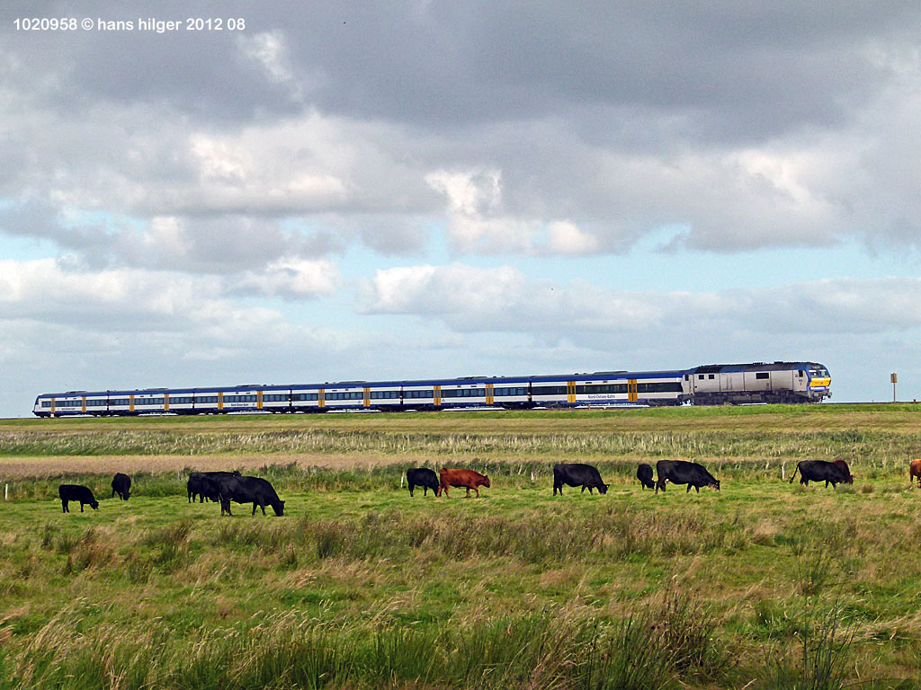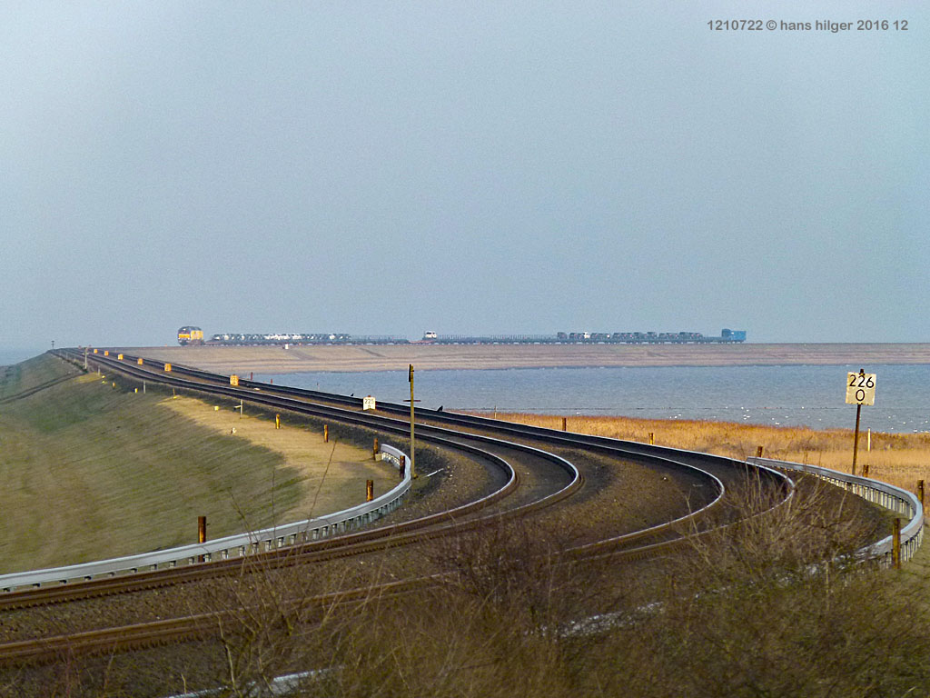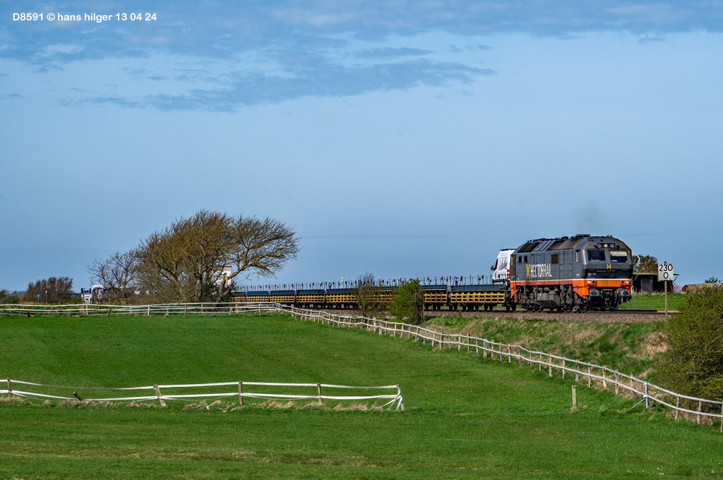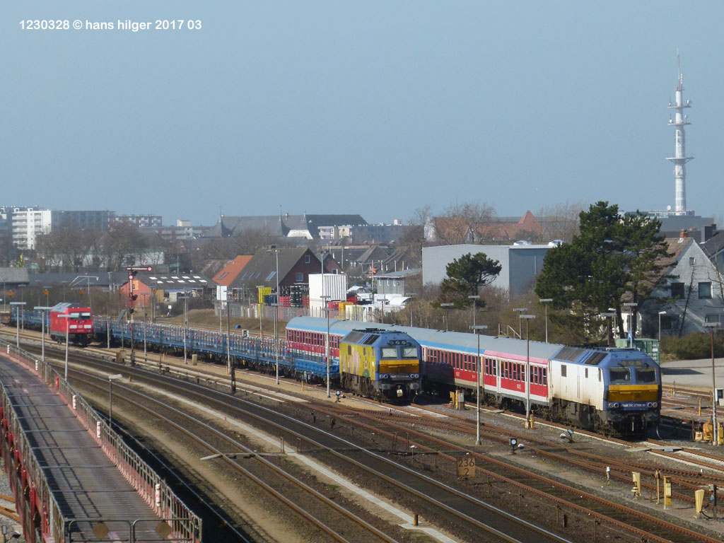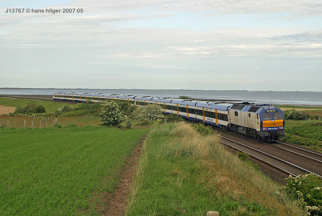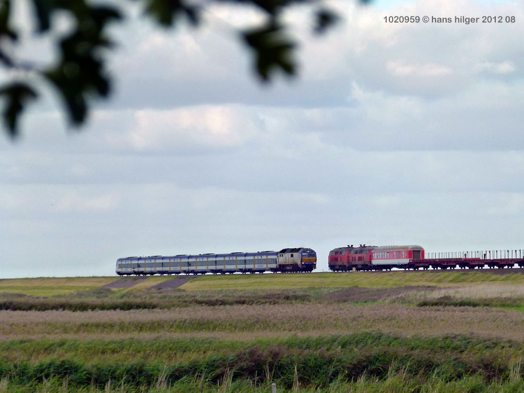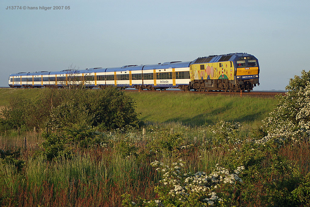 <46> Kommen wir zur 06, hier mein ältestes Bild von ihr am Damm in Morsum<47> Dieses Bild gehört thematisch zum Bild 36 weiter oben und ist kurz vorher entstanden (in Keitum)<48> Und hier sehen wir sie vom Aussichtsturm an der Autoverladung von Niebüll, wie sie gerade aus Hamburg mit einem langen MP- Zug ankommt, der noch bis Westerland weiterfahren wird. Ob die Lok aktuell (2025/11) immer noch fährt, ist mir leider nicht bekannt, denn sie wurde ebenfalls (wie die 01) abgegeben an die HLG Bebra und sollte dort inzwischen Fristablauf haben, wenn sie nicht gemacht wurde, dazu liegen mir aber keine Informationen vor. Sie war zwischenzeitlich bis in die Schweiz vermietet (!) und trug in ihrer ersten Zeit in Norwegen die Schnapsnummer “6.666”, aber das ist lange her . . .