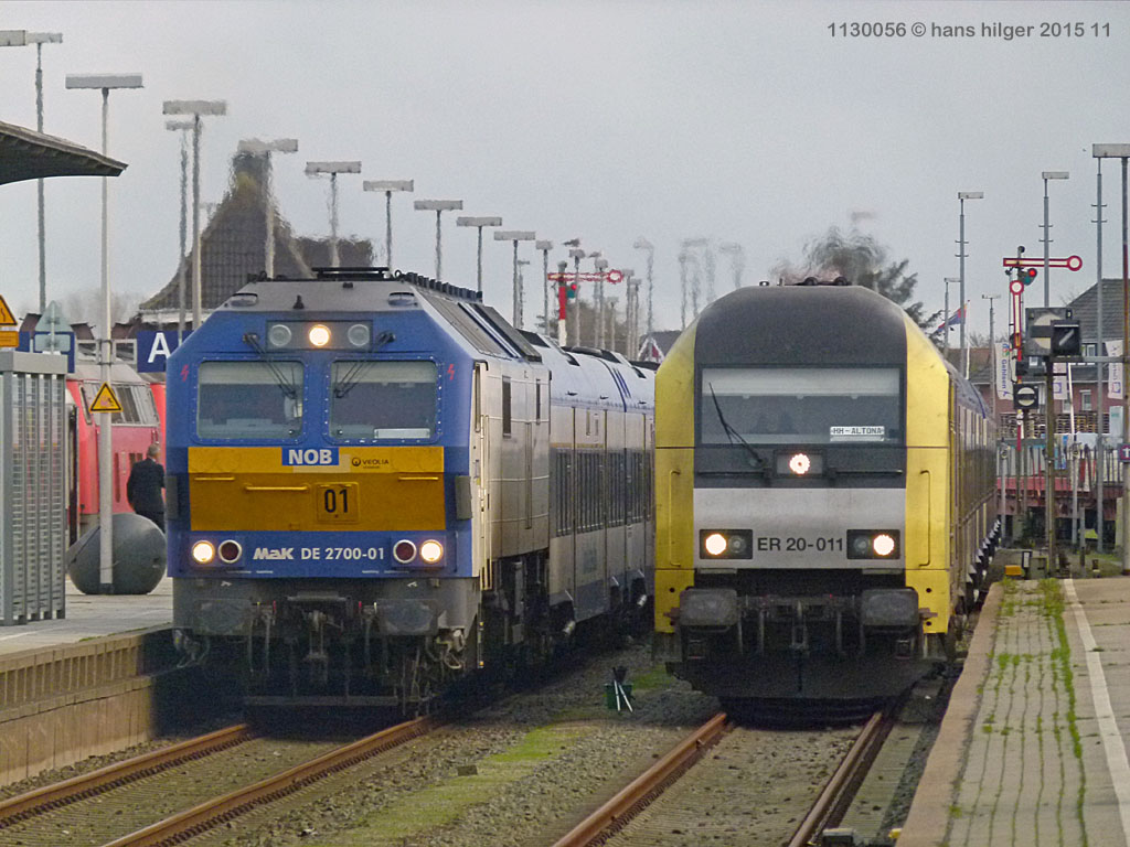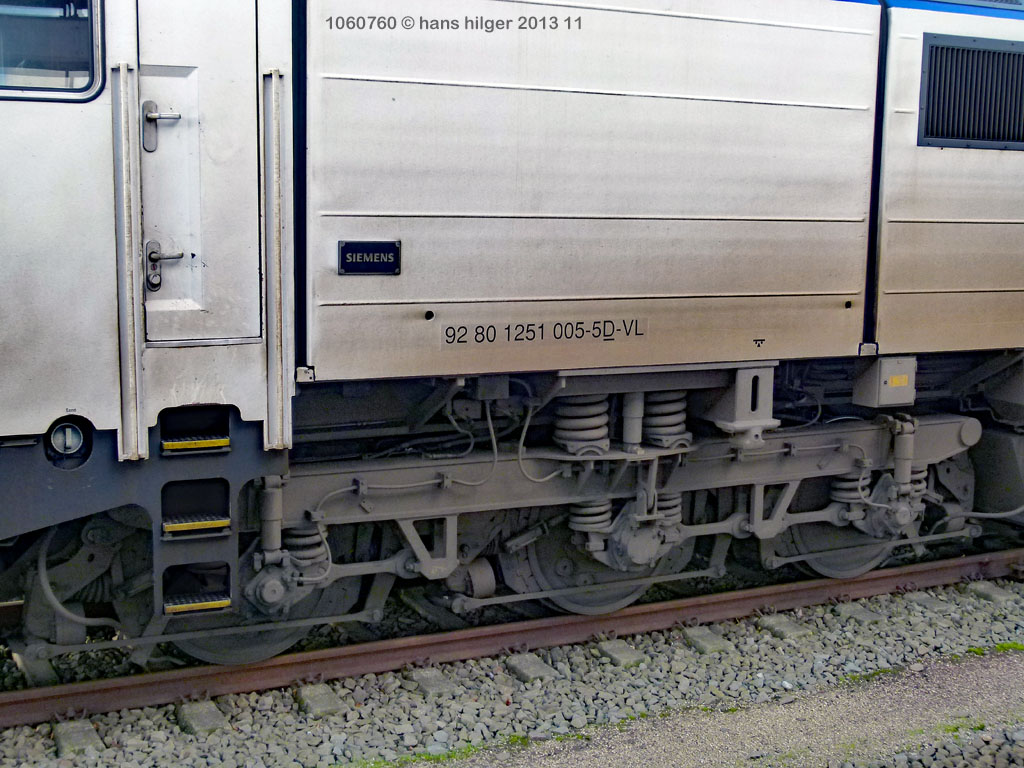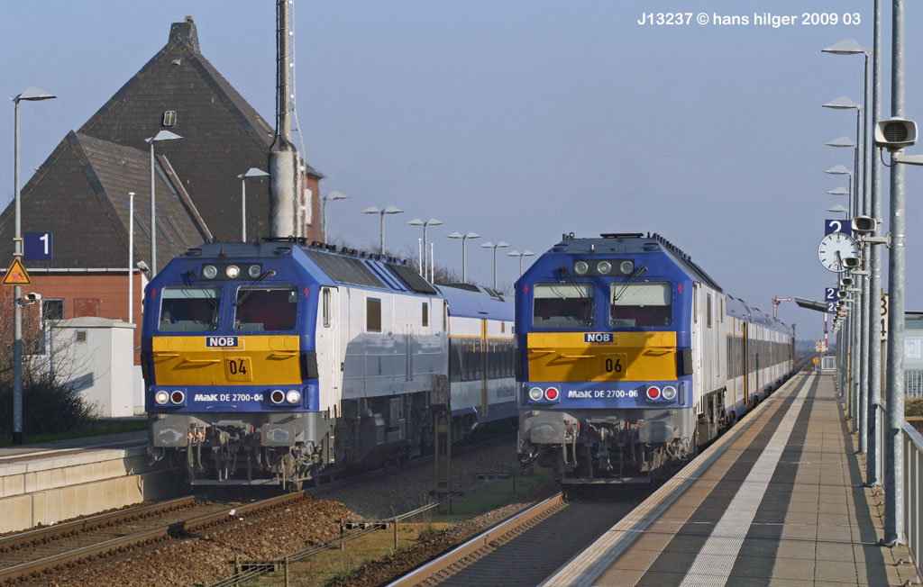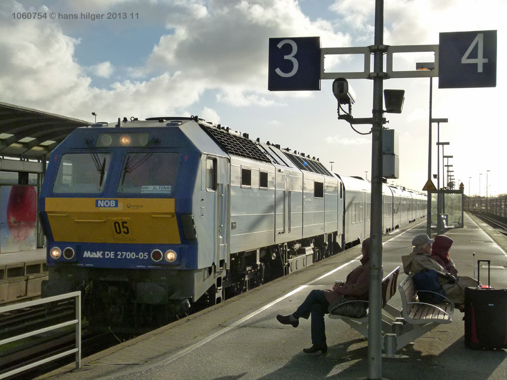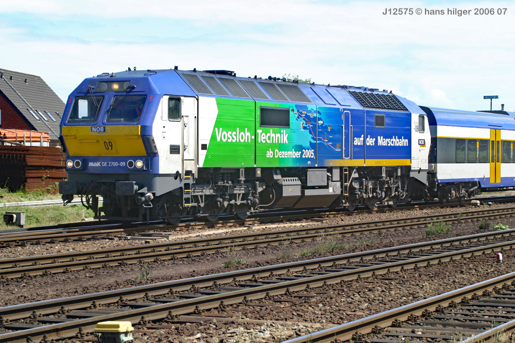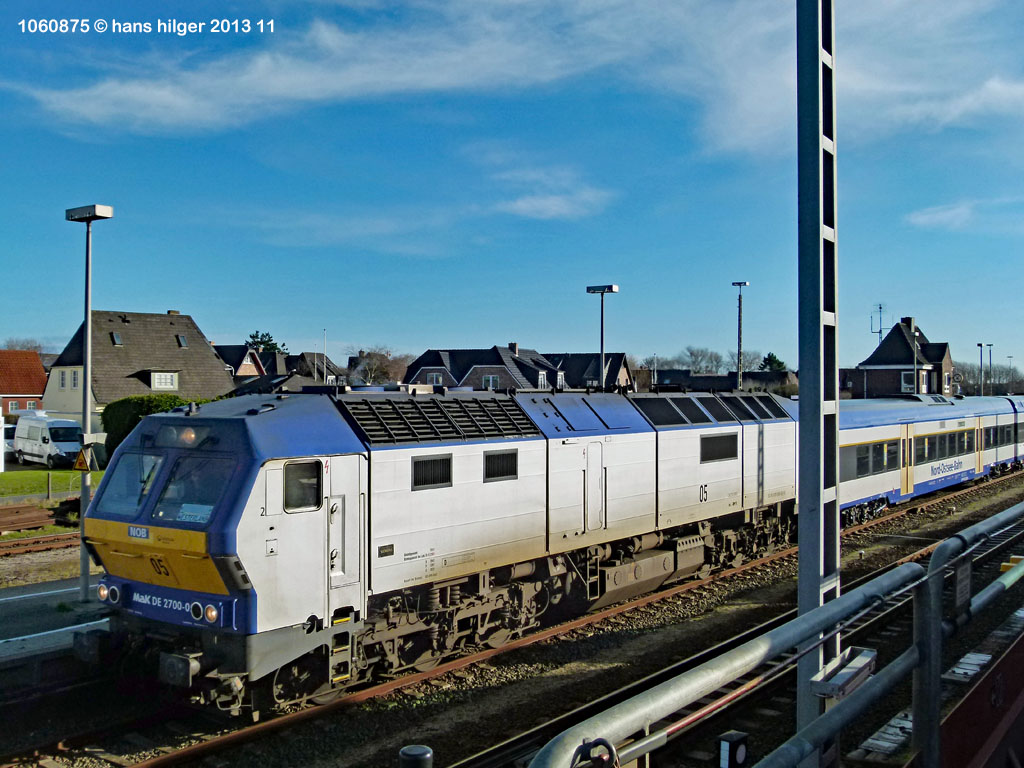 <42> Die 05 sah ich erstmals 2006, hier in Niebüll als Nachschuß, als der Wasserturm noch kein Hotel war wie heute<43> Hier in Westerland am Bahnsteig mit einem typischen Zug nach Altona<44> Mal die NVR- Nummer und das auf den ersten Blick verwirrende “Siemens”- Schild, da die Lok ja gar nicht von Siemens war, sondern von MaK. Allerdings wurde MaK dann von Siemens übernommen und später von Vossloh, noch später vom chinesischen Giganten CRRC, dem wir also in D schon sehr viel näher sind als gemeinhin vermutet. Das “VL” in der Nummer verrät, daß die Lok Vossloh gehört und an die NOB vermietet ist <45> Das war mein bislang letztes Bild von ihr, sie gehört weiterhin Vossloh, steht aber 2025 abgestellt mit Fristablauf und Schäden in Dortmund