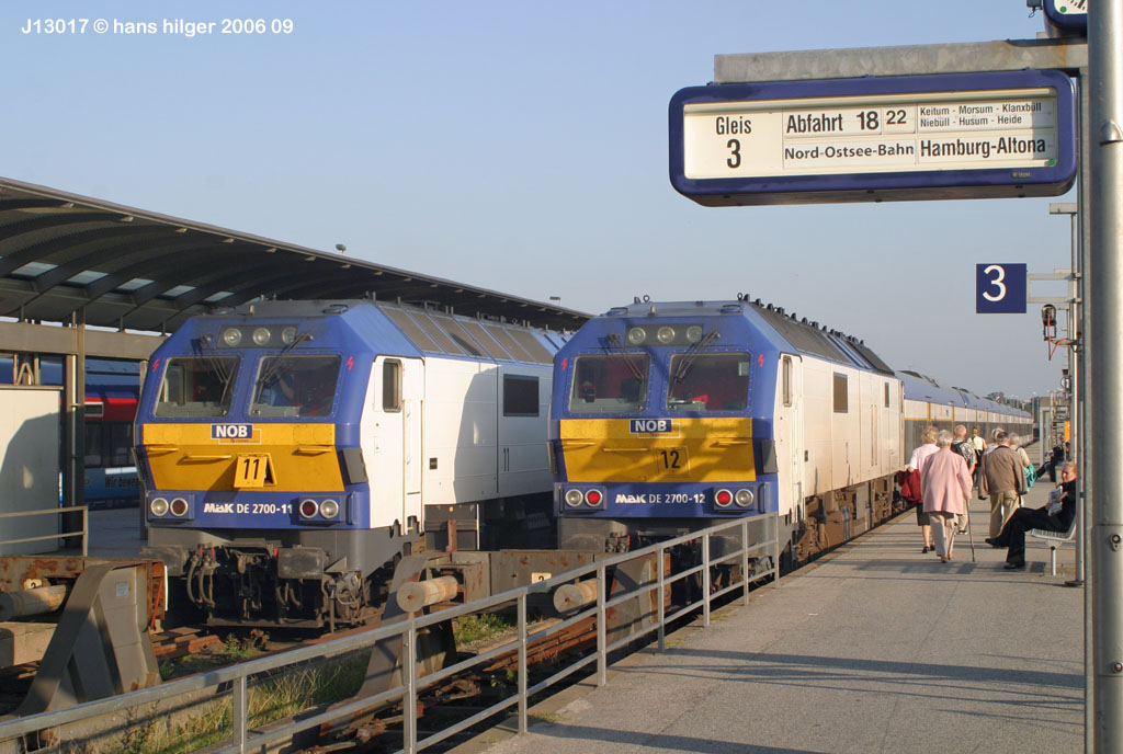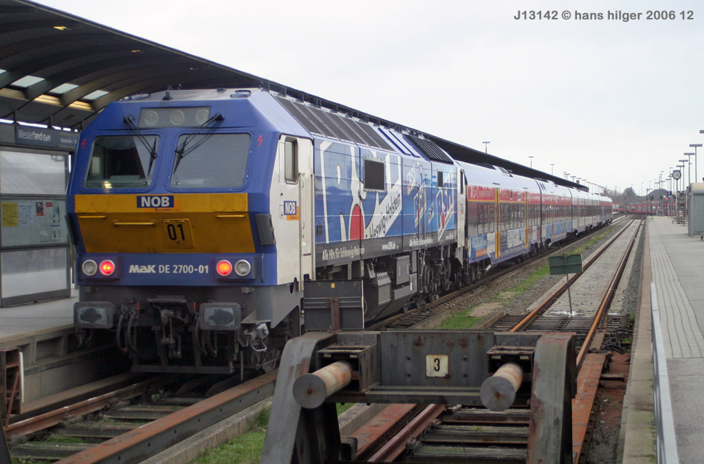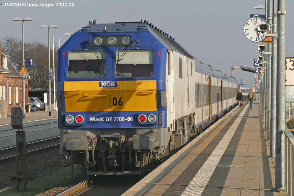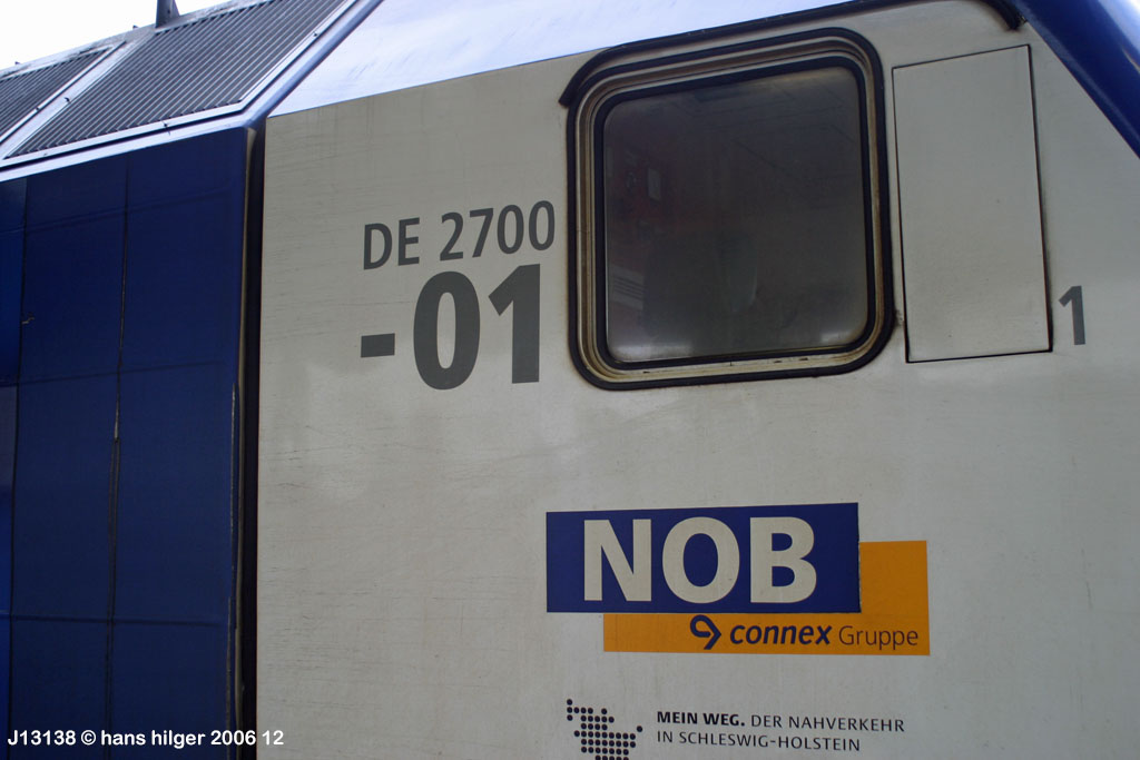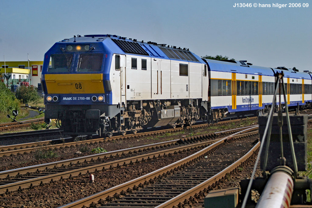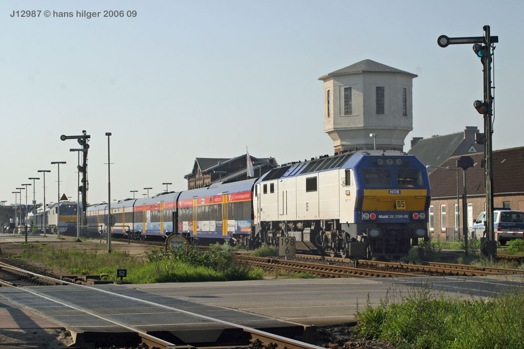 <79> Und dann haben wir den Pechvogel der Reihe der DE 2700, die 012. Hier wieder ein altes Bild aus Neustrelitz aus dem Jahre 2004 (NICHT 2008 wie irrtümlich dransteht!). Auch dies ist ein weitergegebenes Bild von Manni Kantel†, dem Lokführer aus Oberhausen, der durch Werbeauftritte in Rio- Grande- Videos große Bekanntheit erlangt hatte und leider viel zu früh abberufen wurde<80> Ich habe nur dieses eine Bild von ihr, 2006 in Westerland, wo noch alles “gut” war für sie, aber sie hatte früh einen kapitalen Motorschaden und kam danach nicht wieder ans rollen, sondern wurde als Ersatzteilspender für ihre anderen Schwestern verwendet, sie sollte immer noch in Kiel bei Vossloh stehen, aber als leeres Gerippe, neuere Bilder von ihr liegen mir leider nicht vor