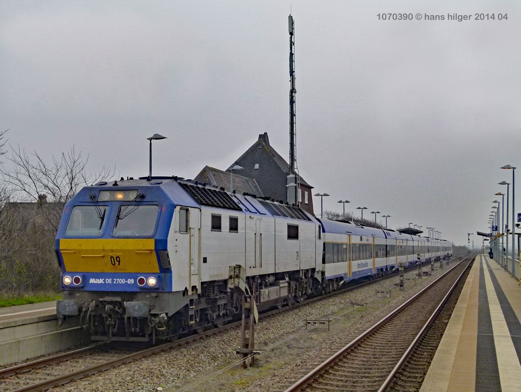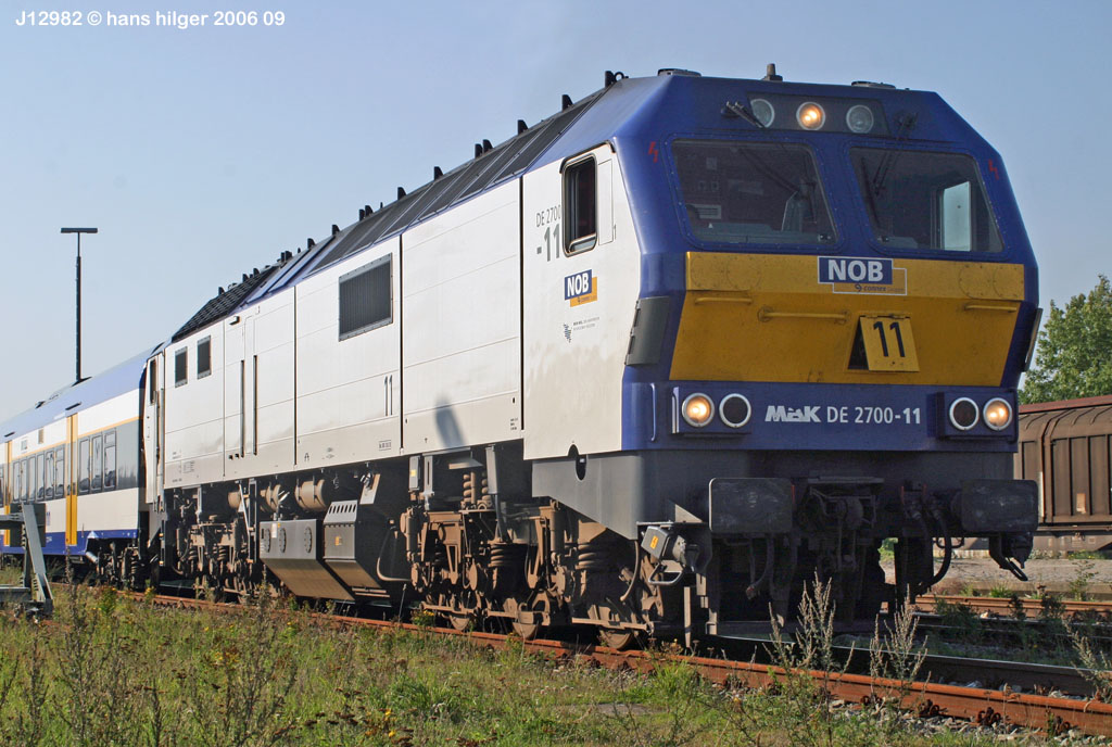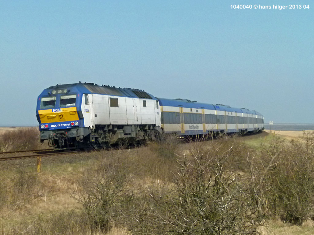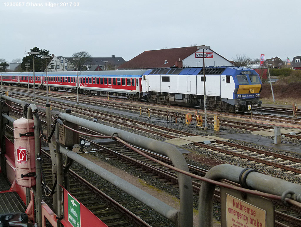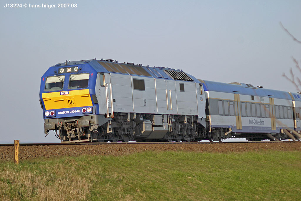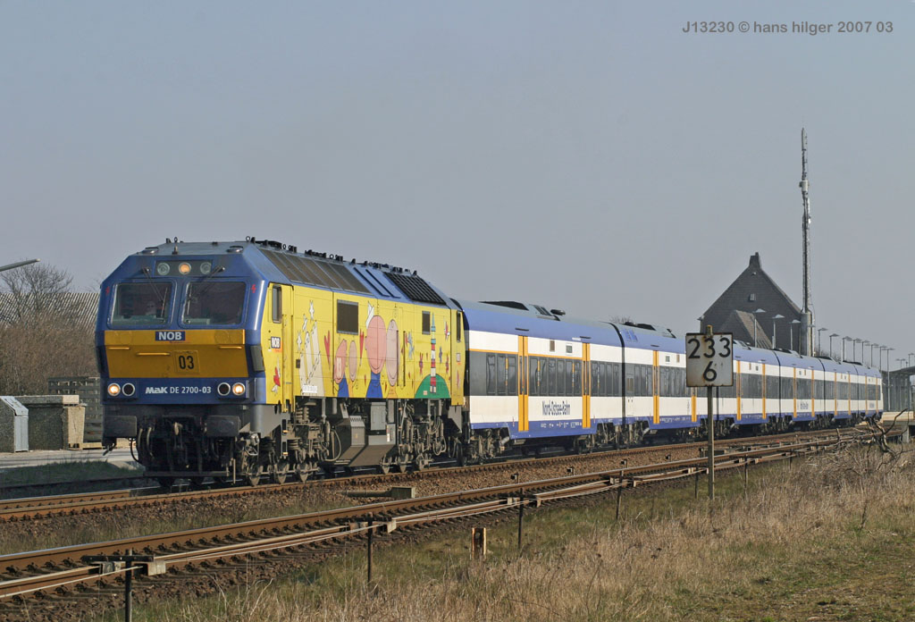 <79> Und dann haben wir den Pechvogel der Reihe der DE 2700, die 012. Hier wieder ein altes Bild aus Neustrelitz aus dem Jahre 2004 (NICHT 2008 wie irrtümlich dransteht!). Auch dies ist ein weitergegebenes Bild von Manni Kantel†, dem Lokführer aus Oberhausen, der durch Werbeauftritte in Rio- Grande- Videos große Bekanntheit erlangt hatte und leider viel zu früh abberufen wurde<80> Ich habe nur dieses eine Bild von ihr, 2006 in Westerland, wo noch alles “gut” war für sie, aber sie hatte früh einen kapitalen Motorschaden und kam danach nicht wieder ans rollen, sondern wurde als Ersatzteilspender für ihre anderen Schwestern verwendet, sie sollte immer noch in Kiel bei Vossloh stehen, aber als leeres Gerippe, neuere Bilder von ihr liegen mir leider nicht vor