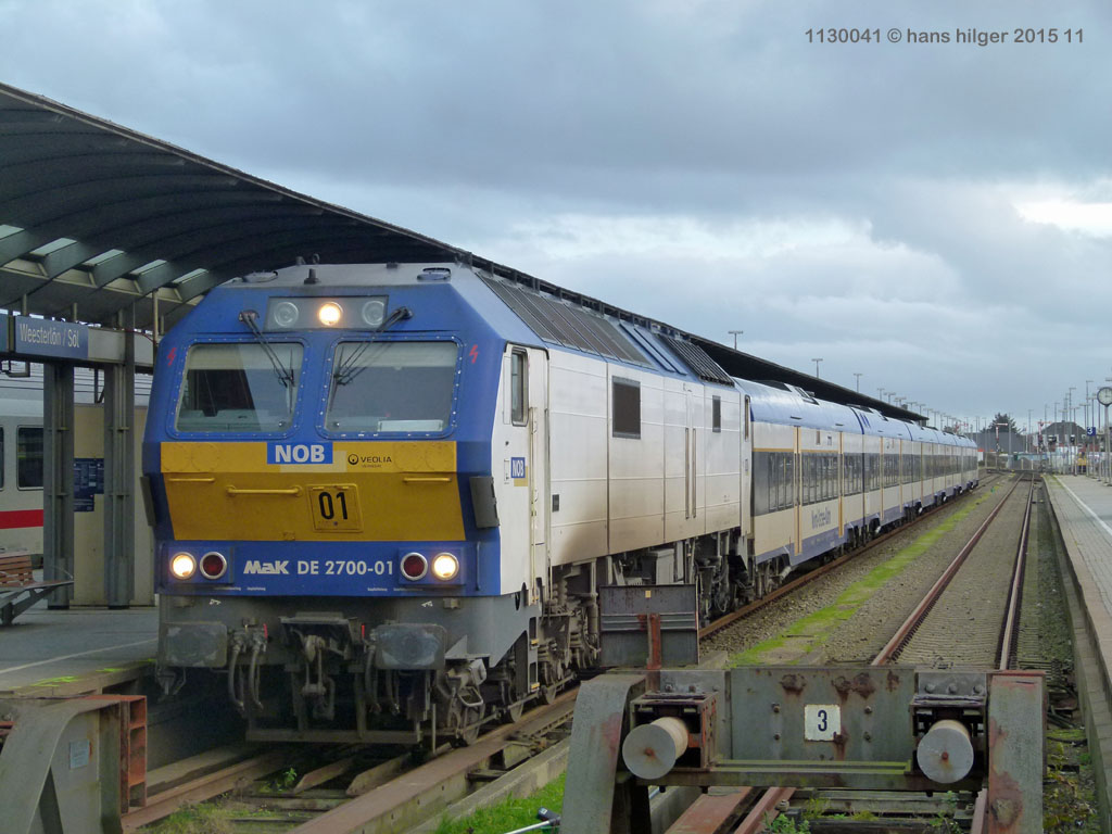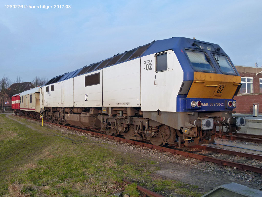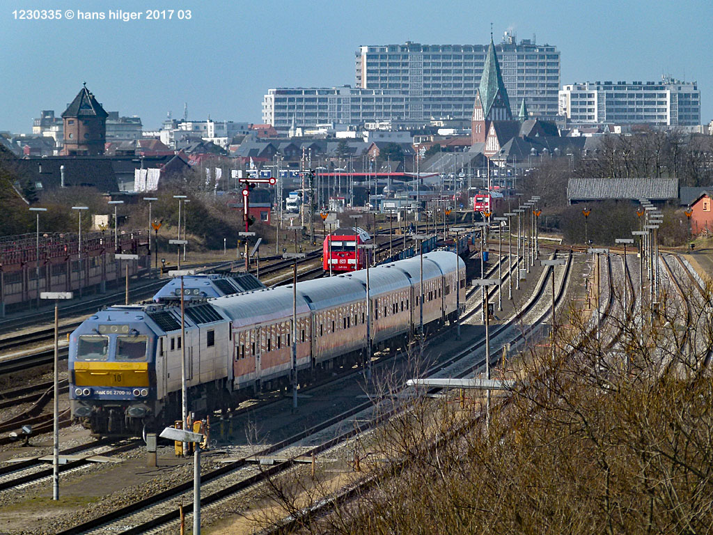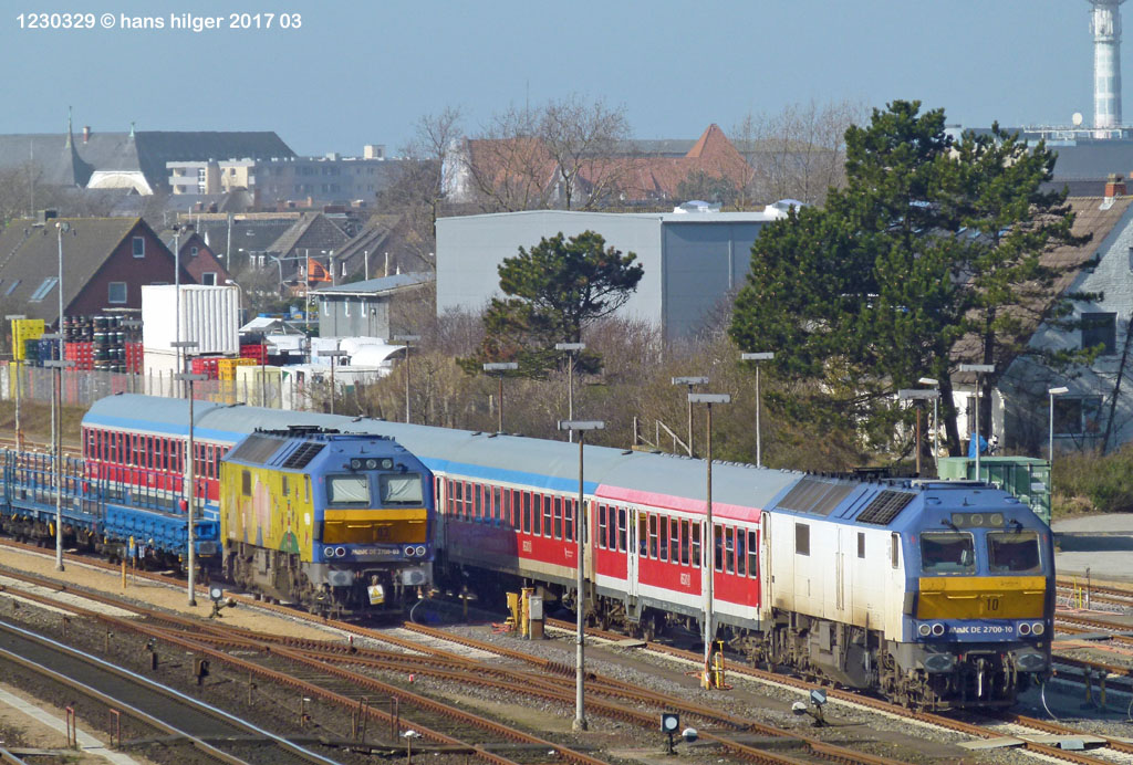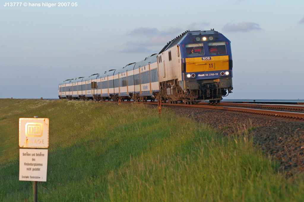 <79> Und dann haben wir den Pechvogel der Reihe der DE 2700, die 012. Hier wieder ein altes Bild aus Neustrelitz aus dem Jahre 2004 (NICHT 2008 wie irrtümlich dransteht!). Auch dies ist ein weitergegebenes Bild von Manni Kantel†, dem Lokführer aus Oberhausen, der durch Werbeauftritte in Rio- Grande- Videos große Bekanntheit erlangt hatte und leider viel zu früh abberufen wurde<80> Ich habe nur dieses eine Bild von ihr, 2006 in Westerland, wo noch alles “gut” war für sie, aber sie hatte früh einen kapitalen Motorschaden und kam danach nicht wieder ans rollen, sondern wurde als Ersatzteilspender für ihre anderen Schwestern verwendet, sie sollte immer noch in Kiel bei Vossloh stehen, aber als leeres Gerippe, neuere Bilder von ihr liegen mir leider nicht vor
