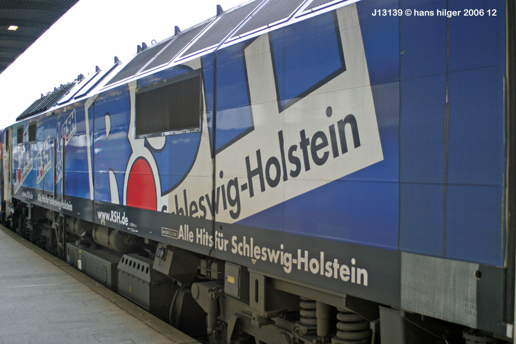 <63> Die 09 war diejenige der Marschbahn- Wummen, die zu ihrer Anfangszeit Werbung machen durfte für “Vossloh- Technik”, die ab Dezember 2005 auf die Marschbahn kam! Dabei war sie ja gar keine Vossloh- Lok, sondern eine MaK, die später von Vossloh gekauft wurde und immer noch “Siemens” dranstehen hatte, da kann man schon etwas durcheinanderkommen . . . Jedenfalls blieb dies hier leider mein einziges Bild der Lok mit dieser gutgemachten Werbung<64> Später war sie eine von Vielen und unterwegs bei jedem Wetter<65> Und ließ sich auch einmal erleben, als sie einem anderen Fahrzeug des ÖPNV die Vorfahrt nahm (in Keitum). Später kam sie zu Hector, wurde Grau und umbenannt in “861.005 Shrek”, was auch ihr aktueller Zustand ist (2025/11): Auch sie wird gerade weiterverkauft, also noch öfter auf Schienen zu erleben sein, wenn auch vielleicht in einer wieder anderen Farbe
