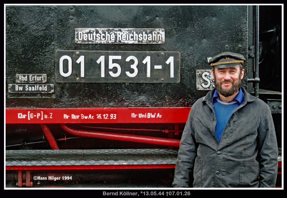 <1> Wir sehen Lokführer Karl-Heinz Wansing und seinen Heizer Albert Frenser (der aber längst selber Lokführer war) vor der damaligen Starlok des Bw Gelsenkirchen- Bismarck, der 044 508. Karl-Heinz Wansing hatte noch eine alte “Kluft” zuhause im Schrank hängen und scheute sich nicht, diese zu seinen letzten Diensten auf Dampf im Frühjahr 1977 auch anzuziehen. Zudem hatte er eine so unnachahmliche, ruhige und besonnene Art, daß er gerne von den Vorgesetzten auch für Sonderfahrten eingesetzt wurde – bei ihm kamen insbesondere Kinder immer auf ihre Kosten und wurden geradezu fürsorglich behandelt, auch wenn sie auf den Führerstand gehoben werden mußten! Irgendwo im Gewühle der vielen Sonderfahrten zum Dampfabschied des Ruhrgebietes entstand dann diese bemerkenswerte Aufnahme, die hier einen Ehrenplatz bekommen soll, zu Ehren der beiden “Schwarzen” aus Gelsenkirchen!<2> Es gab natürlich auch andere Eisenbahner, die man mal fragen konnte nach einem Bild. Oft gab es dann ein kategorisches “Nein”, mindestens genauso oft aber auch ein bereitwilliges “Ja bitte!”. So auch bei diesen beiden namenlosen Meistern des Bw Gelsenkirchen, die hier auf der 044 216 Dienst tun, eine Lok, die noch eine unrühmliche Geschichte vor sich hat: Zunächst wird sie als Museumslokomotive in die Niederlande verkauft und steht ein paar Jahre als Denkmal bei einem Schrotthändler in Appeldoorn, aber dann wurde sie leider doch noch verschrottet . . .<3> Aber auch bei der Deutschen Reichsbahn in der DDR gab es immer wieder Eisenbahner, die nichts dagegen hatten, geknipst zu werden. So diese Meister auf ihrem Edelrenner 03 1010, die hier ihre “computergerechte” EDV- Nummer 03 0010-3 trägt, und zwar sogar als Messingschild, was hier in schwarz/weiß nicht so recht zur Geltung kommt. Der Zugführer hat gerade die Papiere übergeben, der Heizer steckt sich noch ne Fluppe an, gleich wird es losgehen und die 03.10 wird wieder einmal losbrüllen und ihren Zug pünktlich nach Stralsund bringen. Gesehen wurde diese Szene in Berlin-Lichtenberg am Bahnsteig<4> Auch dies ein Lokführer, der 1994 einen polierten Trabi fuhr in Topzustand (gesehen im Bw Saalfeld)<5> Eine andere (unbekannte) Mannschaft aus Stralsund hat ihre 03 0059, die ehemalige 03 1059, fertig zur Abfahrt, die Scheiben geputzt, das Feuer glühend, der Kesseldruck am Zeiger. Der Lokführer vertritt sich nochmal kurz die Beine auf dem Bahnsteig, denn gleich wird der Pfiff vom Schaffner erfolgen und die Reise kann losgehen<6> Gleich wird das Signal auf “grün” umschalten und die 03.10 wird über den Innenring Lichtenberg Richtung Norden verlassen. Es war im Jahre 1979, aber wir wünschen von hier aus nochmal GUTE REISE für die 03 0059-0, die leider längst verschrottet ist. Schaut euch an, wie sauber der Tender ist und das Führerhaus!<7> Auch im Ausland gab es noch Dampf in den Siebzigern des letzten Jahrhunderts. So zum Beispiel in Österreich auf der “Graz-Köflacher-Eisenbahn” GKB, wo es scheinbar nie Hektik gab und Eile. Dieser “Lumpensammler-” Güterzug von Graz hatte alle Zeit der Welt, auf den kleinen Bahnhöfen (hier: Bergla) der Strecke Güterwagen zu rangieren und Stückgut umzuladen. Natürlich war auch ausreichend Zeit für einen Tee und ein Gruppenfoto: Wie sehen Lokführer und Heizer, sowie die Aufsicht (Fahrdienstleiter) und den Bahnhofschef. Alles, wie es sich gehört(e). Heute reicht dort ein einzelnes ferngesteuertes Signal, den Gesamtverkehr zu bewältigen . . .<8> Aber es geht auch in FARBE. Hier sehen wir die Mannschaft der 86 501 im August des Jahres 1988 in Erfurt- West am Abend eines Sonderfahrtentages für den DMV, den Deutschen Modellbahn- Verband der DDR. Hinten steht als rollfähiges Exponat die 74 231, die später in den Westen verkauft wird und wieder unter Dampf kommt. Auch die 86 501 hat bis heute überlebt und befindet sich in Österreich<9> Eine Lok aus Salzwedel, also im unzugänglichen Grenzgebiet. Geknipst noch zu planmäßiger Einsatzzeit 1984 irgendwo in der Nähe von Stendal. Man wartet auf weitere Anweisungen. Wer hier der Lokführer und wer der Heizer ist, darf man vermuten, aber wir wissen es nicht . . . ABER wir wissen, daß dieses Bild noch eine viel spätere Geschichte schrieb: Einer unserer Leser erkannte den jungen Heizer hier in der Tür viele Jahre später und schenkte ihm dieses Bild (mit meiner Hilfe) zu seinem 60. Geburtstag!! Ist das nicht großartig? Was für ein tolles Ding, bei dem sich herausstellte, daß der damalig Fotografierte NICHTS davon mitbekommen hatte (oder es schlicht vergessen hat, denn: Ich habe -wenn möglich- IMMER geknipste Eisenbahner um Erlaubnis gebeten, und der Kollege im Fenster hatte zugestimmt!)<10> Bei Sonderfahrten der DGEG war dies hier die dreckige Seite des Jobs: Ausschlacken und “Lösche ziehen”. Aber auch das Säubern der Nummernschilder gehörte zum Programm<11> Das war ein Ding! Ziemlich plötzlich nach der Wende konnten die Traditionsdampfer der ehemaligen Reichsbahn auch im Westen für große Aufmerksamkeit sorgen, so auch die 01 531, die hier am Rhein unterwegs ist (= in Bonn-Beuel). Das waren tolle Fahrten, an die ich gern zurückdenke<12> Und an diese Stelle gehört unbedingt dieses tolle Bild von einem der ganz großen Eisenbahner mit Herz, Verstand und Humor! Bernd Köllner† aus Saalfeld, der leider am 7. Januar 2026 verstorben ist. Für ihn war es ein Traum, der in Erfüllung ging, als er mit “seinem Mädchen” 01 531 am Rhein (und nicht nur an der Elbe) auf große Fahrt gehen konnte. Und dieses Grinsen im Gesicht hat eine Ursache: Im Sonderzug waren englische Eisenbahnfans, die während der Fahrt am Rhein entlang mit der Stoppuhr gemessen hatten – und auf satte 135 km/h gekommen waren . . . Darauf angesprochen meinte unser Meister Köllner nur grinsend, das könne ja gar nicht sein, er habe ja nur einen 120er Fahrplan . . . DIESES Grinsen ist für immer festgehalten, und das ist gut so und verjährt. Beste Grüße a