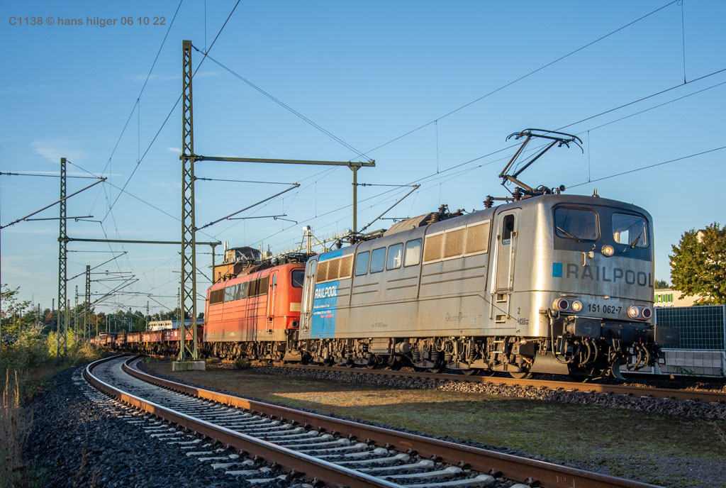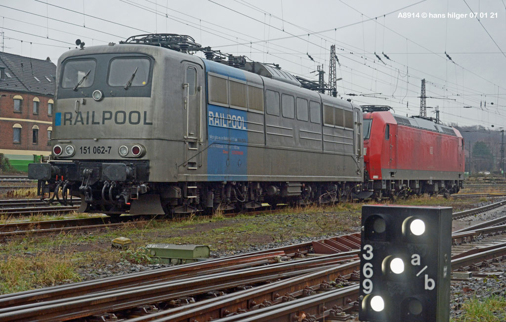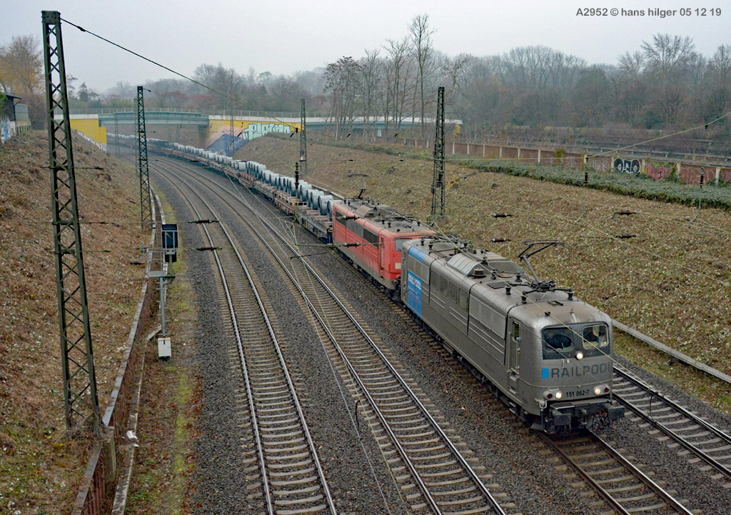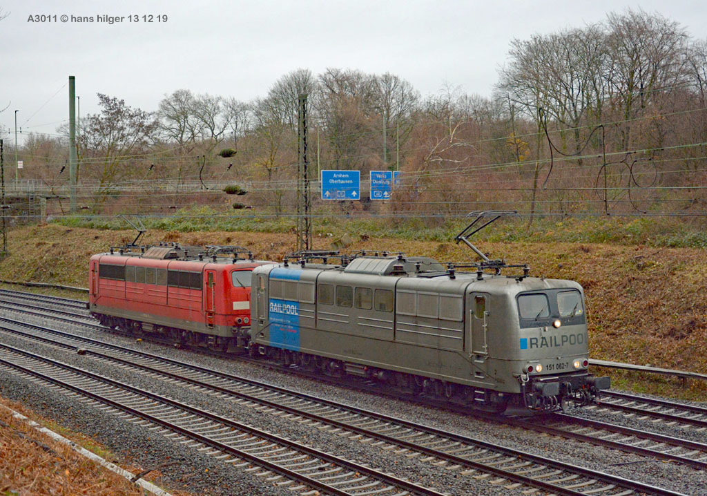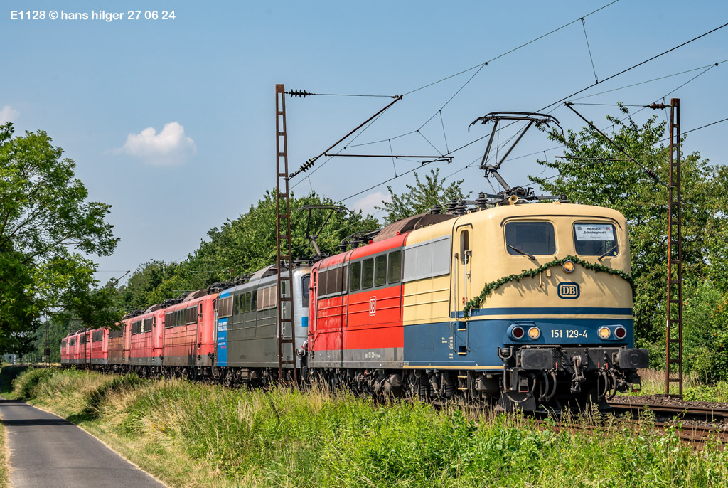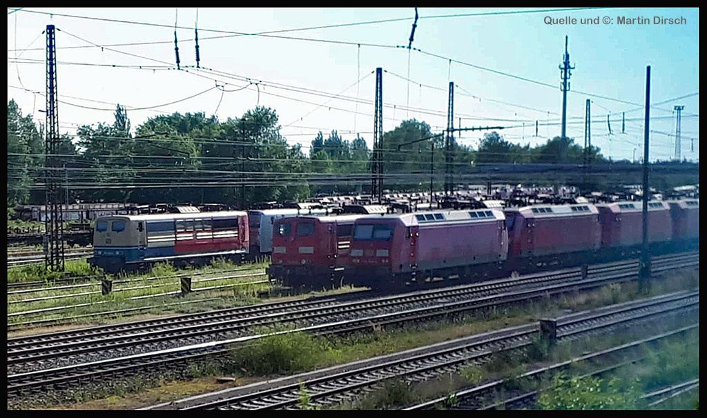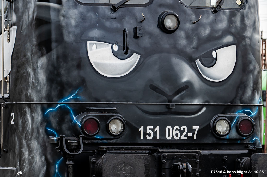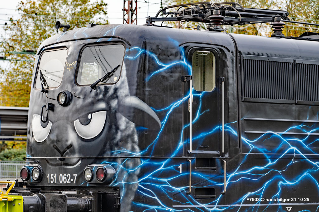 <28> Nachdem sie im Juni 2024 endgültig bei DB Cargo verbannt war und RAILPOOL sie nicht anderweitig einsetzen konnte, war die 062 mit den anderen übergebliebenen 151ern gemeinsam nach Leipzig- Engelsdorf auf den Lokfriedhof gefahren worden = Hier steht sie als zweite hinter der bunten 151 129 im Gegenlicht, aufgenommen von Martin Dirsch am Tage nach der Anlieferung aus einem vorbeifahrenden Zug <27> Und dies war der genannte Anlieferungs- und Abschiedszug: Alle in Gremberg und Osterfeld übergebliebenen 151er, die teilweise noch am Vortage im Einsatz standen, waren gemeinsam überführt worden zum “Stillstandsmanagement” SSM Engelsdorf (Was für ein Wort!), hier gesehen bei Nordbögge<26> Gut erkennbar: Auch unsere 062 war noch aufgebügelt bei dieser Fahrt, es wurde also mit zwei Loks in Doppeltraktion gefahren, was heißt, daß die beiden 151 129 und 062 mit eigener Kraft zum Lokfriedhof gefahren sind . . . zu dieser Zeit war alles denkbar, auch eine Weiterfahrt nach Opladen zum Bender war im Gespräch, aber letztlich konnten einige von ihnen gerettet, sprich: verkauft werden, die 129 an KonRail, die 062 an Altmark- Rail<25> Ein paar Tage vorher sehen wir die 151 062 im Bw Osterfeld zum Ende ihrer Einsatzzeit, fotografiert von Tf Bernd Grigo†, der leider bereits verstorben ist<24> Und genau dieser Tf Bernd Grigo† ist hier von Michael Dammer festgehalten worden zu selber Zeit (Juni 24) mit einer der letzten typischen Leistungen dieser Lok im Ruhrgebiet, gesehen in Oberhausen am Centro-Gelände. Damit sehen wir den Zustand der Lok nun von beiden Seiten = Im letzten Bild ist der Führerstand 1 vorne, hier FS 2<23> Im April 2024 ist die Lok mit der Schwester 053 unterwegs an der langjährigen Starleistung des Bw Osterfeld, dem “Andernacher” Coilzug, hier als Leerzug auf der eingleisigen Verbindung von Wedau zum Duisburger Hbf = eine der wenigen Querverbindungen von der Pz- Hauptbahn zur Güterbahn<22> Hier mal ausnahmsweise der “Andernacher”, oder haben wir den schon mal gesehen? 🤣 Lotharstraße mit 151 045<21> Und wieder der Andernacher, diesmal aber an gefährlicher Stelle: Wir stehen genau beim Bender in Opladen, wo hier 151 062 und 151 130 ungerührt vorbeibrummen. Die 130 hatte es später nicht so gut wie die 062 = Sie wurde genau dort beim Bender verschrottet, wo sie hier noch locker vorbeifährt<20> Auch dies ein Andernacher Leerzug, aber ausnahmsweise mal alleine, wo sonst immer mit Doppeltraktion gefahren wird. Es kam daher, weil zwei Leerzüge zurück mußten, aber nur ein Vollzug, daher bekamen beide Loks in Andernach je einen Leerzug <19> Der Andernacher Leerzug in Duisburg- Hochfeld im September 22 mit der Schwester 028<18> Hier ist sie mit einem Druckgas-Kesselzug unterwegs von Oberhausen via Moers nach Krefeld, gesehen im linksrheinischen Duisburger Stadtteil Rumeln <17> Ein Portrait aus dem langjährigen Einsatz- Bw Oberhausen Osterfeld im Januar 2021 <16> Wieder der “Andernacher”, diesmal in Duisburg Hochfeld “Vorbahnhof” in der Nähe vom Wedaustadion mit der 099 <15> Auch dies ist ein Stahlzug = Ein Spezialzug für Edelstahl- Coils in nässegeschützten Planenwagen<14> Aber sie war auch für alle anderen Züge verwendbar, wie hier für einen Autozug an der Lotharstraße<13> Ja, und auch dies ist der Andernacher Stahlzug! Es kommt immer mal wieder vor, daß es gerade keinen beladenen ZUg gibt, der nach Andernach gebracht werden müßte, aber einen Leerzug. der auf die Abholung dort wartet. Also fahren die Loks Lz im Plan vom “Andernacher” und holen den Leerzug dort ab, so geschehen zum Beispiel am 13. Dezember 2019 im Regen <12> Man kann nicht nur bei Sonnenschein knipsen, manchmal muß man Kompromisse schliesen . . . Wie hier am Duisburger Zoo im Dezember 2019 mit der Schwester 109 am Coilzug von Oberhausen nach Andernach<11> Das war ihre und meine Starleistung: 151 062 mit der roten Schwester 169 in Lintorf am legendären Coilzug, wie geschaffen für die Baureihe 151. Dabei war dies hier ein lange vorgeplantes Bild, das dann plötzlich umgesetzt werden konnte, als alle Parameter “paßten”<10> Damals nach der aufwändigen Beklebung zur Werbelok war dies mein erstes Bild von ihr, gemeinsam mit der sofort erkennbaren 151 099 (siehe den gelben Hebel an der Pufferbohle). Nachdem aber klar war, daß die Lok ein paar Tage lang am “Andernacher” laufen würde, war auch ein Sonnenbild möglich mit vorne laufender 062, das kommt gleich, zuerst ändern wir aber mal die Lokstellung . . . und POFF! . . . sooo schnell geht das . . . 😎<9> Da: An selber Stelle, nun aber in “richtiger” Lokstellung = die 062 vorne, die andere ist wie gehabt die 099. Hier ist die silberne Folie noch ganz frisch, darunter war die Lok aber bis zu ihrer Lackierung bei AMR immer noch verkehrsrot, ihre langjährige Produktfarbe . . .<8> Und es gibt auch eine Aufnahme in ihrer langjährigen Stammfarbe Rot: Dezember 2018 ebenfalls an der Lotharstraße<7> Das war im Jahre 1974 die Lieferfarbe, in der auch die 062 vom Hersteller in Kassel geliefert wurde = “chromoxydgrün”. Da ich von der 062 leider kein Bild in grün habe, weiche ich als Beispiel für diese ursprüngliche Farbgebung aus auf die 151 032, die wir hier im Sommer 1980 im nächtlichen Bw in Mannheim antreffen<6> Auch diese Farbe trug unsere 062 eine zeitlang, aber auch von ihr habe ich keine Bilder zur Verfügung. Daher als Ersatz die 151 033, die wir hier im April 2001 im AW Opladen sehen . . . nur als Beispiel für die Farbgebung “Orientrot”