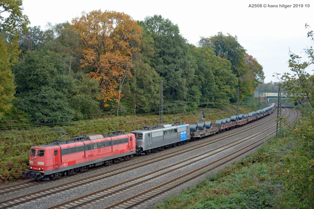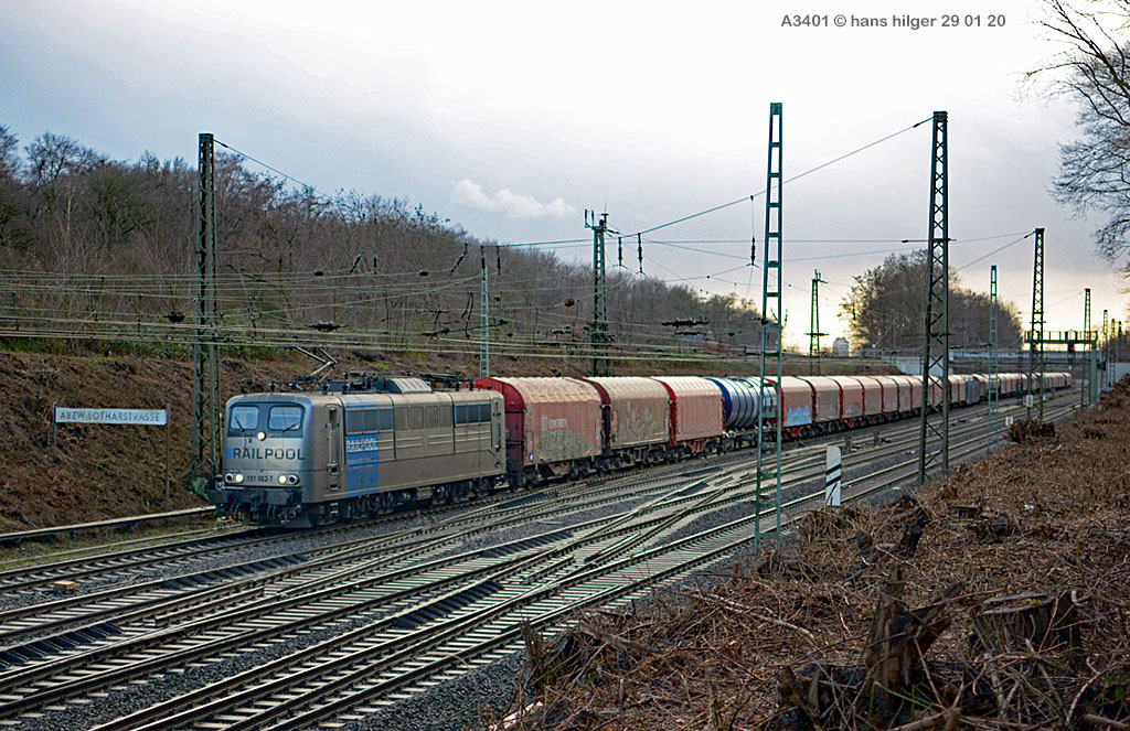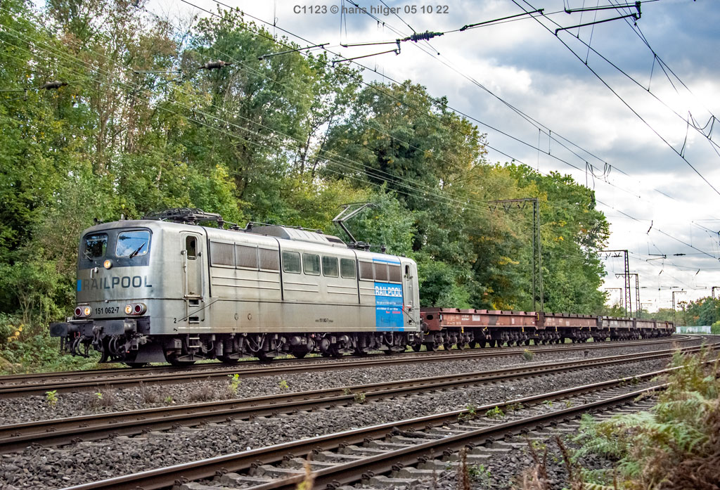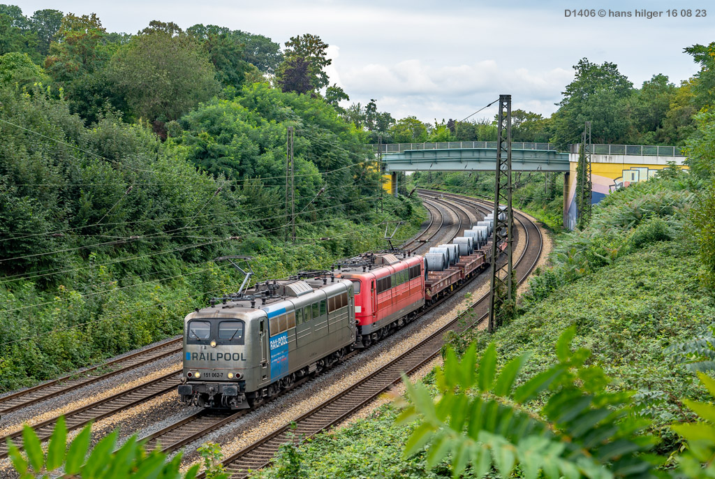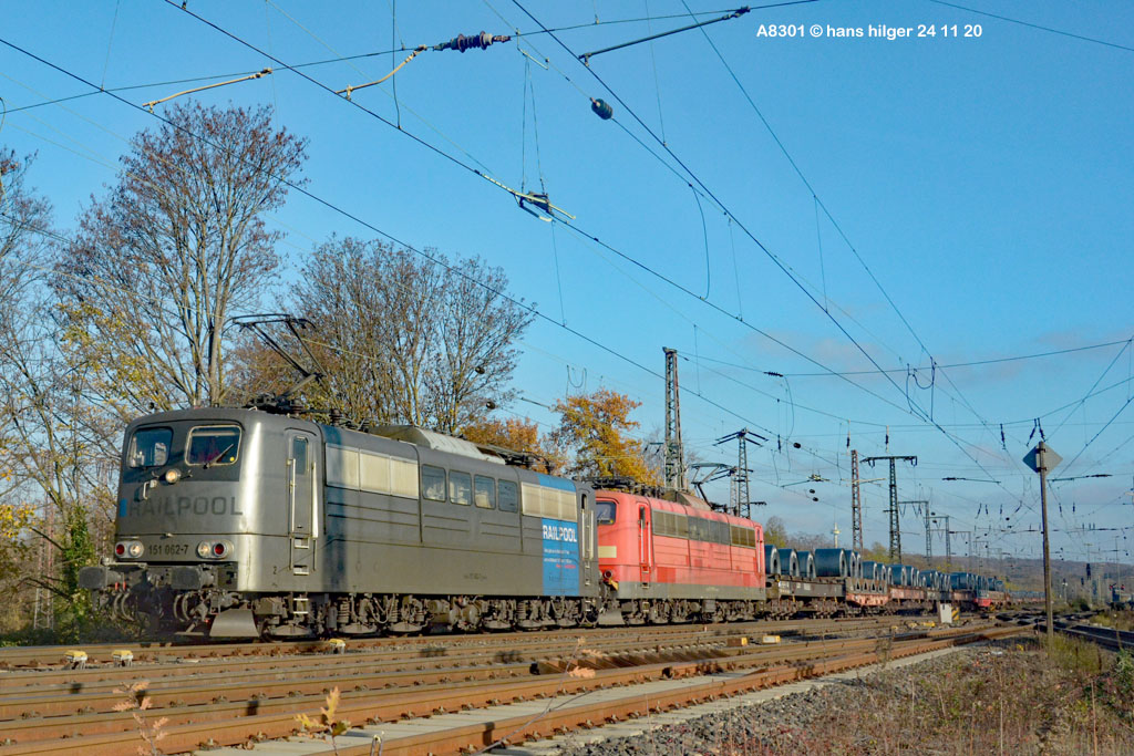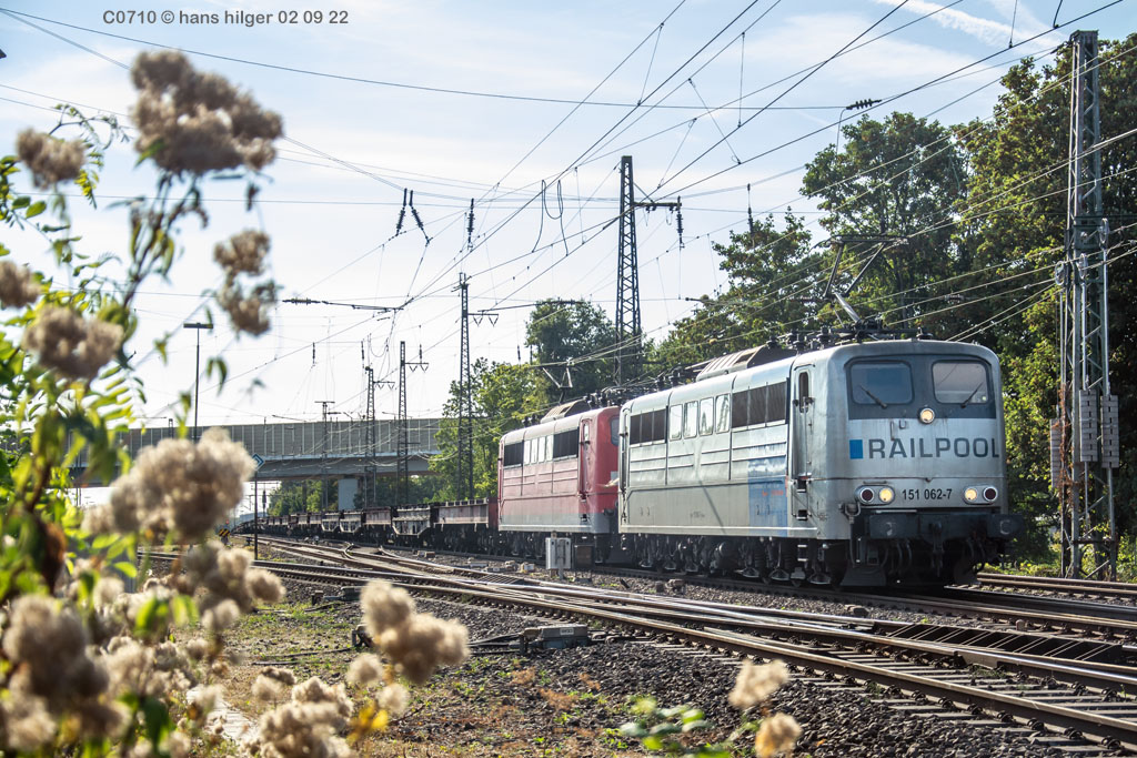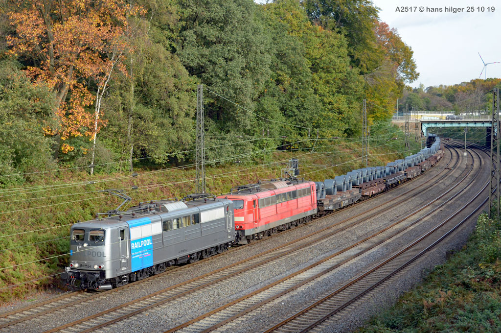<28> Nachdem sie im Juni 2024 endgültig bei DB Cargo verbannt war und RAILPOOL sie nicht anderweitig einsetzen konnte, war die 062 mit den anderen übergebliebenen 151ern gemeinsam nach Leipzig- Engelsdorf auf den Lokfriedhof gefahren worden = Hier steht sie als zweite hinter der bunten 151 129 im Gegenlicht, aufgenommen von Martin Dirsch am Tage nach der Anlieferung aus einem vorbeifahrenden Zug <27> Und dies war der genannte Anlieferungs- und Abschiedszug: Alle in Gremberg und Osterfeld übergebliebenen 151er, die teilweise noch am Vortage im Einsatz standen, waren gemeinsam überführt worden zum “Stillstandsmanagement” SSM Engelsdorf (Was für ein Wort!), hier gesehen bei Nordbögge<26> Gut erkennbar: Auch unsere 062 war noch aufgebügelt bei dieser Fahrt, es wurde also mit zwei Loks in Doppeltraktion gefahren, was heißt, daß die beiden 151 129 und 062 mit eigener Kraft zum Lokfriedhof gefahren sind . . . zu dieser Zeit war alles denkbar, auch eine Weiterfahrt nach Opladen zum Bender war im Gespräch, aber letztlich konnten einige von ihnen gerettet, sprich: verkauft werden, die 129 an KonRail, die 062 an Altmark- Rail<25> Ein paar Tage vorher sehen wir die 151 062 im Bw Osterfeld zum Ende ihrer Einsatzzeit, fotografiert von Tf Bernd Grigo†, der leider bereits verstorben ist<24> Und genau dieser Tf Bernd Grigo† ist hier von Michael Dammer festgehalten worden zu selber Zeit (Juni 24) mit einer der letzten typischen Leistungen dieser Lok im Ruhrgebiet, gesehen in Oberhausen am Centro-Gelände. Damit sehen wir den Zustand der Lok nun von beiden Seiten = Im letzten Bild ist der Führerstand 1 vorne, hier FS 2<23> Im April 2024 ist die Lok mit der Schwester 053 unterwegs an der langjährigen Starleistung des Bw Osterfeld, dem “Andernacher” Coilzug, hier als Leerzug auf der eingleisigen Verbindung von Wedau zum Duisburger Hbf = eine der wenigen Querverbindungen von der Pz- Hauptbahn zur Güterbahn<22> Hier mal ausnahmsweise der “Andernacher”, oder haben wir den schon mal gesehen? 🤣 Lotharstraße mit 151 045<21> Und wieder der Andernacher, diesmal aber an gefährlicher Stelle: Wir stehen genau beim Bender in Opladen, wo hier 151 062 und 151 130 ungerührt vorbeibrummen. Die 130 hatte es später nicht so gut wie die 062 = Sie wurde genau dort beim Bender verschrottet, wo sie hier noch locker vorbeifährt<20> Auch dies ein Andernacher Leerzug, aber ausnahmsweise mal alleine, wo sonst immer mit Doppeltraktion gefahren wird. Es kam daher, weil zwei Leerzüge zurück mußten, aber nur ein Vollzug, daher bekamen beide Loks in Andernach je einen Leerzug <19> Der Andernacher Leerzug in Duisburg- Hochfeld im September 22 mit der Schwester 028<18> Hier ist sie mit einem Druckgas-Kesselzug unterwegs von Oberhausen via Moers nach Krefeld, gesehen im linksrheinischen Duisburger Stadtteil Rumeln <17> Ein Portrait aus dem langjährigen Einsatz- Bw Oberhausen Osterfeld im Januar 2021 <16> Wieder der “Andernacher”, diesmal in Duisburg Hochfeld “Vorbahnhof” in der Nähe vom Wedaustadion mit der 099 <15> Auch dies ist ein Stahlzug = Ein Spezialzug für Edelstahl- Coils in nässegeschützten Planenwagen<14> Aber sie war auch für alle anderen Züge verwendbar, wie hier für einen Autozug an der Lotharstraße<13> Ja, und auch dies ist der Andernacher Stahlzug! Es kommt immer mal wieder vor, daß es gerade keinen beladenen ZUg gibt, der nach Andernach gebracht werden müßte, aber einen Leerzug. der auf die Abholung dort wartet. Also fahren die Loks Lz im Plan vom “Andernacher” und holen den Leerzug dort ab, so geschehen zum Beispiel am 13. Dezember 2019 im Regen <12> Man kann nicht nur bei Sonnenschein knipsen, manchmal muß man Kompromisse schliesen . . . Wie hier am Duisburger Zoo im Dezember 2019 mit der Schwester 109 am Coilzug von Oberhausen nach Andernach<11> Das war ihre und meine Starleistung: 151 062 mit der roten Schwester 169 in Lintorf am legendären Coilzug, wie geschaffen für die Baureihe 151. Dabei war dies hier ein lange vorgeplantes Bild, das dann plötzlich umgesetzt werden konnte, als alle Parameter “paßten”<10> Damals nach der aufwändigen Beklebung zur Werbelok war dies mein erstes Bild von ihr, gemeinsam mit der sofort erkennbaren 151 099 (siehe den gelben Hebel an der Pufferbohle). Nachdem aber klar war, daß die Lok ein paar Tage lang am “Andernacher” laufen würde, war auch ein Sonnenbild möglich mit vorne laufender 062, das kommt gleich, zuerst ändern wir aber mal die Lokstellung . . . und POFF! . . . sooo schnell geht das . . . 😎<9> Da: An selber Stelle, nun aber in “richtiger” Lokstellung = die 062 vorne, die andere ist wie gehabt die 099. Hier ist die silberne Folie noch ganz frisch, darunter war die Lok aber bis zu ihrer Lackierung bei AMR immer noch verkehrsrot, ihre langjährige Produktfarbe . . .<8> Und es gibt auch eine Aufnahme in ihrer langjährigen Stammfarbe Rot: Dezember 2018 ebenfalls an der Lotharstraße<7> Das war im Jahre 1974 die Lieferfarbe, in der auch die 062 vom Hersteller in Kassel geliefert wurde = “chromoxydgrün”. Da ich von der 062 leider kein Bild in grün habe, weiche ich als Beispiel für diese ursprüngliche Farbgebung aus auf die 151 032, die wir hier im Sommer 1980 im nächtlichen Bw in Mannheim antreffen<6> Auch diese Farbe trug unsere 062 eine zeitlang, aber auch von ihr habe ich keine Bilder zur Verfügung. Daher als Ersatz die 151 033, die wir hier im April 2001 im AW Opladen sehen . . . nur als Beispiel für die Farbgebung “Orientrot”