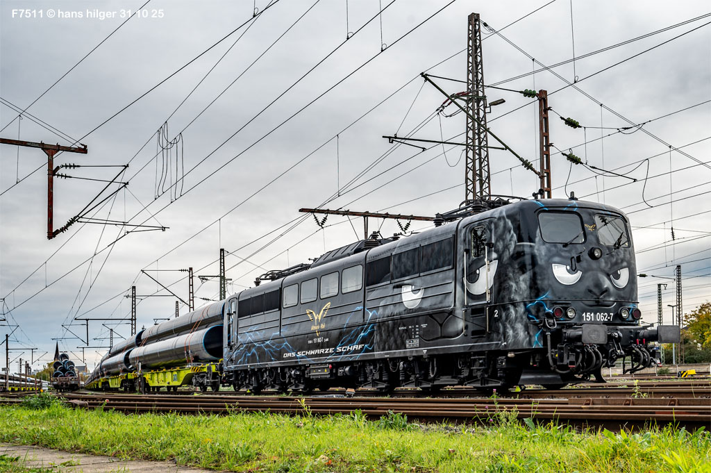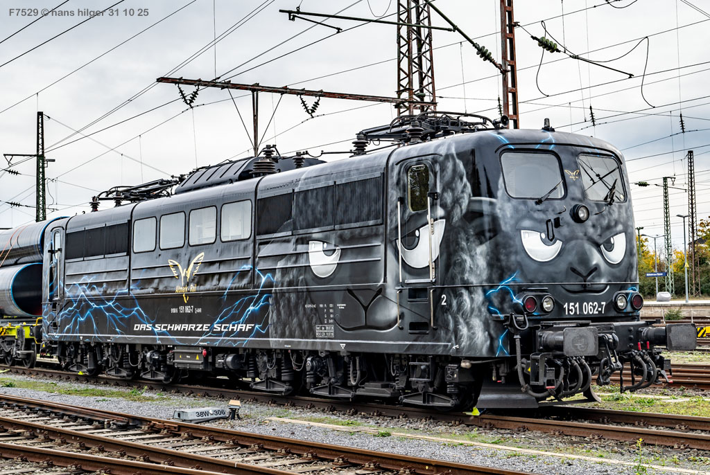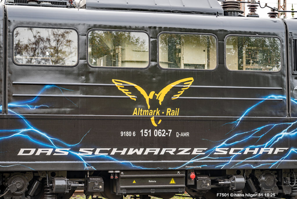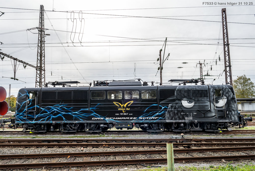 151 062 hat bereits eine beeindruckende Karriere hinter sich: Mit dem Baujahr 1974 bei Henschel in Kassel war sie bundesweit im Einsatz in grün, in orientrot und in verkehrsrot, bevor sie zur silbernen Werbelok für RAILPOOL wurde und inzwischen zum “Schwarzen Schaf” mutierte im Auftrag von Altmark- Rail AMR. Bilder aus dieser Historie sollen die Lok vorstellen, wobei nach einer kurzen Einleitung die jüngeren Bilder oben hinzugefügt werden, die alten Bilder also unten zu finden sind. In ihrer jüngsten Form ist die Lok zu einem der gefragtesten Fotoobjekte geworden, trägt sie doch ein ziemlich ungewöhnliches, aber geniales Design. Gute Unterhaltung und der schönen Lok noch viele Jahre mit AMR auf den Schienen unseres Landes!