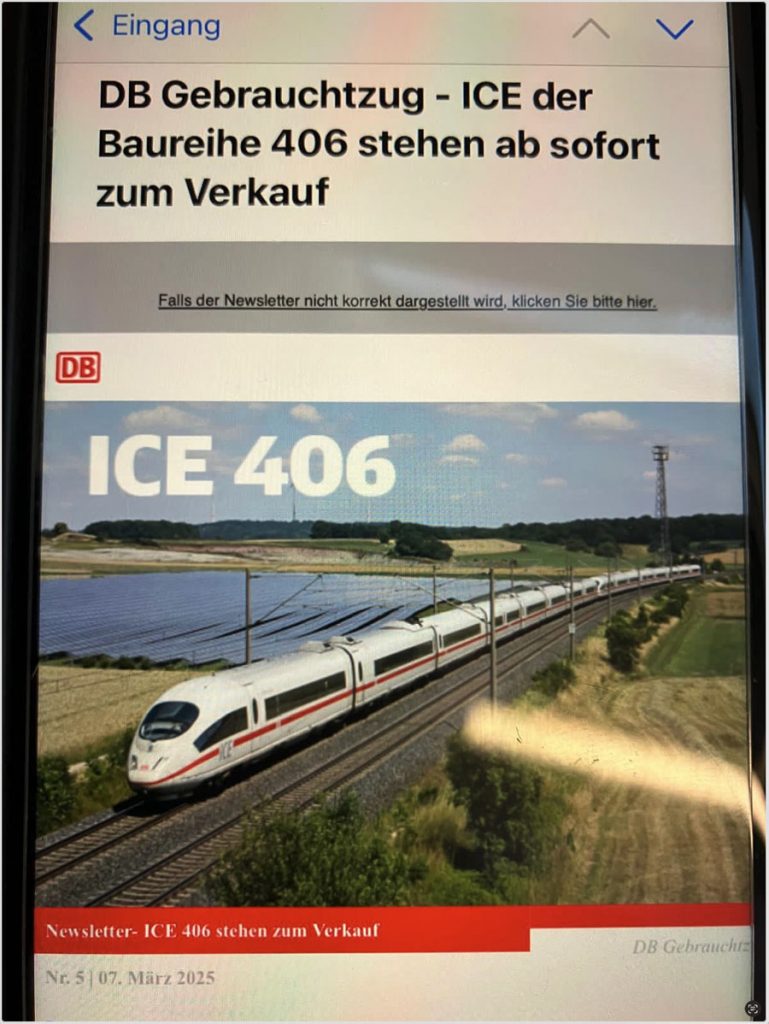 DAS hier ist eine gewaltige Fehlleistung der Bahn . . . Nicht nur, daß es meiner Ansicht nach ein Fehler war, im April 2025 alle 406er abzustellen und verkaufen zu wollen. Genauso schlimm wiegt der Umstand, daß auf diesem Bild GAR KEIN 406 ZU SEHEN IST, sondern zwei fast gleich aussehende 403! Aber eben nur FAST = Der 406 ist eindeutig unterscheidbar vom 403 durch seine vielen Stromabnehmer bzw. Dachhauben, hier sehen wir zwei normale, nicht mehrsystemfähige Triebwagen der Baureihe 403, NICHT einen der angebotenen Züge der Baureihe 406! Die Bahn weiß also selber nicht, wie ihre Züge aussehen . . . 🙈😳