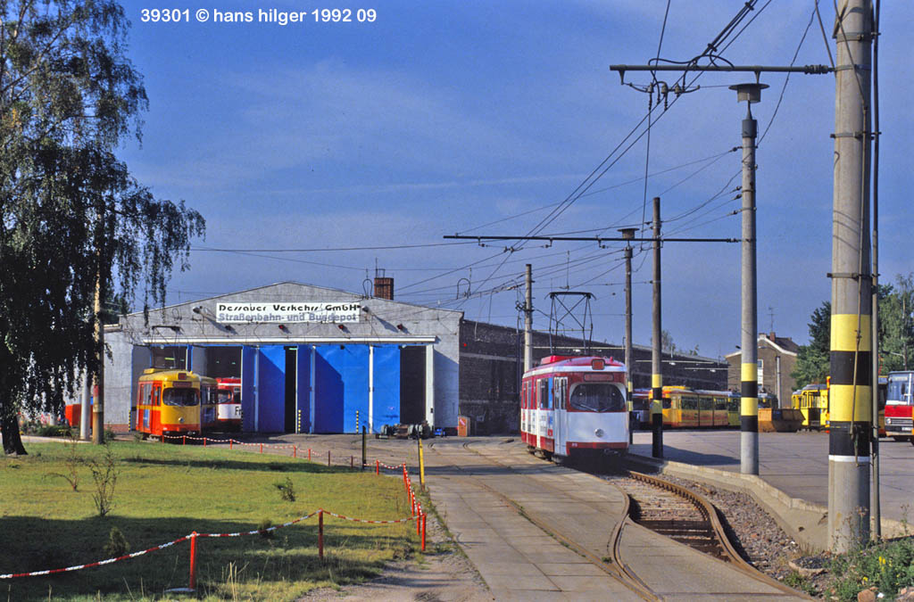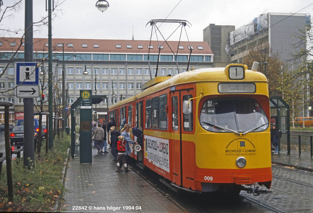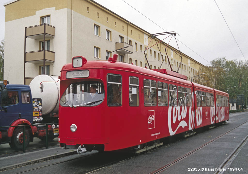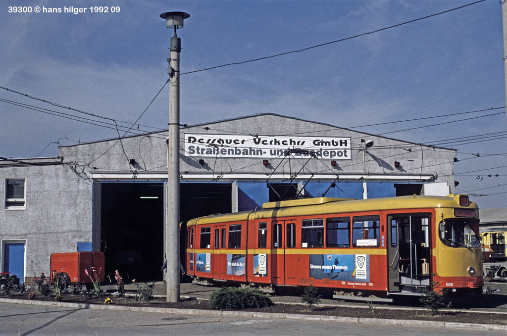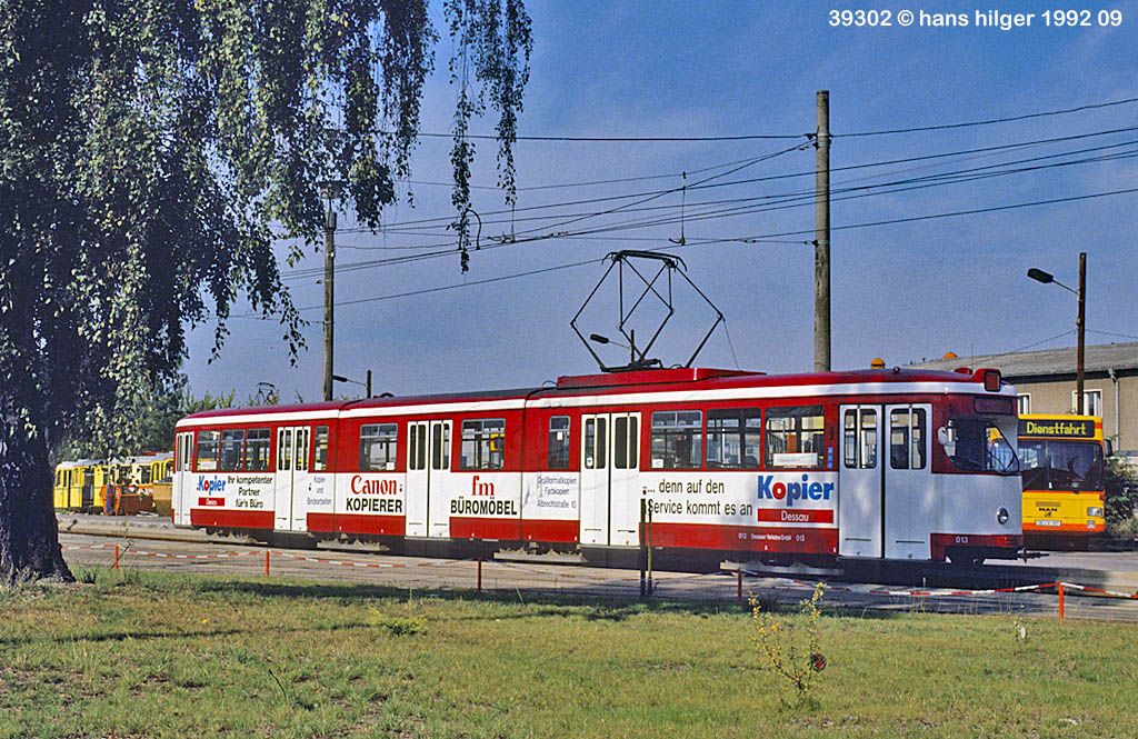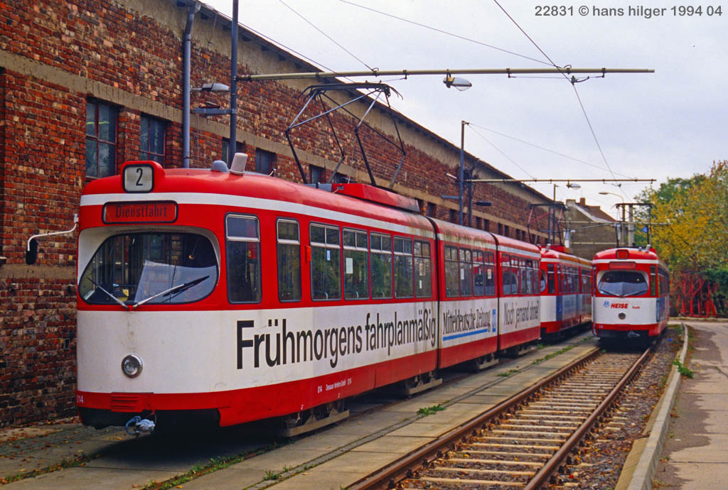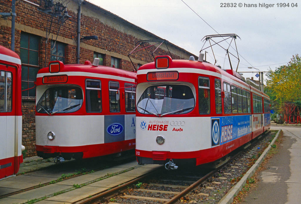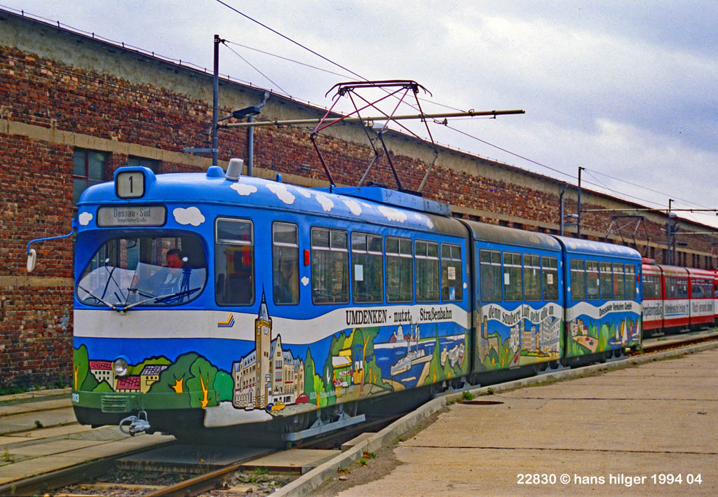 <31> Auch nach Dessau kamen 1992 mehrere Duisburger Wagen für diese beiden zu fahrenden Linien<32> Wagen 002 ex Duisburg 1046 in Dessau, April 1994 (inzwischen verschrottet)<33> Dessau 003 ex Duisburg 1047 den wir eben noch weiter oben gesehen haben ❗️(siehe Bild 9). Er trägt in Dessau noch die Duisburger Ganzwerbung = war früher Reklame für Stadtwerke Duisburg, wurde in Dessau weiterverwendet als “Umweltbahn”<34> Hinten ist noch das Logo der Duisburger Stadtwerke erkennbar<35> Dessau 003 im Einsatz<36> Das war einer der schönsten Wagen, die ich in 50 Jahren gesehen habe<37> Und wenn man dem Netz trauen darf, existiert dieser Wagen noch, er wurde in Dessau nicht verschrottet, sondern ging an Straßenbahnfreunde <38> Dessau 004, war früher der Wagen Duisburg 1048, rechts der Betriebshof Dessau in Sicht<39> Dessau 006, ex Duisburg 1050, er mußte später nach einem Brand ausgemustert werden<40> Dessau 008, noch in der Duisburger Farbgebung (ex Duisburg 1053 DVG)<41> Gleich drei Duisburger Wagen in Dessau<42> 008 in Duisburger Farbe im Einsatz in Dessau<43> Dessau 009 in der Duisburger Farbe des ehemaligen DVG 1054<44> Dessau 009, der wie die anderen noch jahrelang Freude machte in Dessau<45> Dessau 013 ex DVG 1058 am Betriebshof<46> Ein Portrait des Dessau 013, nachdem er gerade hübsch gemacht war für den Einsatz in Dessau<47> Der Dessau 010 war der DVG 1055. Nein, das ist keine Geisterbahn! Der Wagen steht und der Fahrer ist gerade hinten im Wagen, das ist nicht die erste selbstfahrende Bahn, auch wenn es so scheint ohne Fahrer . . .<48> 012 + 004<49> Und davor steht im Betriebshof Dessau der 014 = ex DVG ??? – DAS könnt ihr jetzt selber nachsehen . . .