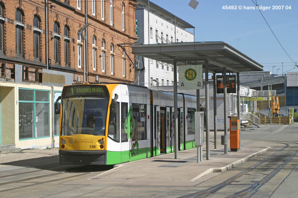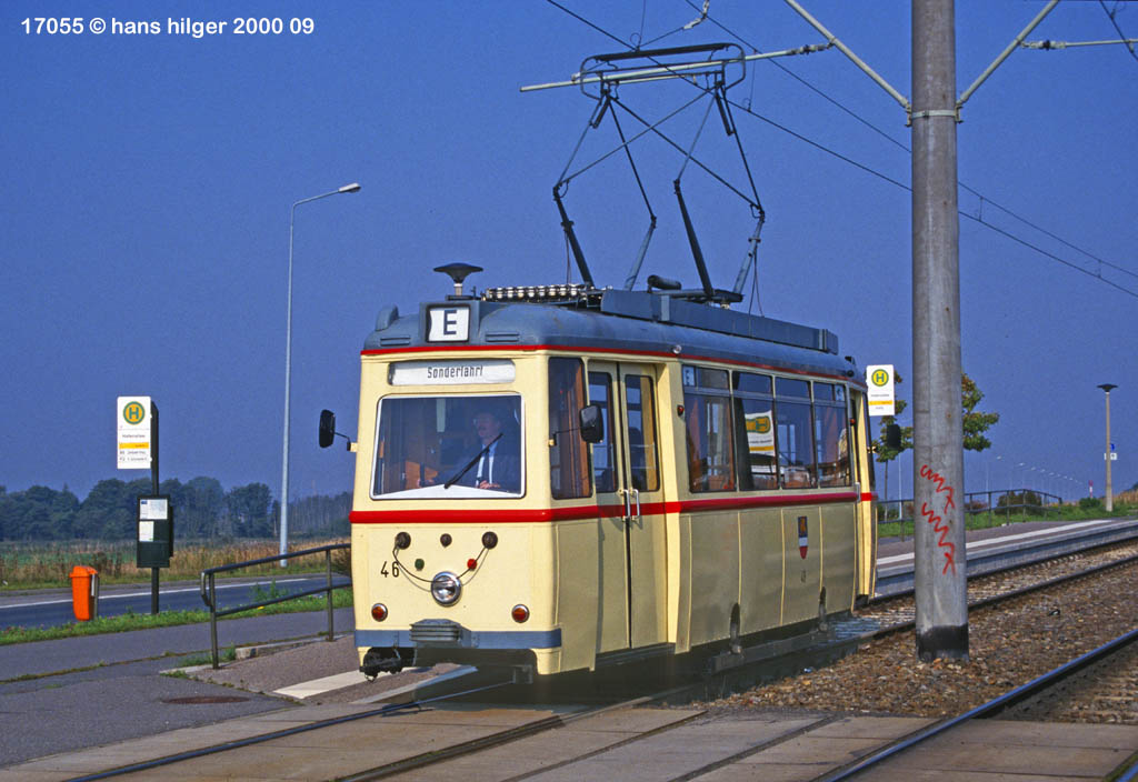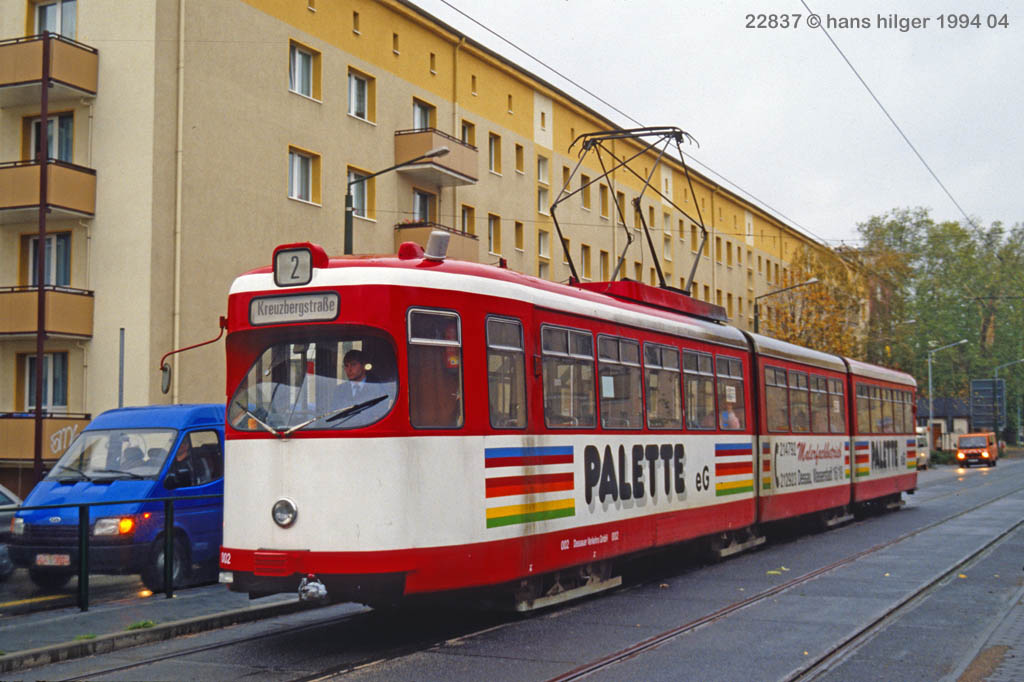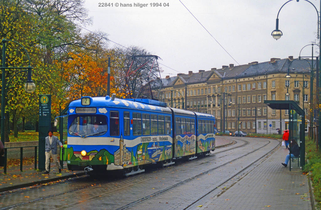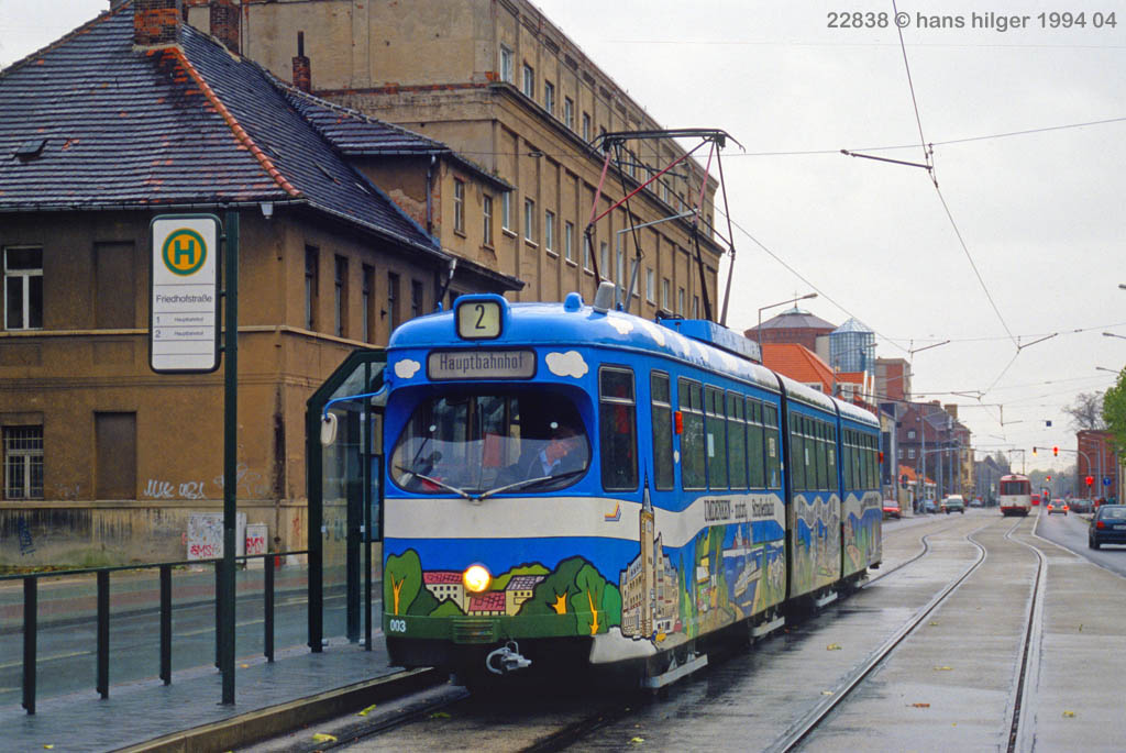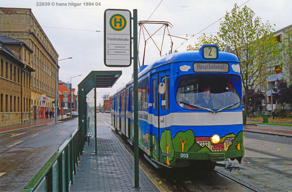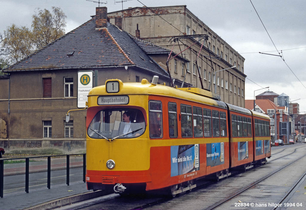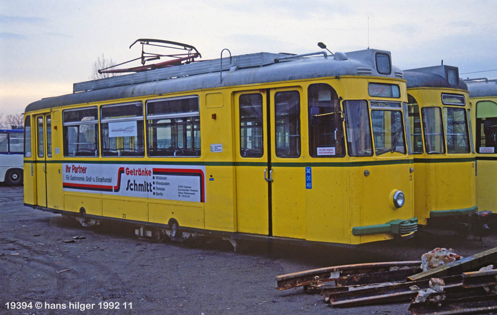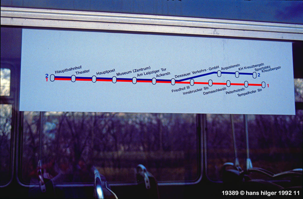 <31> Auch nach Dessau kamen 1992 mehrere Duisburger Wagen für diese beiden zu fahrenden Linien<32> Wagen 002 ex Duisburg 1046 in Dessau, April 1994 (inzwischen verschrottet)<33> Dessau 003 ex Duisburg 1047 den wir eben noch weiter oben gesehen haben ❗️(siehe Bild 9). Er trägt in Dessau noch die Duisburger Ganzwerbung = war früher Reklame für Stadtwerke Duisburg, wurde in Dessau weiterverwendet als “Umweltbahn”<34> Hinten ist noch das Logo der Duisburger Stadtwerke erkennbar<35> Dessau 003 im Einsatz<36> Das war einer der schönsten Wagen, die ich in 50 Jahren gesehen habe<37> Und wenn man dem Netz trauen darf, existiert dieser Wagen noch, er wurde in Dessau nicht verschrottet, sondern ging an Straßenbahnfreunde <38> Dessau 004, war früher der Wagen Duisburg 1048, rechts der Betriebshof Dessau in Sicht<39> Dessau 006, ex Duisburg 1050, er mußte später nach einem Brand ausgemustert werden<40> Dessau 008, noch in der Duisburger Farbgebung (ex Duisburg 1053 DVG)<41> Gleich drei Duisburger Wagen in Dessau<42> 008 in Duisburger Farbe im Einsatz in Dessau<43> Dessau 009 in der Duisburger Farbe des ehemaligen DVG 1054<44> Dessau 009, der wie die anderen noch jahrelang Freude machte in Dessau<45> Dessau 013 ex DVG 1058 am Betriebshof<46> Ein Portrait des Dessau 013, nachdem er gerade hübsch gemacht war für den Einsatz in Dessau<47> Der Dessau 010 war der DVG 1055. Nein, das ist keine Geisterbahn! Der Wagen steht und der Fahrer ist gerade hinten im Wagen, das ist nicht die erste selbstfahrende Bahn, auch wenn es so scheint ohne Fahrer . . .<48> 012 + 004<49> Und davor steht im Betriebshof Dessau der 014 = ex DVG ??? – DAS könnt ihr jetzt selber nachsehen . . .