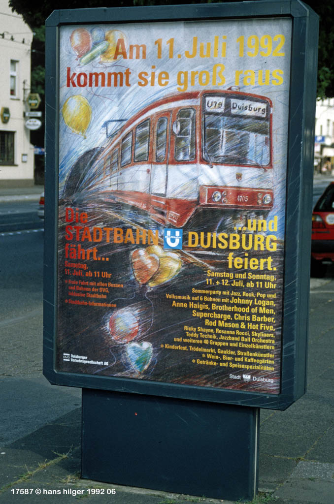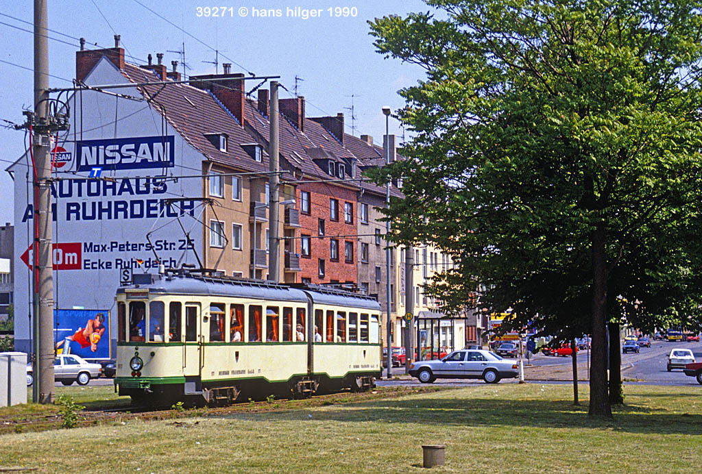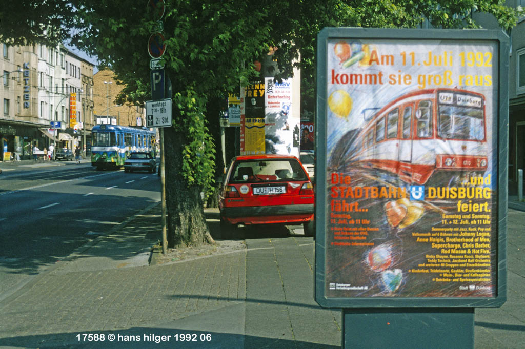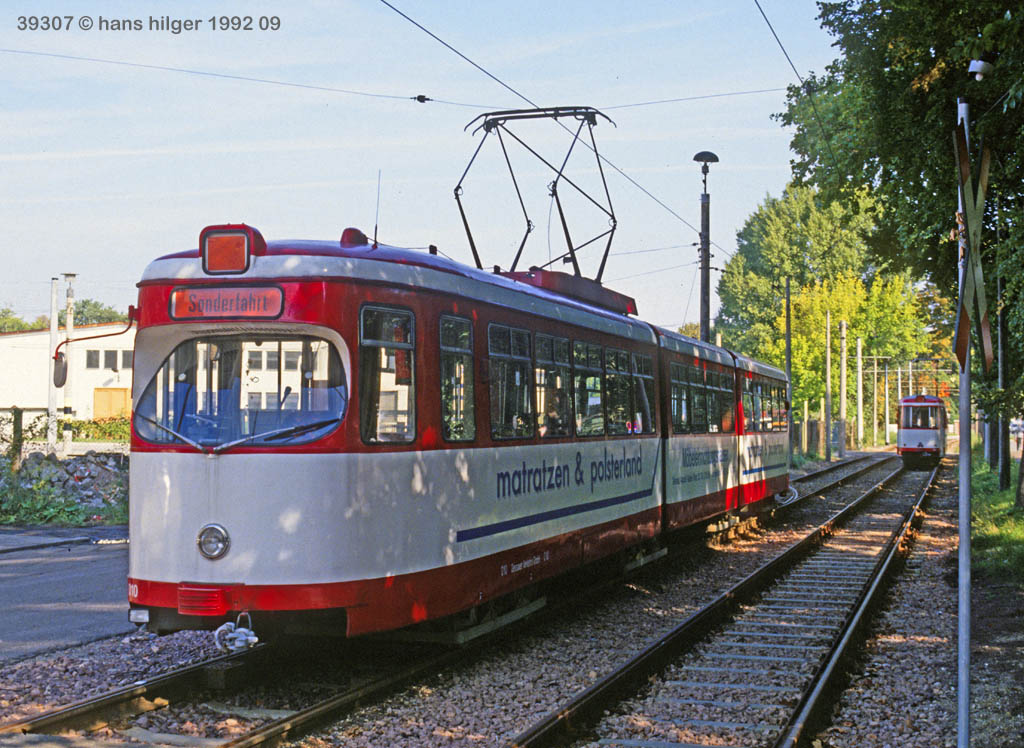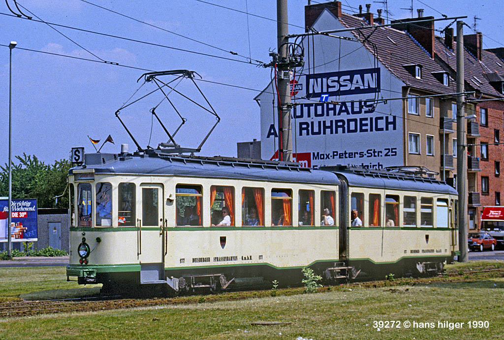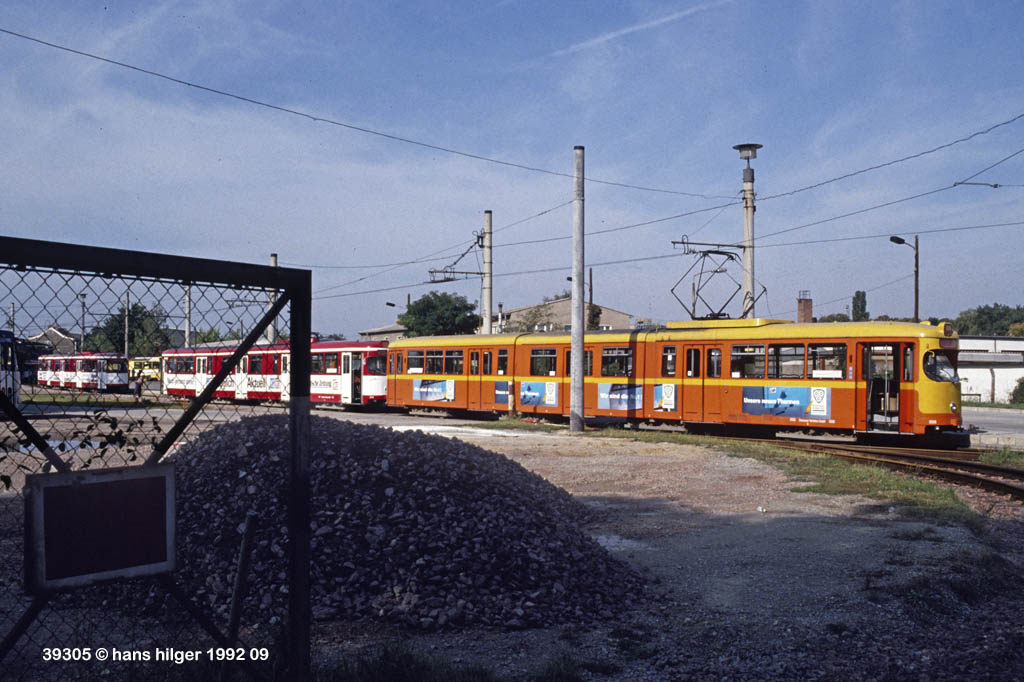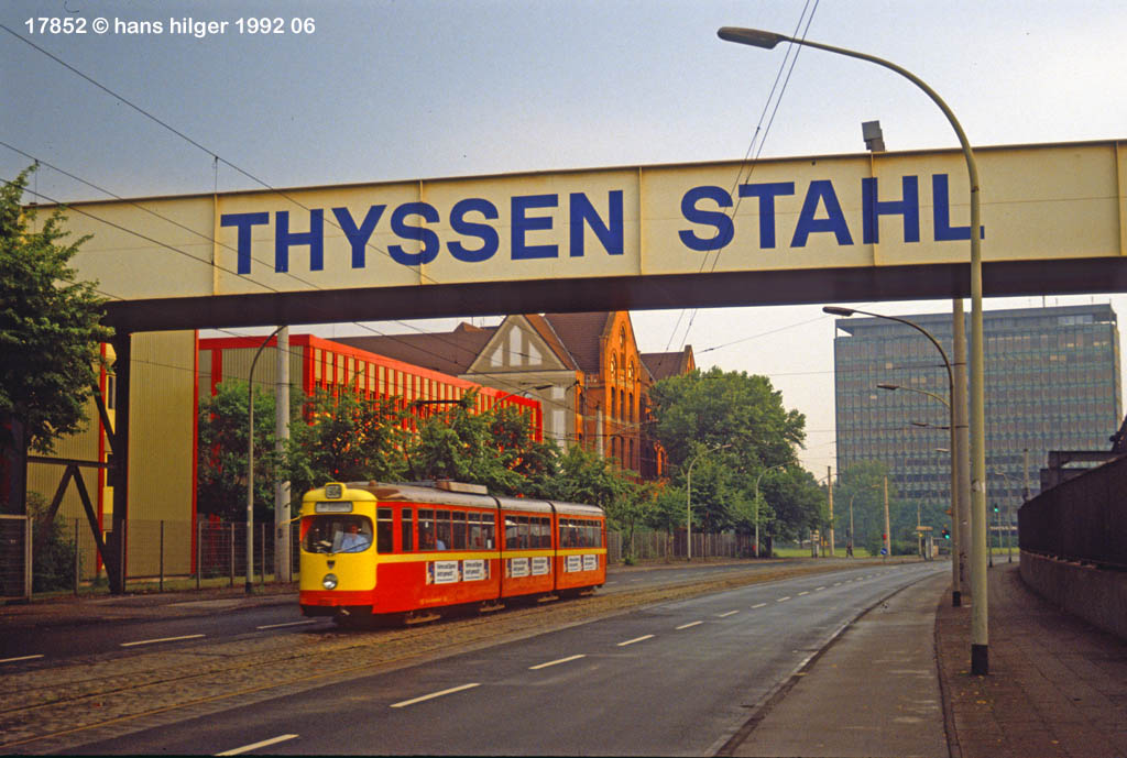 <1> Daß Karlsruhe dabei an erster Stelle steht, hat einen Grund: Das dortige Konzept halte ich für wunderbar und zukunftsweisend, ich wundere mich darüber, daß nicht schon viel mehr Städte auf die Idee gekommen sind, die dahintersteckt: Die Straßenbahn bis mitten in den Hauptbahnhof hineinfahren zu lassen. Und mich hat natürlich damals sehr erfreut, daß ich ausgerechnet einen Wagen erwischt habe, der zusätzlich eine Staatsbahn- Nummer trug, und dann war es auch noch der 450 001 . . . <2> Genial: Auf dem Nachbargleis fährt ein Fernzug ein, man kann im Hbf umsteigen in den innerstädtischen Nahverkehr<3> Auch in Bruchsal fuhr die Straßenbahn bis zum Bahnhof<4> Ein solches System hätte ich mir auch für meine Stadt Duisburg gewünscht, aber wie es scheint, fuhren nicht alle Fahrzeuge unter Beteiligung der DBAG = Diese Bahn hat keine Staatsbahnnummer und trägt auch keinen Keks<5> Diese aber<6> Immerhin waren es mehrere Wagen, die damals Staatsbahnnummern trugen<7> Jetzt sind wir ganz woanders: Antwerpen 1990, Triebwagen “2025”<8> Die Werbung aus dem Duisburg des Jahres 1992, in dem die Straßenbahn in den Keller kam<9> Im Hintergrund sehen wir noch eine der Straßenbahnen, die kurze Zeit später hier in Duisburg an der Koloniestraße vollständig verschwanden, aber paßt mal auf: Diesen dort wegfahrenden Wagen werden wir gleich wiedersehen in einer anderen Stadt ❗️<10> Eine der Bahnnen, die bis 1992 in Duisburg fuhren und die “nicht tunneltaiuglich” waren, was natürlich Quatsch war: Es war nur “zu teuer”, sie mit der Sicherungstechnik des Tunnels auszustatten, dann hat man sie lieber abgegeben nach Dessau. Hier überquert eine von ihnen den Ruhrgebietsfluß “Emscher” im Duisburger Norden<11> “904”, eine Duisburger Linie, die es nach 1992 nicht mehr gab<12> Und DAS war ihre damalige Linienführung: Am Ostbahnhof vorbei!<13> Das war damals der Preis für eine Kutzstrecke = Eine DM !<14> Eine der alten Bahnen bei Thyssen in Hamborn<15> Und mehrere ganz alte Fahrzeuge im Betriebshof in Hamborn<16> Einer davon ist bekannt als 1191<17> Was ist denn hier passiert? Das sieht sehr unaufgeräumt aus . . . Nach der Tunnelöffnung in Duisburg gingen mehrere Fahrzeuge zur Verschrottung nach Essen, wo aber vor der Zerlegung die Mittelteile herausgenommen wurden, um damit Essener Wagen zu verlängern. Hier sehen wir einen von ihnen schon in Essen und haben einen Blick hinein in die damals übliche Bestuhlung, die man heute als “Holzklasse” bezeichnen würde. Hiervon ging also alles in den Schrott, auch die Ersatzstühle, nur der Mittelwagen wurde weiterverwendet<18> Auch schon ein recht altes Bild aus Oberhausen: Blick vom Gasometer 1996. Vorne wird bereits das Centro gebaut, hinten in Osterfeld regiert noch die Schwerindustrie, die in den nächsten Jahren komplett verschwinden wird