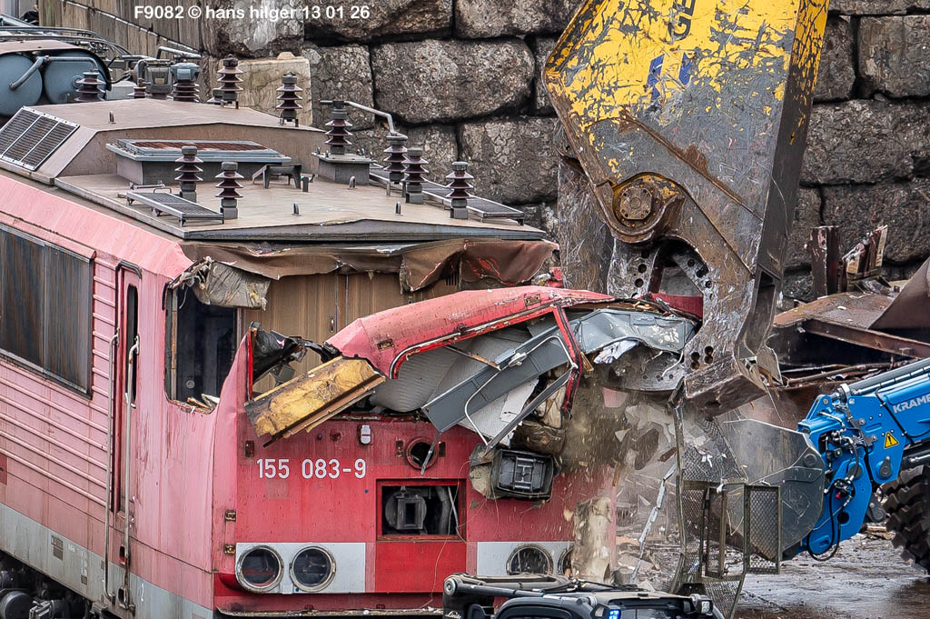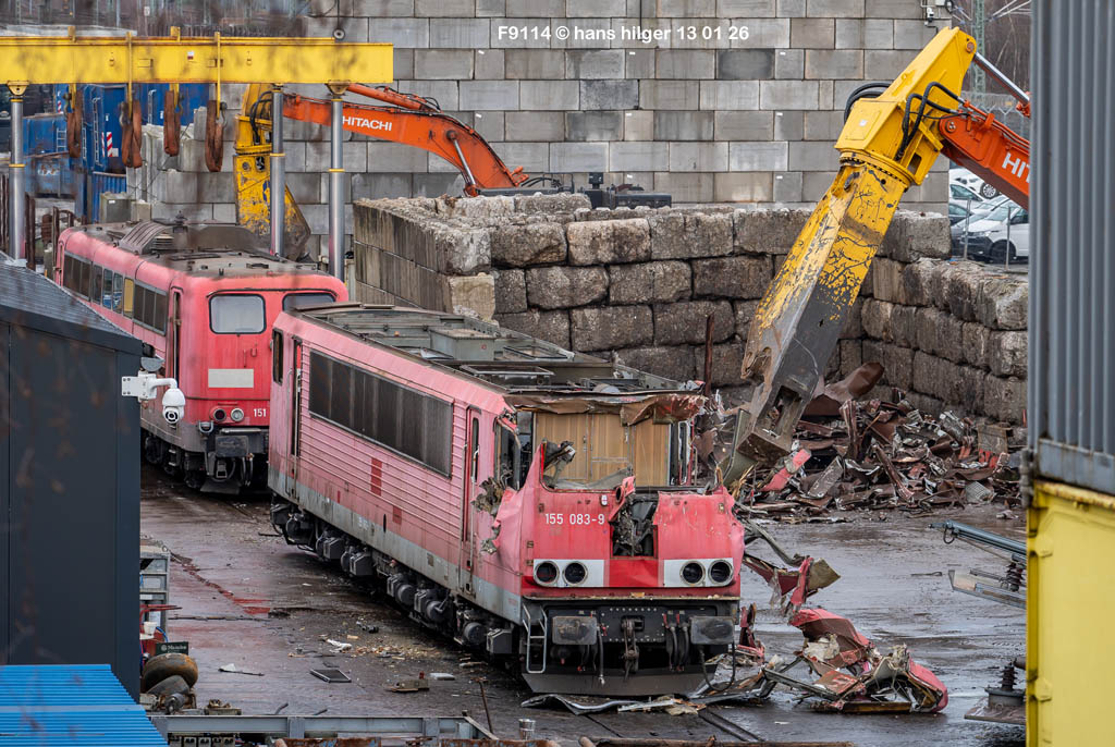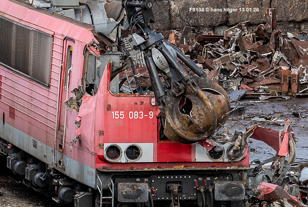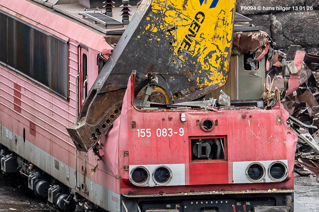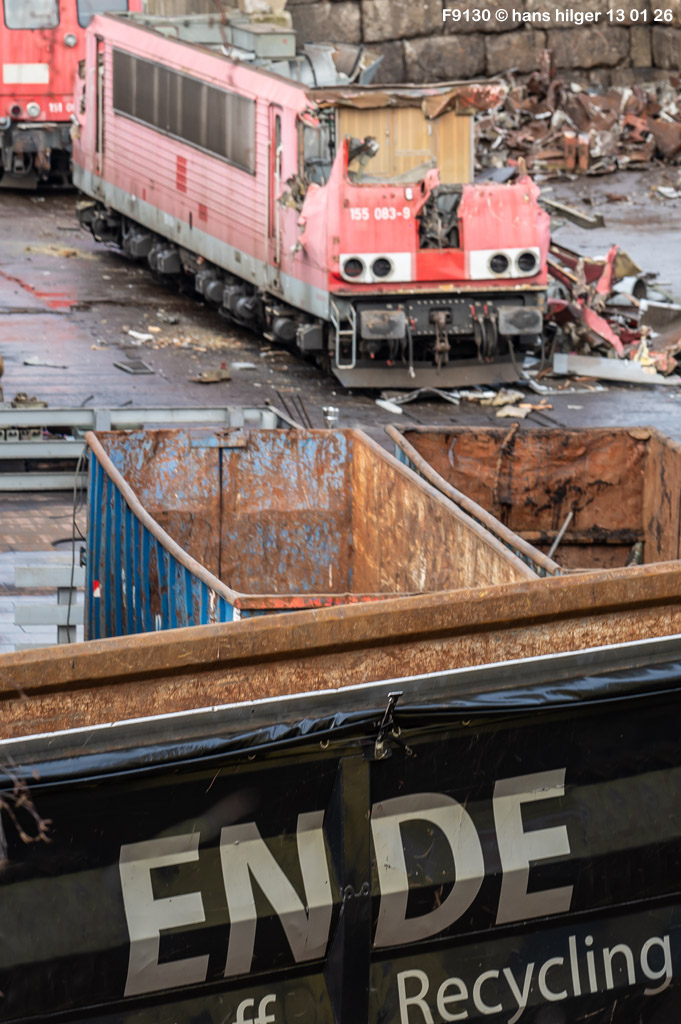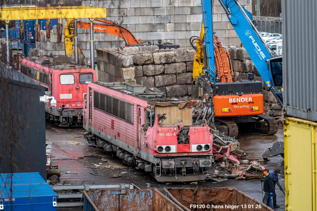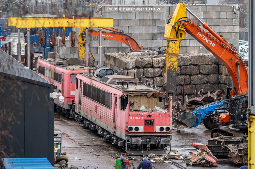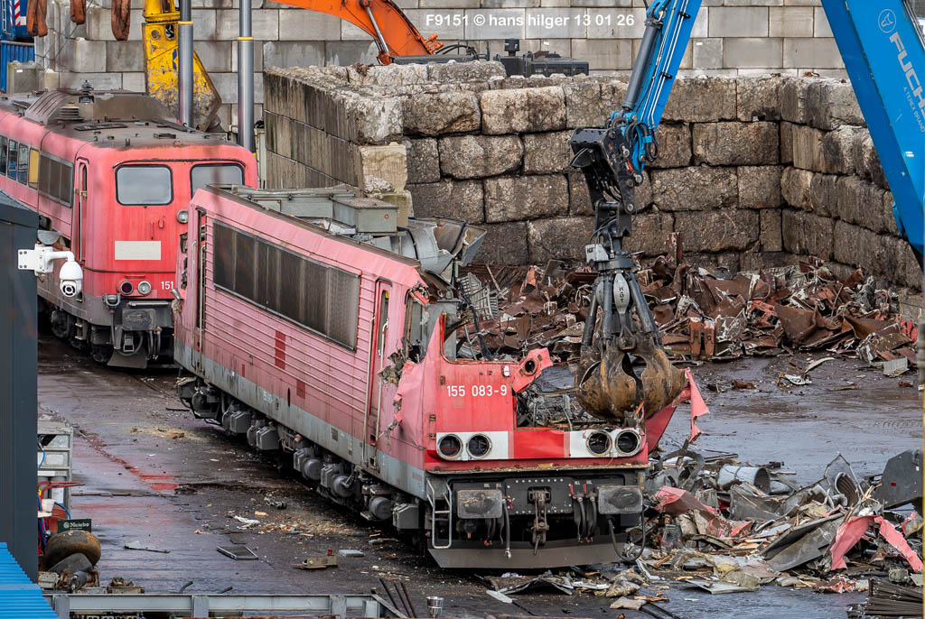 Diese Verschrottung vom 13. Januar 2026 konnte mehr oder weniger zufällig eingefangen werden: Grundsätzlich ist es nicht kalkulierbar, wann eine angelieferte Lok wirklich klein gemacht wird, oft war die Anreise nach Opladen vergebens oder wurde abgebrochen, wenn Fotografen sichtbar wurden. Dieses Mal hatte ich Glück und die komplette Zerlegung konnte dokumentiert werden bis zum Abheben des Rahmens, also der Festlegung, welches Zerlegedatum in der Statistik eingetragen wird = An diesem Tag also hatte ich die Ehre, das Datum zu definieren, das für alle Zeiten das Ende der 155 083 beschreibt. Diese Doku steht auch beispielhaft für mehr als 3000 andere Zerlegungen, die hier bereits stattgefunden haben beim Verwerter ihres Vertrauens. Bitte sehr: Das Ende der 155 083, Vorhang auf . . .